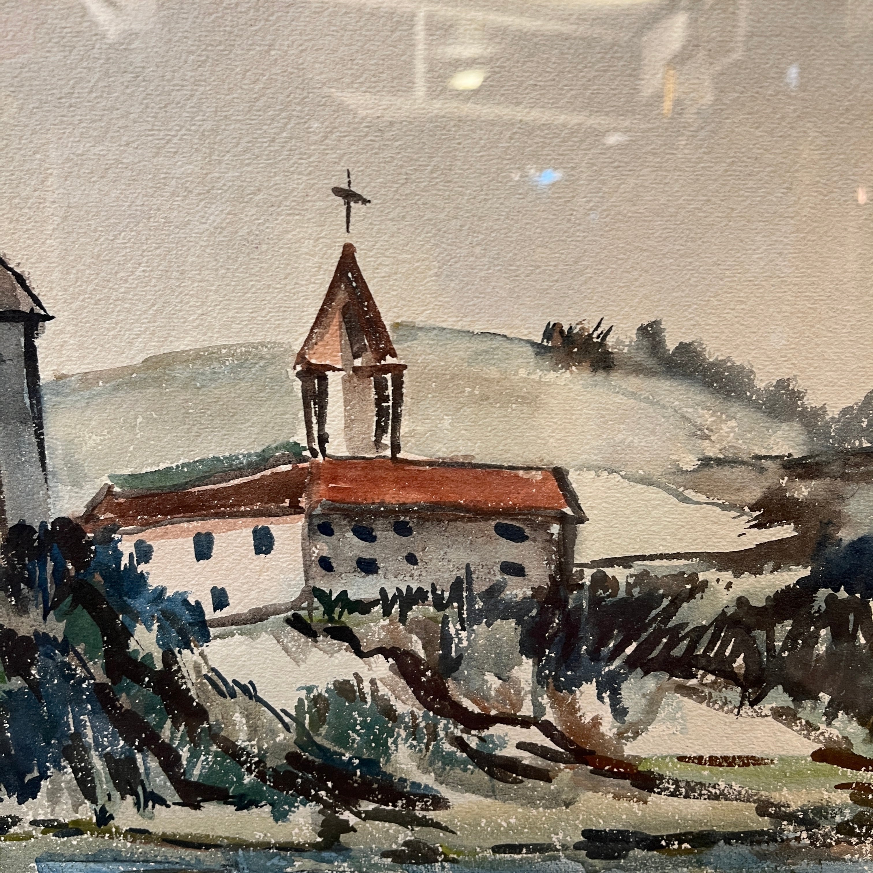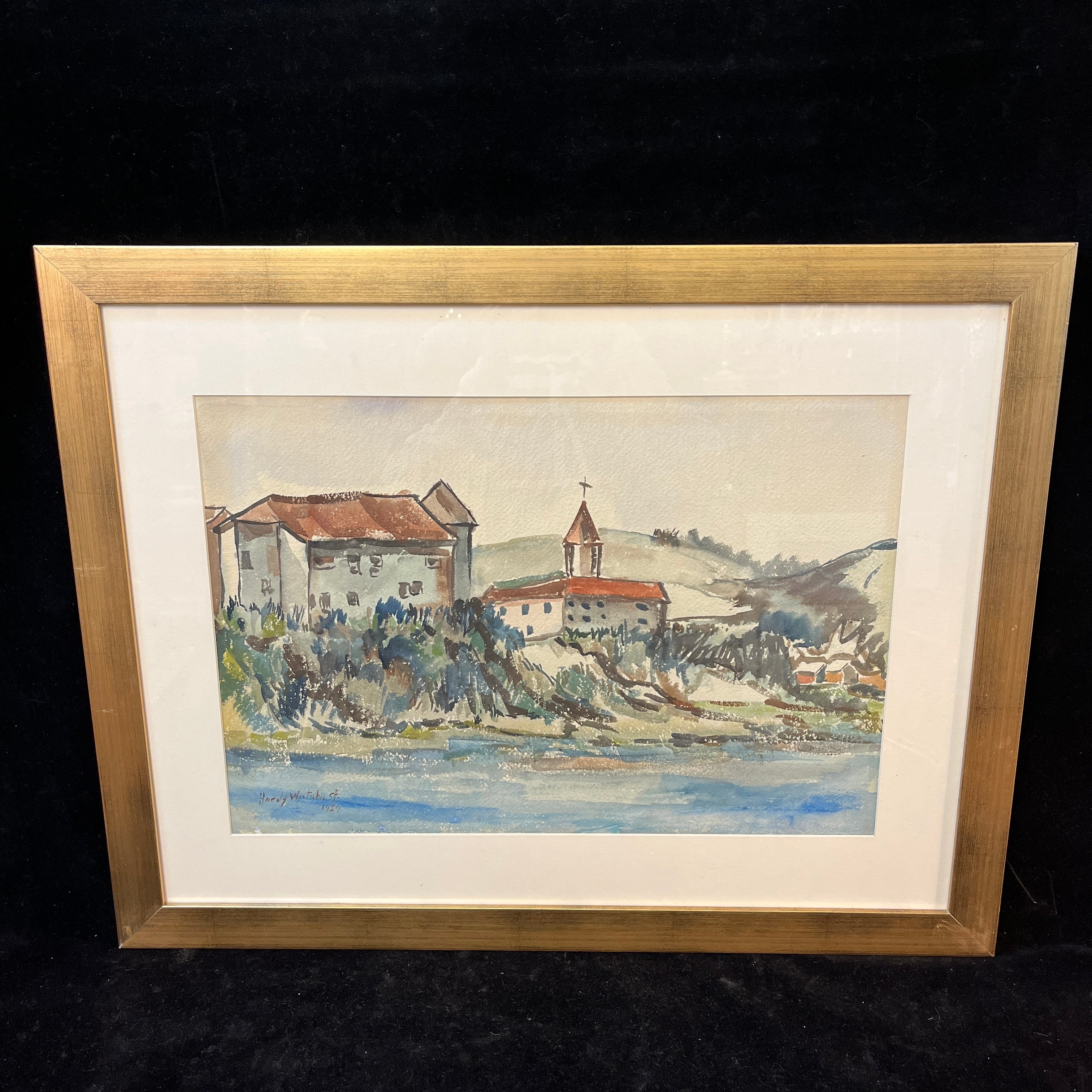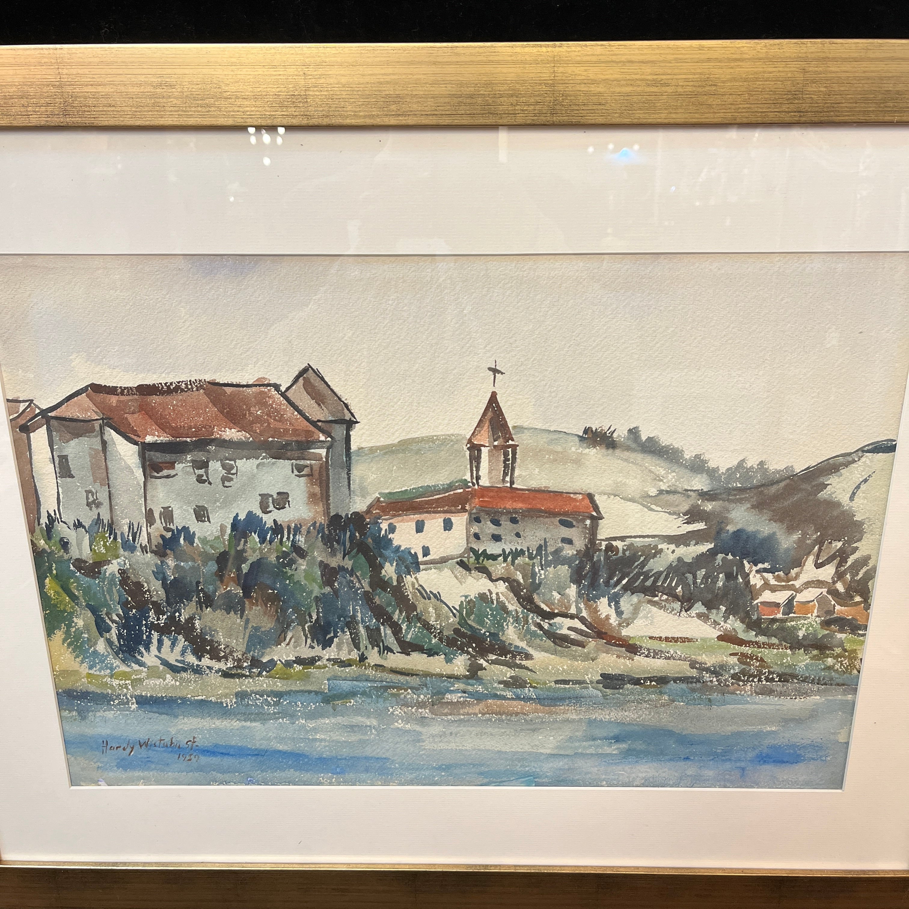 Acuarela sobre papel del artista chileno Hardy Wistuba (1925-2010), pintada en 1959, representando un paisaje, posiblemente del sur de Chile, en el que se ven un edificio y una iglesia junto a una colina que da a la orilla de un cuerpo de agua, posiblemente la Iglesia Luterana de Frutillar, a orillas del lago Llanquihue.