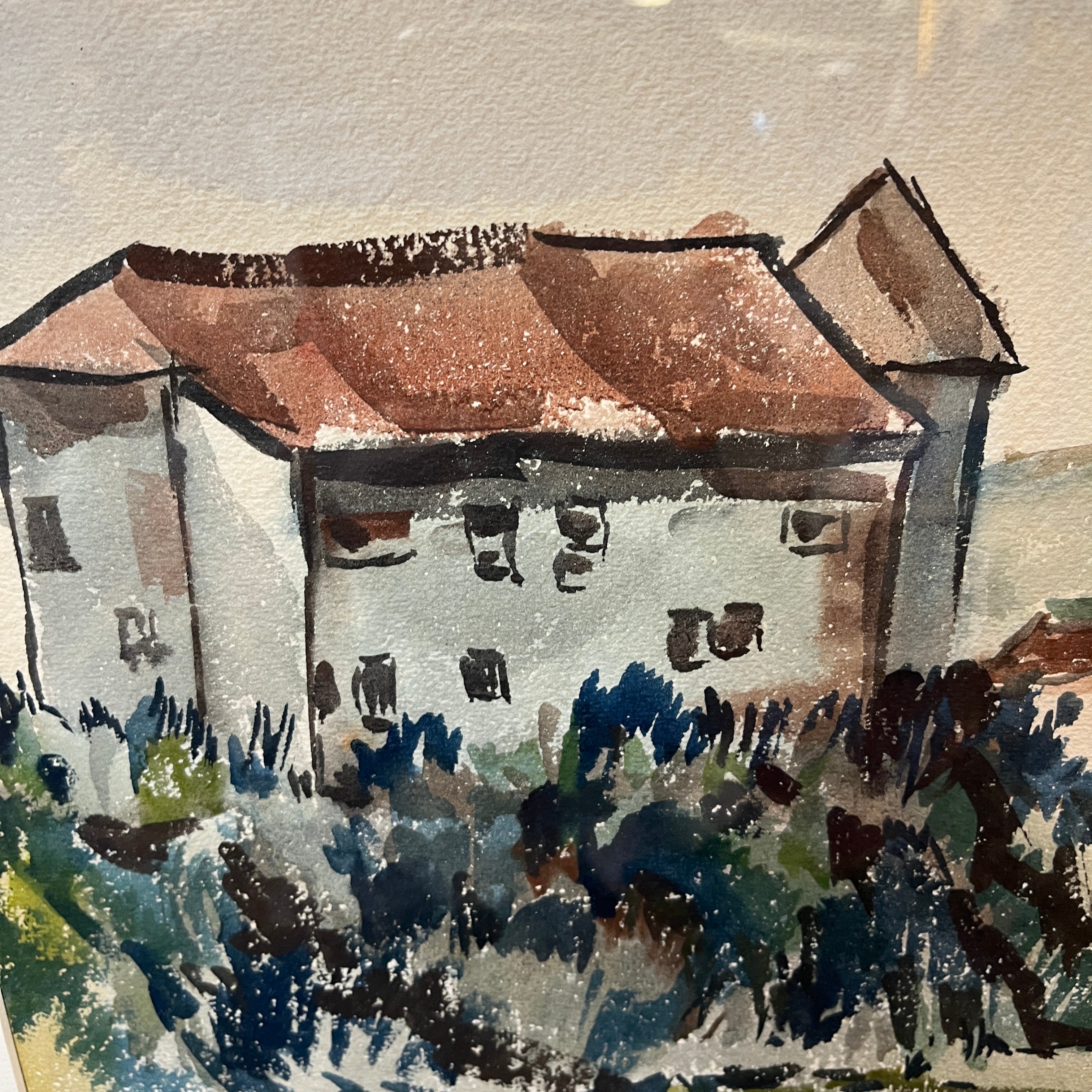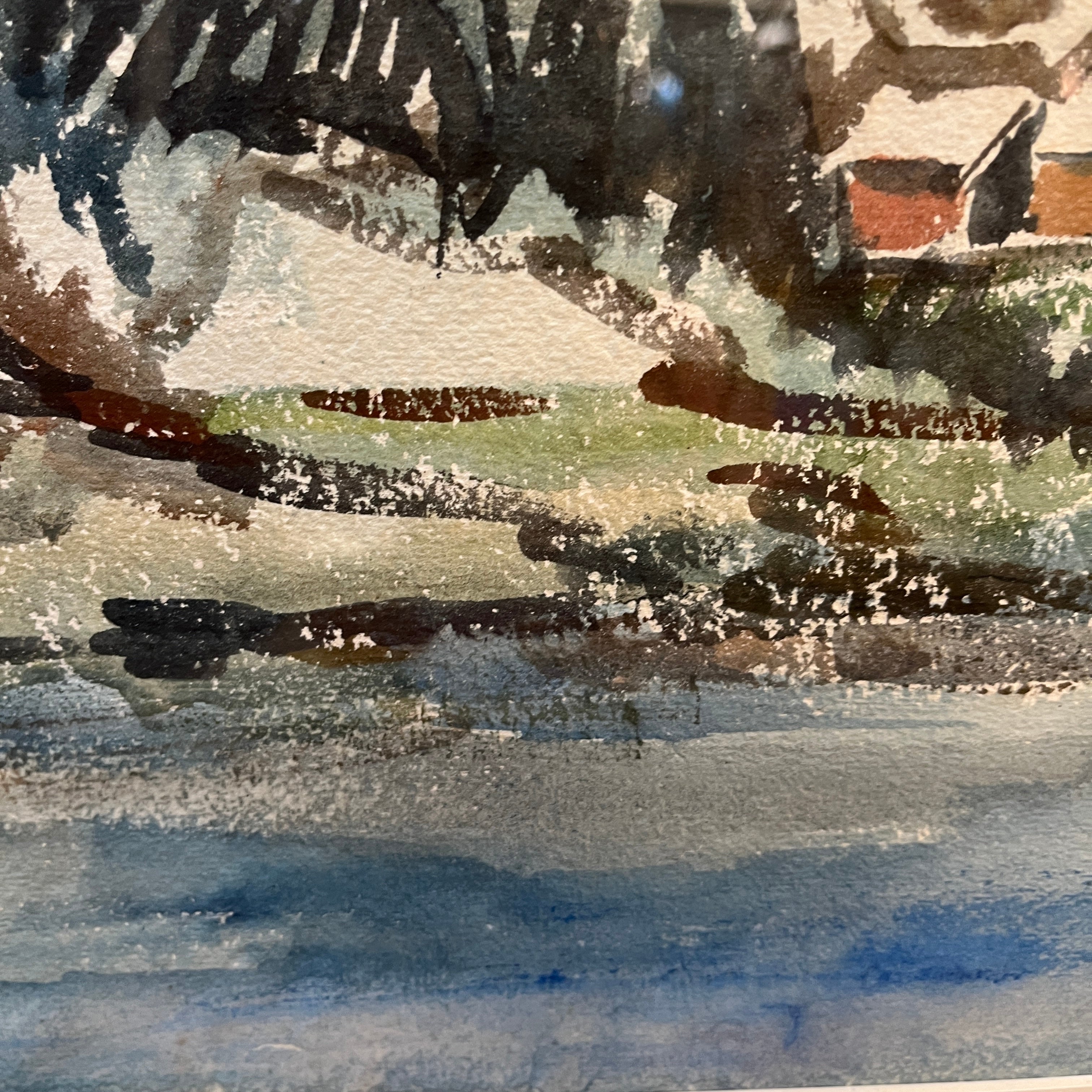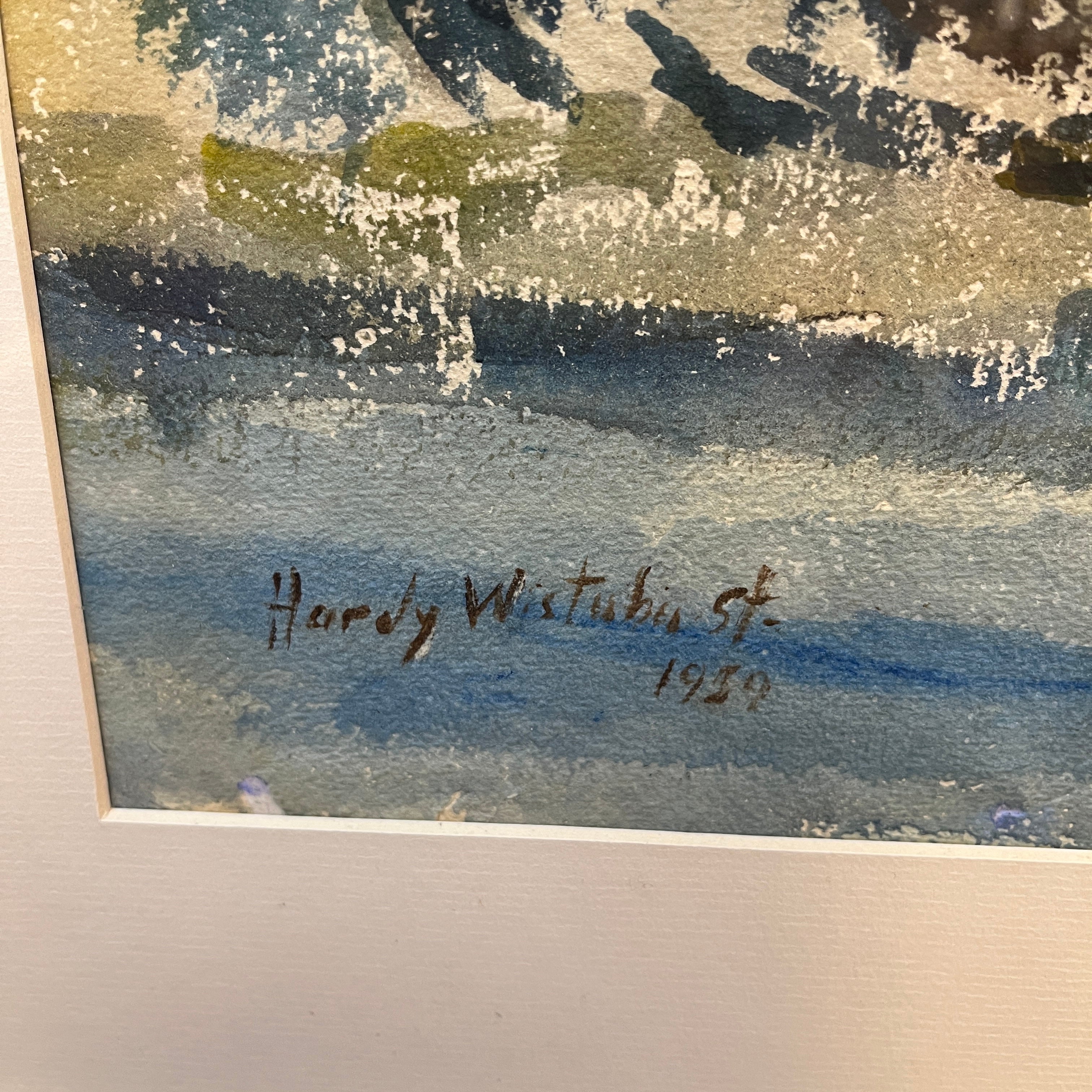 Acuarela sobre papel del artista chileno Hardy Wistuba (1925-2010), pintada en 1959, representando un paisaje, posiblemente del sur de Chile, en el que se ven un edificio y una iglesia junto a una colina que da a la orilla de un cuerpo de agua, posiblemente la Iglesia Luterana de Frutillar, a orillas del lago Llanquihue.