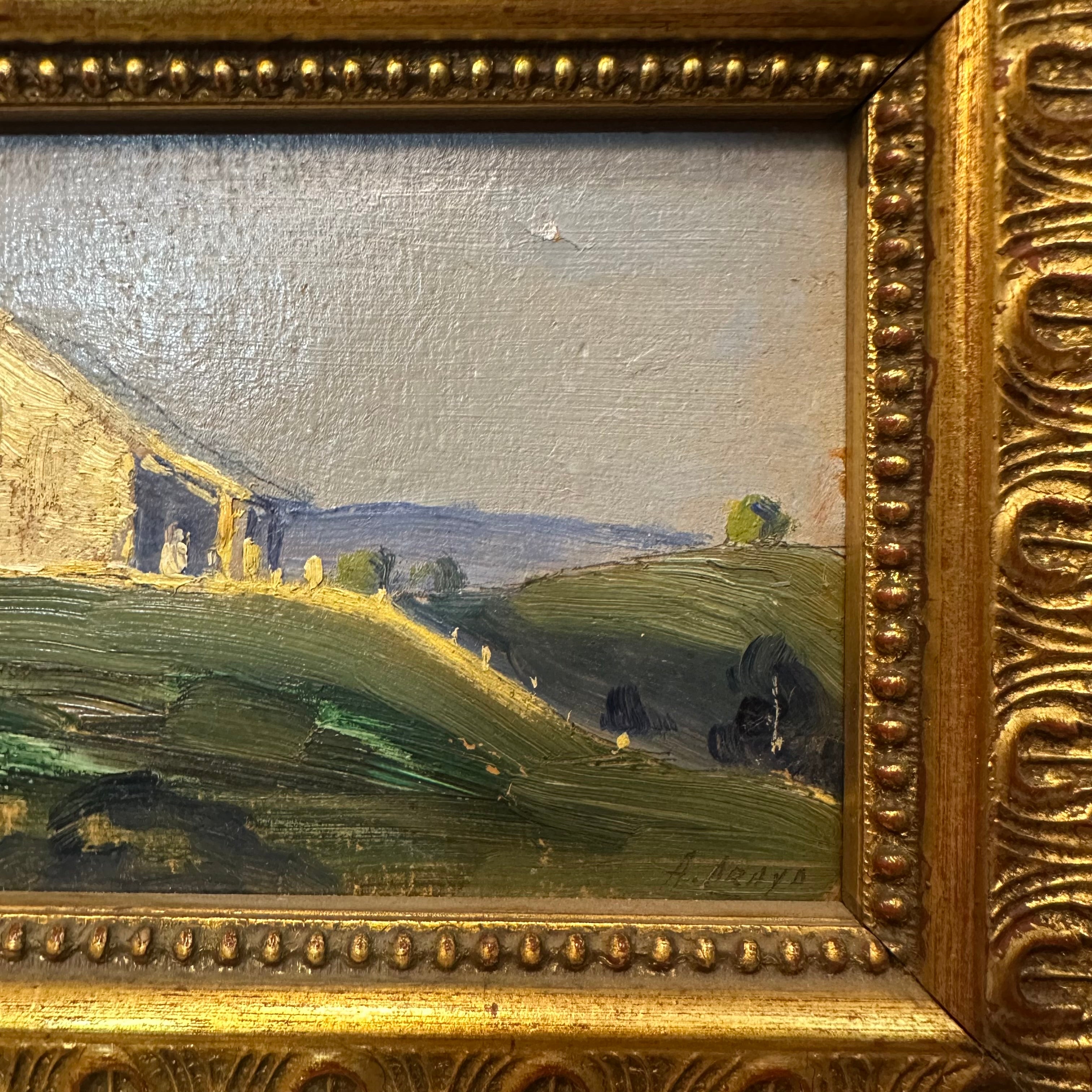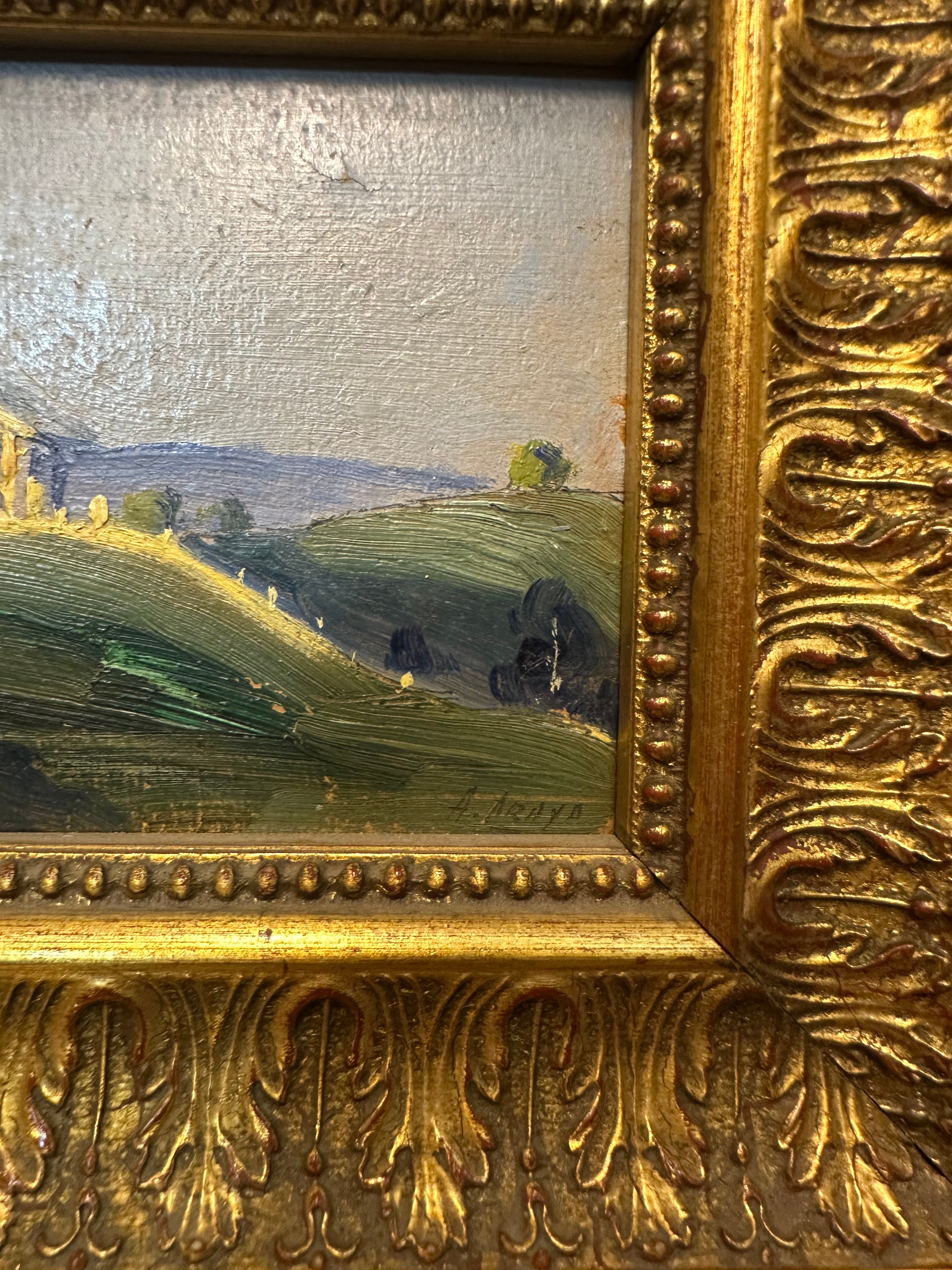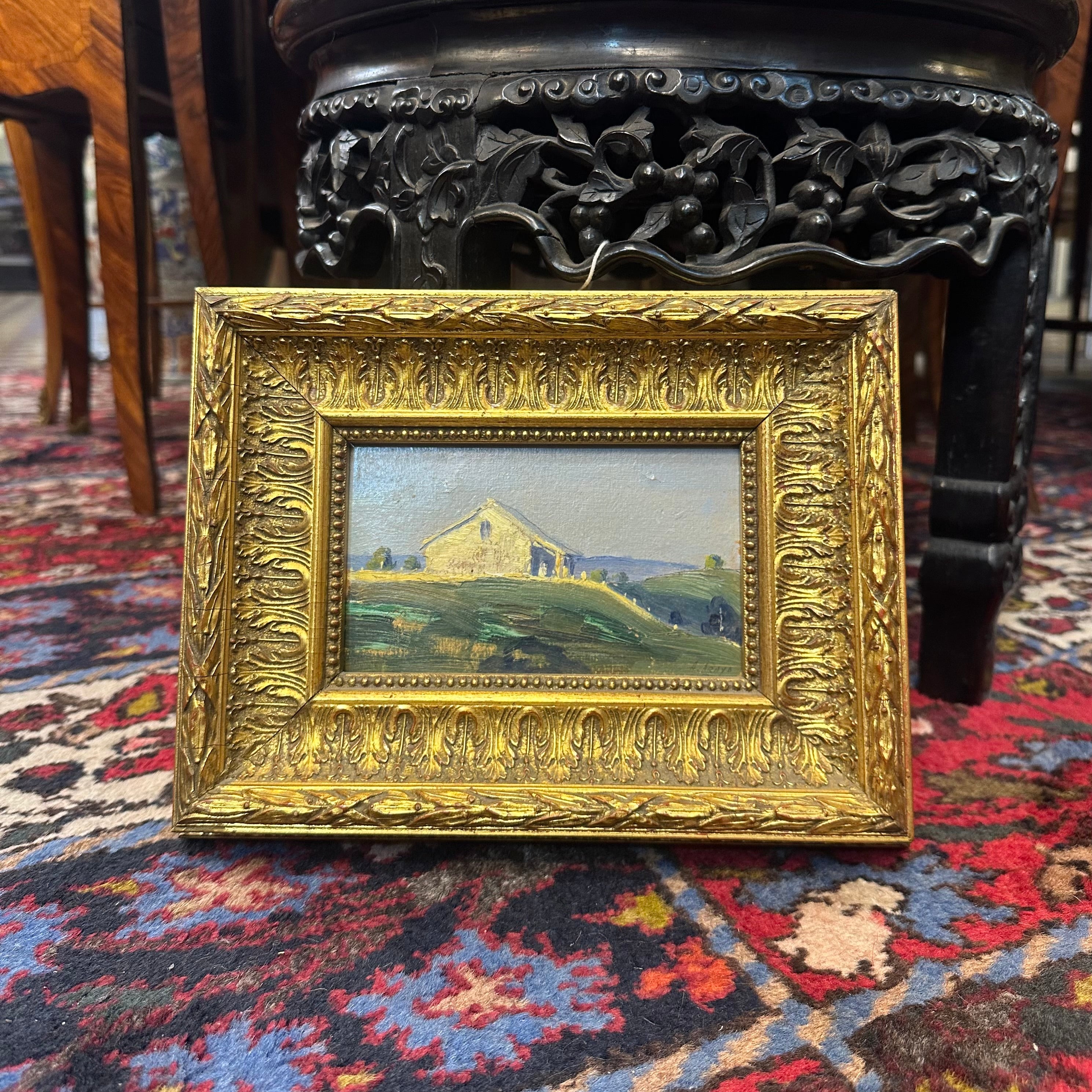 Hermoso óleo sobre madera del auto chileno Alfredo Araya, que representa un paisaje con una casa en una pradera. En la pintura se observan tonos azules y verdes que contrastan con la casa. La obra está enmarcada en madera tallada en finos relieves, acabado en tonos dorados.
