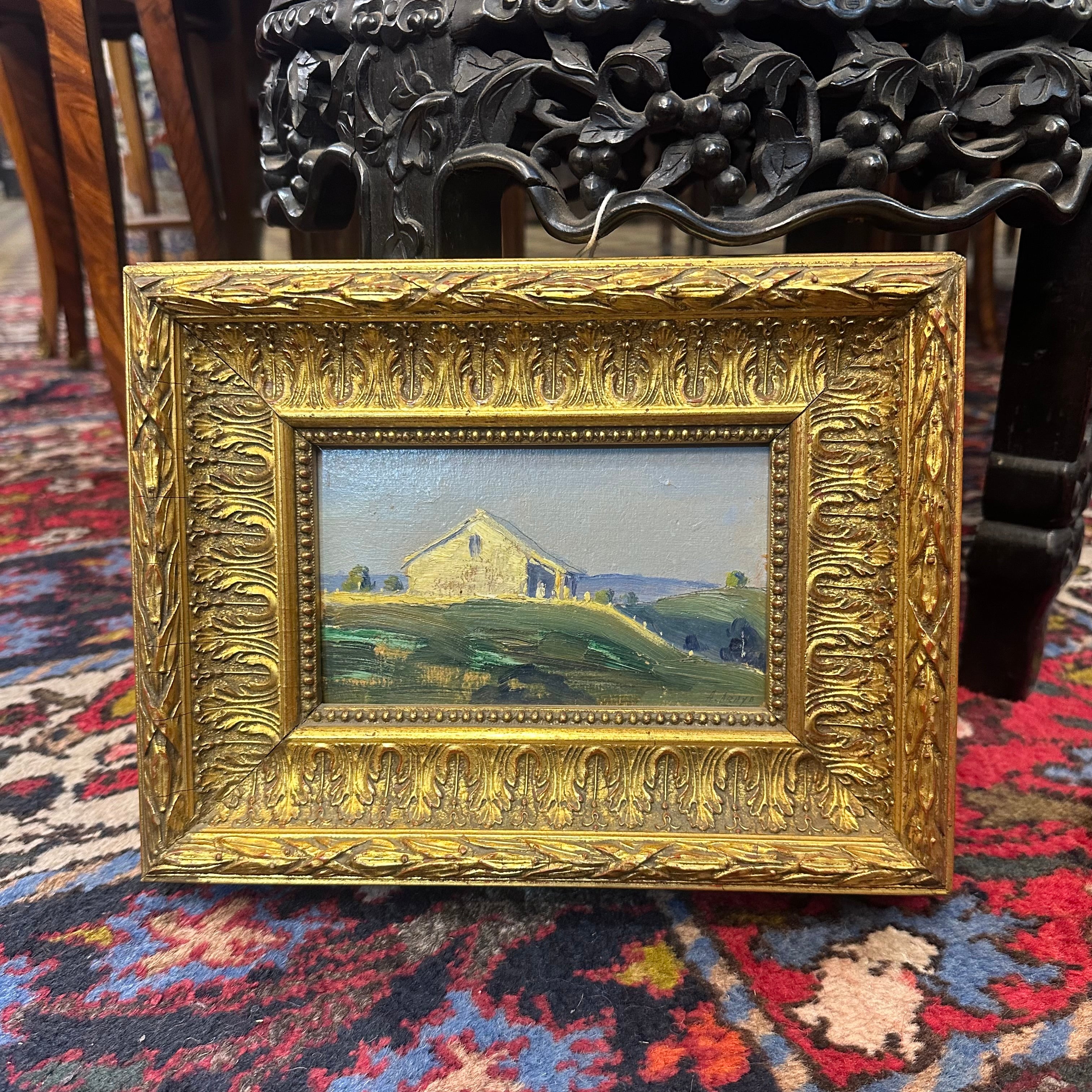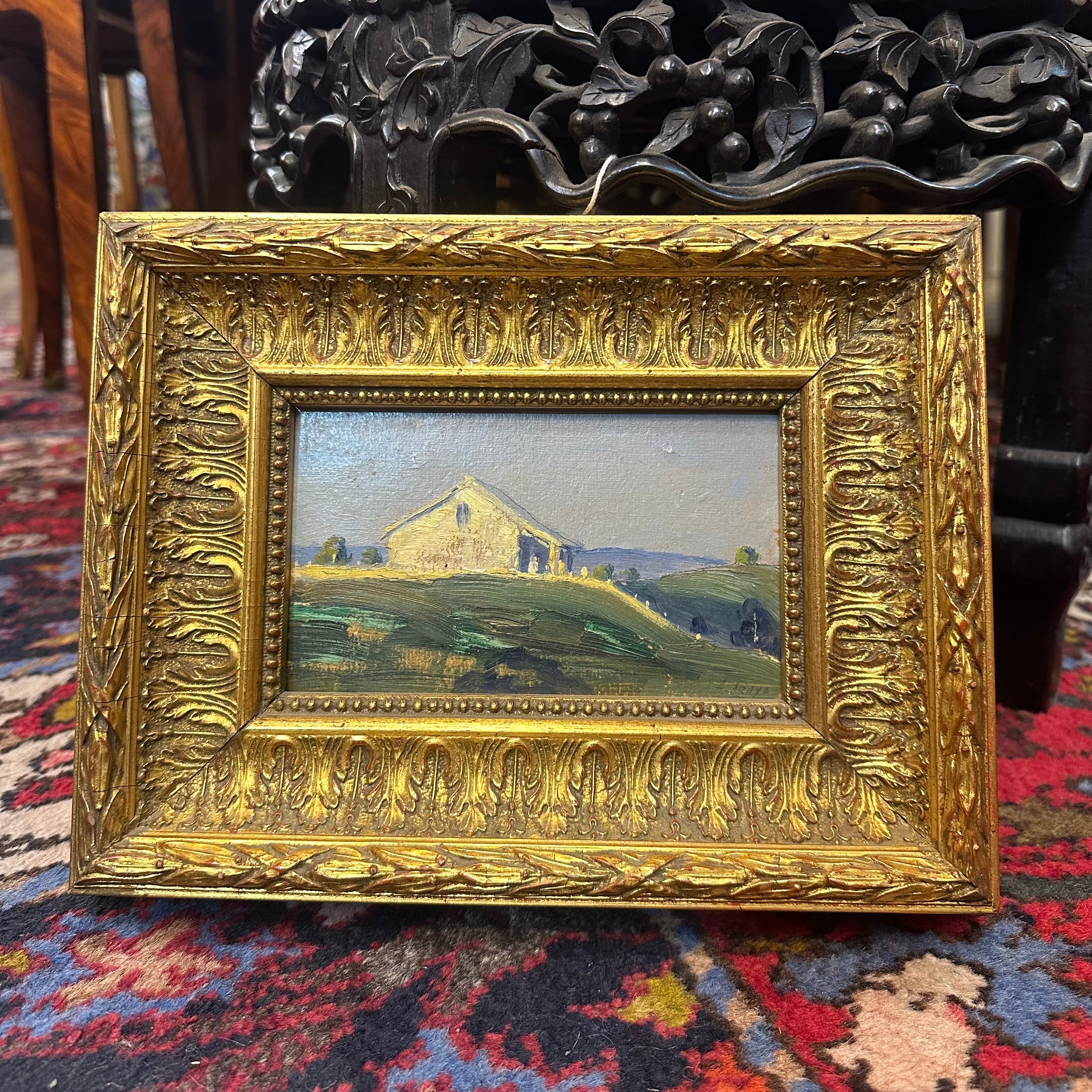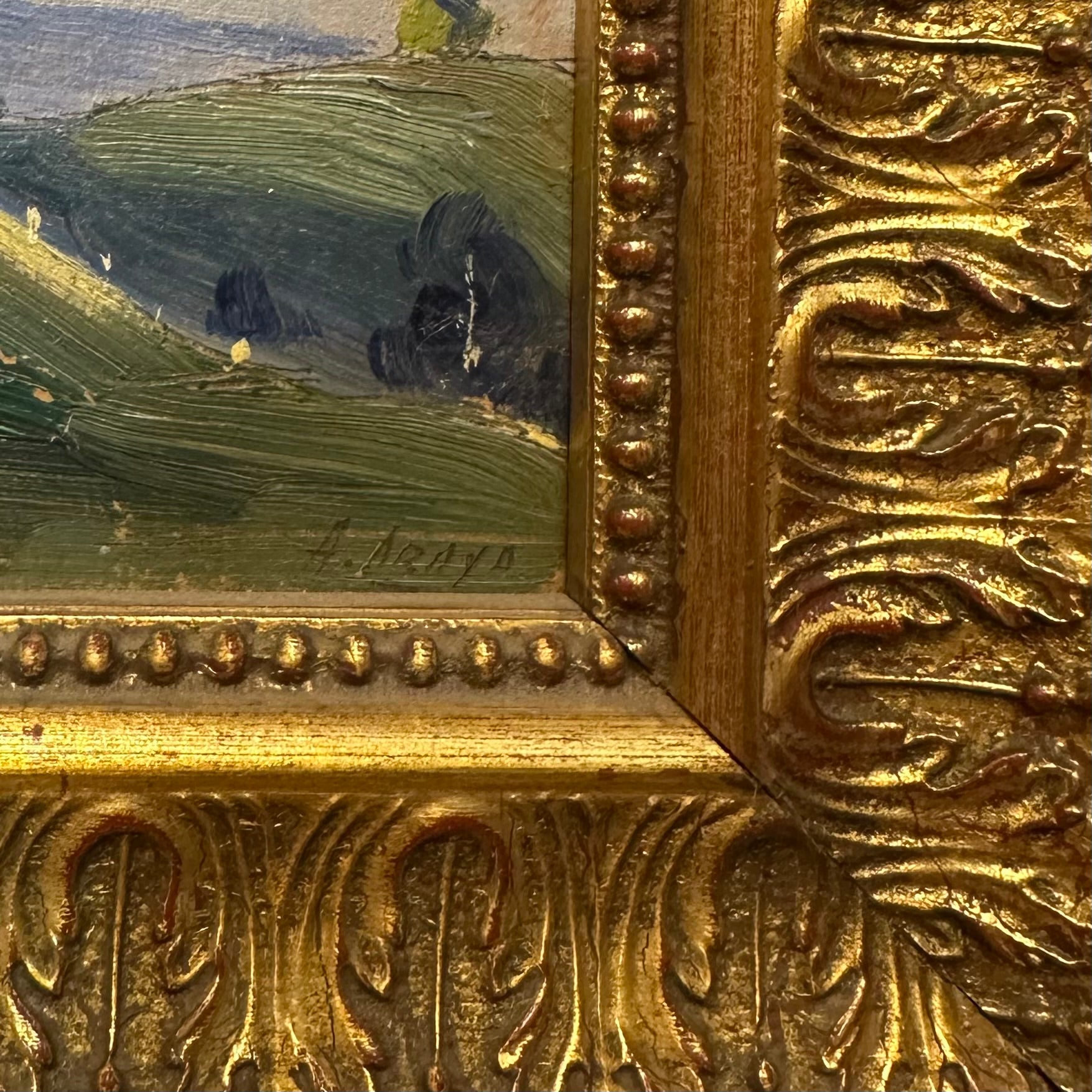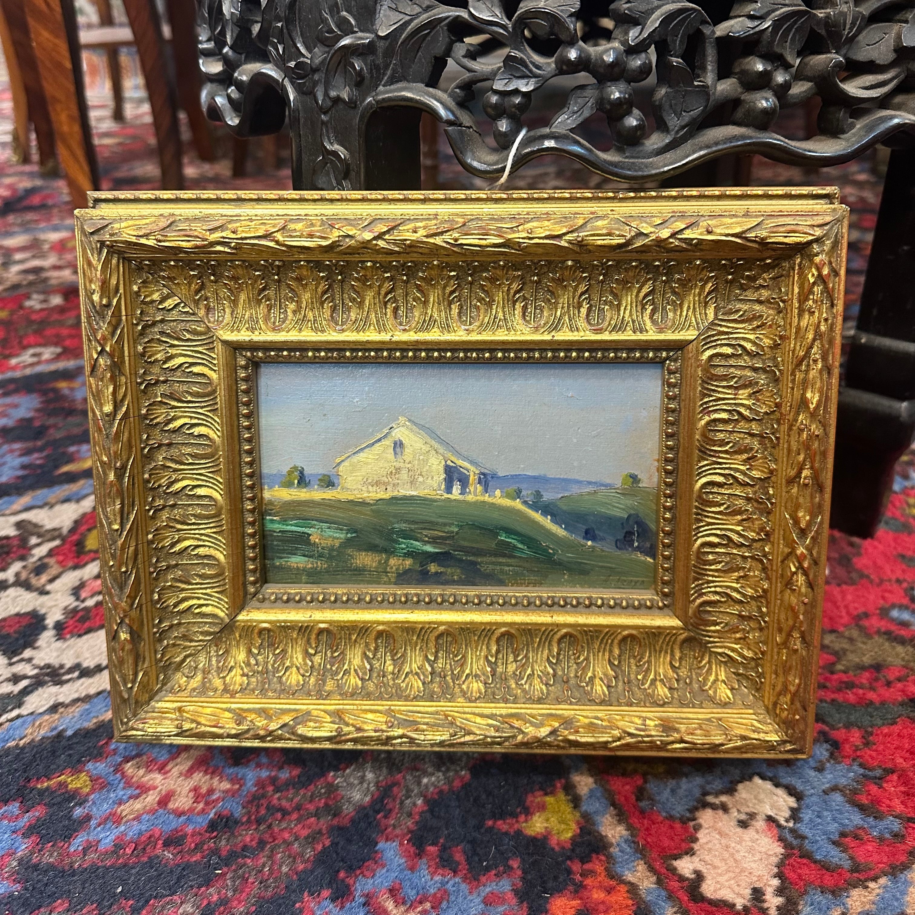 Hermoso óleo sobre madera del auto chileno Alfredo Araya, que representa un paisaje con una casa en una pradera. En la pintura se observan tonos azules y verdes que contrastan con la casa. La obra está enmarcada en madera tallada en finos relieves, acabado en tonos dorados.