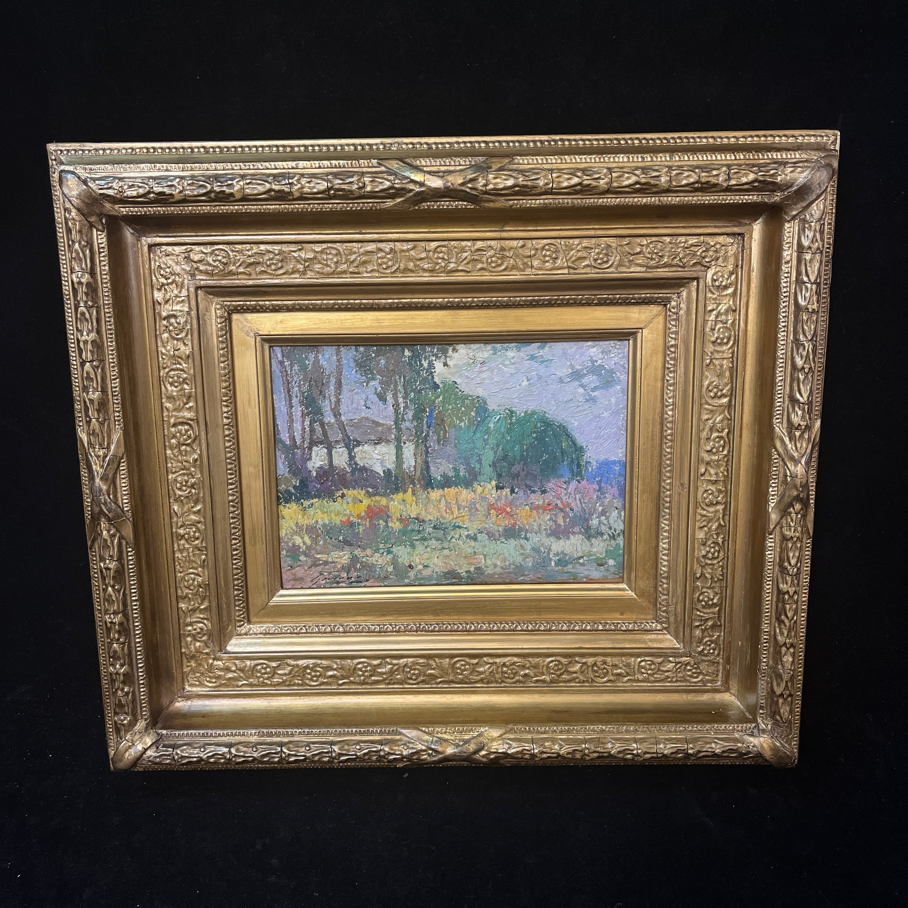 Óleo sobre cartón del artista chileno Arturo Gordon, representando un bello y tranquilo paisaje. . La obra está enmarcada en un marco de madera pintado negro con algunos desgastes y la obra está protegida con vidrio.