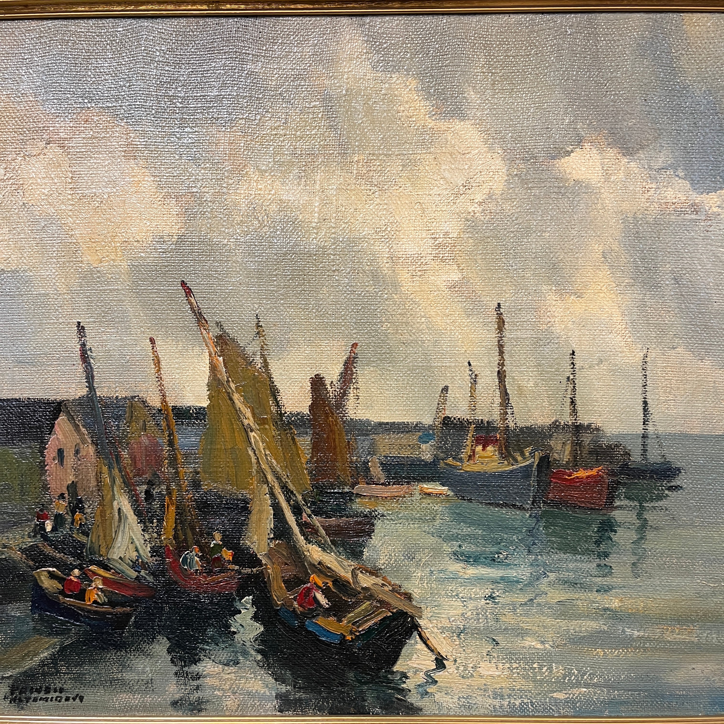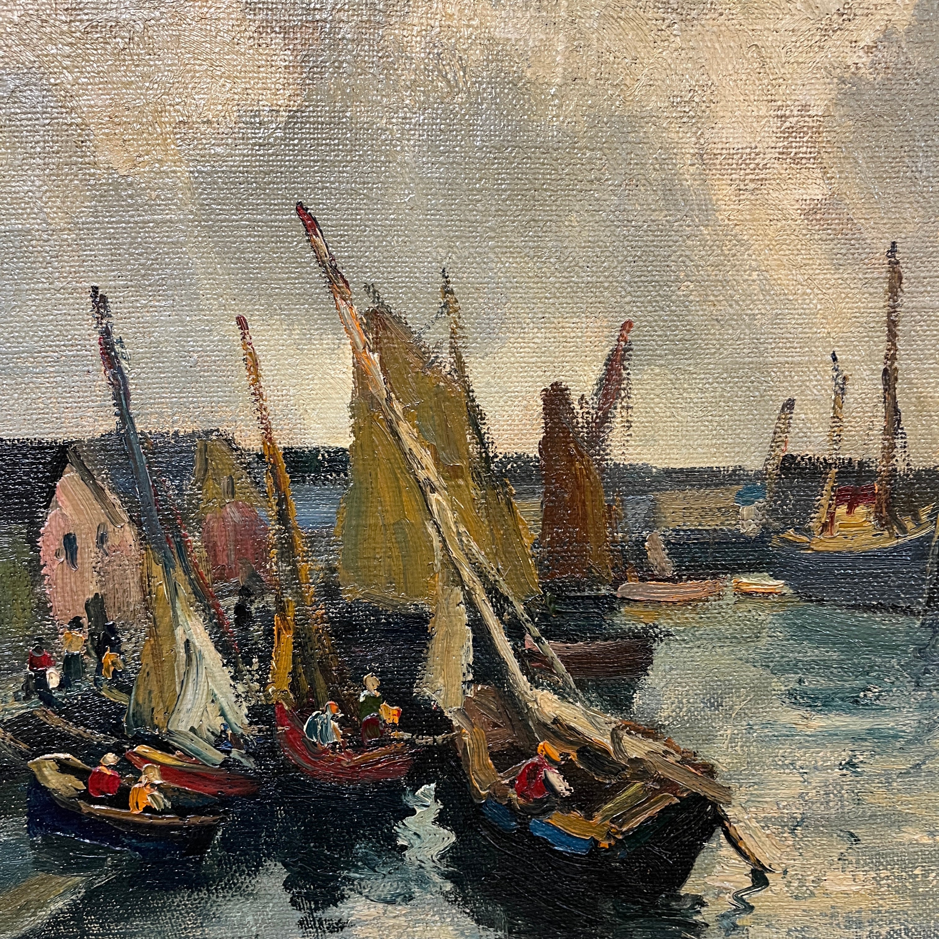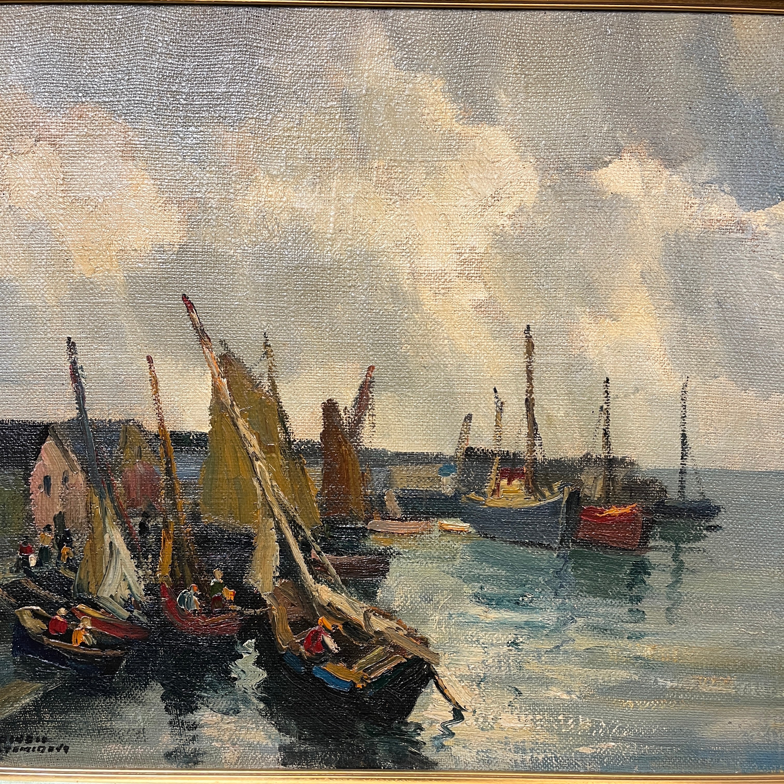 Sobrecogedora pintura del talentoso pintor chileno Pacheco Altamirano, donde podemos apreciar un muelle con embarcaciones ancladas y pescadores trabajando dentro de sus botes.
