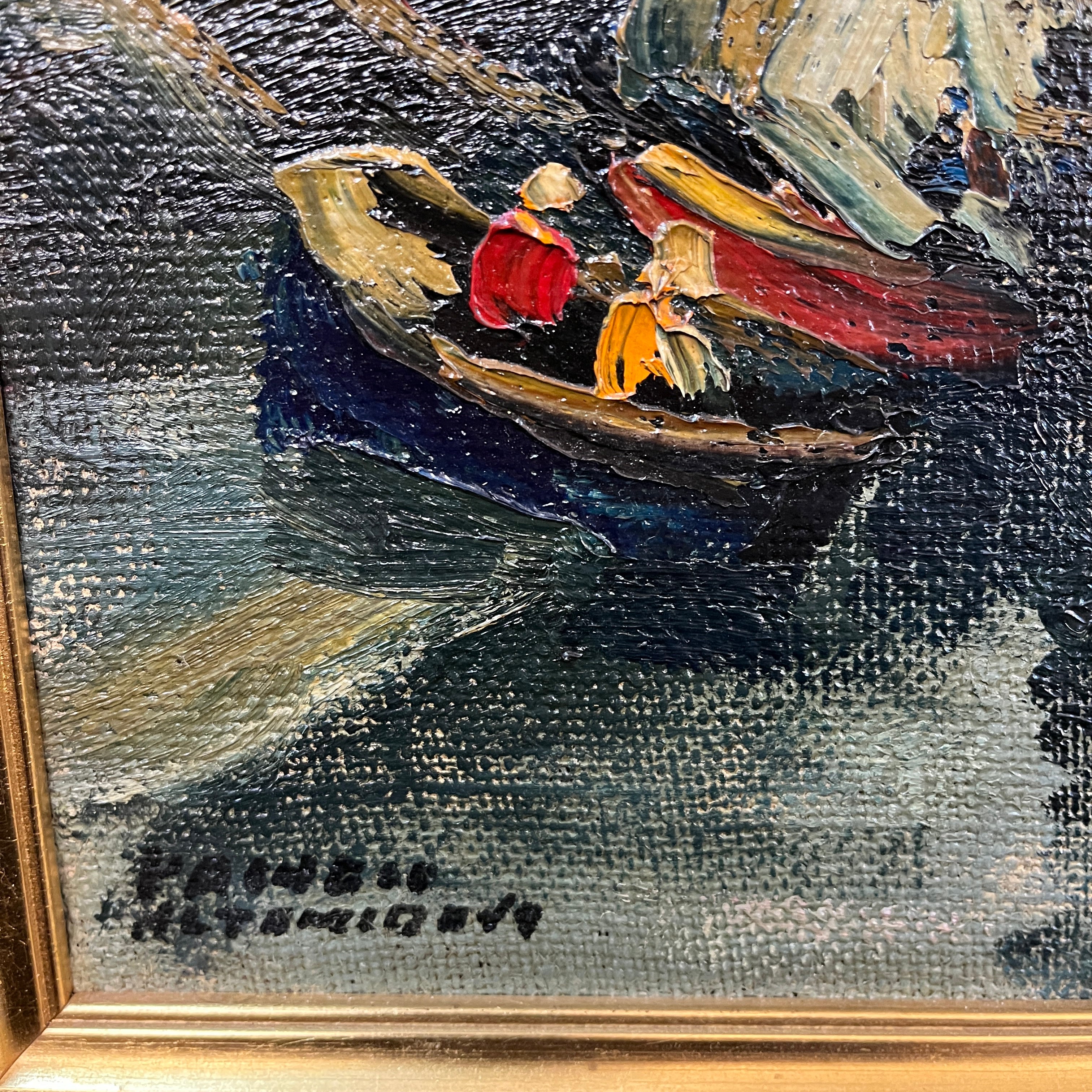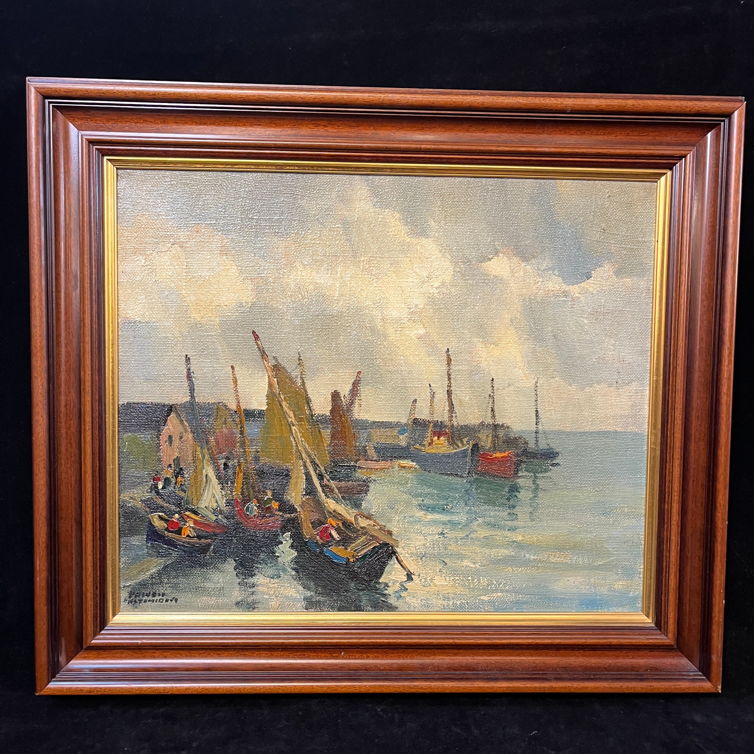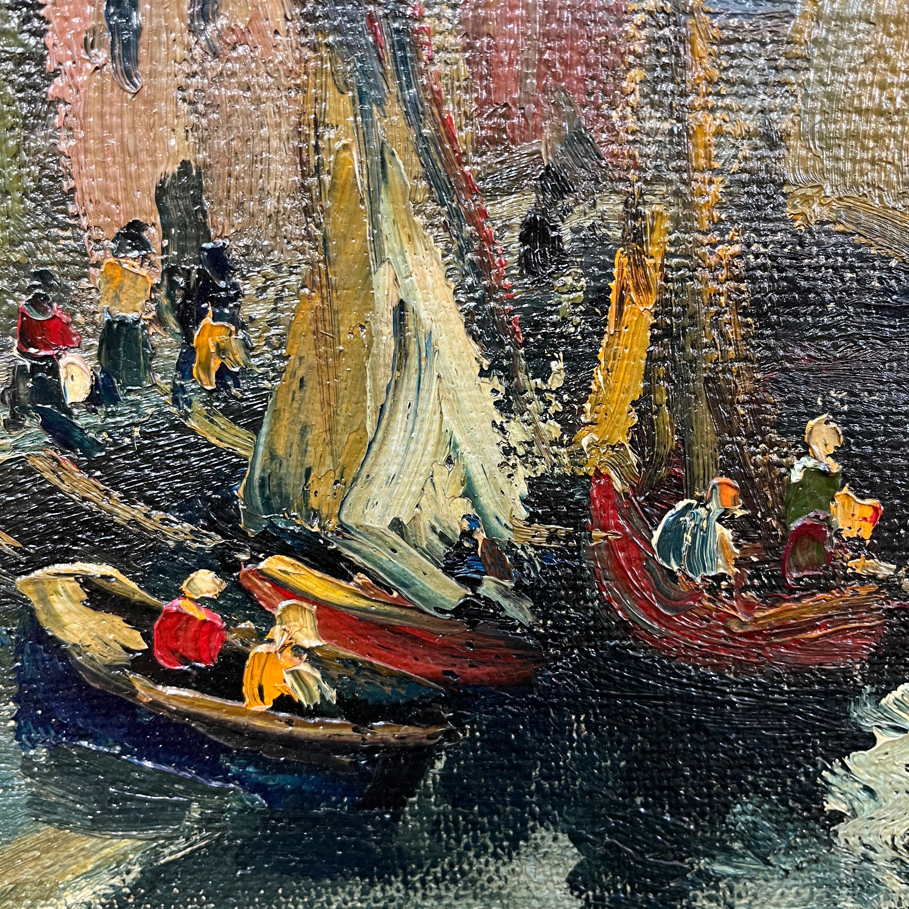 Sobrecogedora pintura del talentoso pintor chileno Pacheco Altamirano, donde podemos apreciar un muelle con embarcaciones ancladas y pescadores trabajando dentro de sus botes.