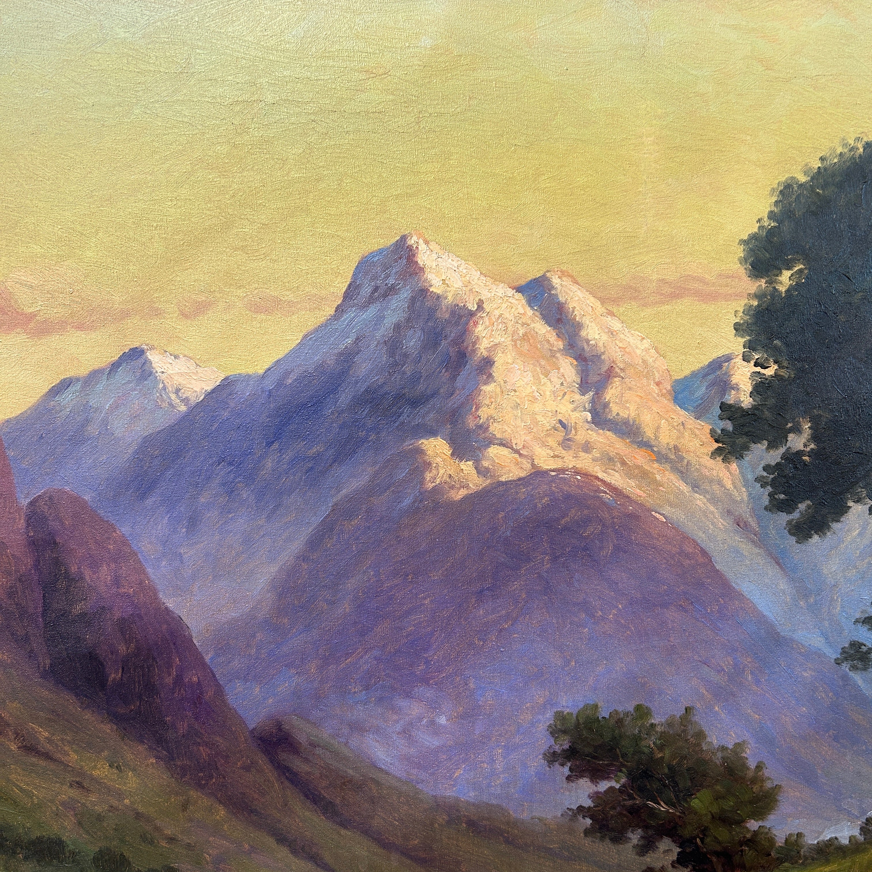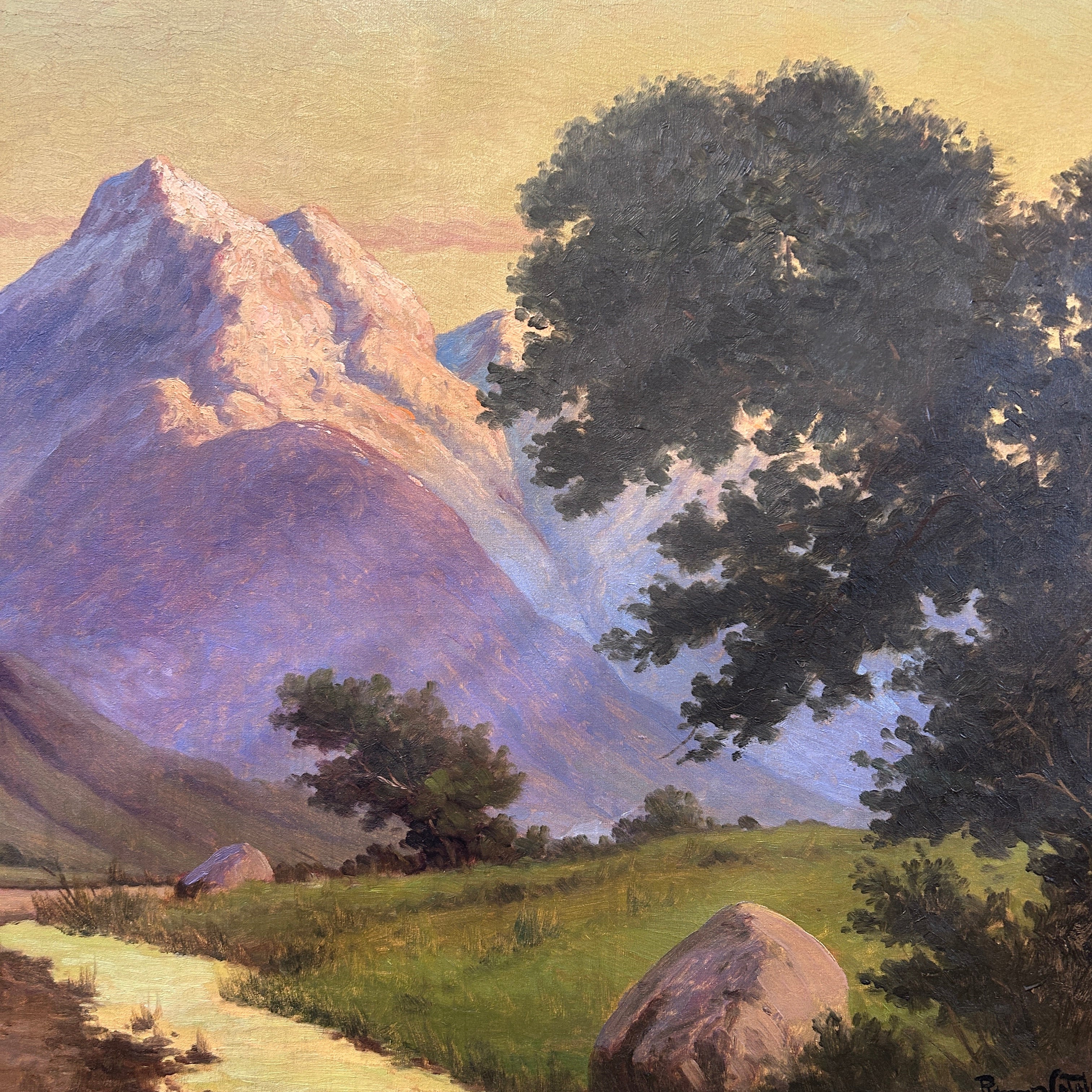 Impresionante y realista pintura del reconocido artista chileno Benito Ramos Catalán. Podemos apreciar un camino rural en dirección a una montaña nevada de la cordillera. El cielo muestra una mezcla de tonos cálidos y fríos que nos evocan las horas crepusculares del día.