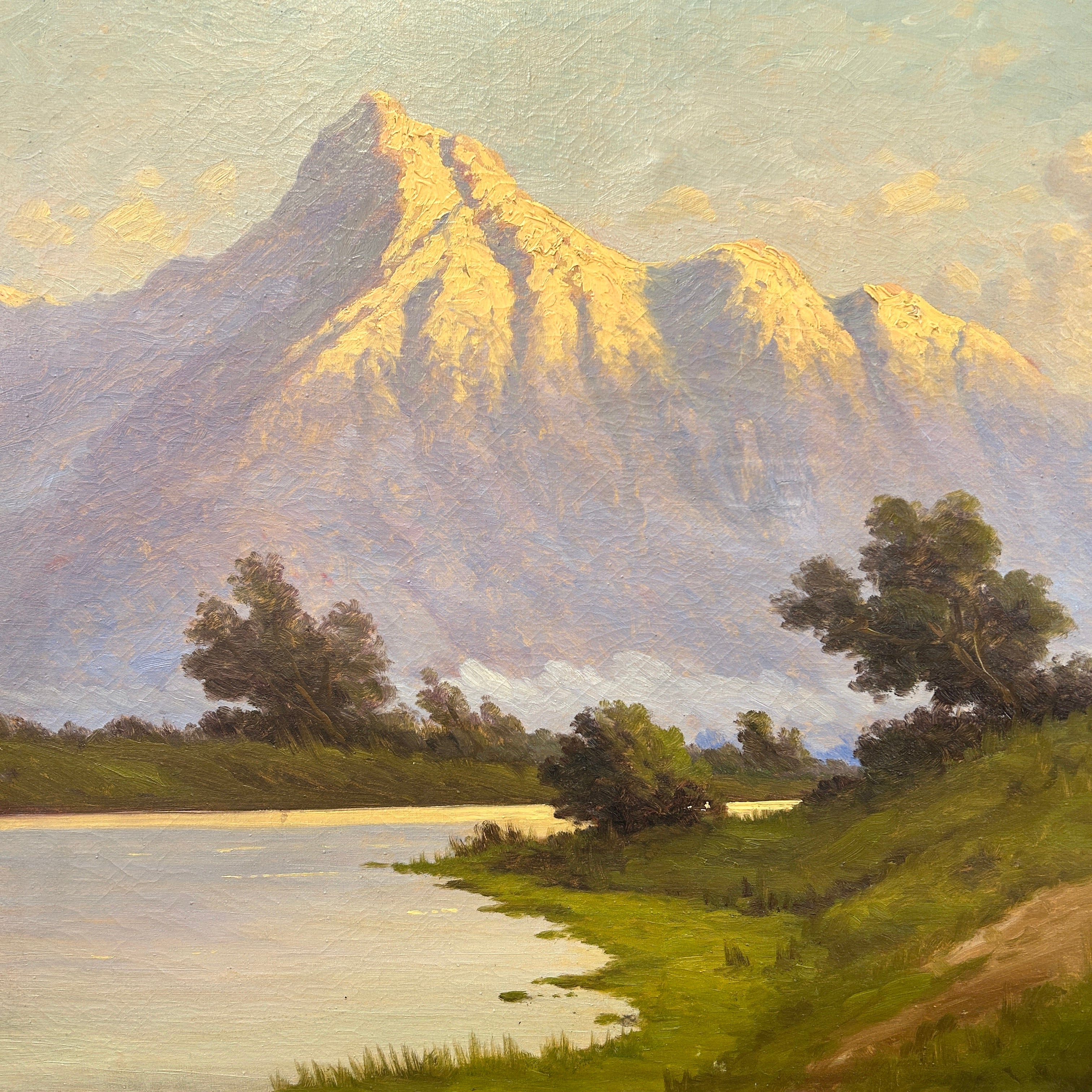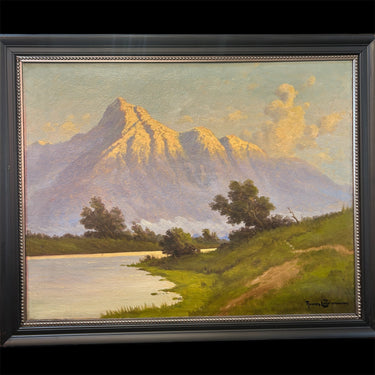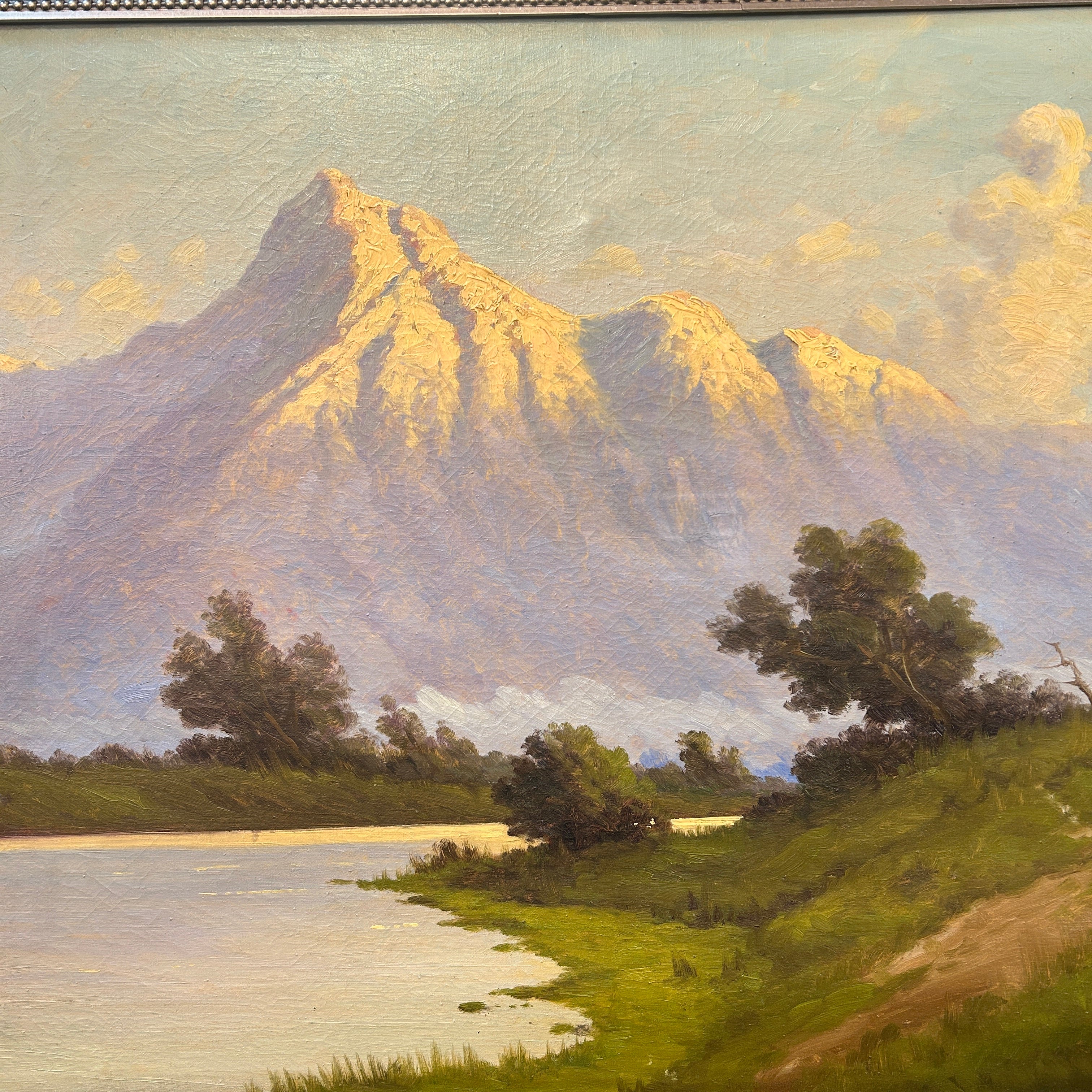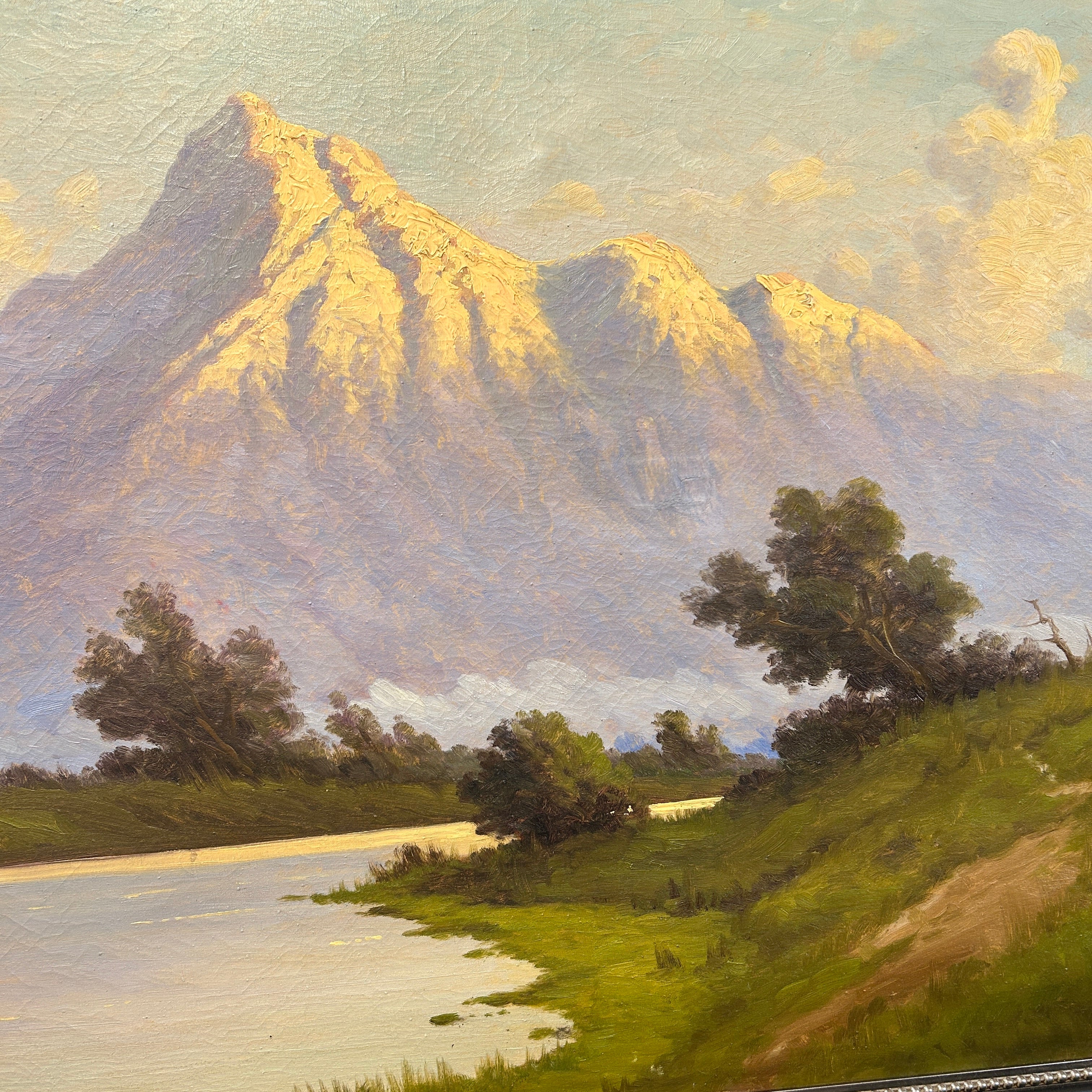 Conmovedora pintura de gran tamaño del artista chileno Benito Ramos Catalán, que retrata un hermoso piedemonte por donde pasa un río y con la cordillera de fondo. Maravillosa mezcla entre tonos cálidos y fríos nos brinda un juego de luces especial.