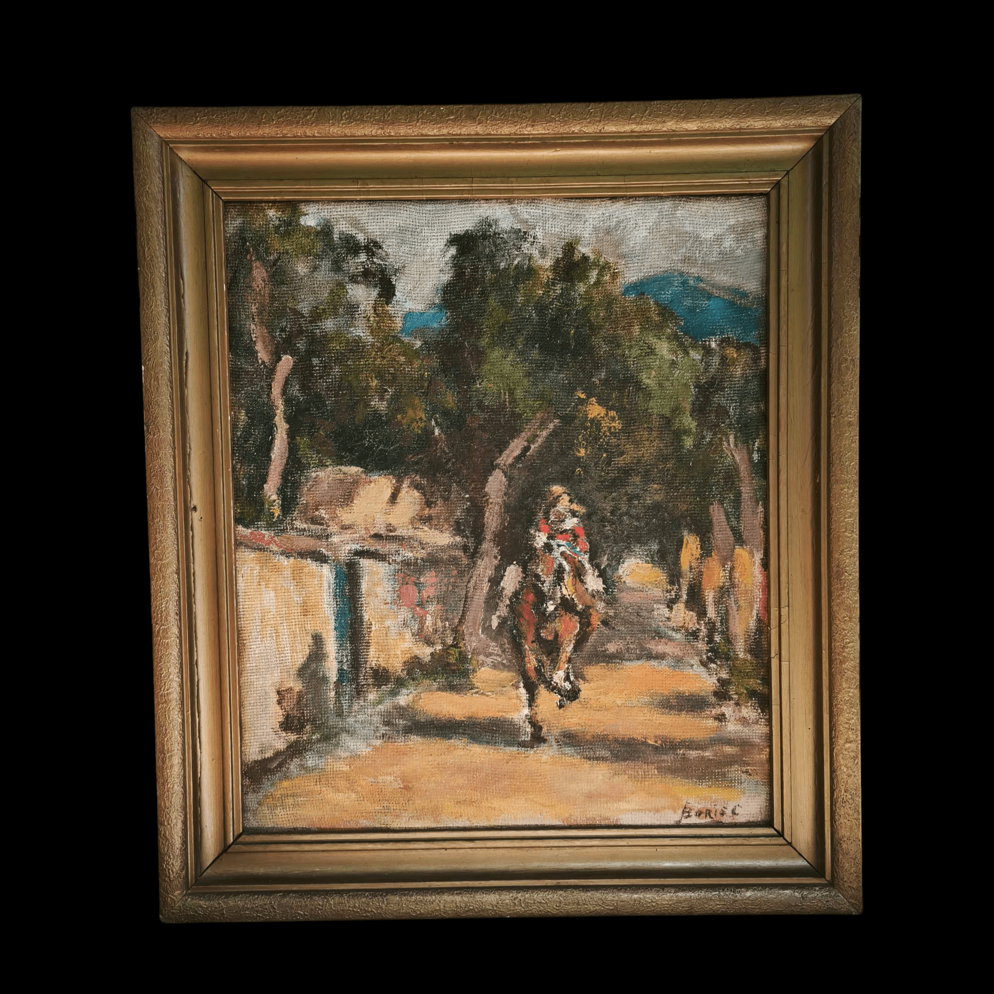 Oleo sobre tela firmado por el artista de origen catalán, Boris Casanova (1897-1989), español de cuna pero maulino de corazón. En la obra vemos una pequeña avenida rural por donde va pasando un jinete y su caballo. Colores vibrantes de estilo impresionista.