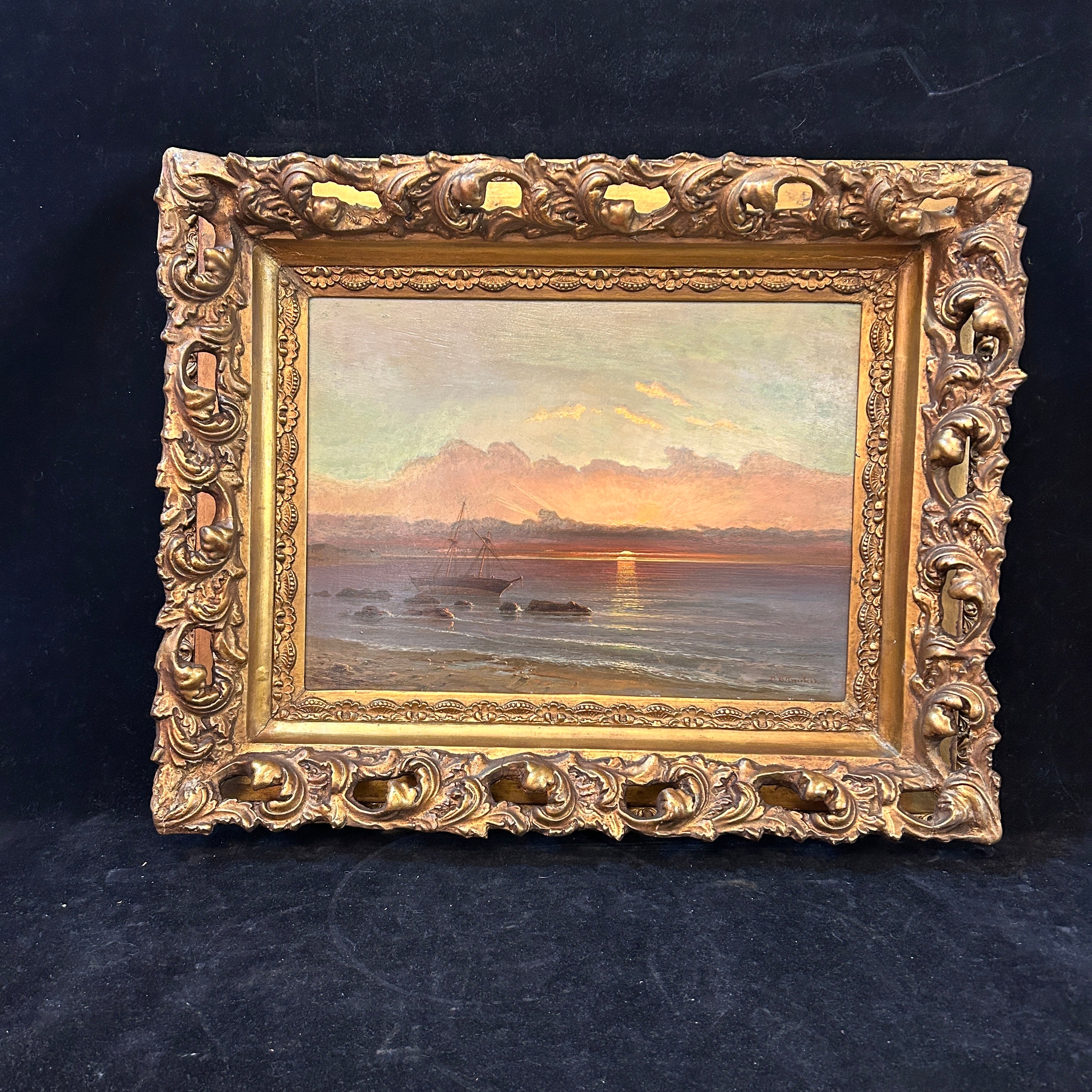 Conmovedor cuadro del pintor franco-chileno Desirée Chassin-Trubert (1860-1920) que nos brinda una maravillosa puesta de Sol junto al mar. Trubert y su talento indiscutible para realizar trazos tan realistas que dan la impresión de estar viendo una fotografía. El realismo majestuoso de la pintura con un Sol anaranjado que pinta las nubes sobre él nos transmite el recogimiento del fin del día, la calma del oleaje y la soledad de una embarcación.