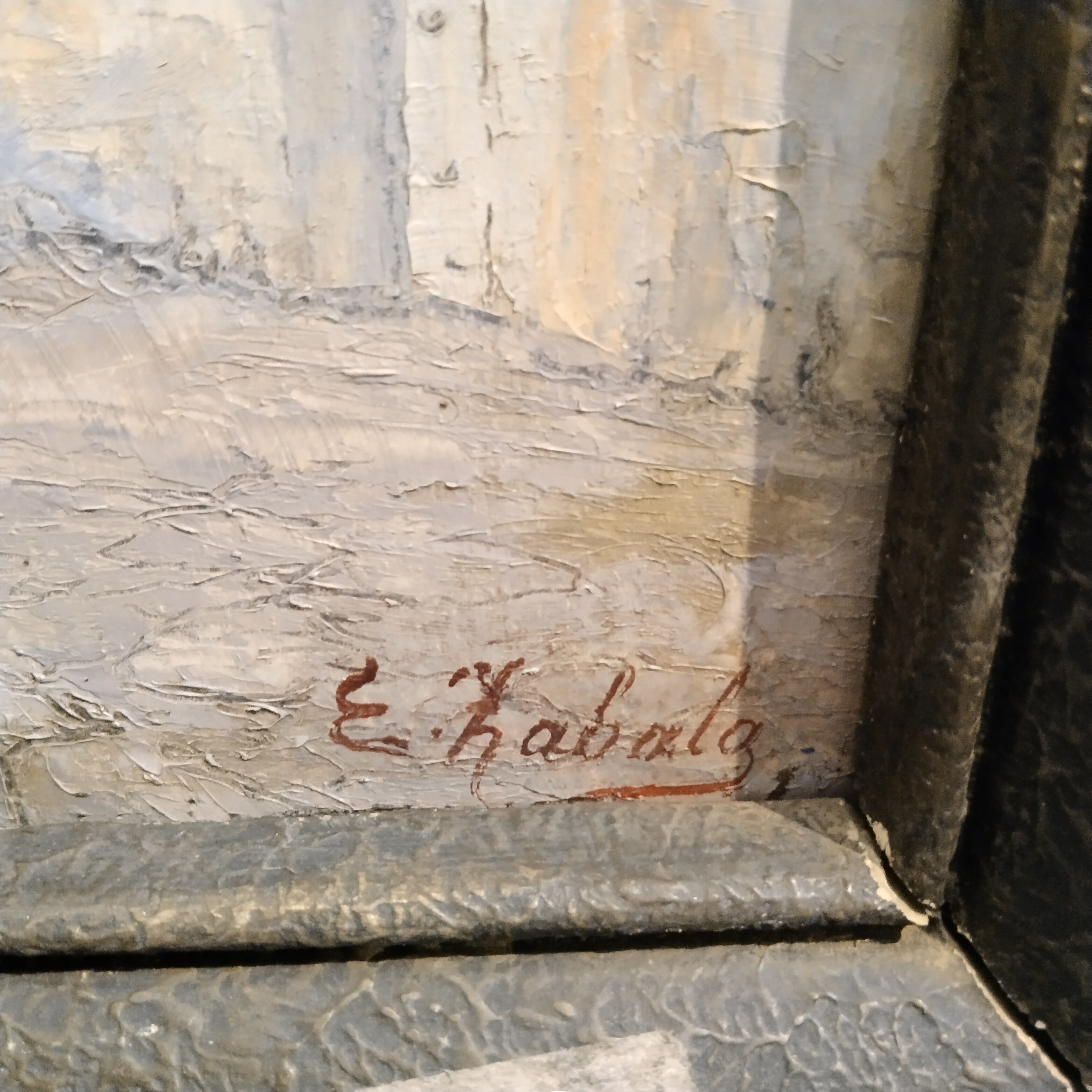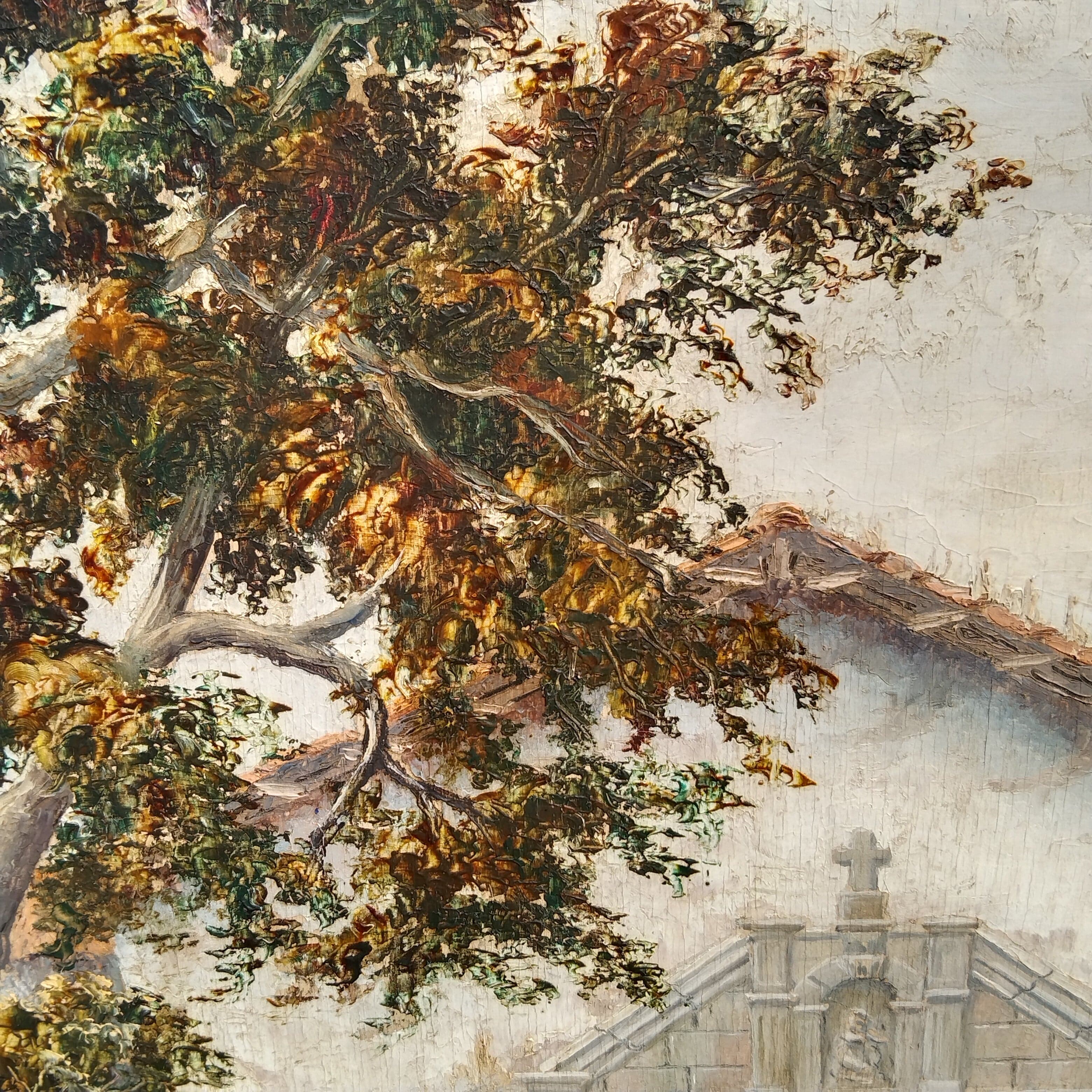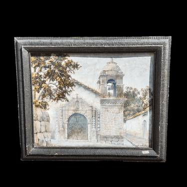 Bello óleo sobre madera de Esteban Zabala, representando el frontis de una iglesia de piedra, muy típica de algún pueblo colonial. La obra esá enmarcada en madera negra, con sutiles relieves en sus bordes.