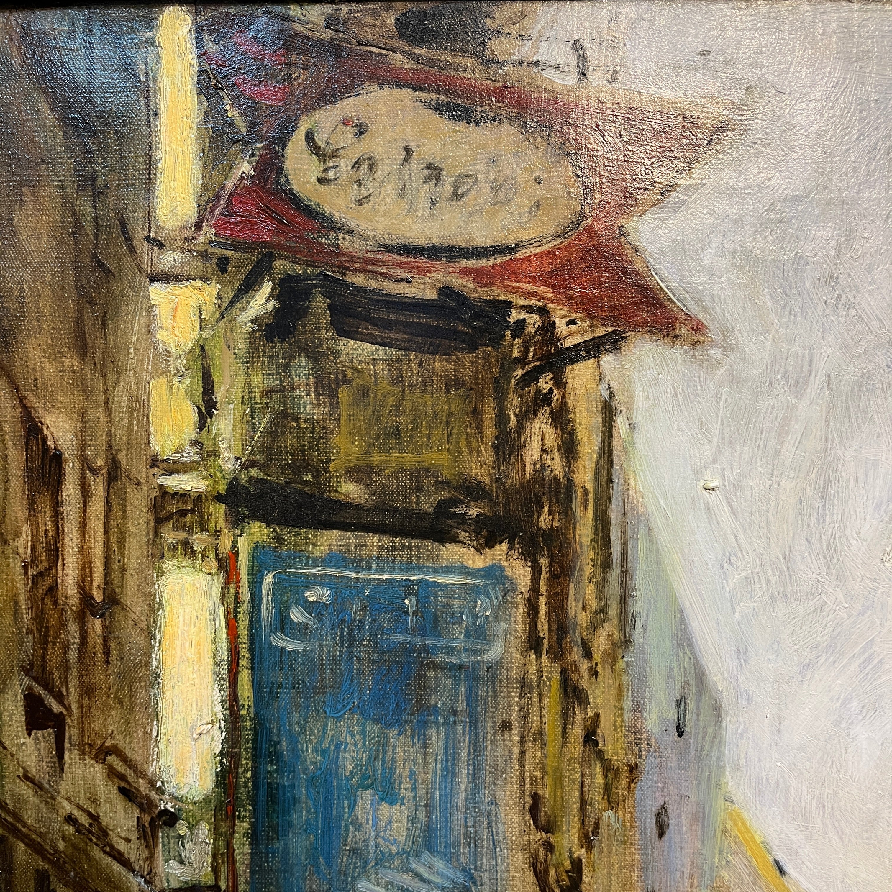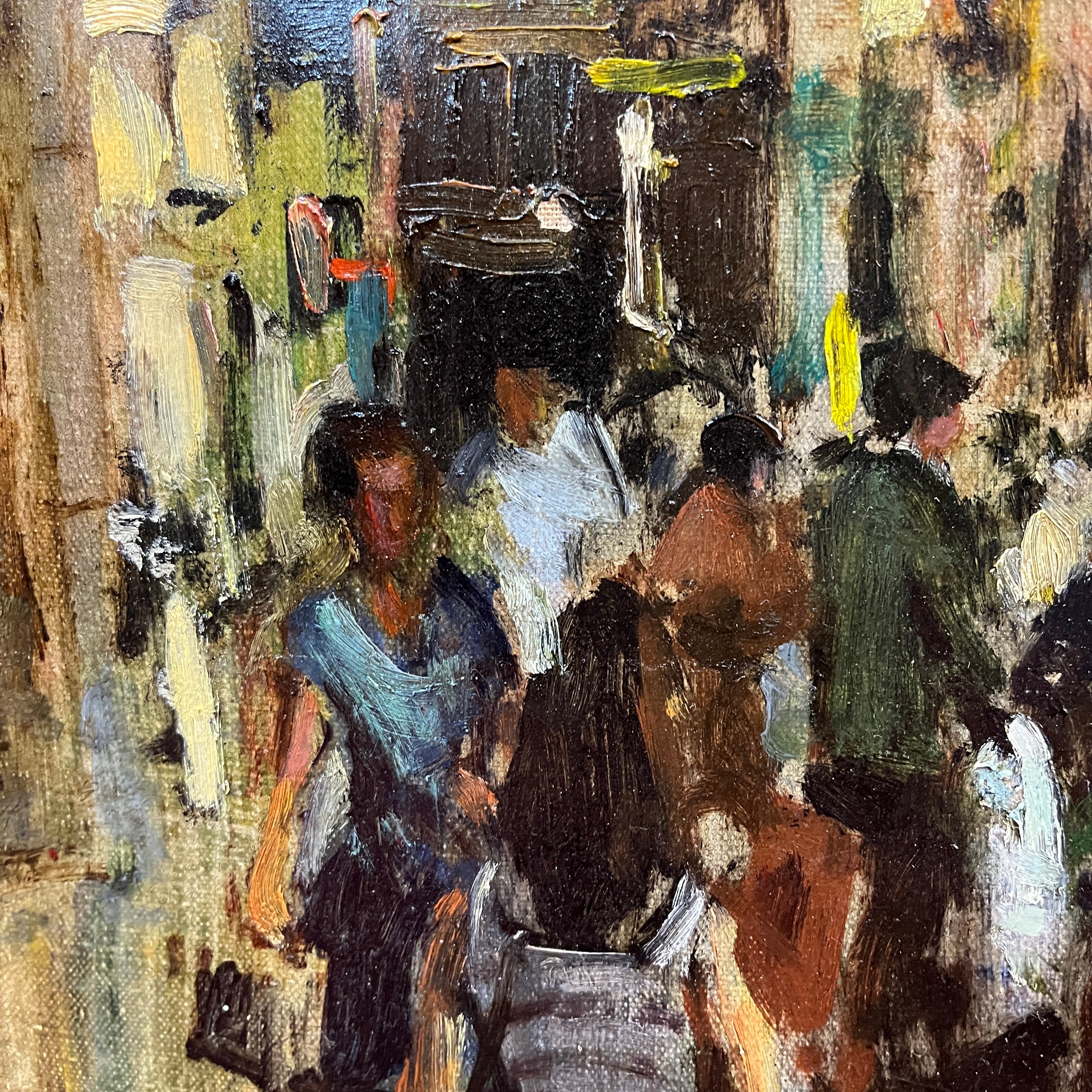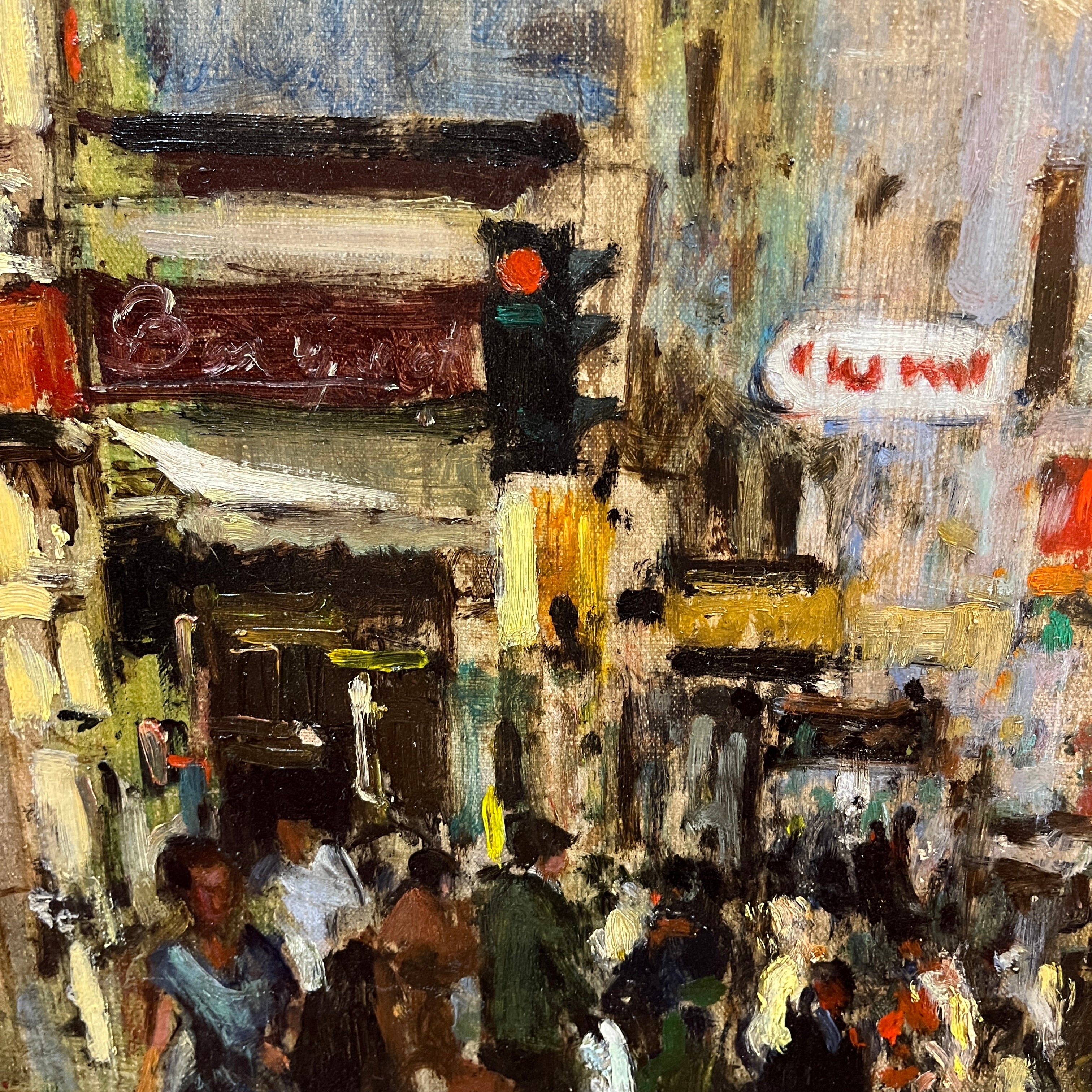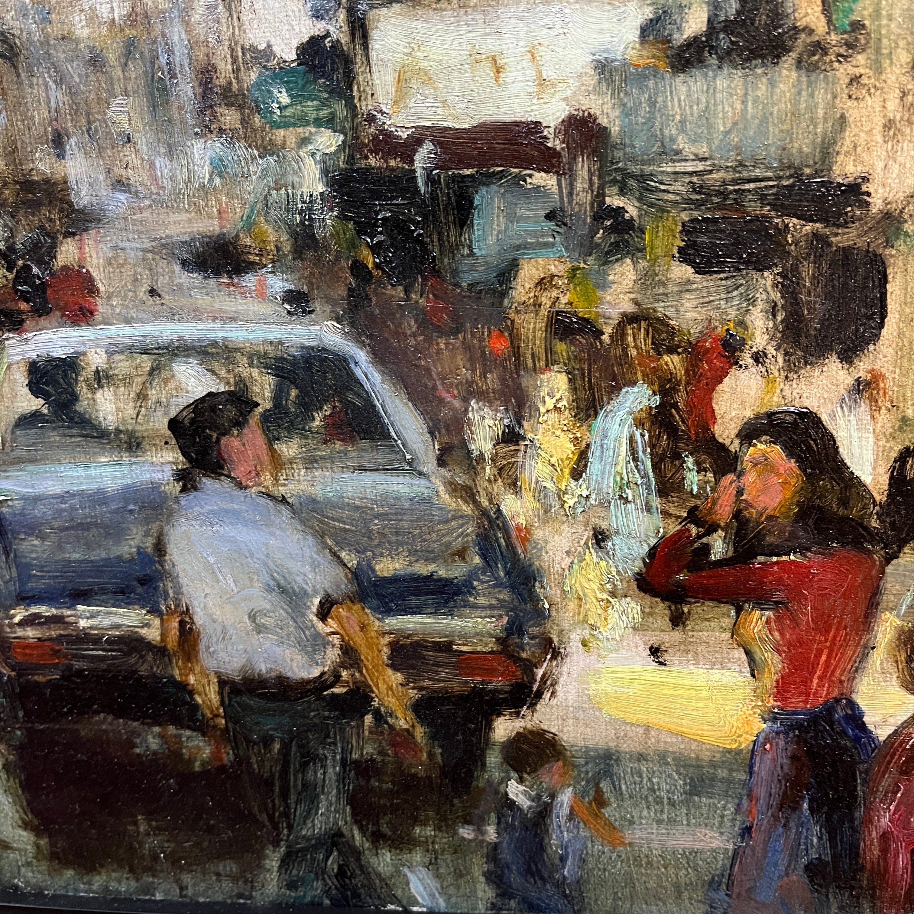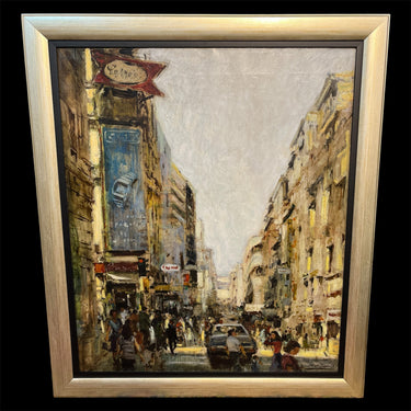 Óleo sobre tela del artista chileno Fernando Morales Jordán (1920-2003), representando un paisaje urbano de una esquina concurrida del centro de Santiago. La obra, a pesar de utilizar un trazo que no busca la definición en detalle de los elementos, hace muy reconocible que se trata de un escena del centro de Santiago, debido los elementos que selecciona, como el gran cartel publicitario de la popular marca Carozzi. La obra tiene un marco contemporáneo de madera pintada en plateado.
