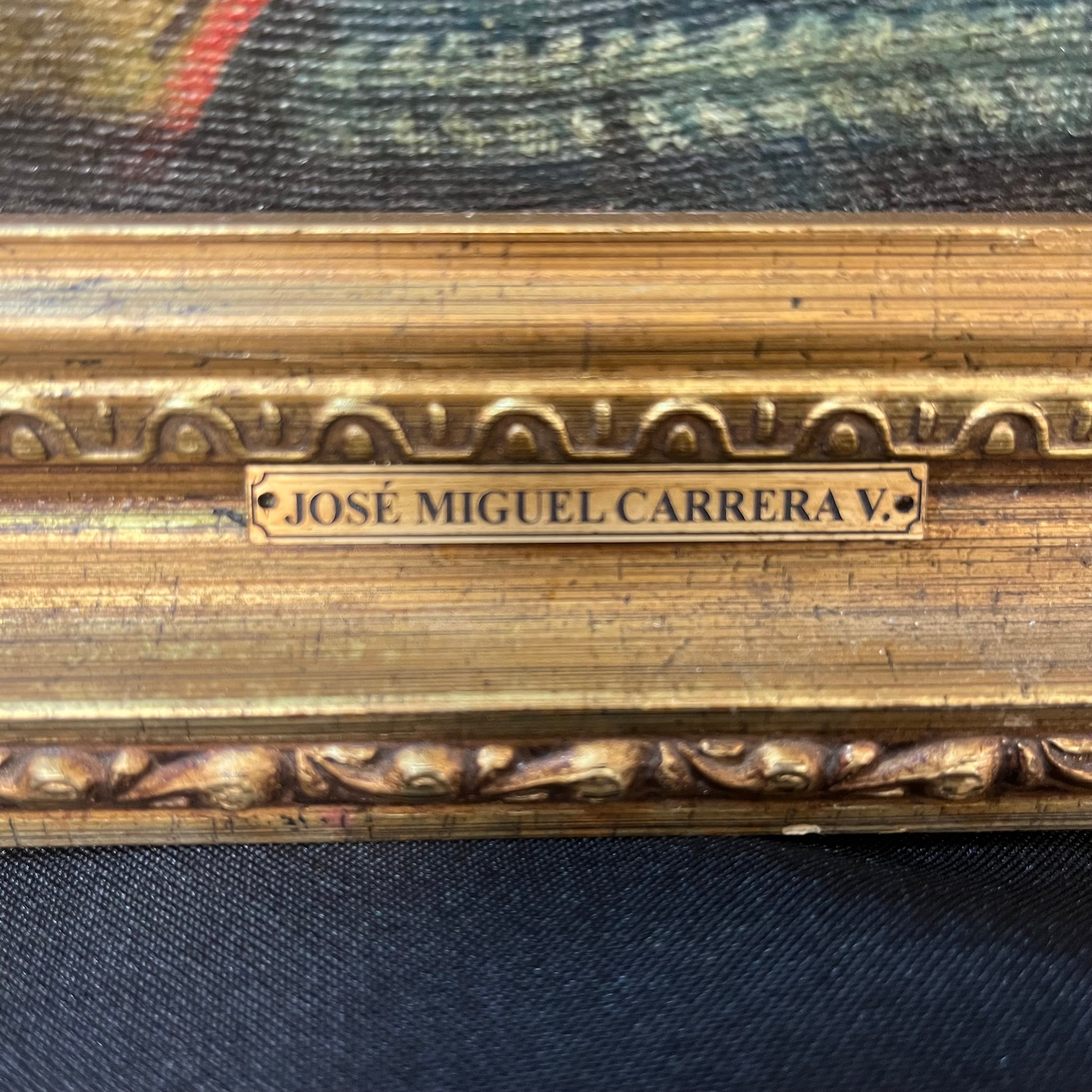 Óleo sobre tela del pintor chileno Fernando Ruiz, retratando a José Miguel Carrera. La obra tiene un marco de madera dorada, tallada en relieves decorativos.