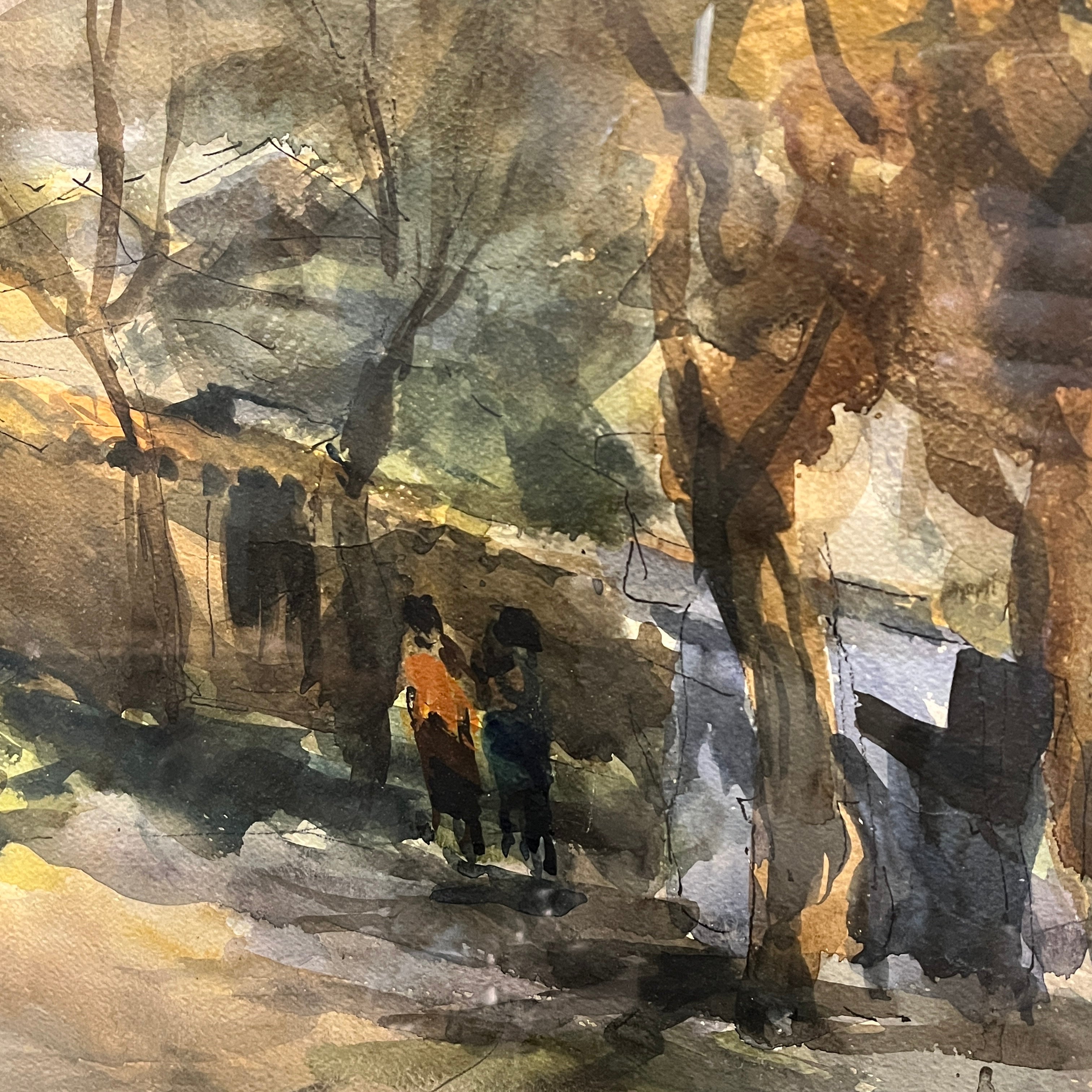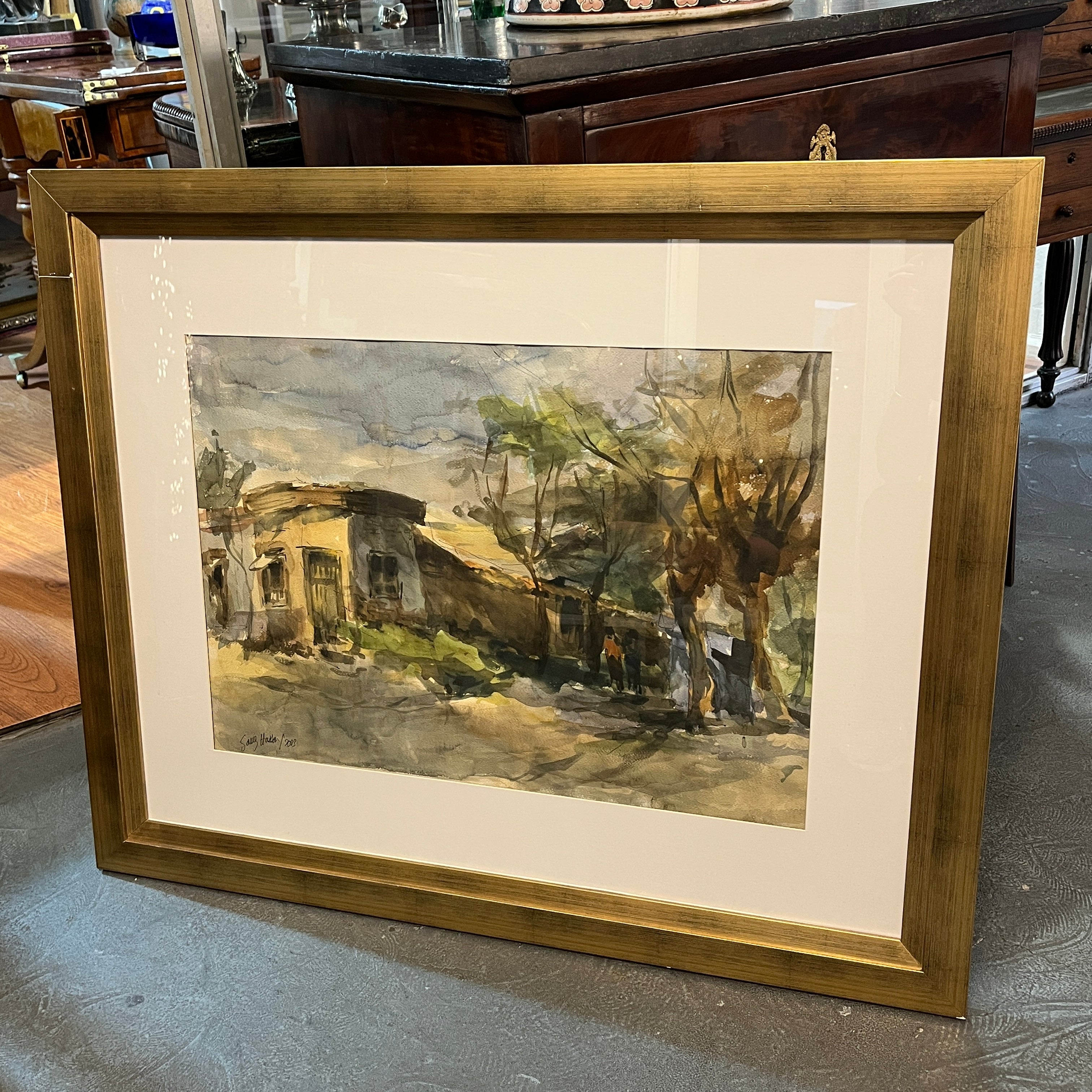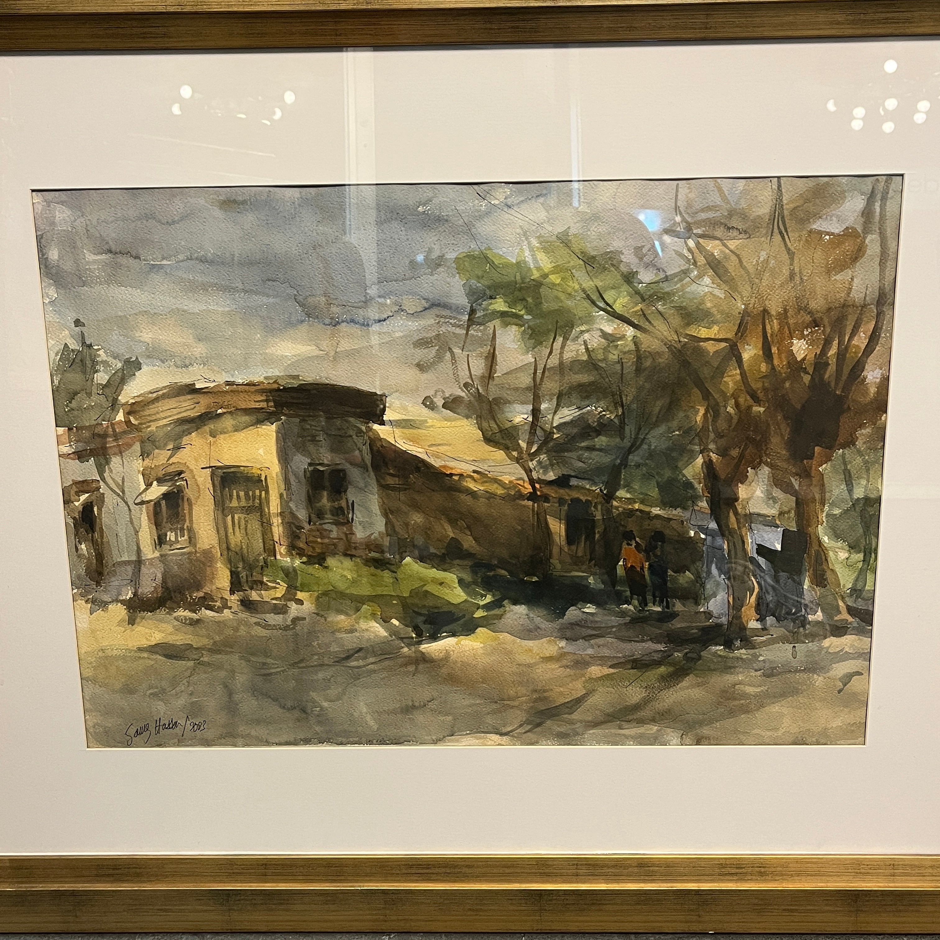 Acuarela sobre papel del artista chileno Manuel Gómez Hassan (1924), representando la vista de una calle con casas de fachada continua y una pequeña plaza con un quiosco azul, en la que dos personas caminan protegidas por la sombra de los árboles. Se trata, seguramente, de un barrio de Santiago como Quilicura, lugar que el artista retrató bastante durante su carrera.
