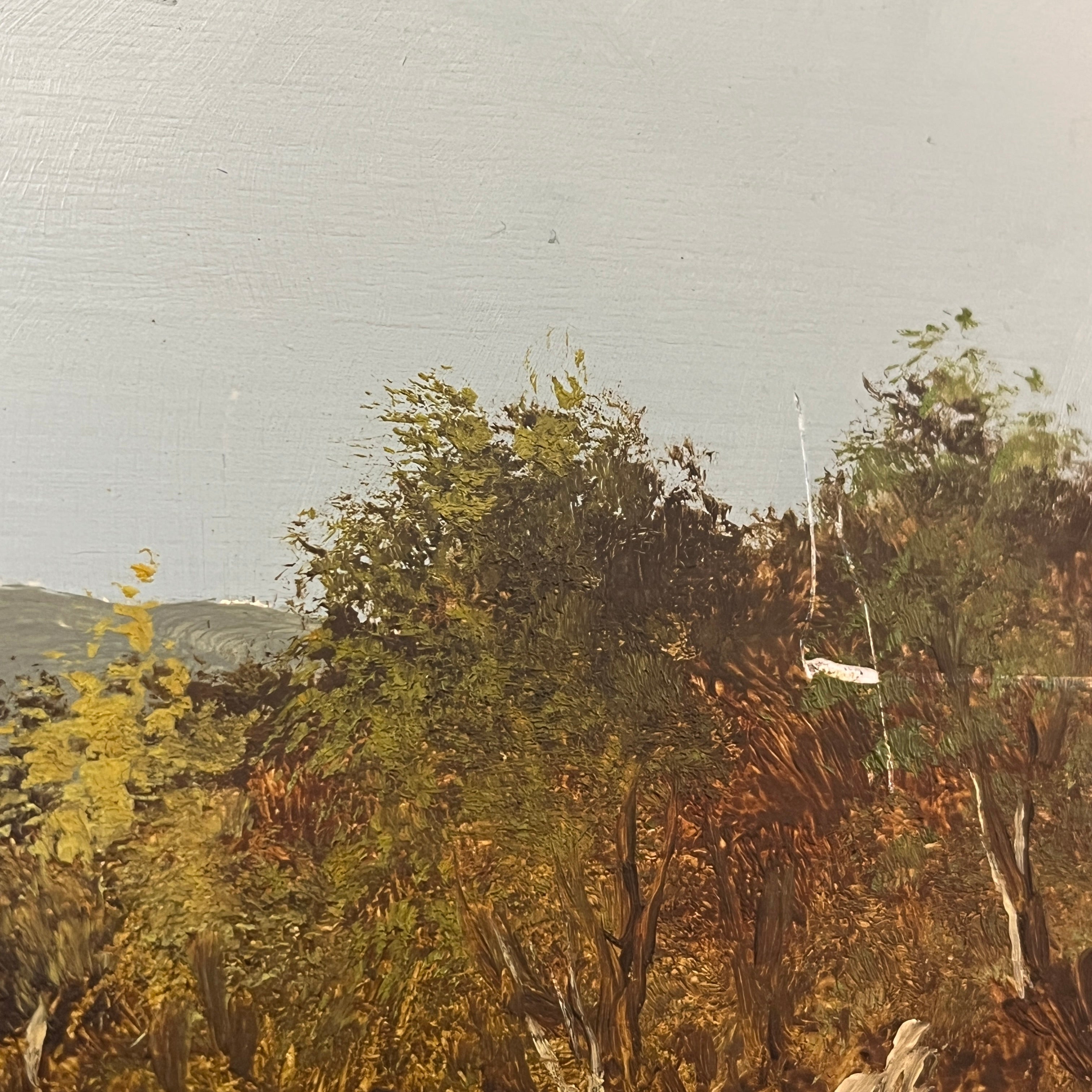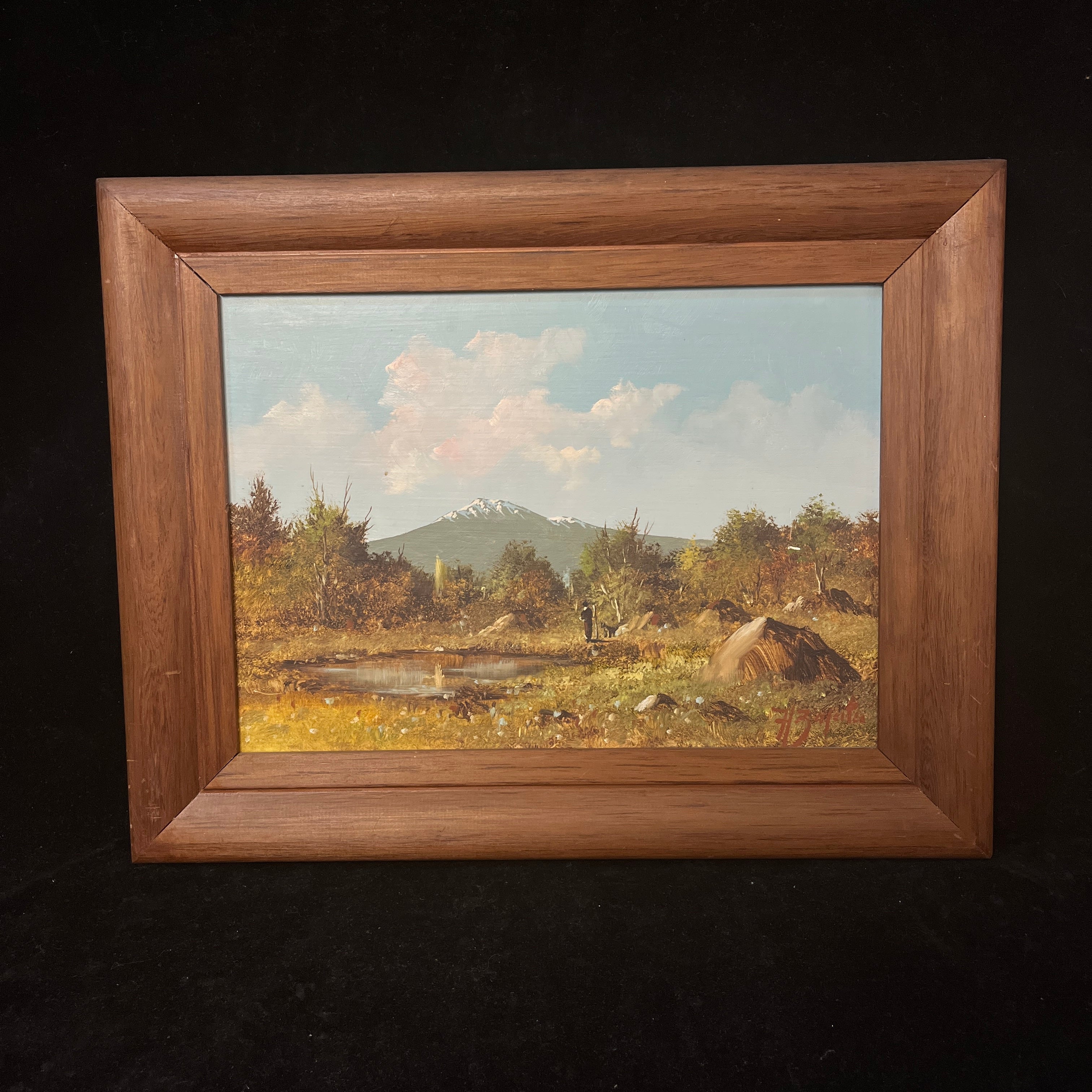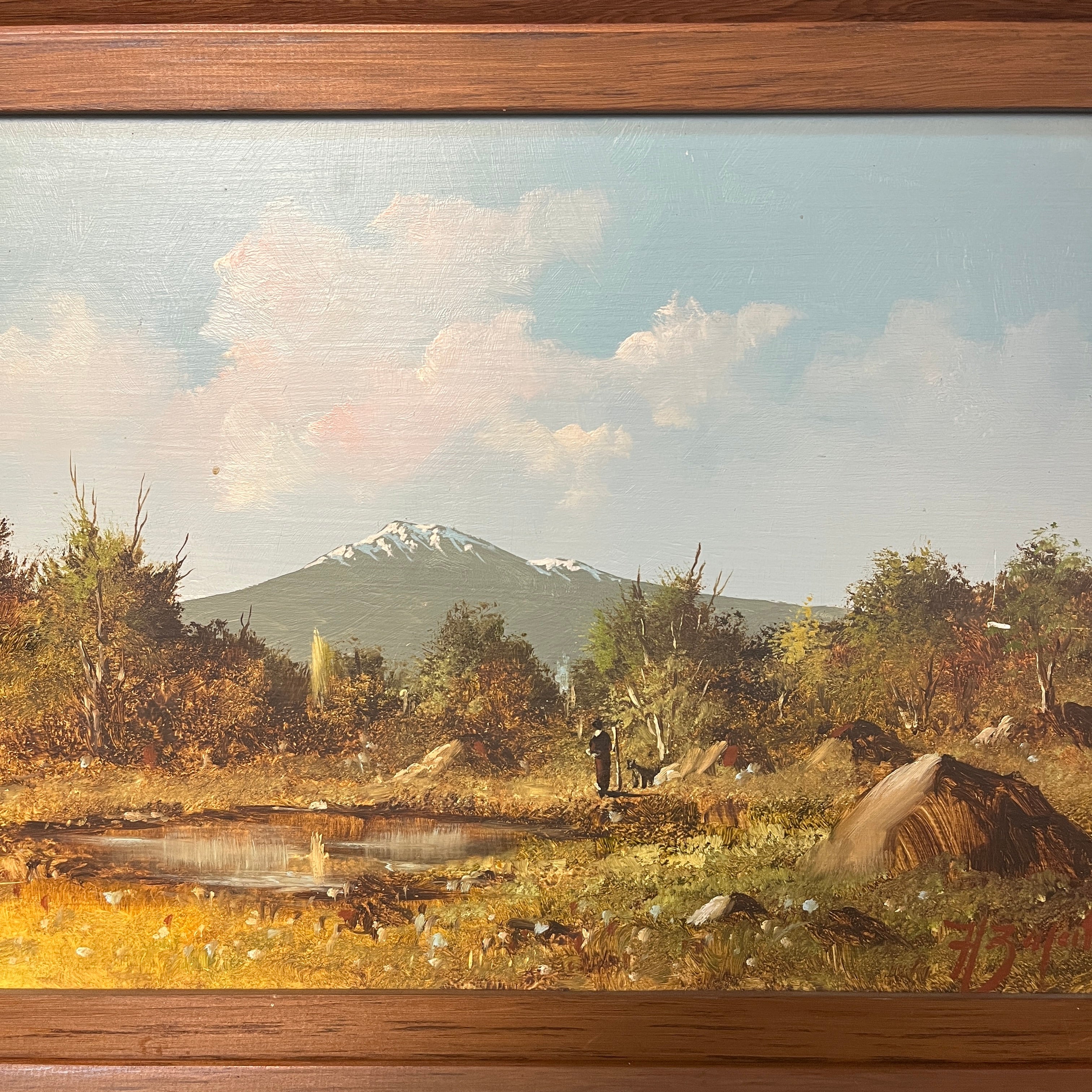 Hugo Zapata - Óleo sobre madera paisaje cordillera caminante con perro