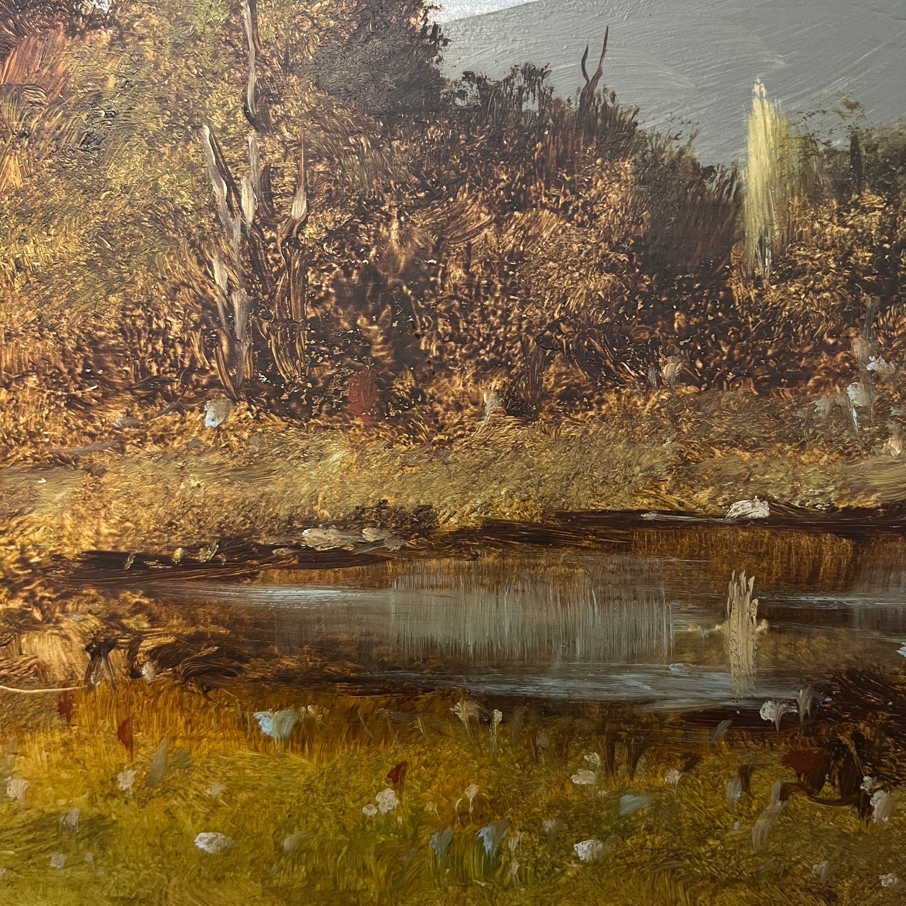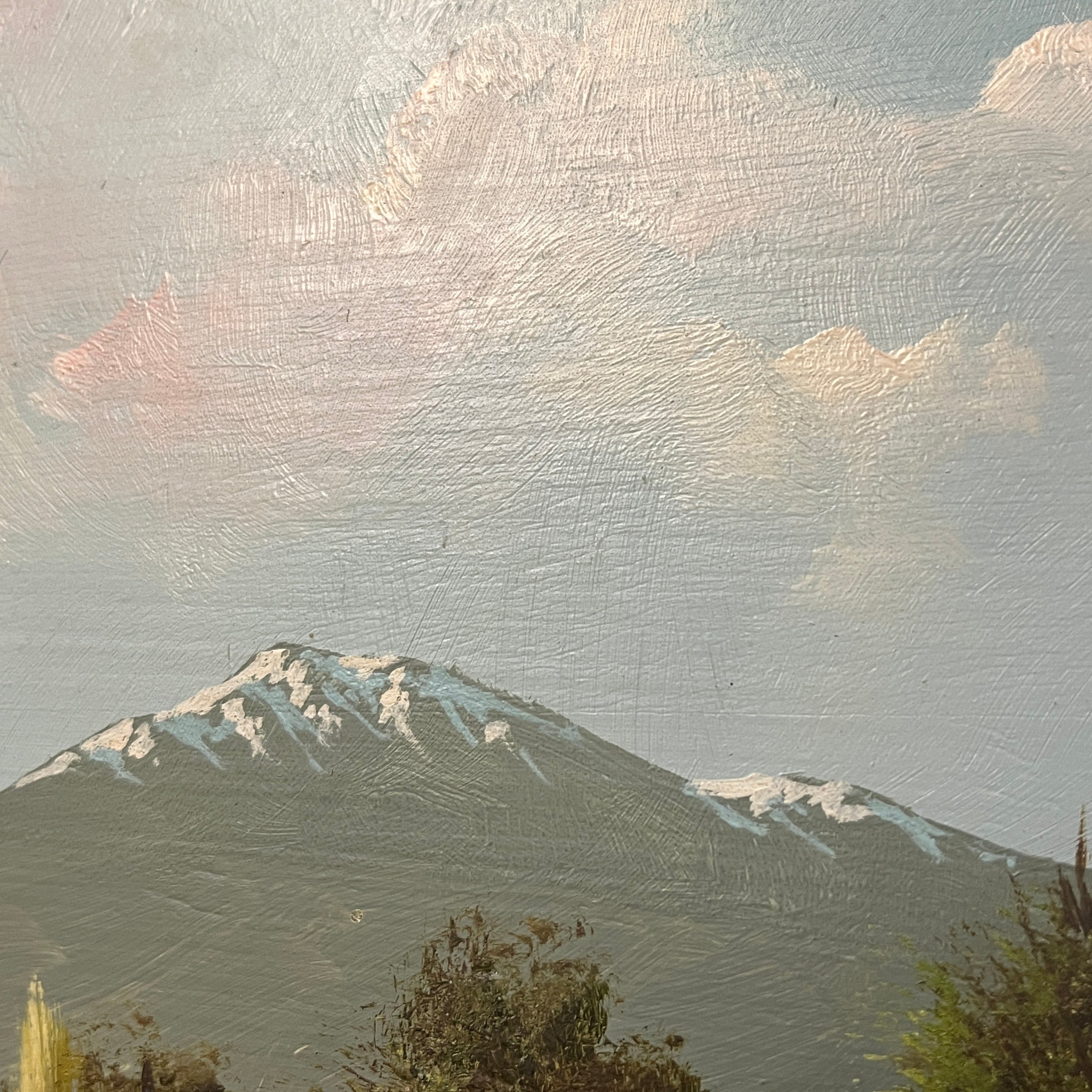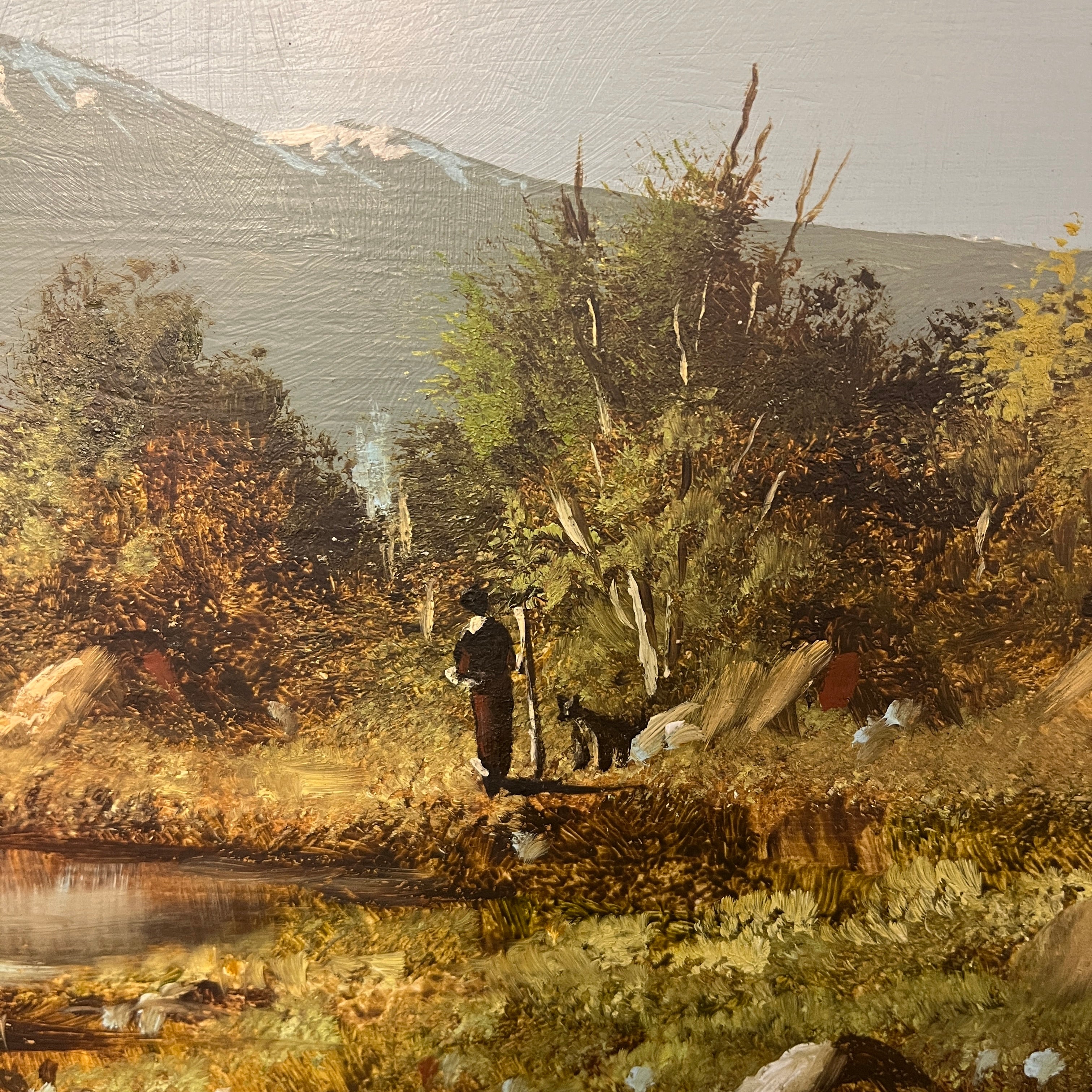 Paisaje cordillerano del pintor chileno Hugo Zapata, que captura a un hombre y su perro en la lejanía, junto a una pequeña laguna que refleja el cielo, observando la cima de una montaña. La obra tiene el reconocible estilo detallista del pintor, especialmente en la manera de ir construyendo la vegetación a partir de pequeños trazos, generando una composición densa y minuciosa. La obra está enmarcada en sobria madera de color café.
