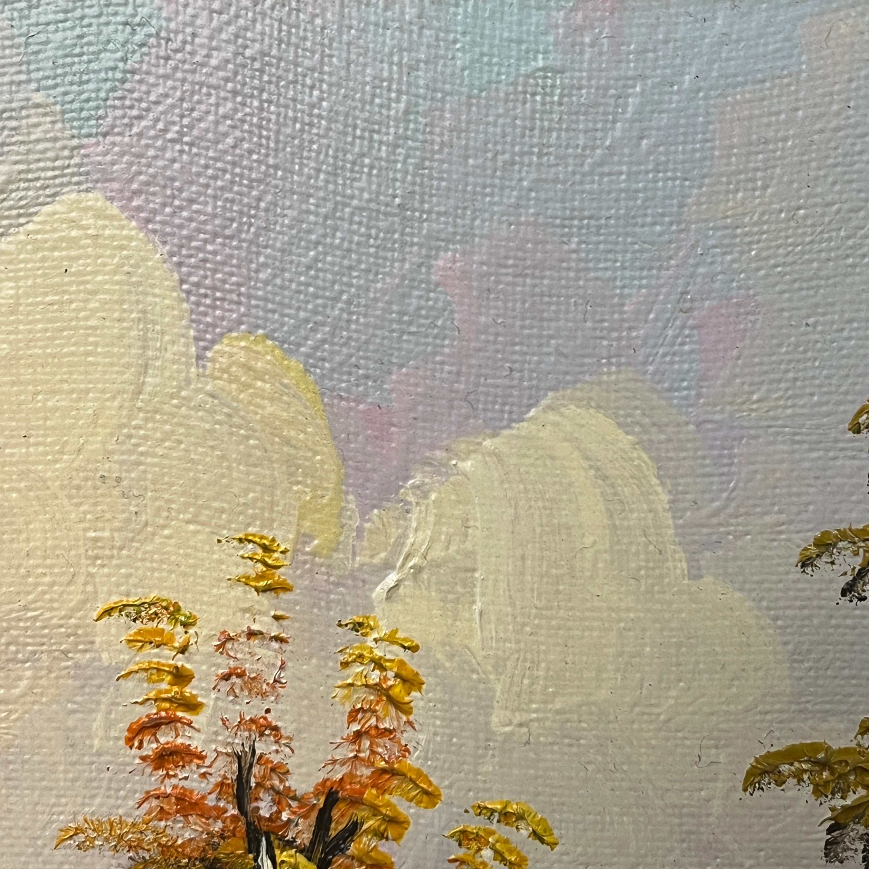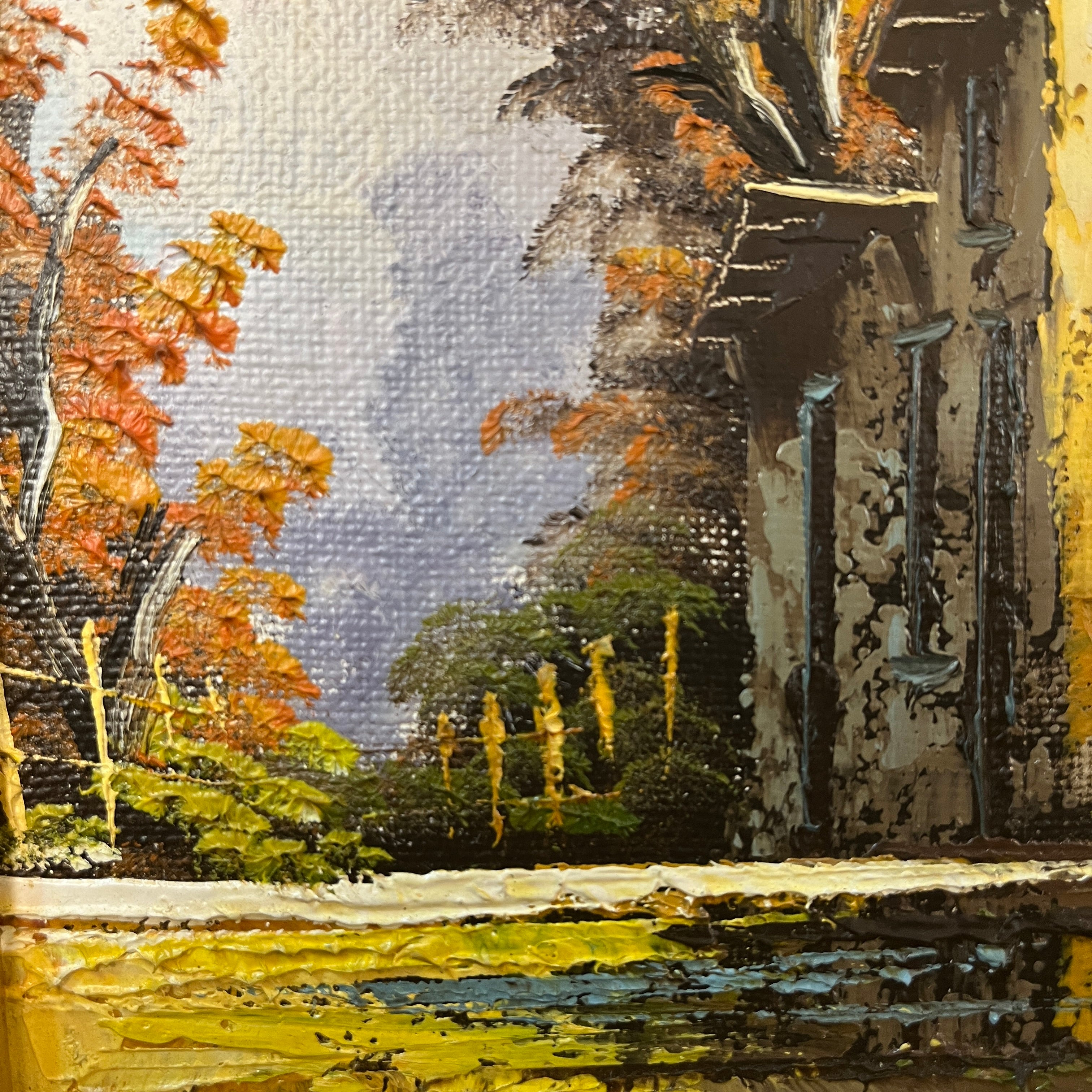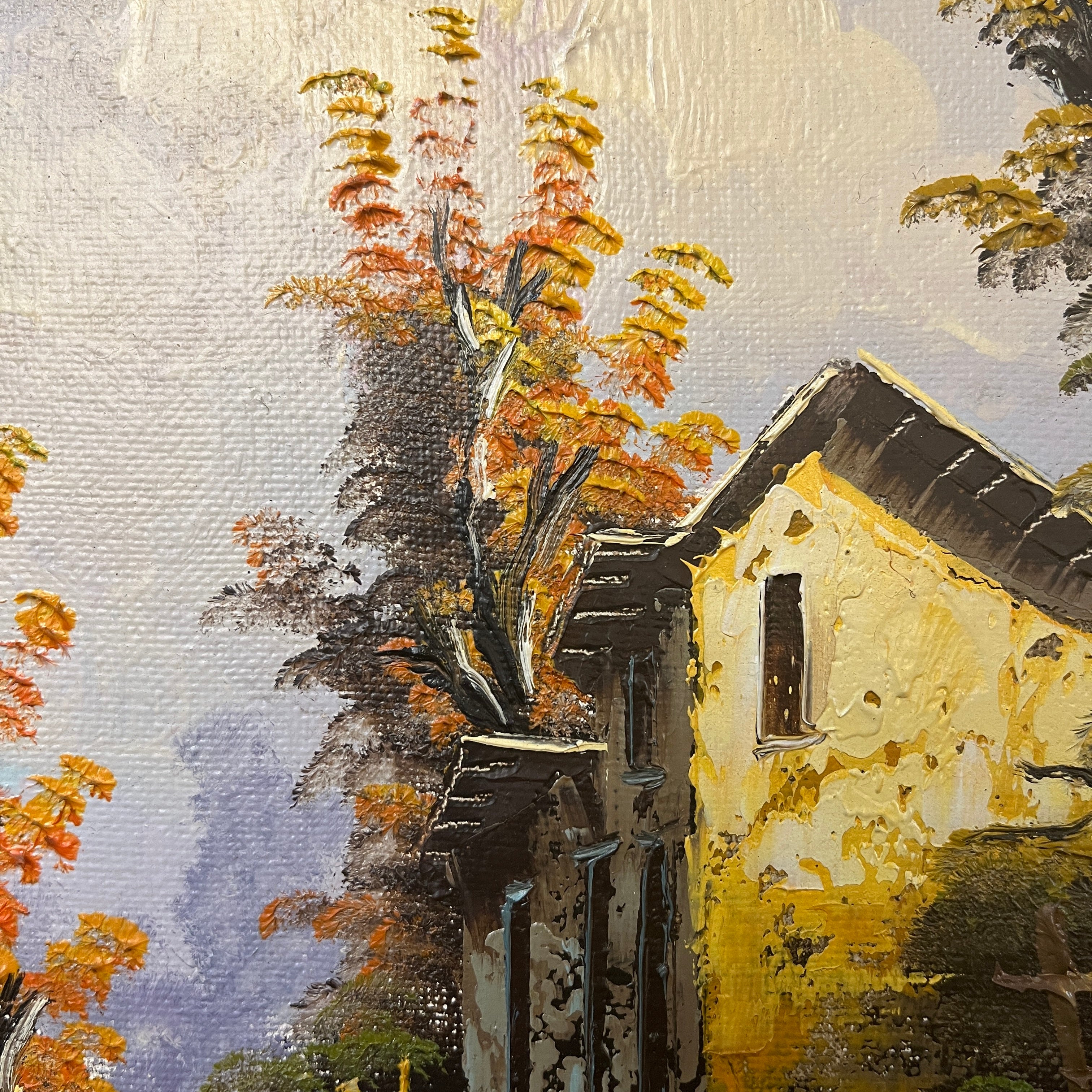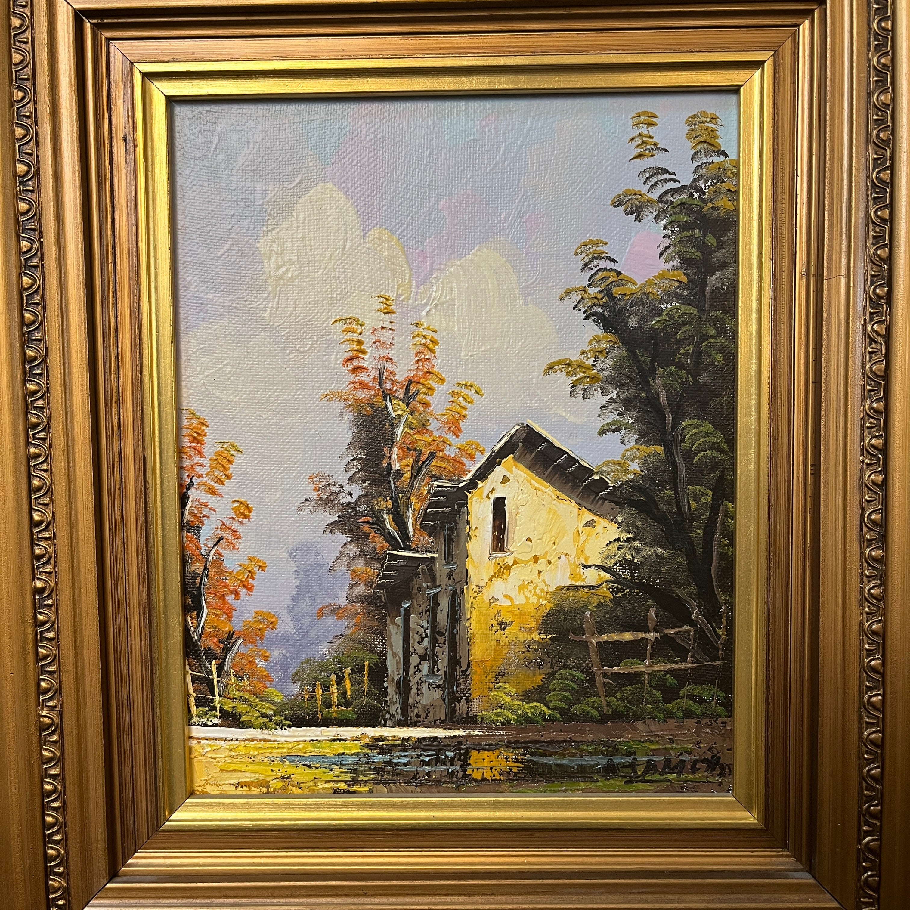 Óleo sobre tela del pintor chileno Alejandro Jamett, representando la vista a la fachada de una casa blanca de estilo campestre, en medio de un camino. El pintor tiene un bello juego de colores y texturas, tanto en el cielo como en los árboles anaranjados que destacan a la vista, como en el reflejo del agua sobre el camino.