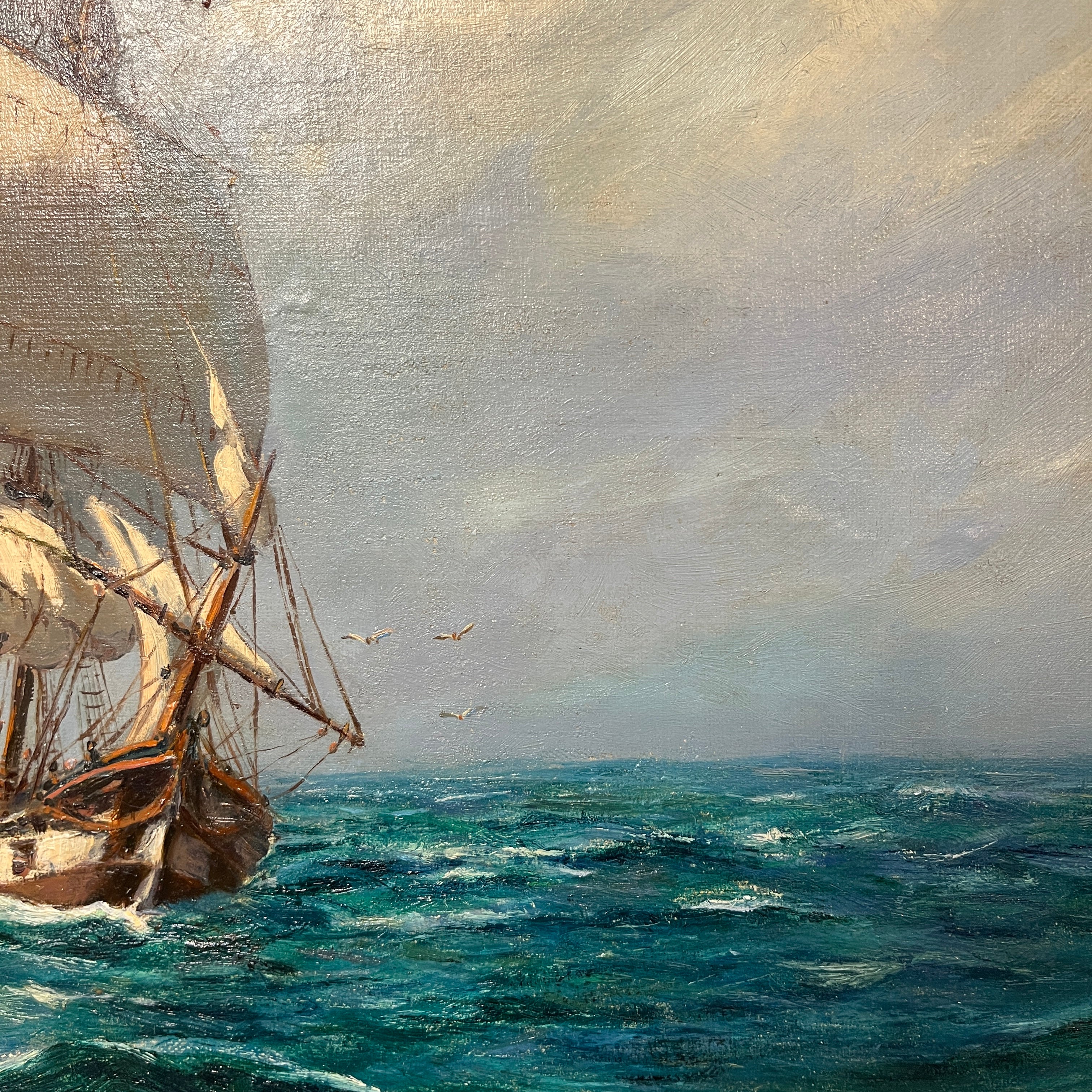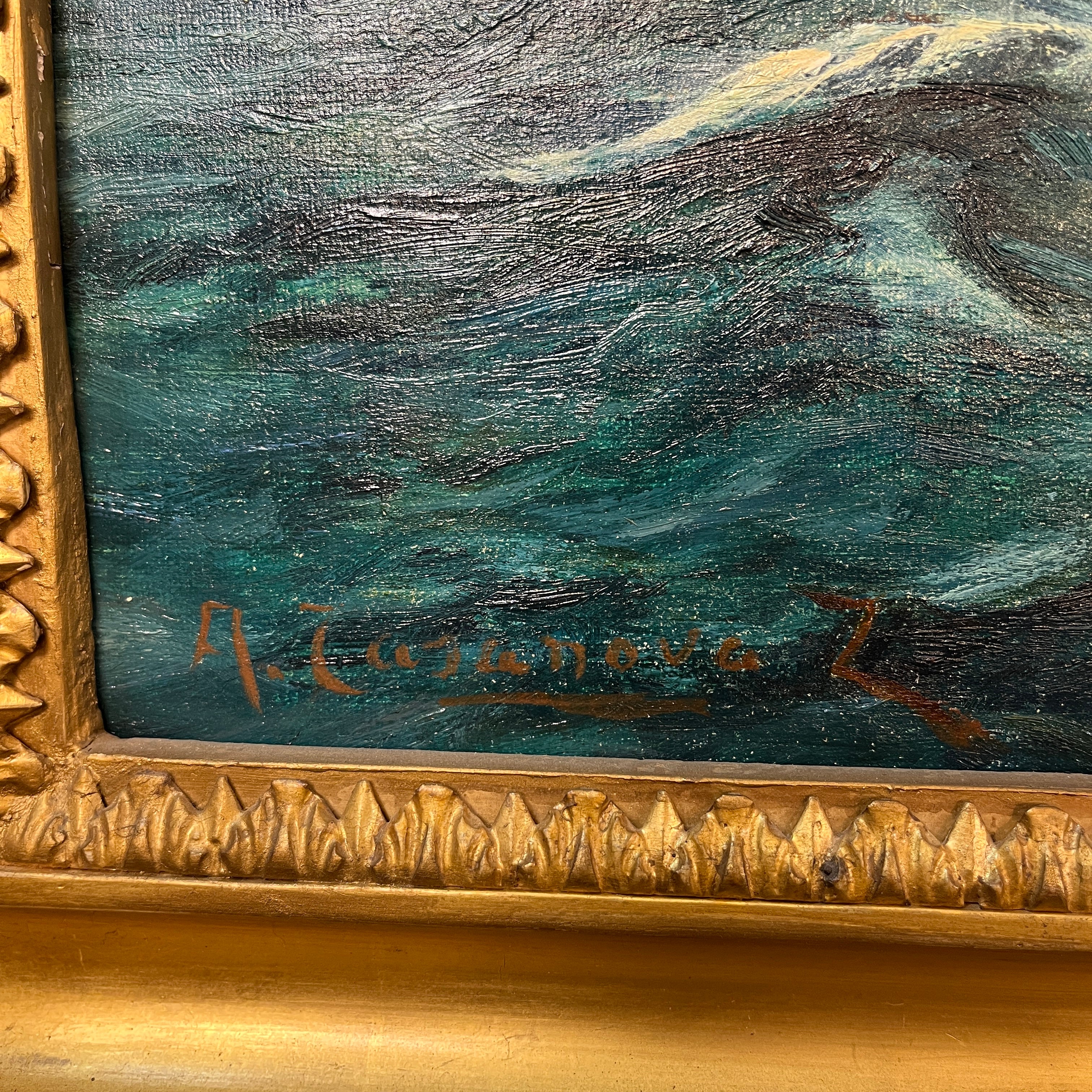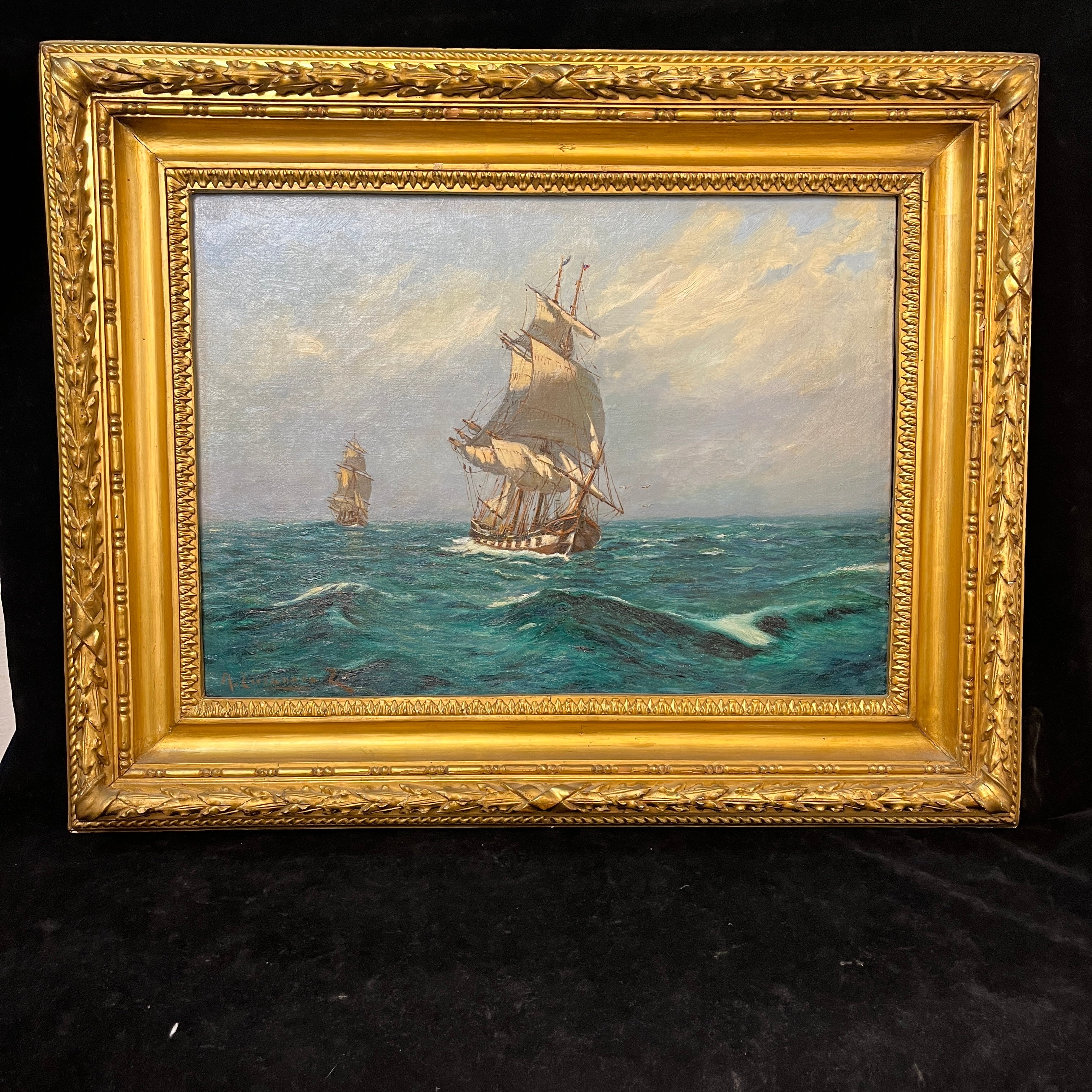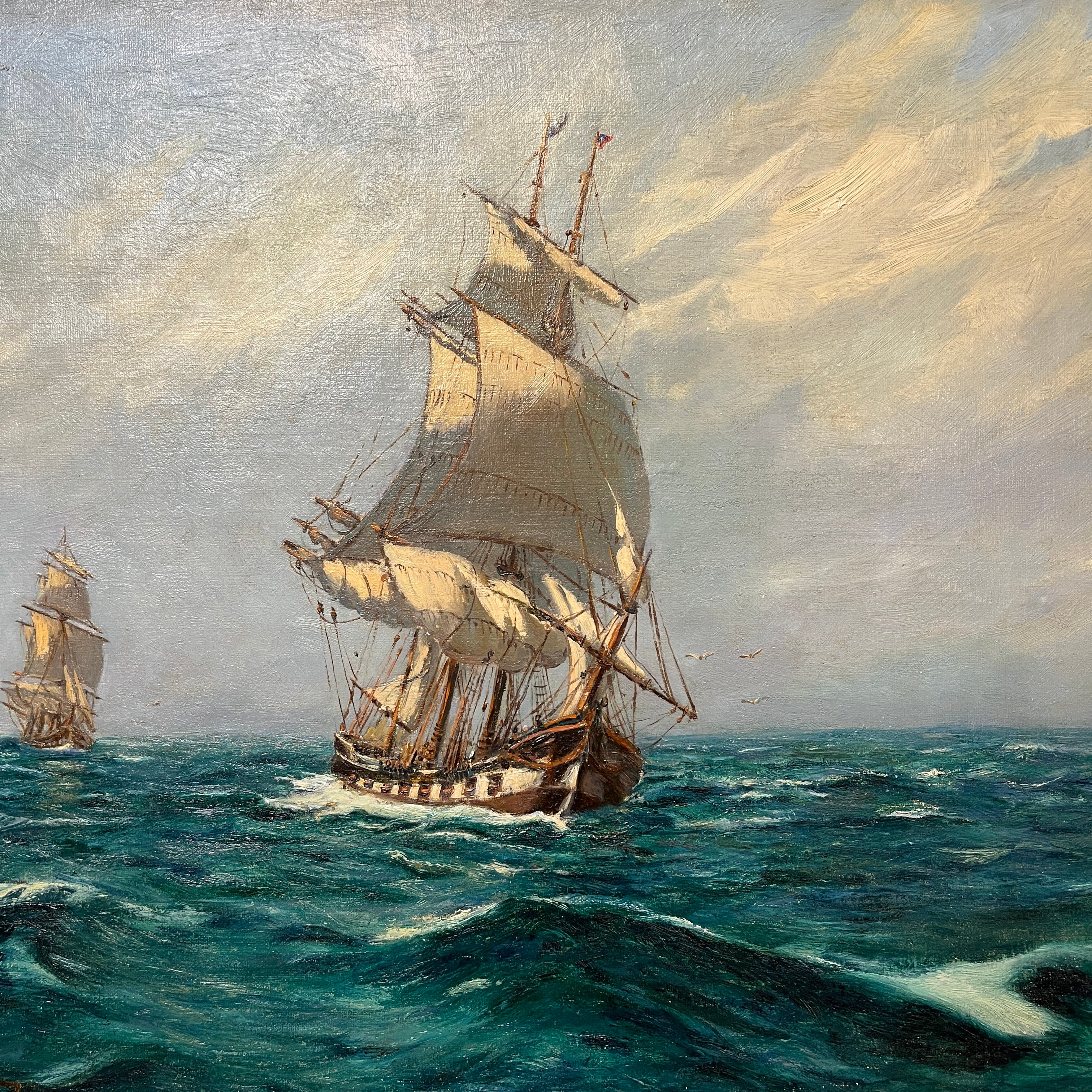 Marina del destacado pintor chileno Álvaro Casanova Zenteno. Una de sus clásicas pinturas con motivos navales. La escena nos muestra dos embarcaciones navegando en alta mar con un mar un poco encrespado y un cielo nuboso. Casanova nos envuelve con su pintura realista.