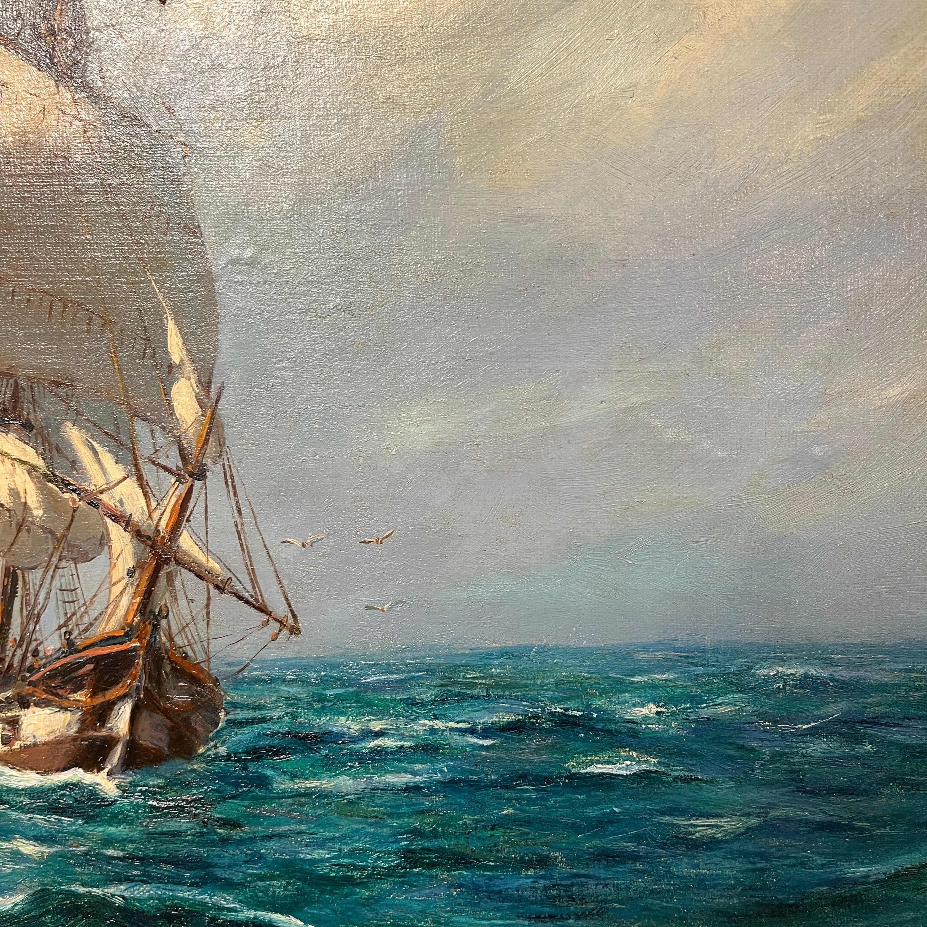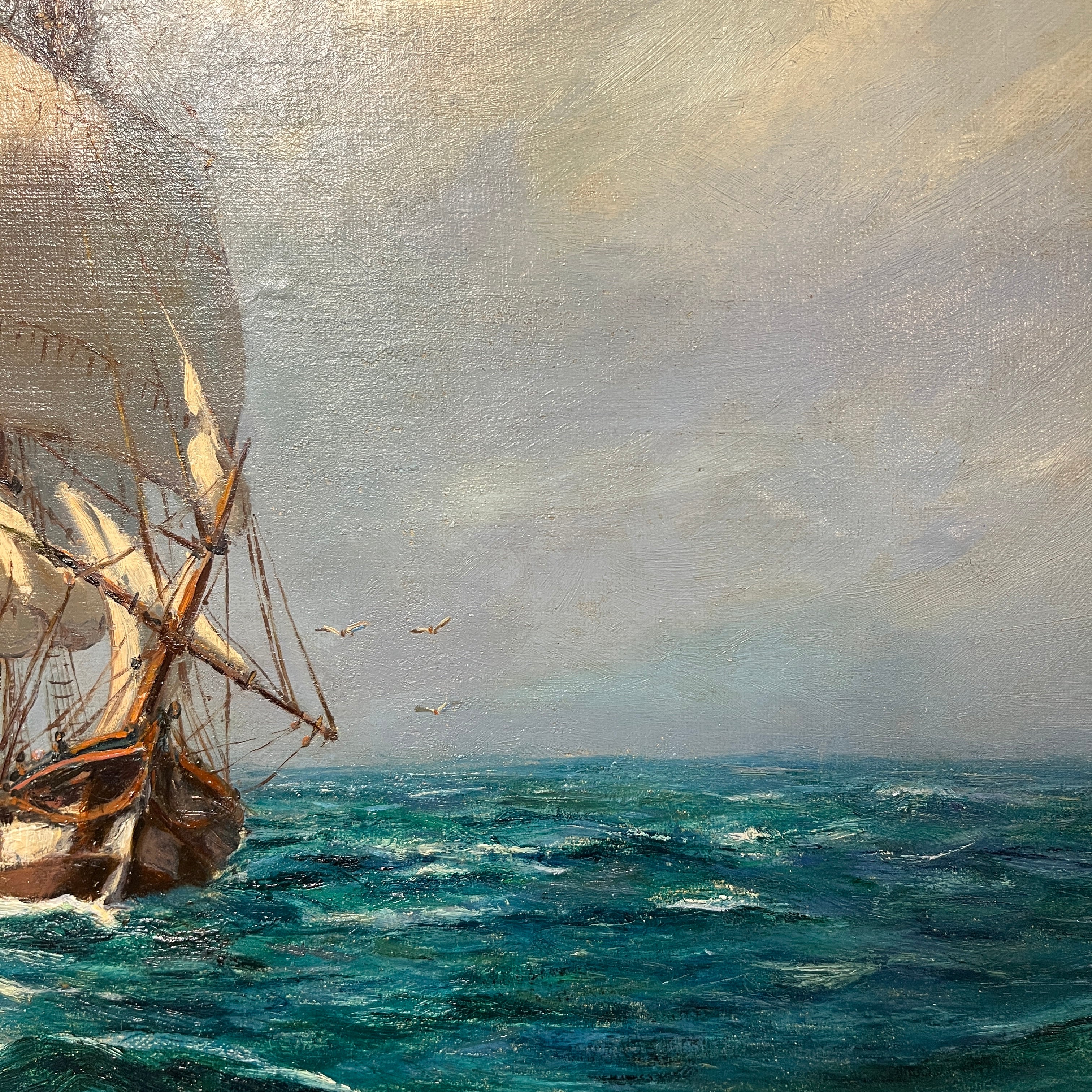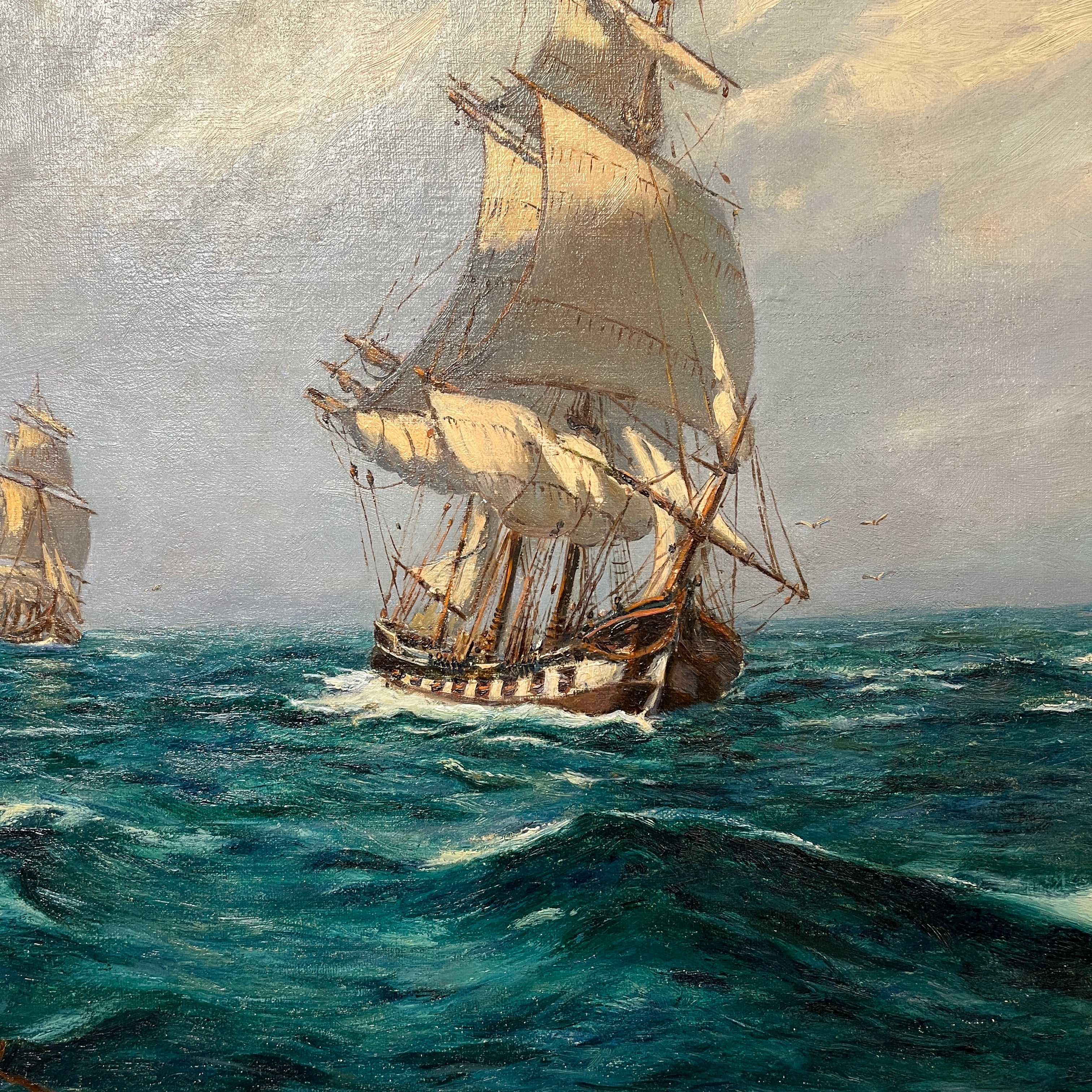 Marina del destacado pintor chileno Álvaro Casanova Zenteno. Una de sus clásicas pinturas con motivos navales. La escena nos muestra dos embarcaciones navegando en alta mar con un mar un poco encrespado y un cielo nuboso. Casanova nos envuelve con su pintura realista.