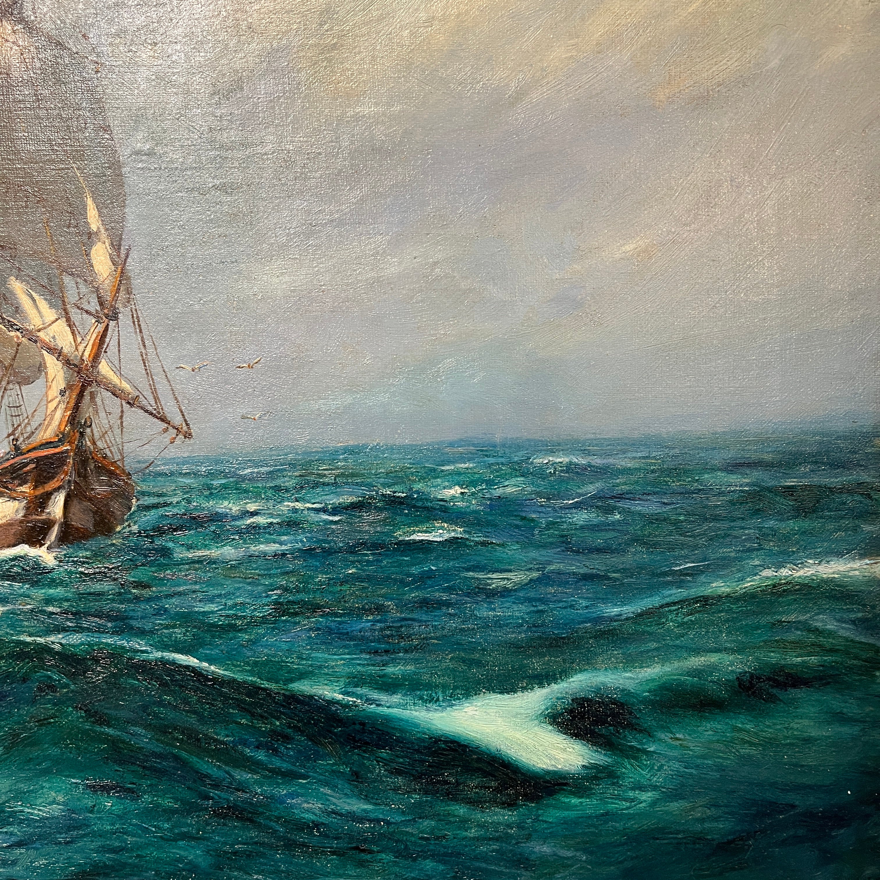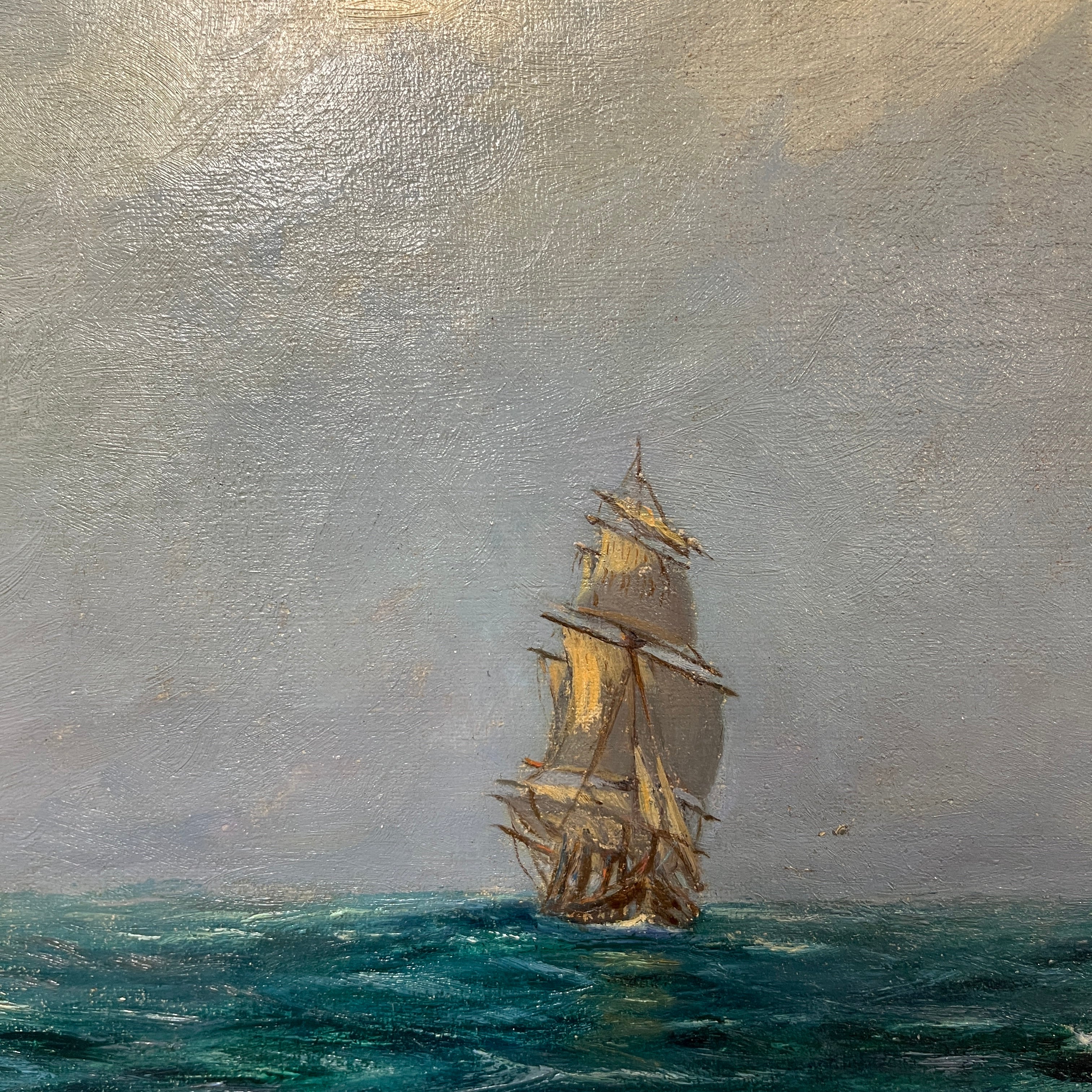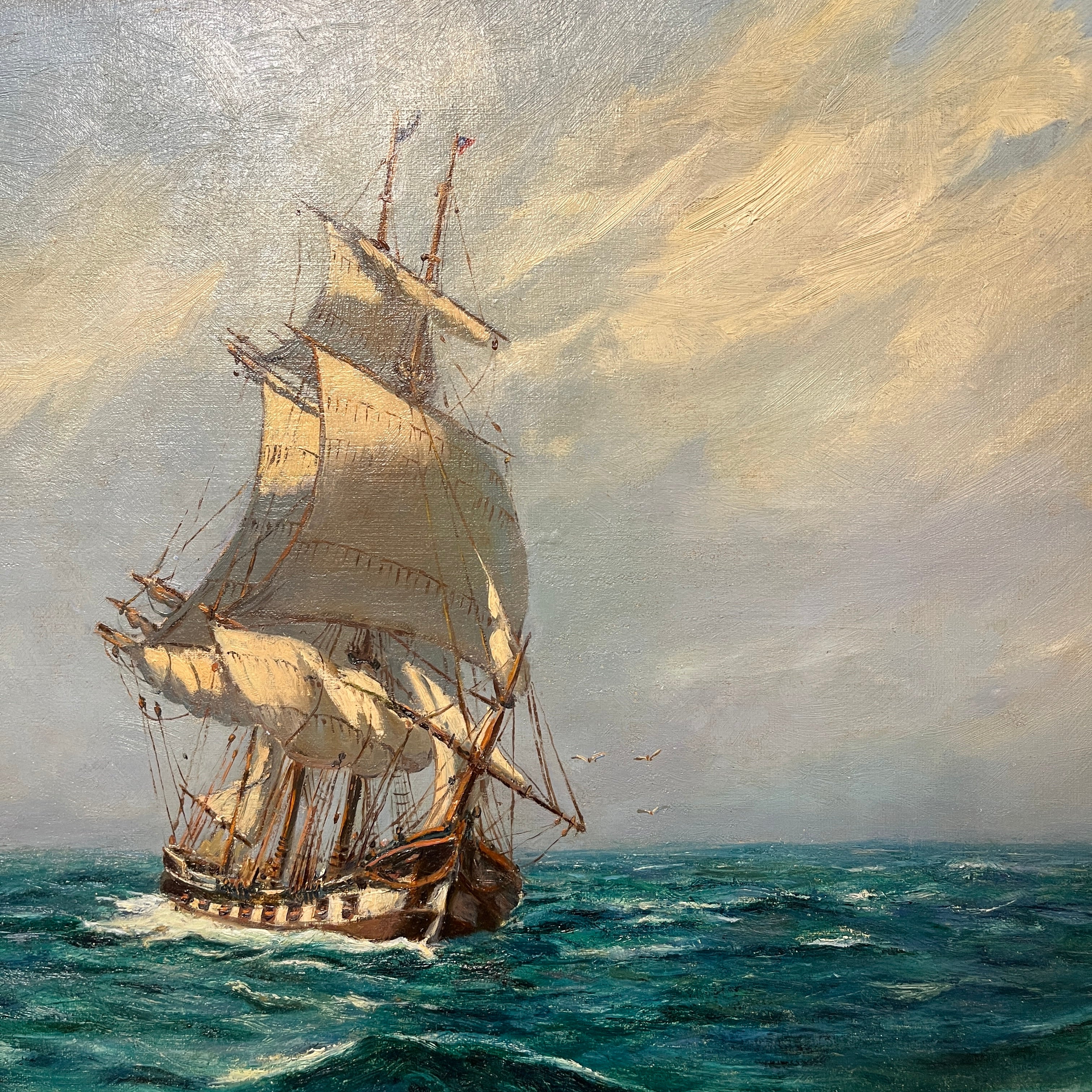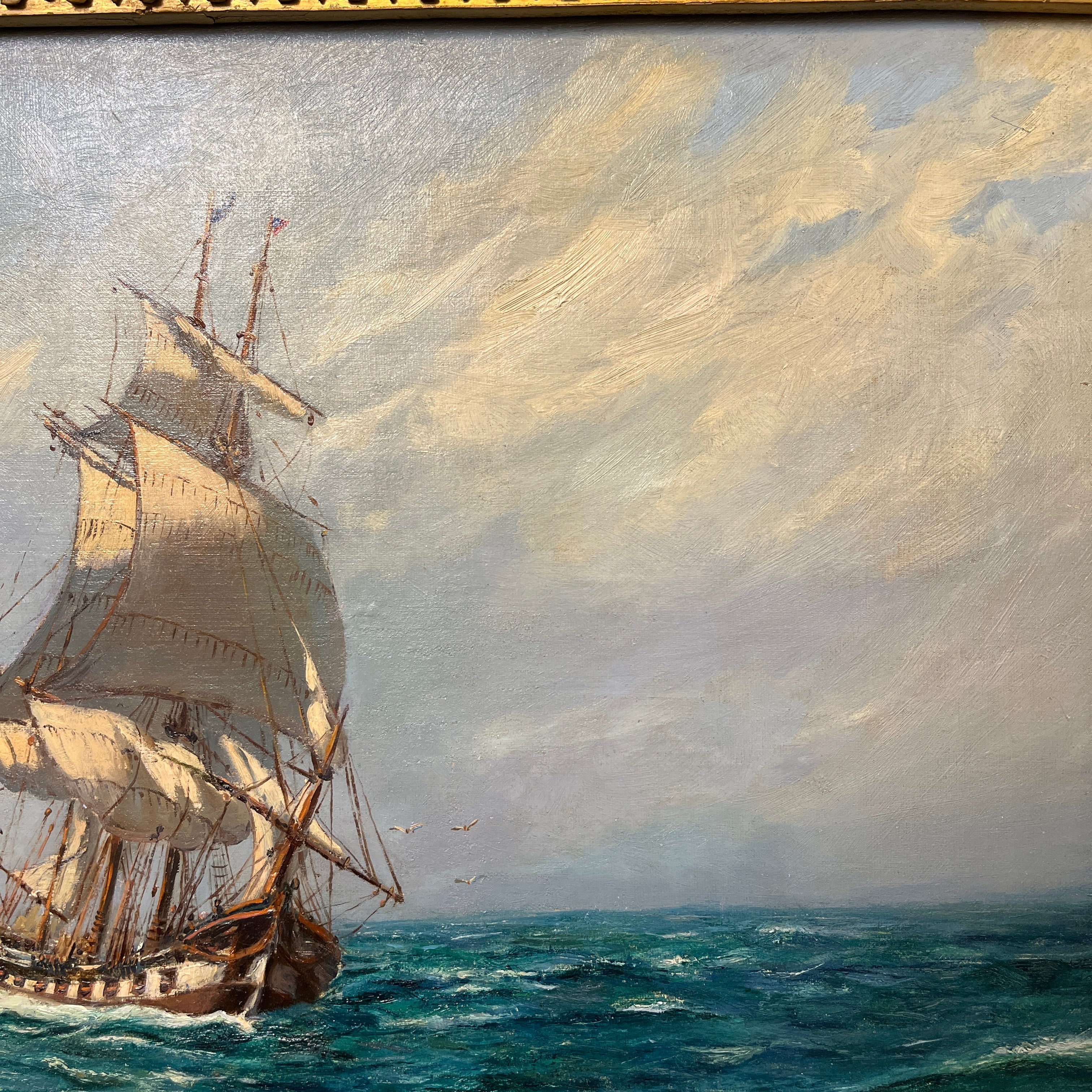 Marina del destacado pintor chileno Álvaro Casanova Zenteno. Una de sus clásicas pinturas con motivos navales. La escena nos muestra dos embarcaciones navegando en alta mar con un mar un poco encrespado y un cielo nuboso. Casanova nos envuelve con su pintura realista.