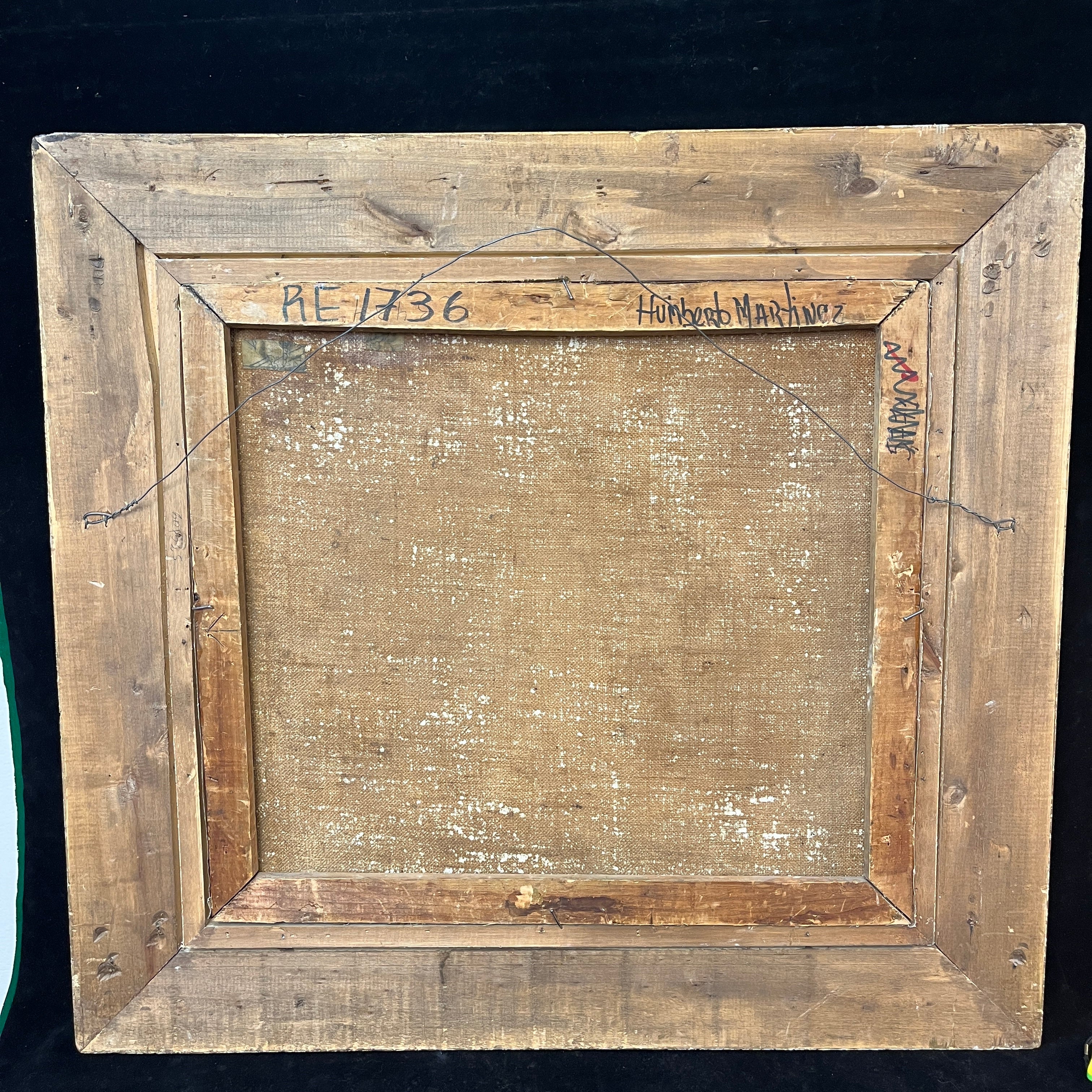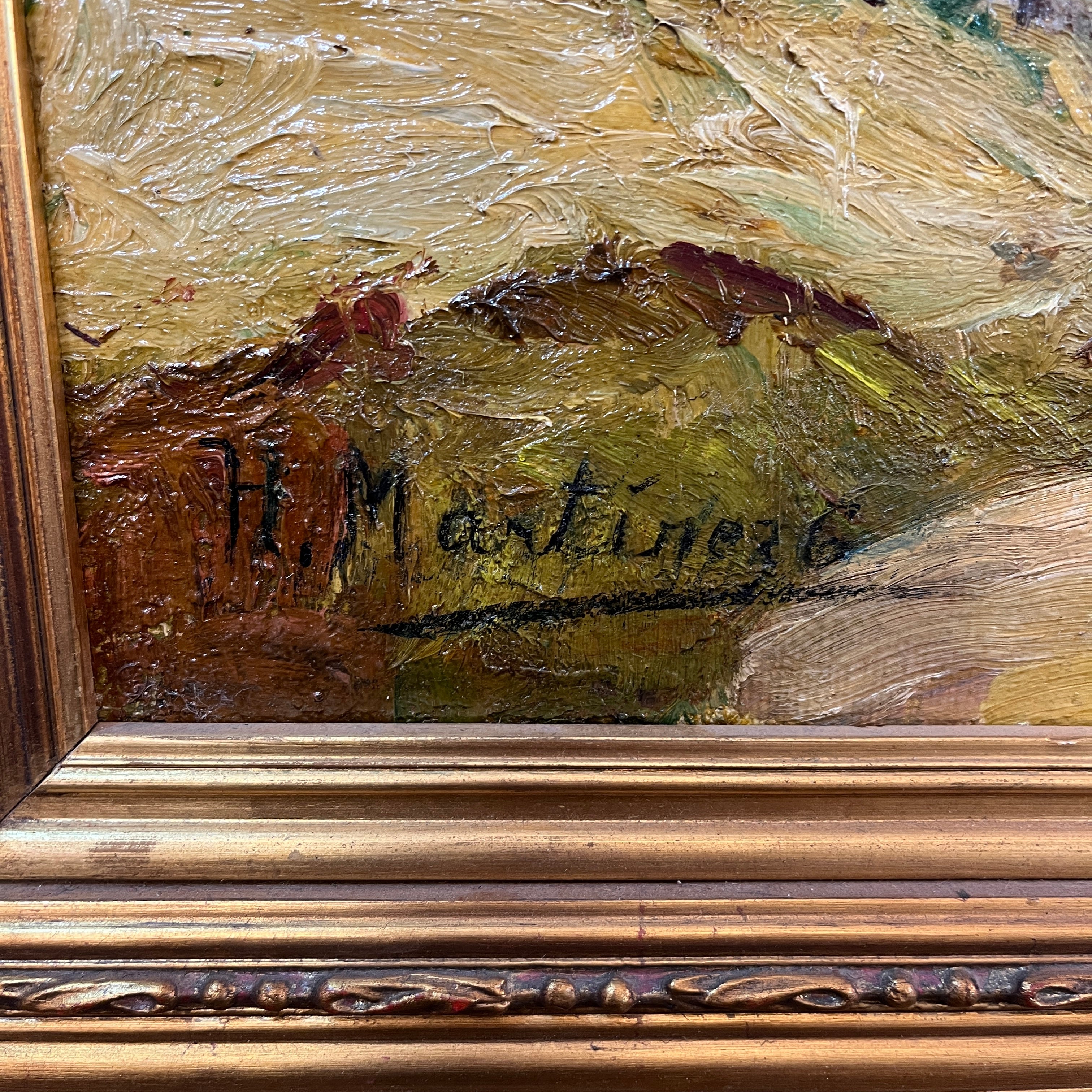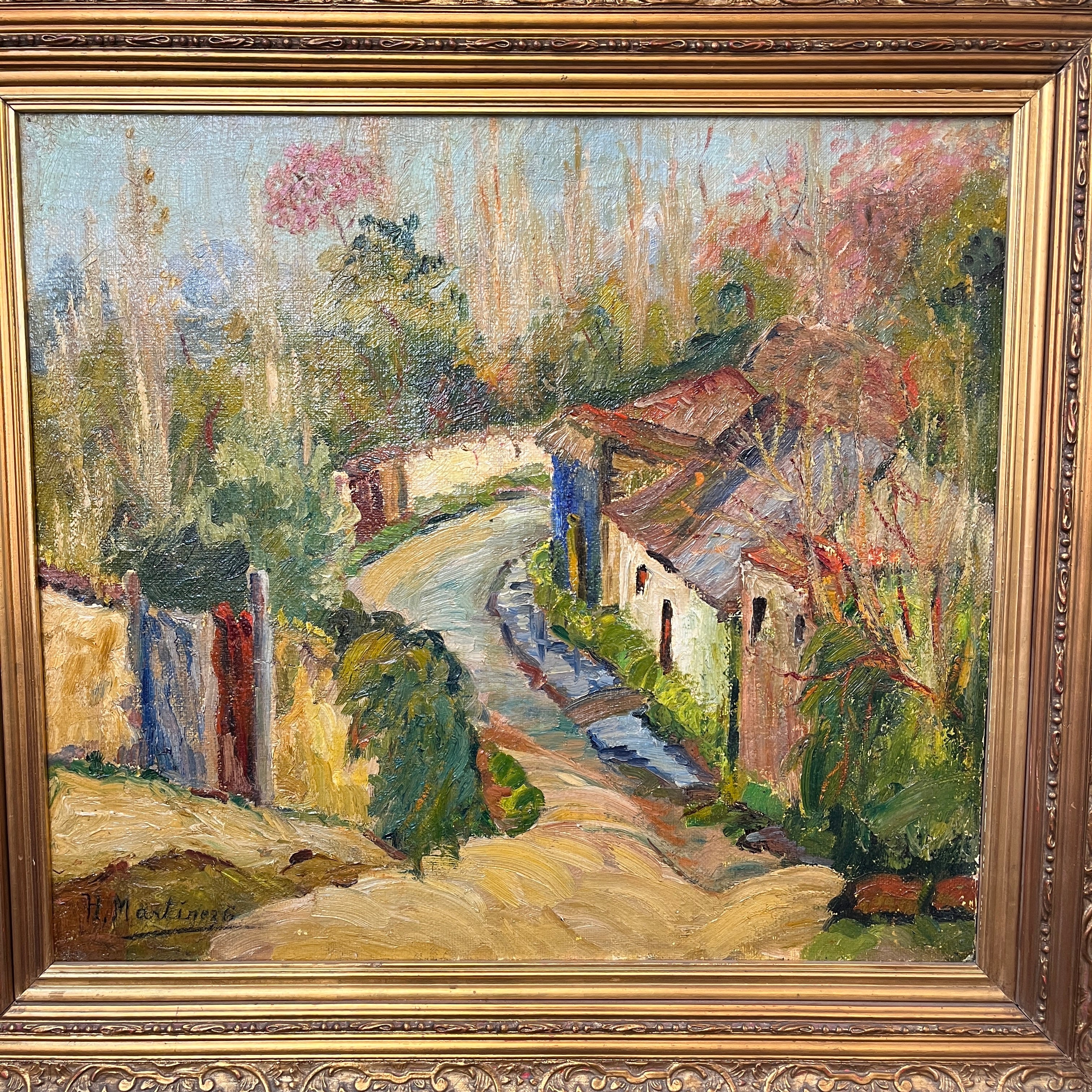 Óleo sobre tela, de origen chileno, del artista Humberto Martínez González, activo principalmente durante la década de los 50. La obra representa, con trazos expresivos y cargados, un frondoso y colorido paisaje de campo en el que, desde una colina, se puede ver un camino, las puertas y fachadas de diversas casas de adobe con techo de paja por un lado, y una gran pandereta que deja ver las copas de los árboles de un precioso jardín. La obra tiene un espectacular marco de madera tallada en relieves decorados, terminado en pintura dorada.
