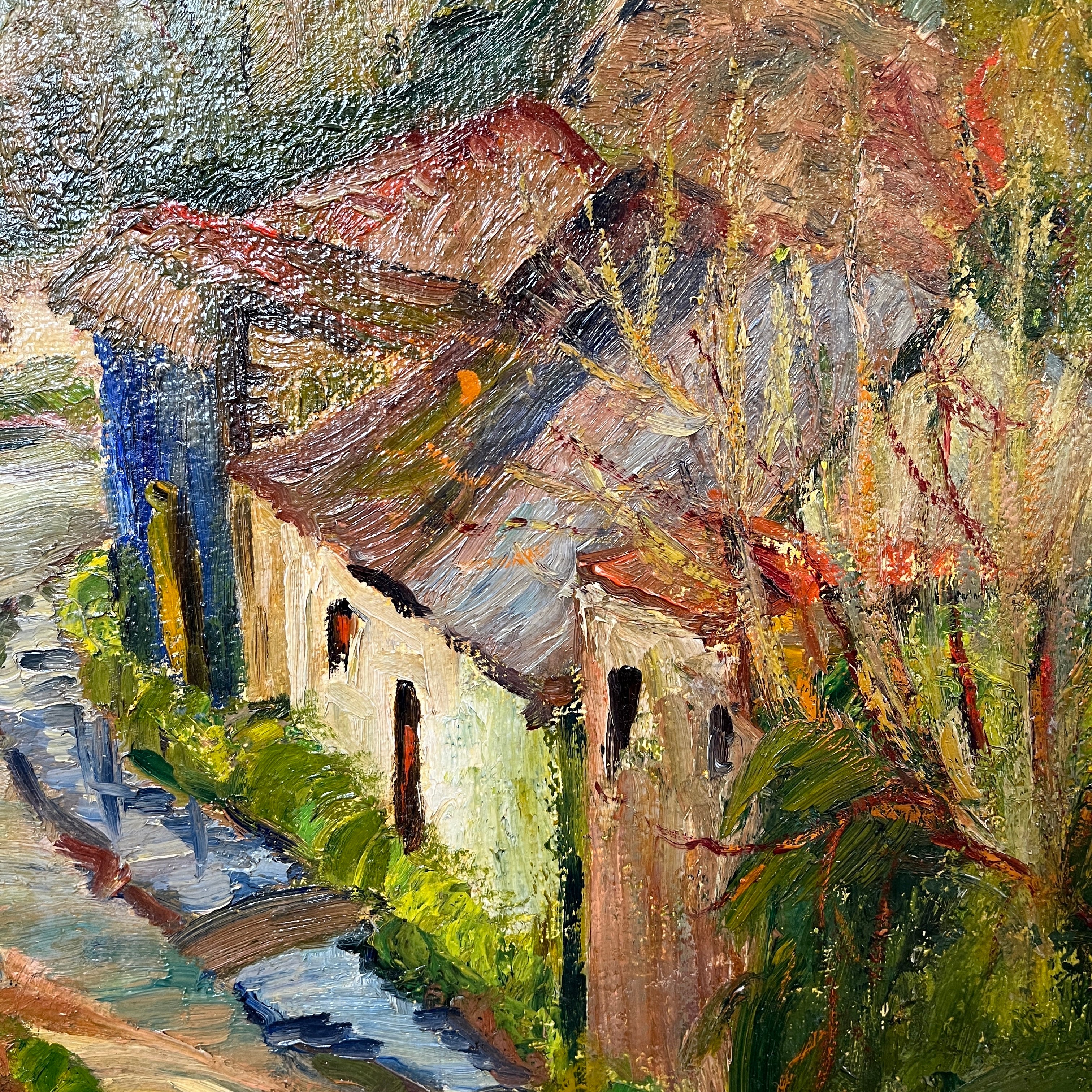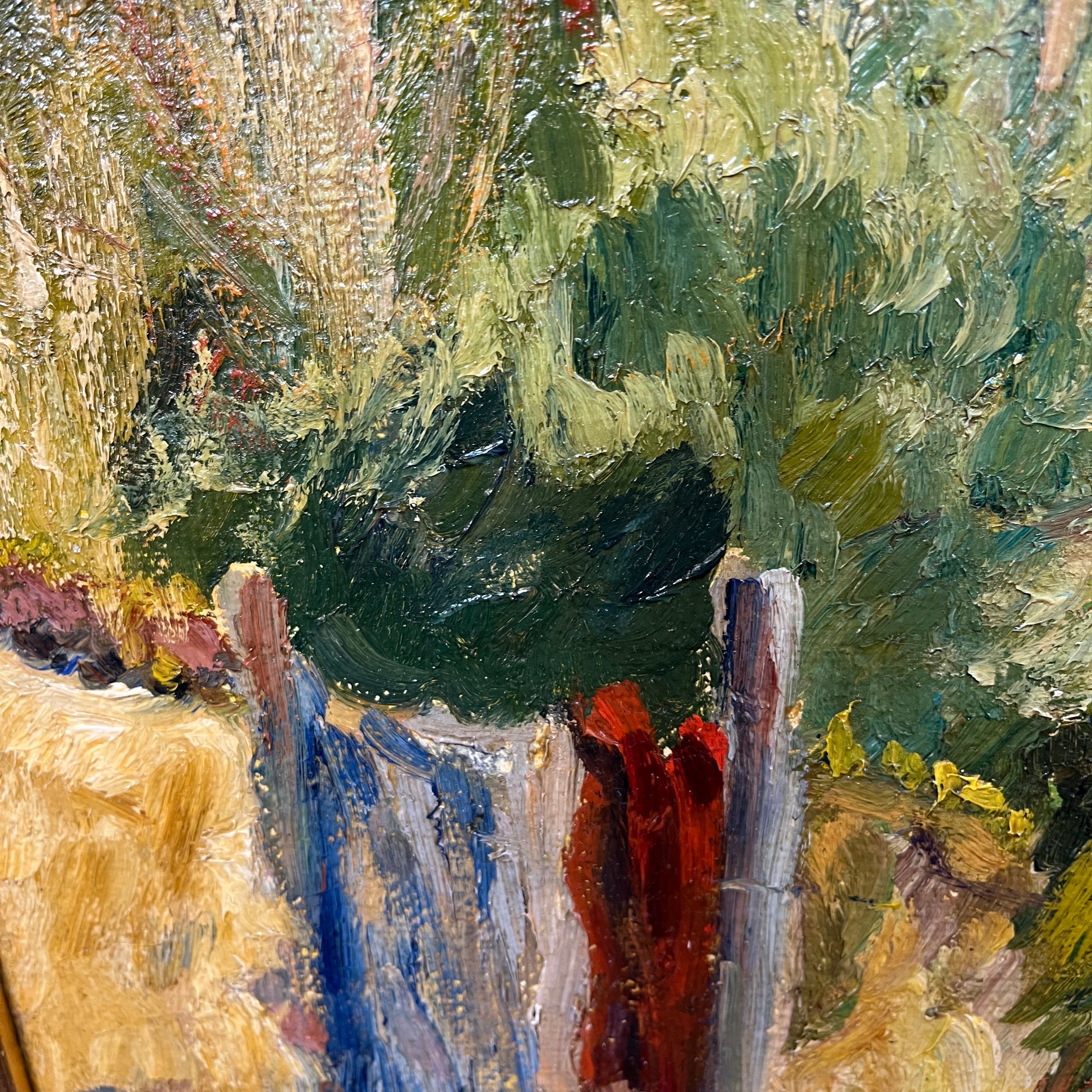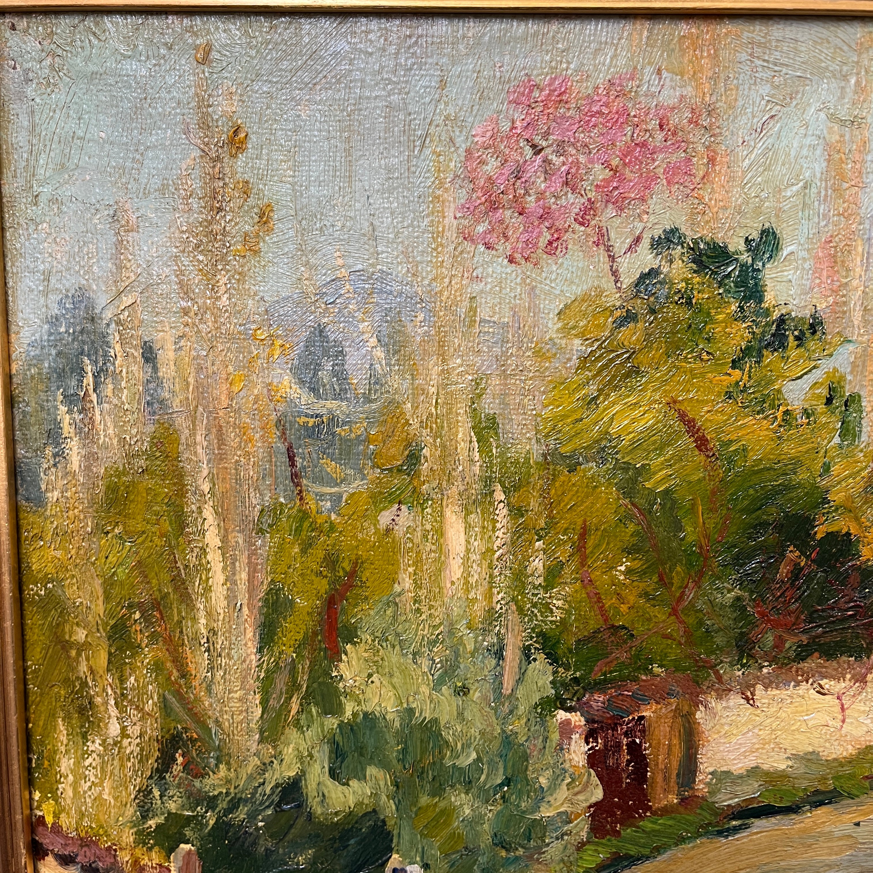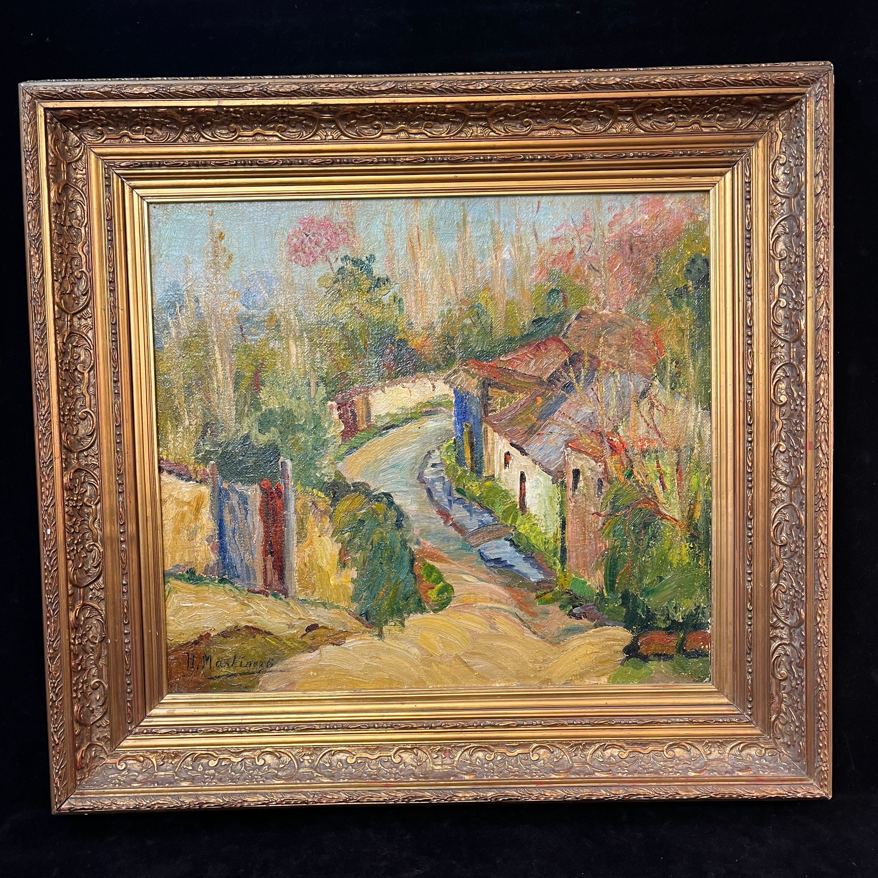 Óleo sobre tela, de origen chileno, del artista Humberto Martínez González, activo principalmente durante la década de los 50. La obra representa, con trazos expresivos y cargados, un frondoso y colorido paisaje de campo en el que, desde una colina, se puede ver un camino, las puertas y fachadas de diversas casas de adobe con techo de paja por un lado, y una gran pandereta que deja ver las copas de los árboles de un precioso jardín. La obra tiene un espectacular marco de madera tallada en relieves decorados, terminado en pintura dorada.