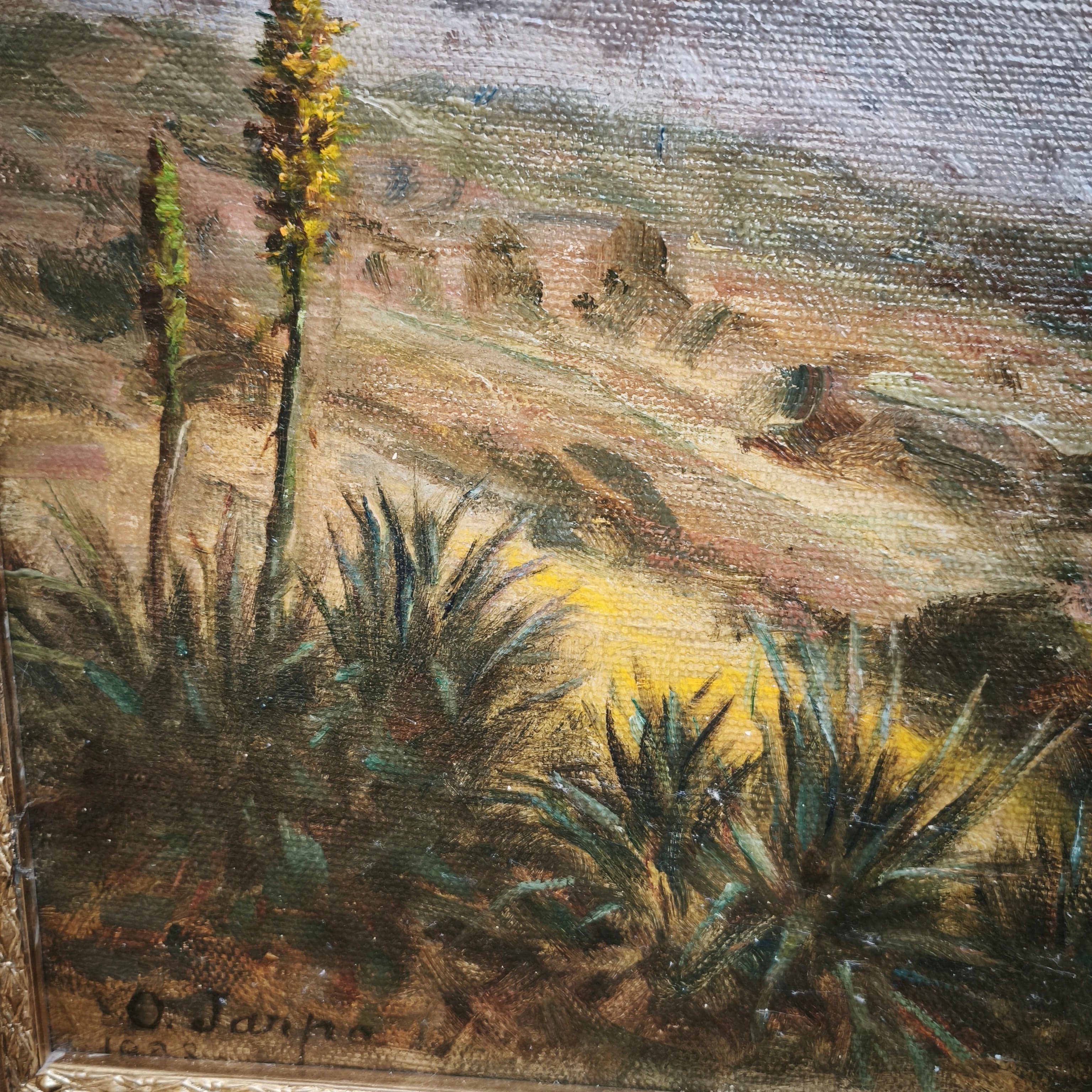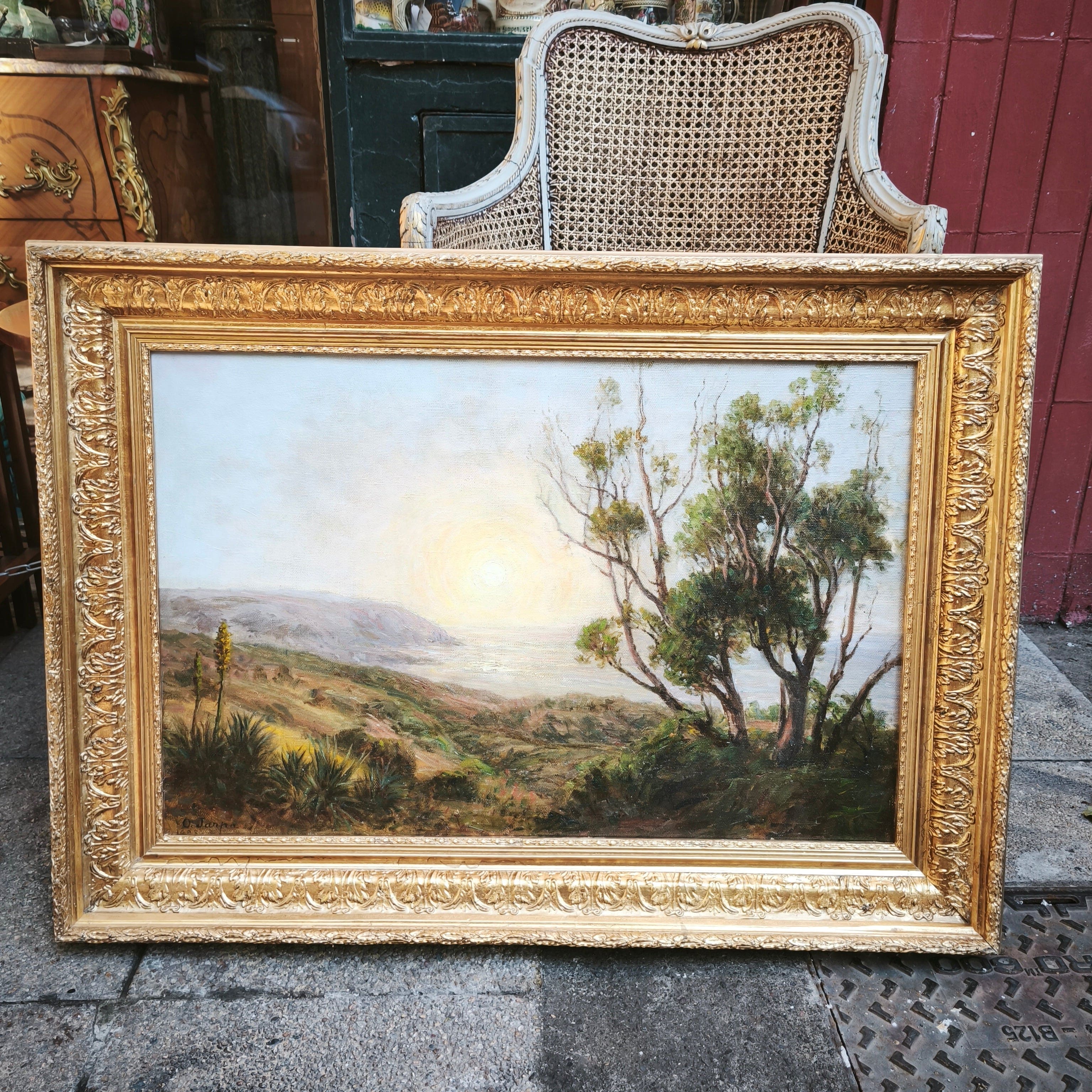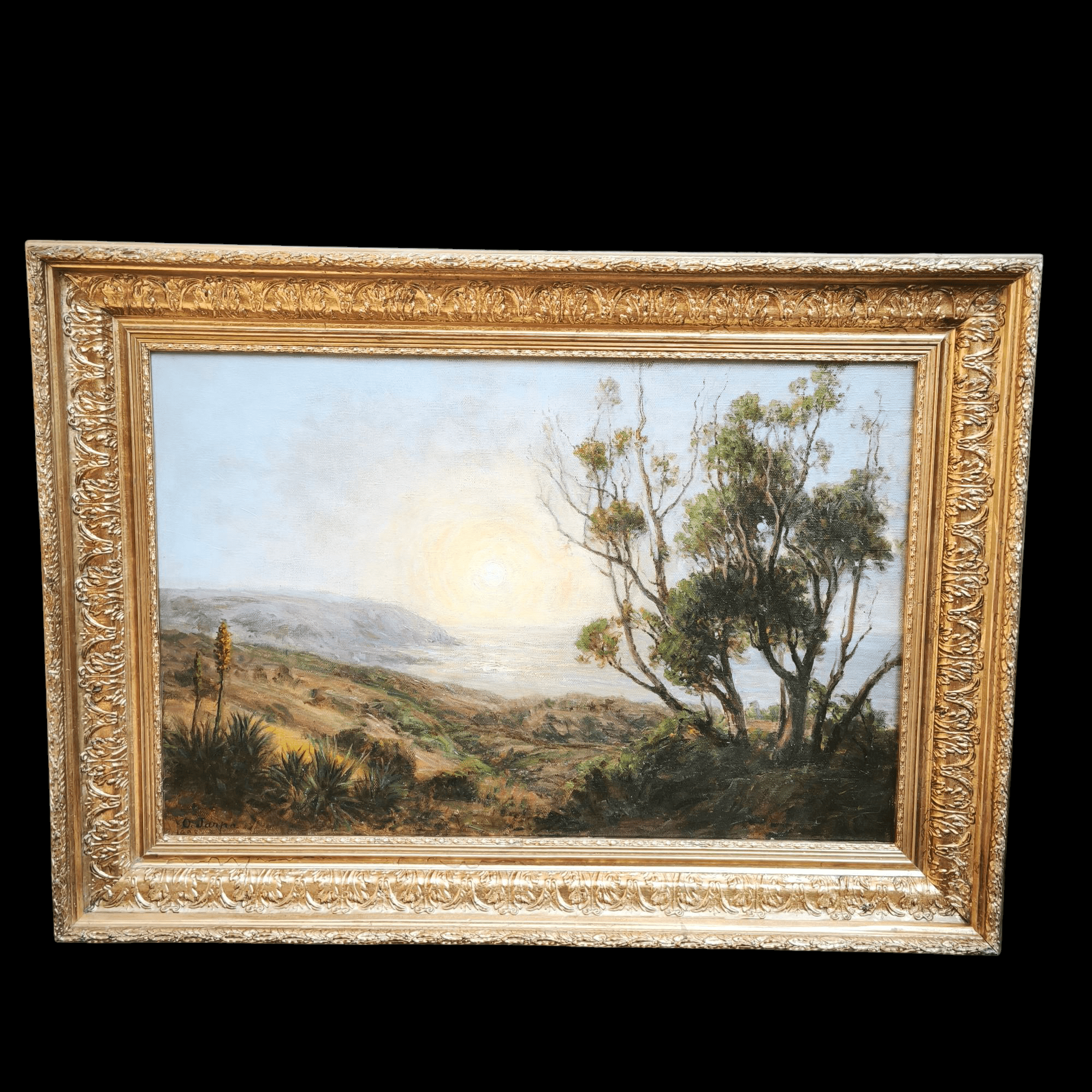 Óleo sobre tela del reconocido pintor clásico de origen chileno Onofre Jarpa. La obra representa un paisaje costero, desde la cima de un cerro, retratando la vegetación de la zona, algunas colinas y el horizonte soleado de fondo. La obra está enmarcada en madera tallada con finos relieves en molde y pintada en elegante dorado.