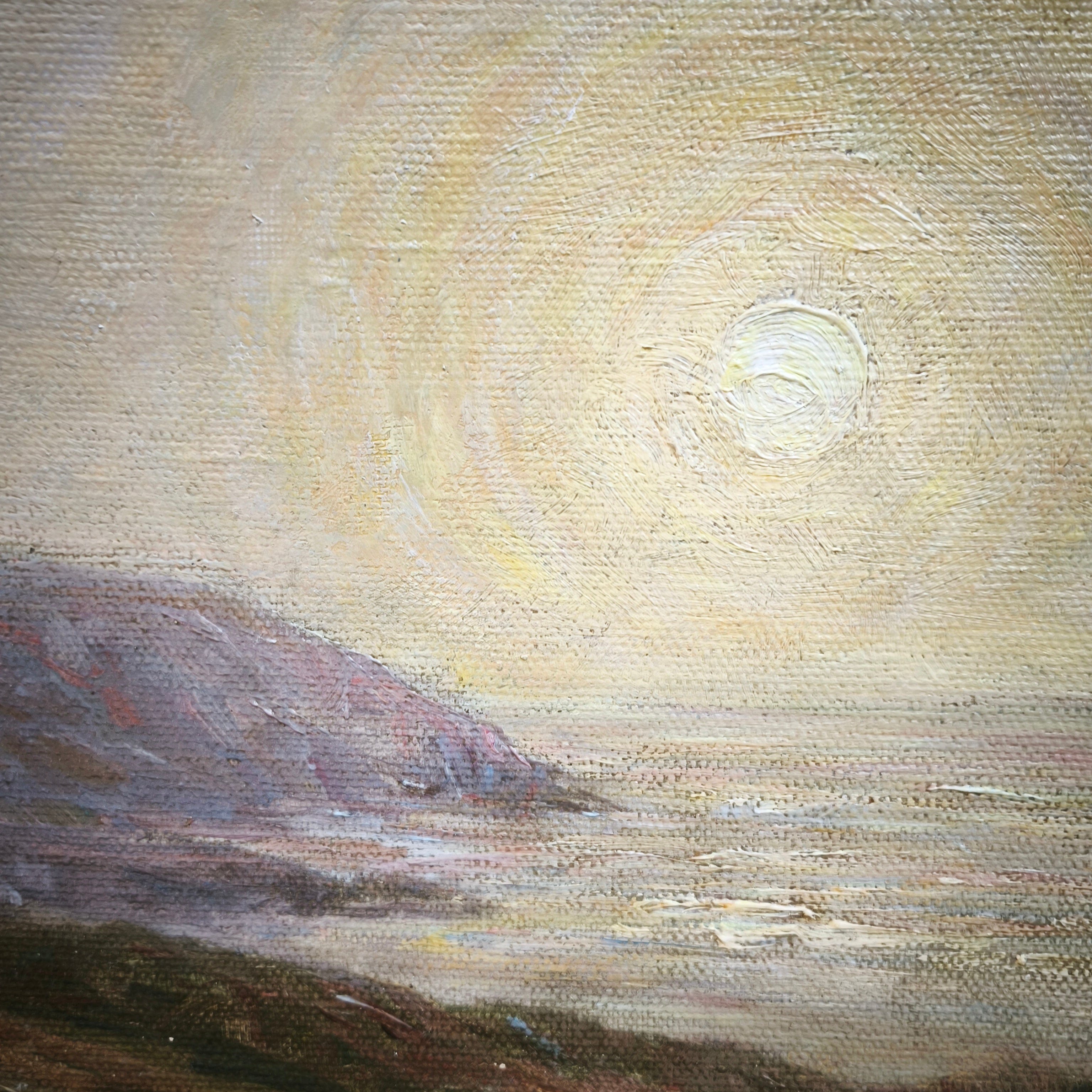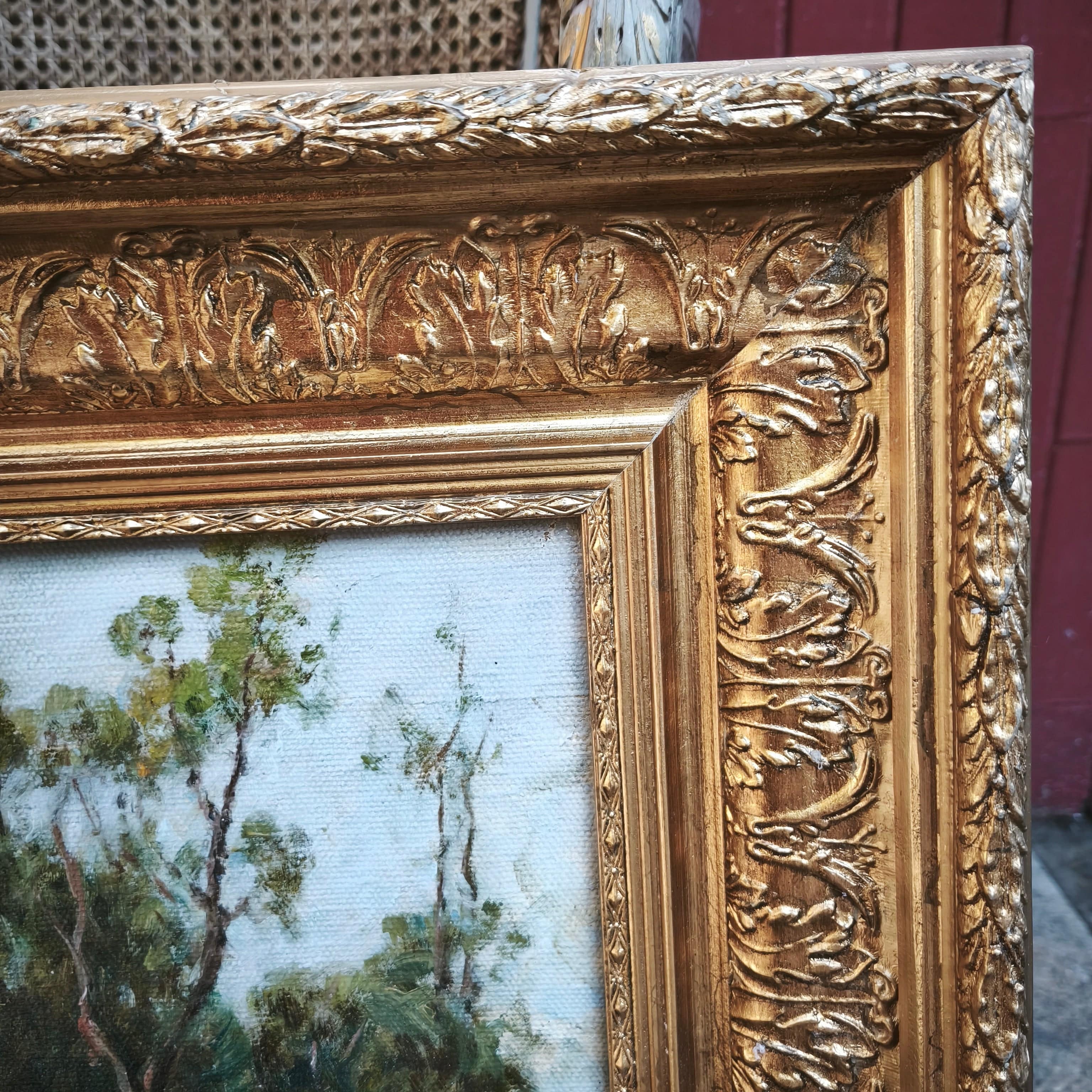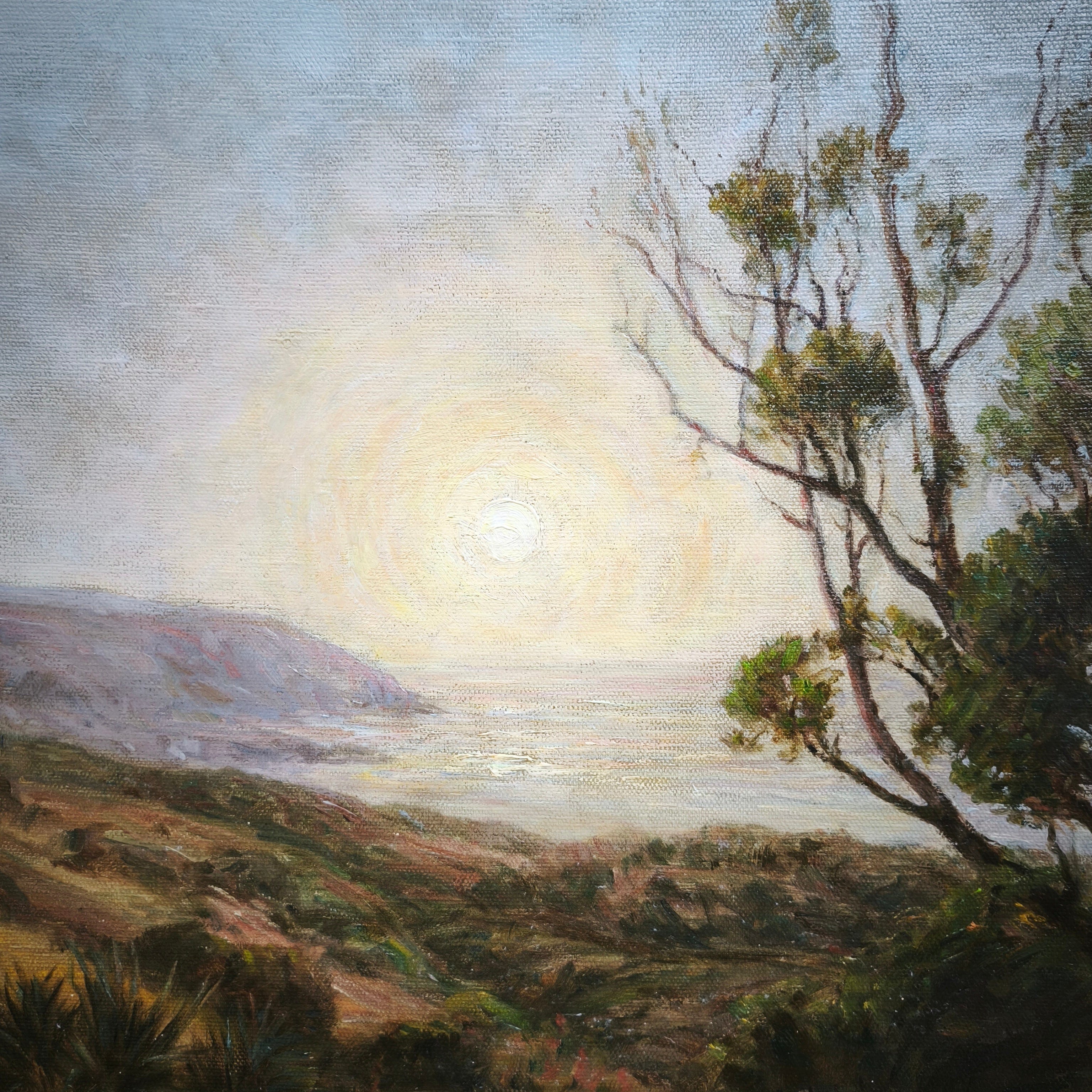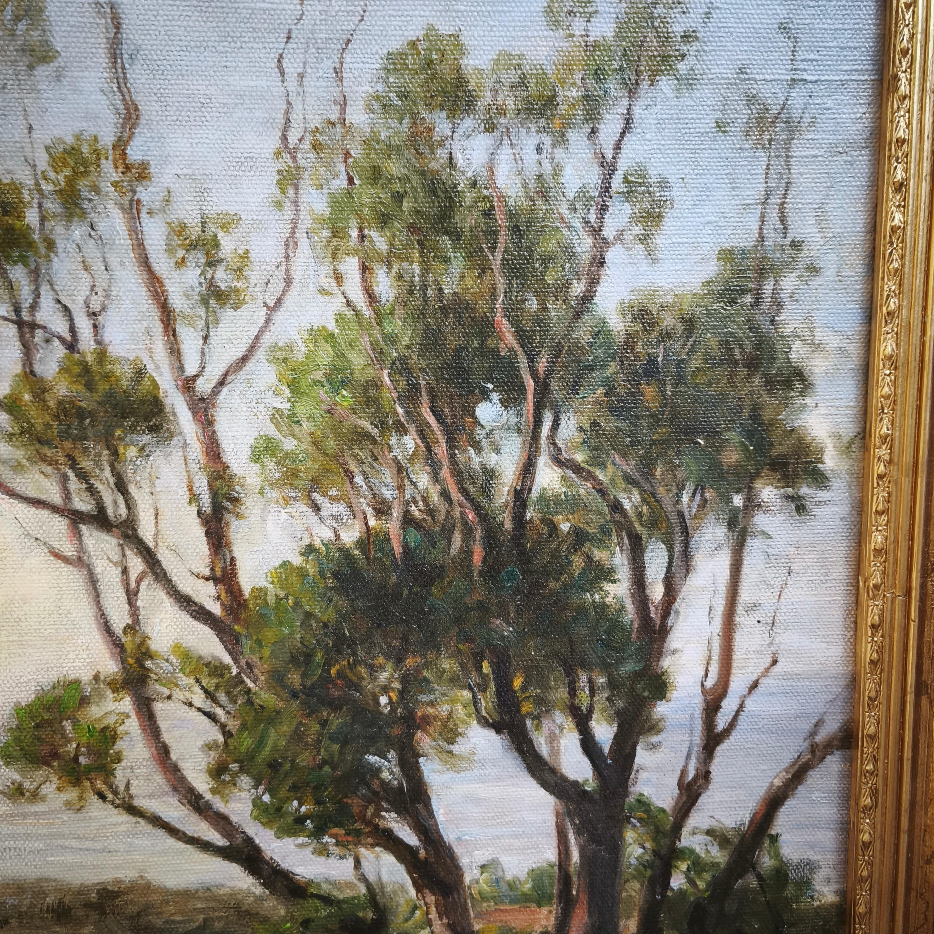 Óleo sobre tela del reconocido pintor clásico de origen chileno Onofre Jarpa. La obra representa un paisaje costero, desde la cima de un cerro, retratando la vegetación de la zona, algunas colinas y el horizonte soleado de fondo. La obra está enmarcada en madera tallada con finos relieves en molde y pintada en elegante dorado.