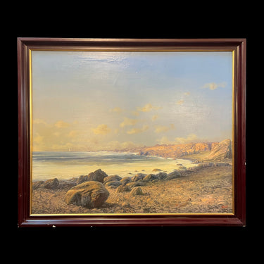 Especial paisaje costero del talentoso pintor chileno Carlos Jaramillo (1944) nos entrega una escena de playa solitaria en un atardecer, con una hermosa luz tenue y un más sereno acompaña un camino de rocas natural. La obra resalta por la peculiaridad del lugar, ya que recordemos que Jaramillo se caracteriza por pinturas de marinas y bosques del sur de Chile.