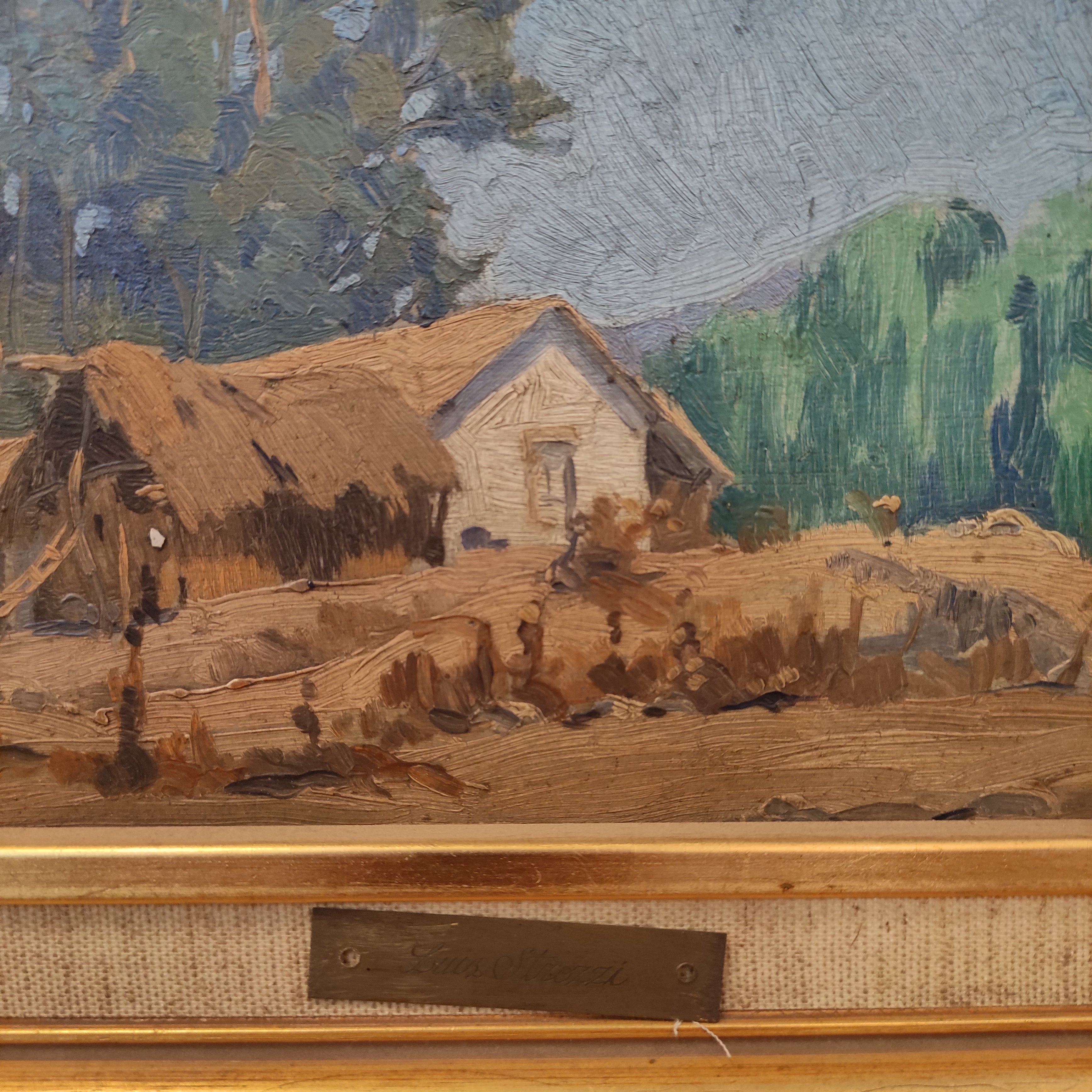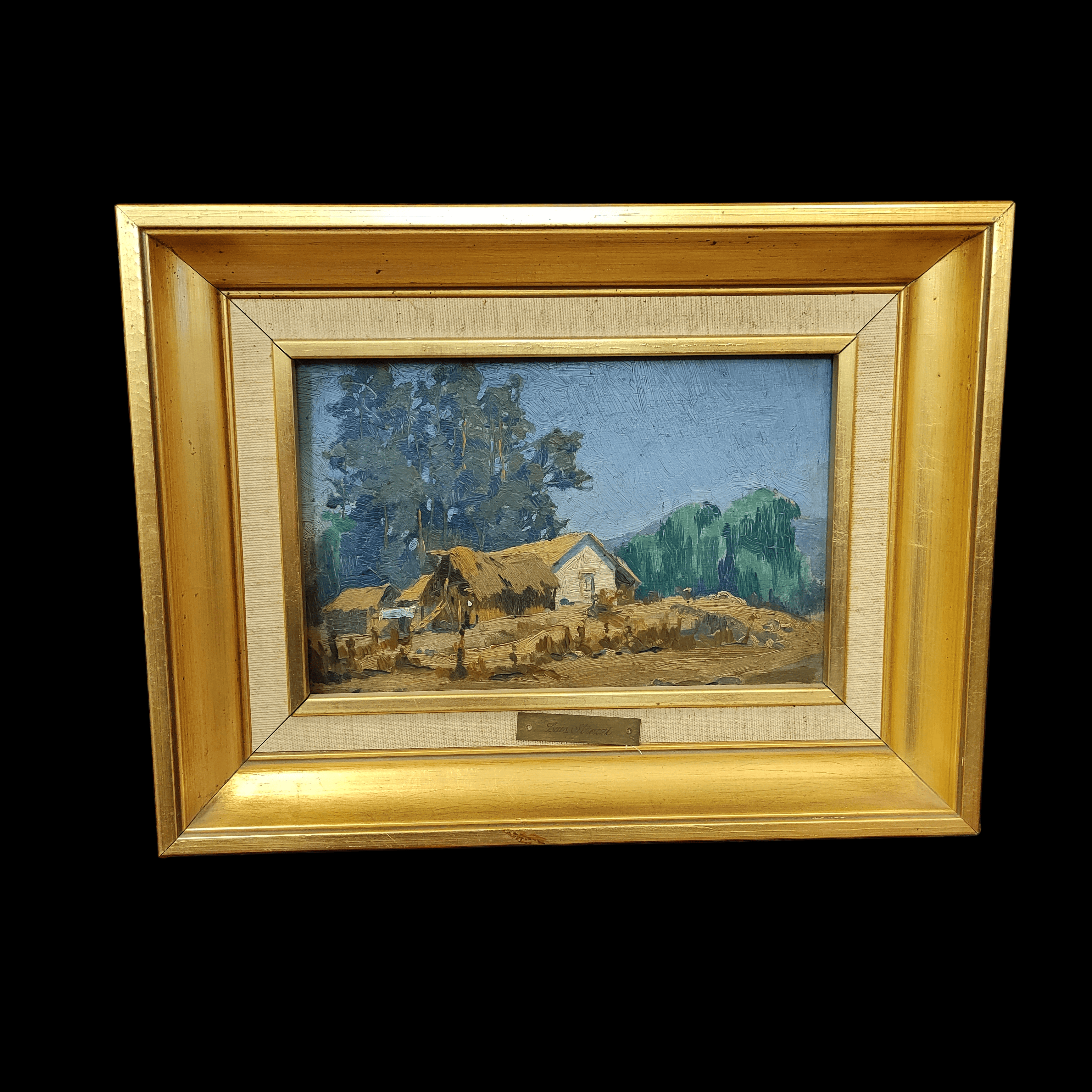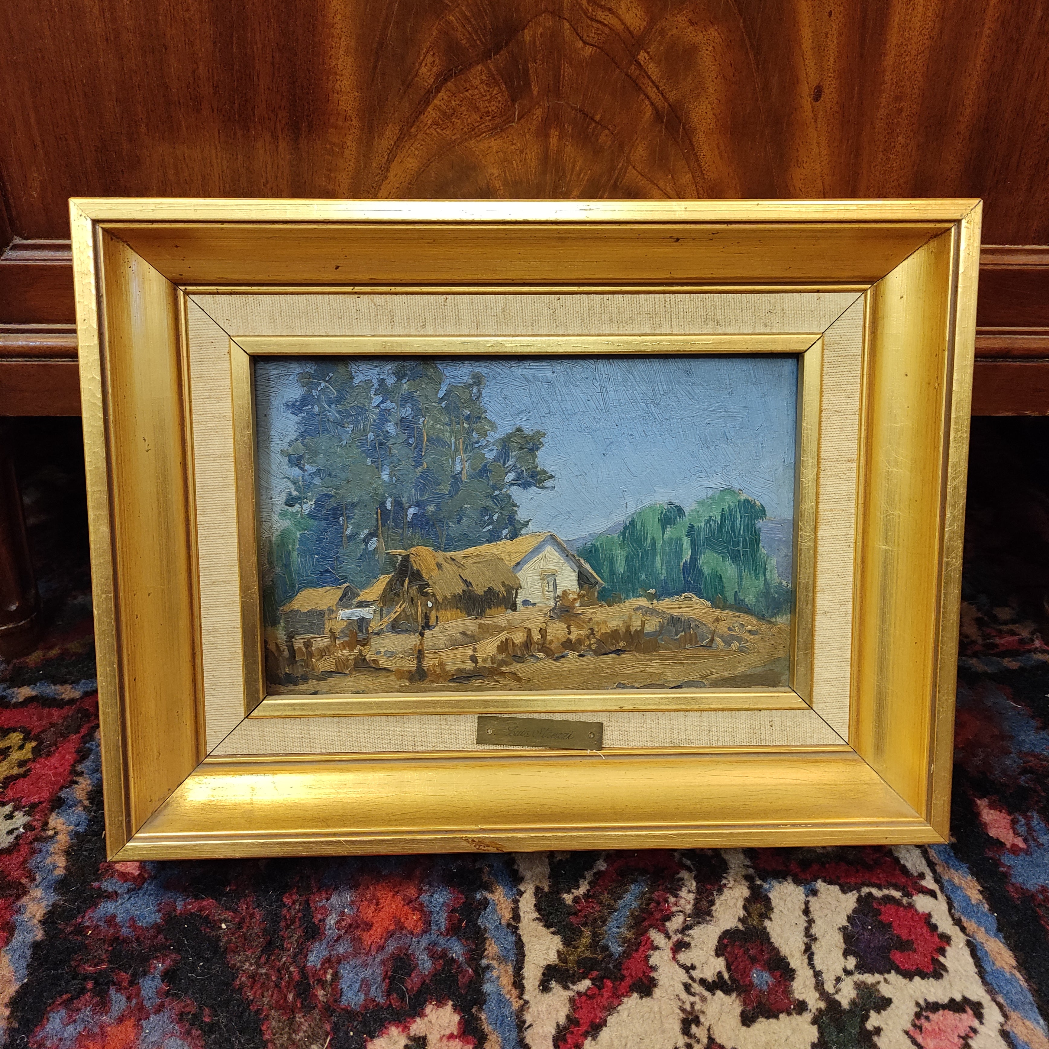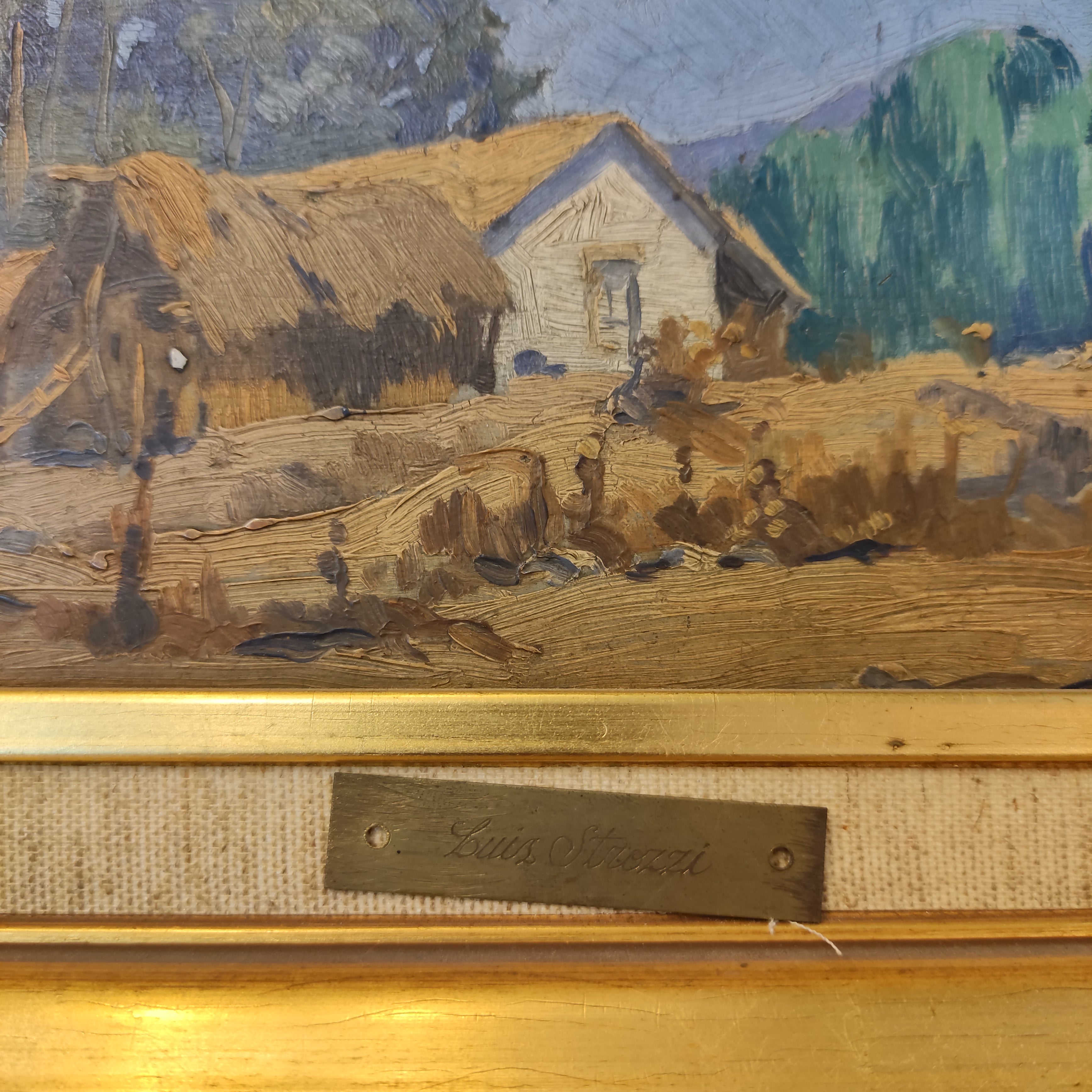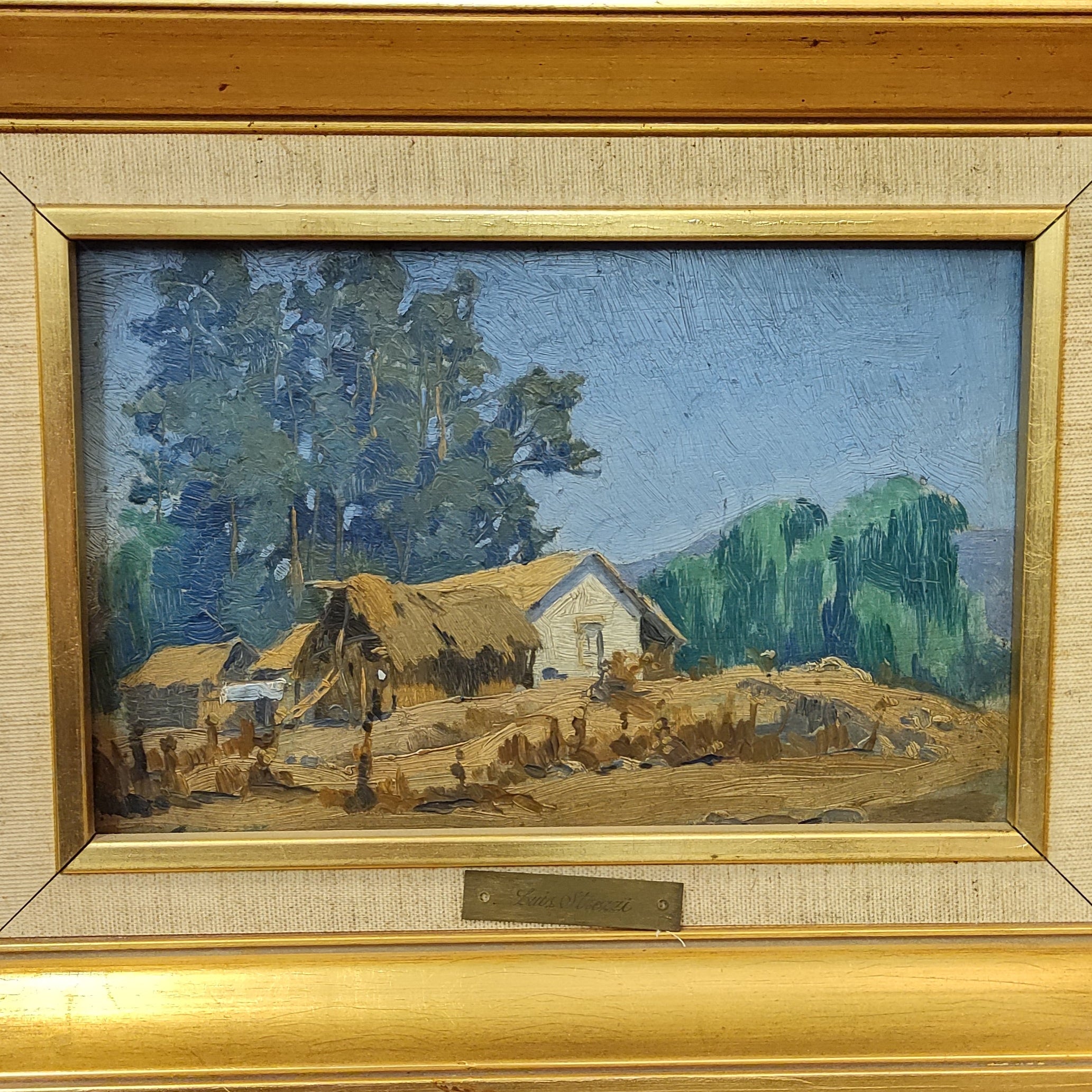 Óleo sobre madera del artista Luis Strozzi, representando un bello paisaje campestre con una casa típica de la misma zona. La obra tiene un marco de madera pintada en dorado.