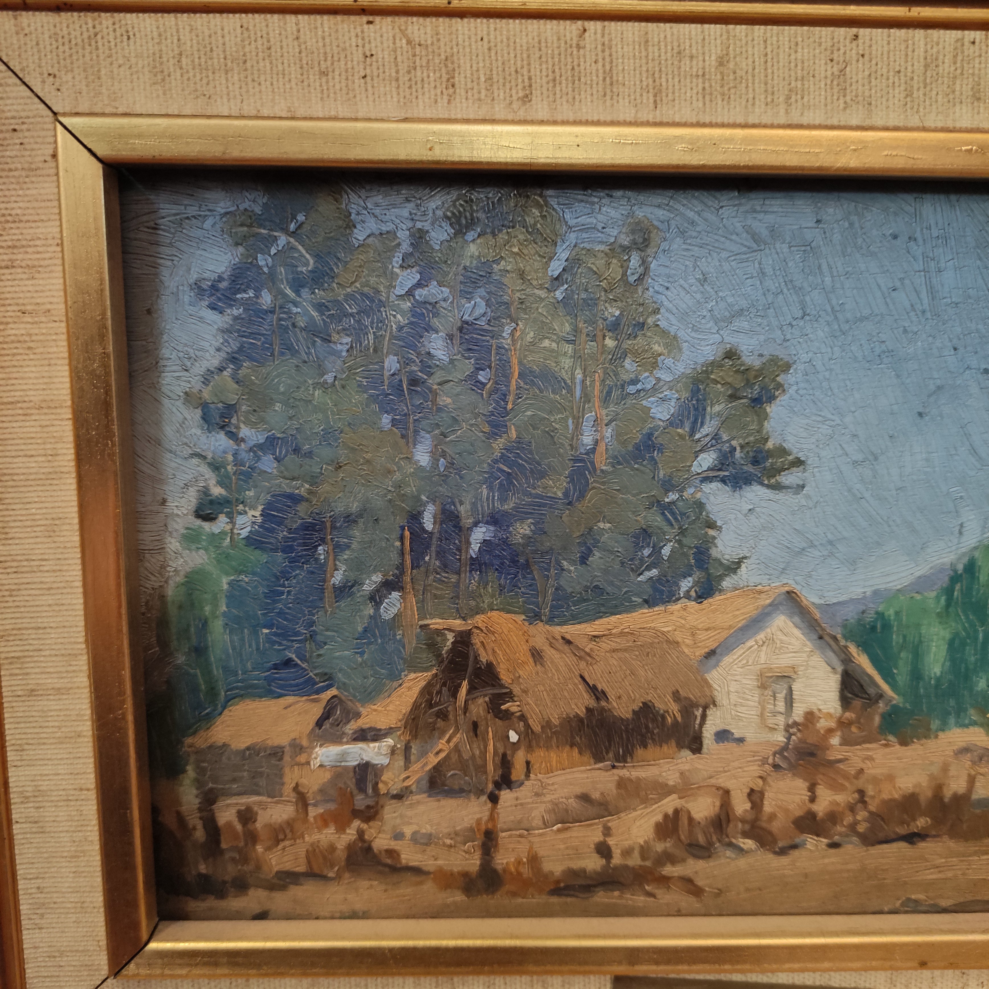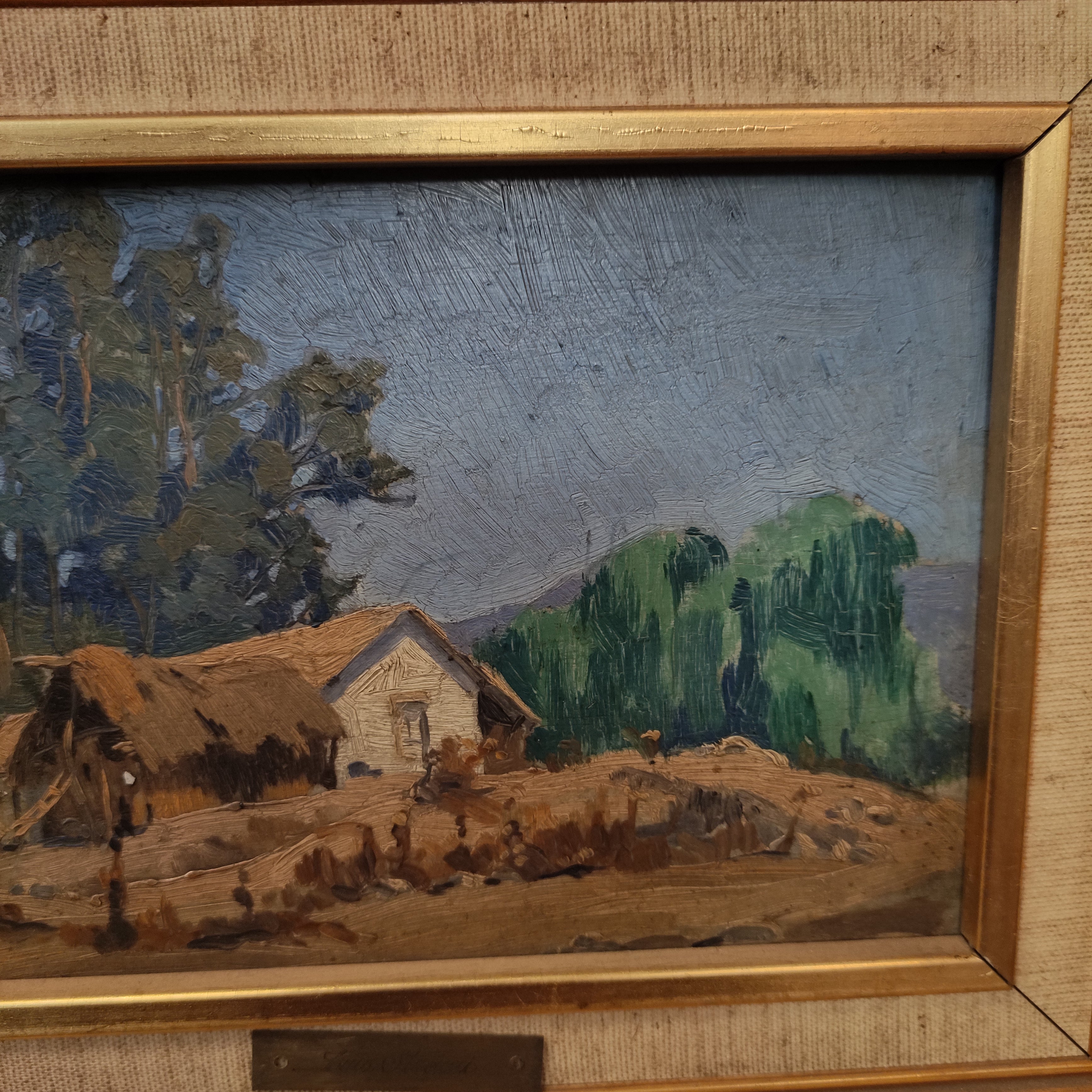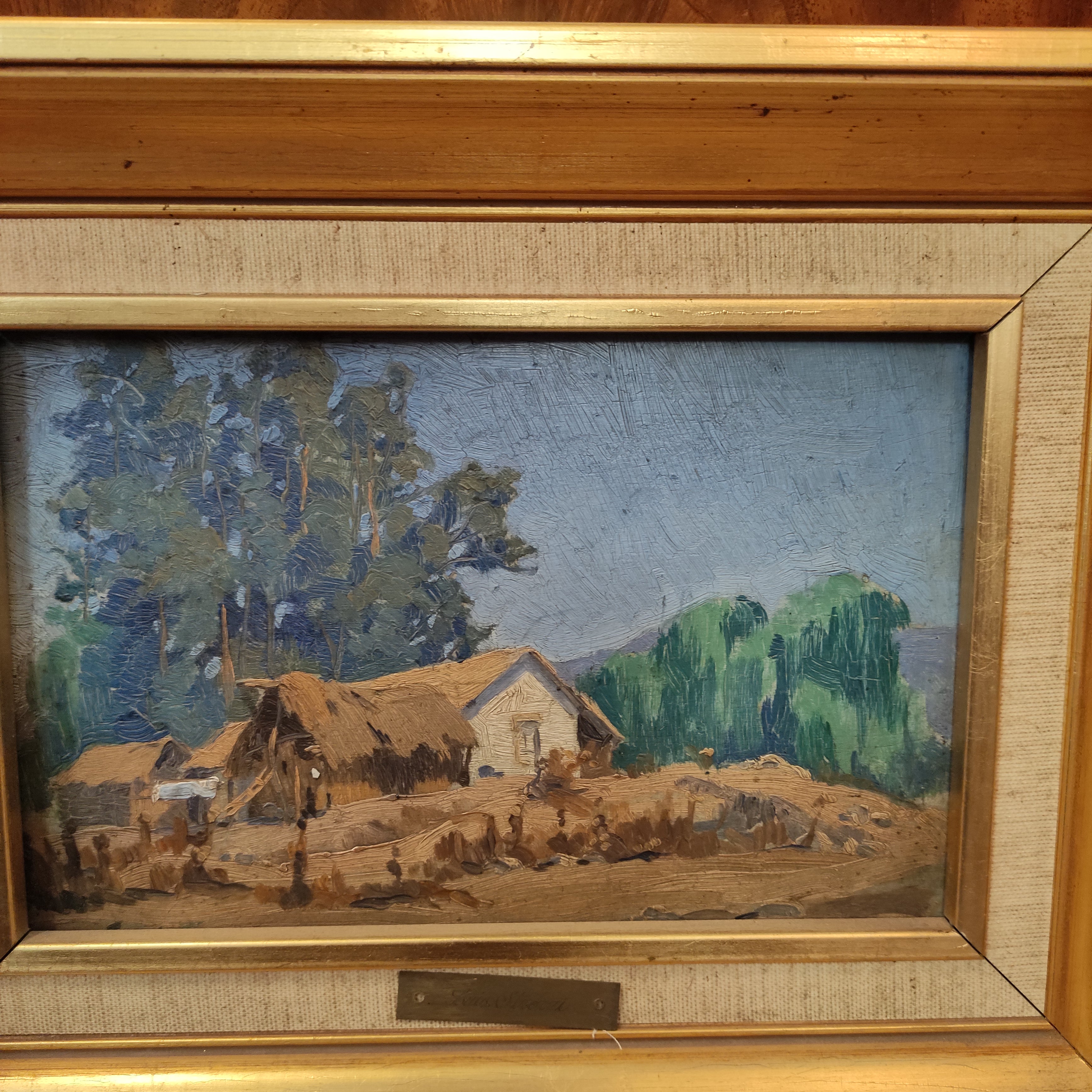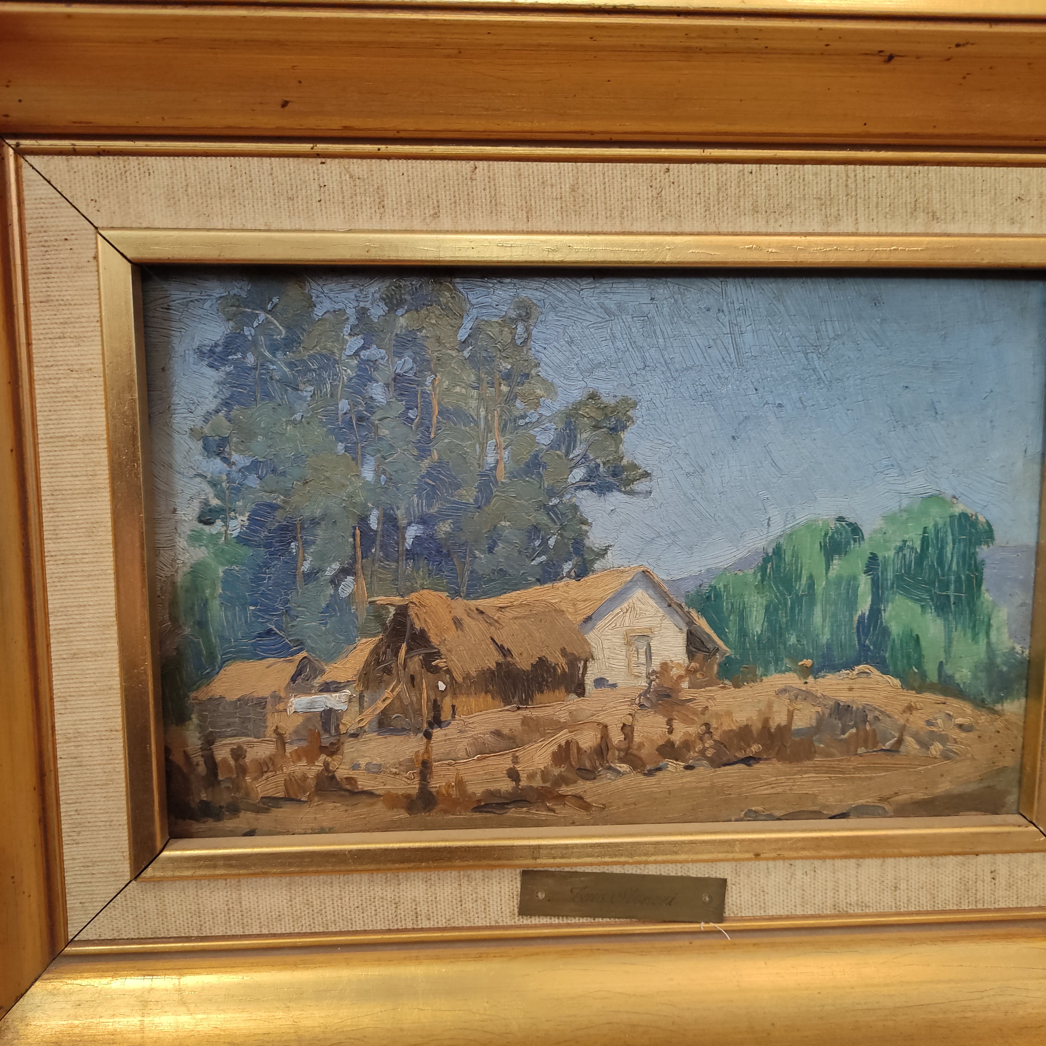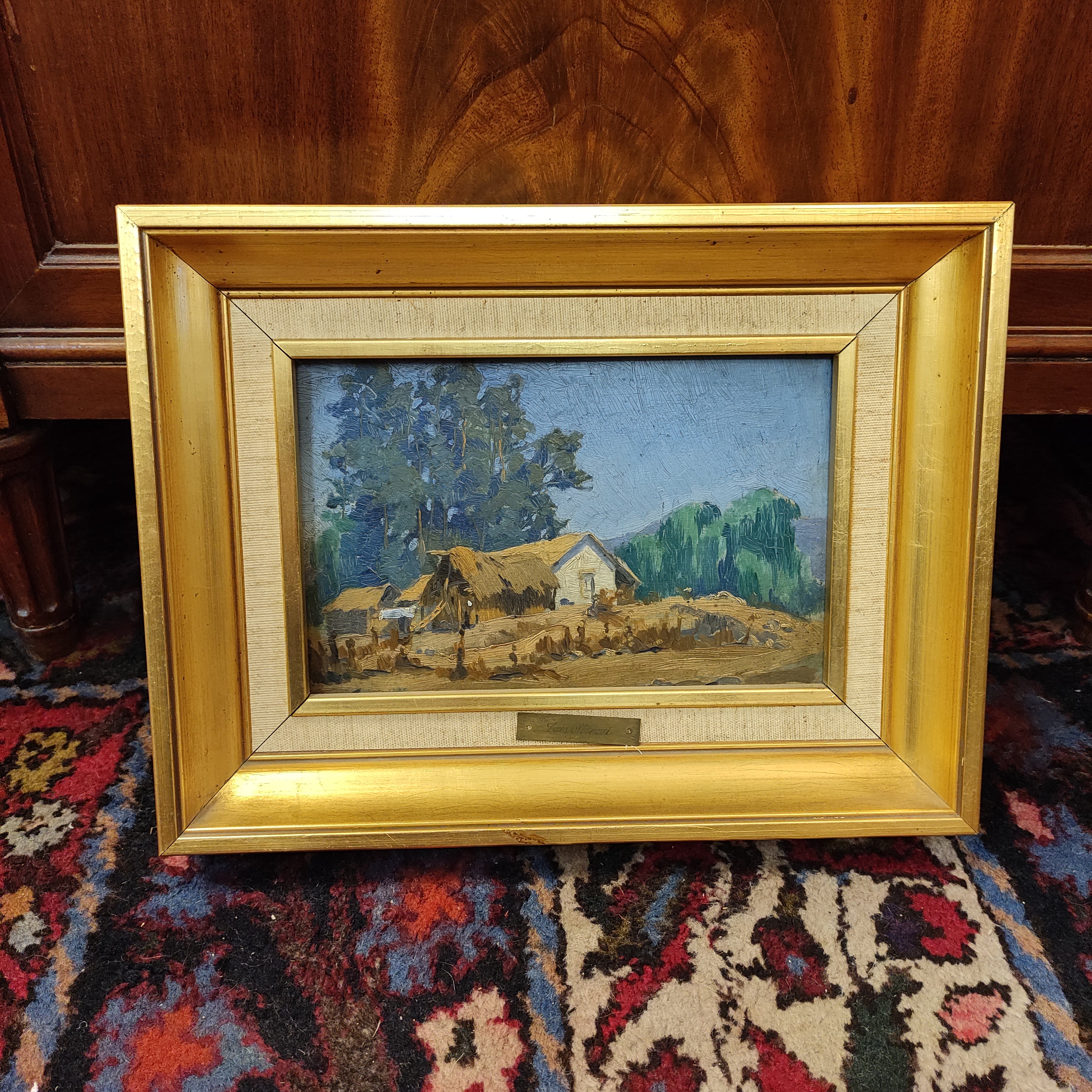 Óleo sobre madera del artista Luis Strozzi, representando un bello paisaje campestre con una casa típica de la misma zona. La obra tiene un marco de madera pintada en dorado.