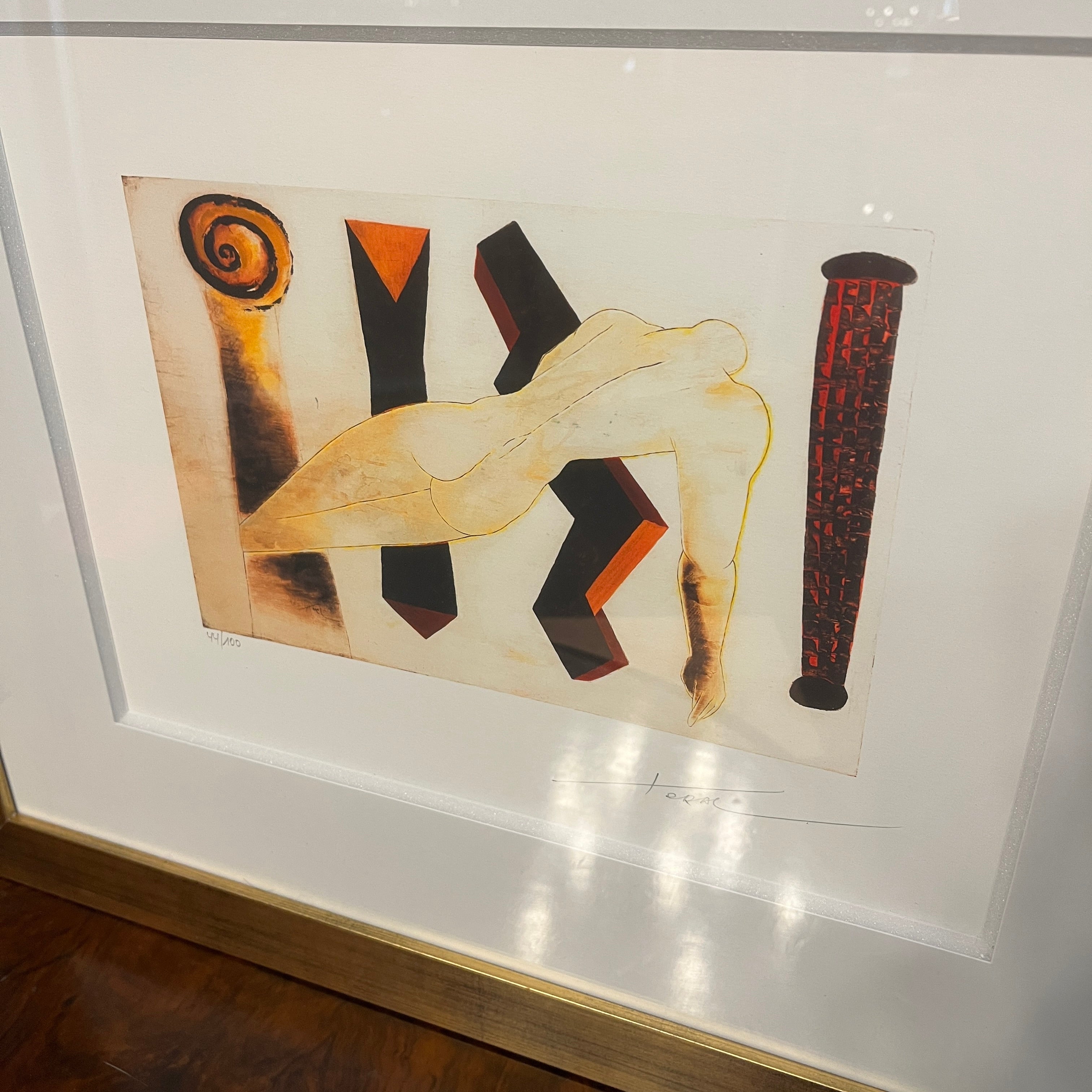 Impresión digital en técnica Glicleé del reconocido artista chileno Mario Toral. La obra, firmada y numerada con el ejemplar 44/100, representa un cuerpo recostado frente a 4 figuras que hacen una descomposición formal de una columna, yendo desde una figura abstracta y geométrica, hasta la representación reconocible de una columna de estilo clásico. Se trata de un estudio de una figura fundamental en la historia del arte y la arquitectura, atravesada por el cuerpo humano, tema recurrente en la obra de Toral.