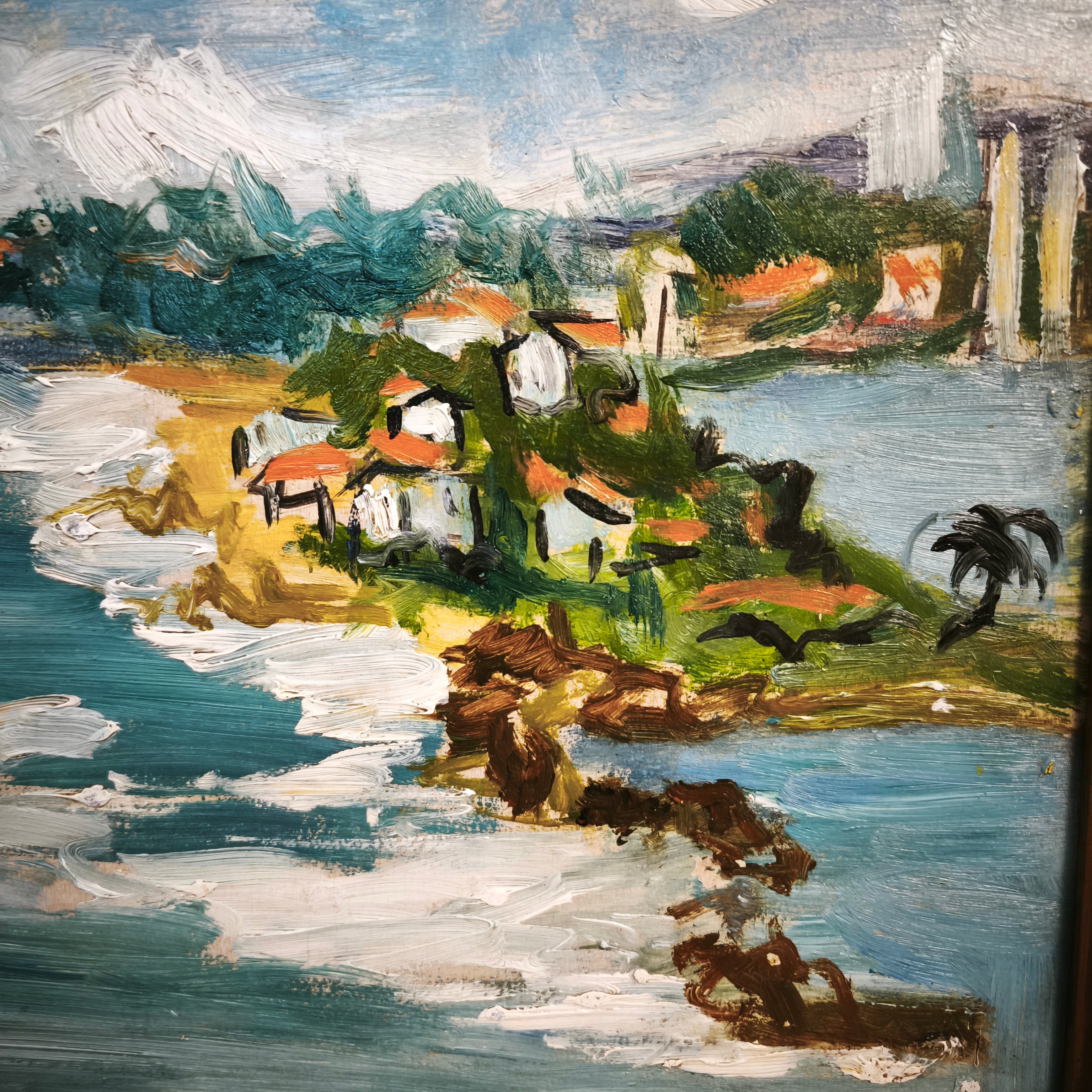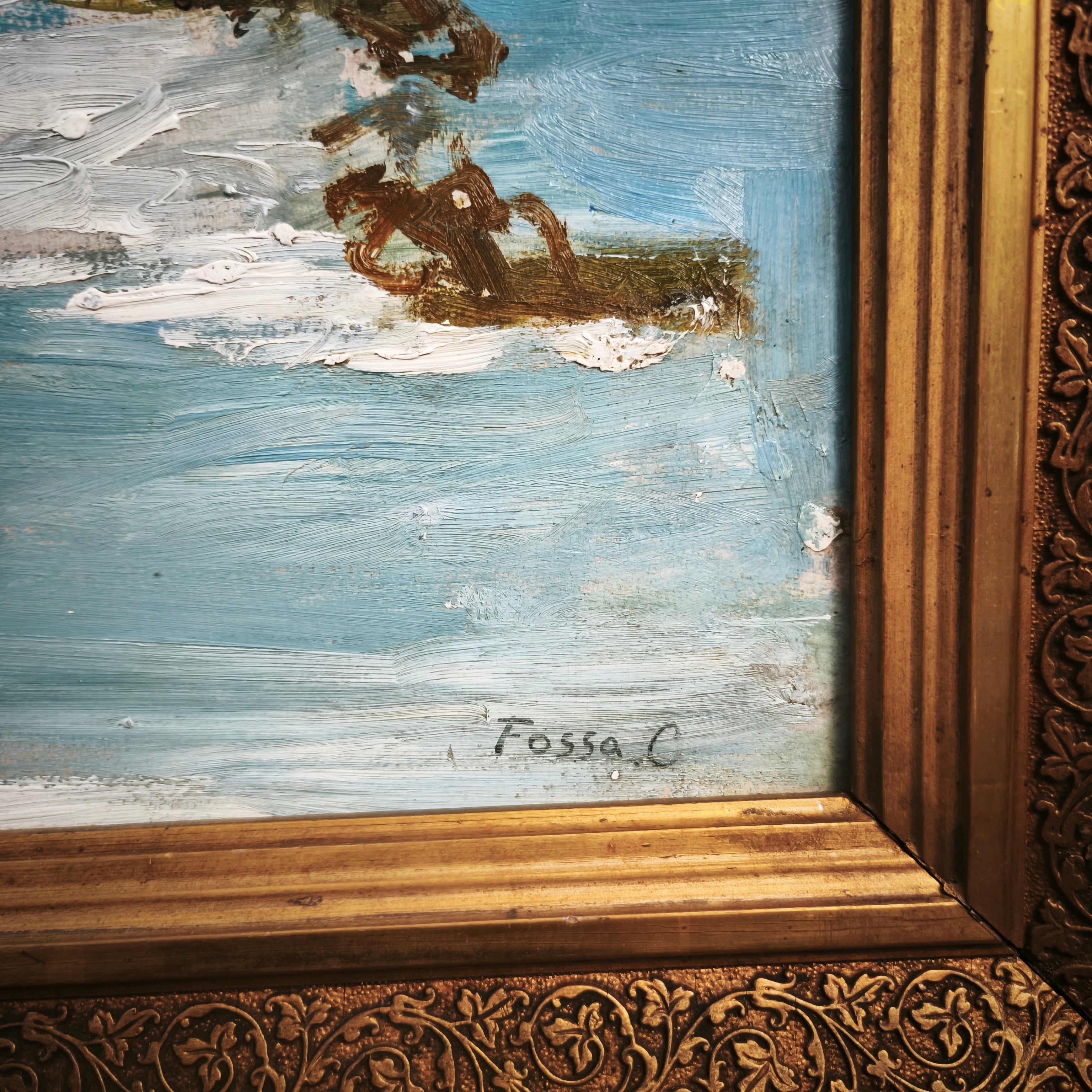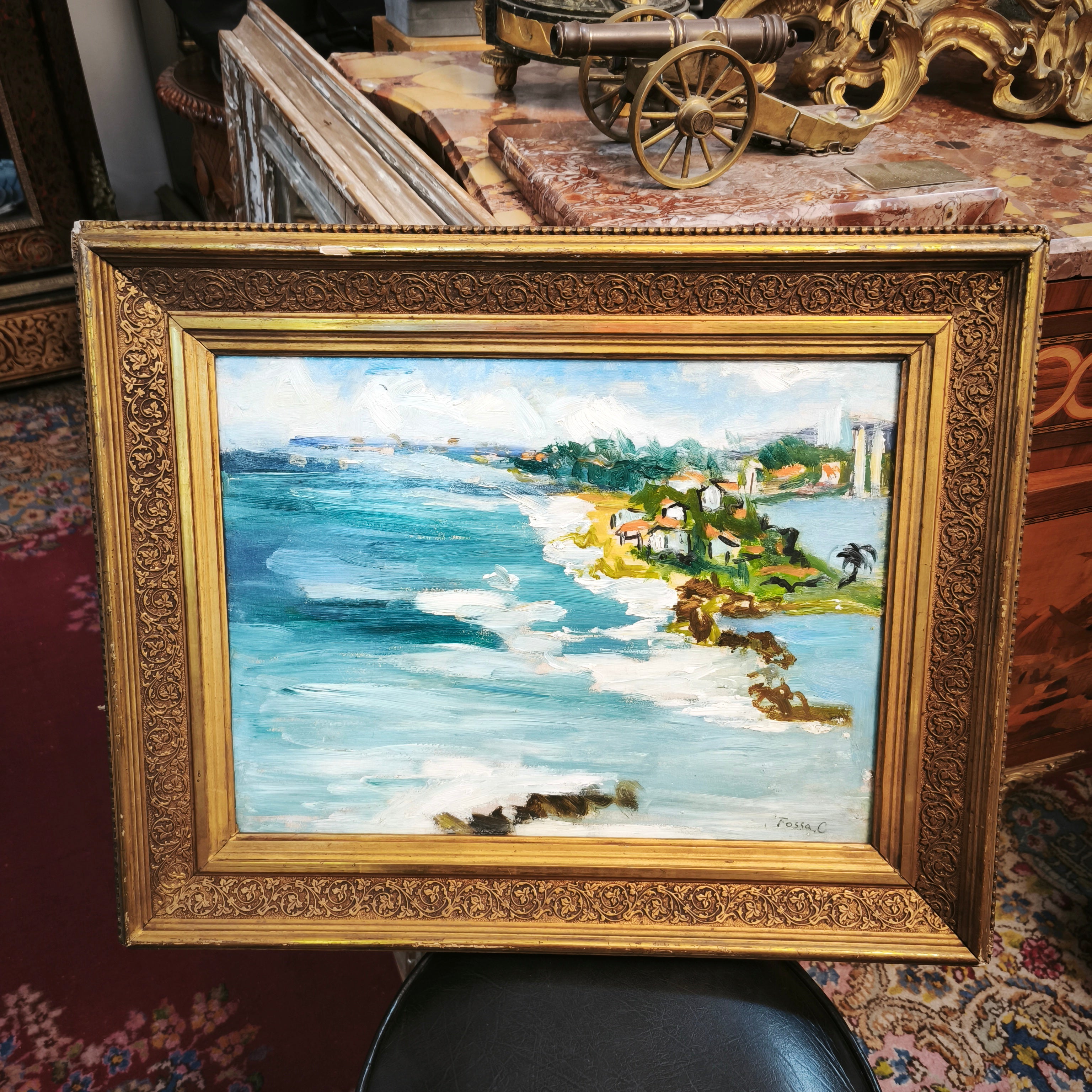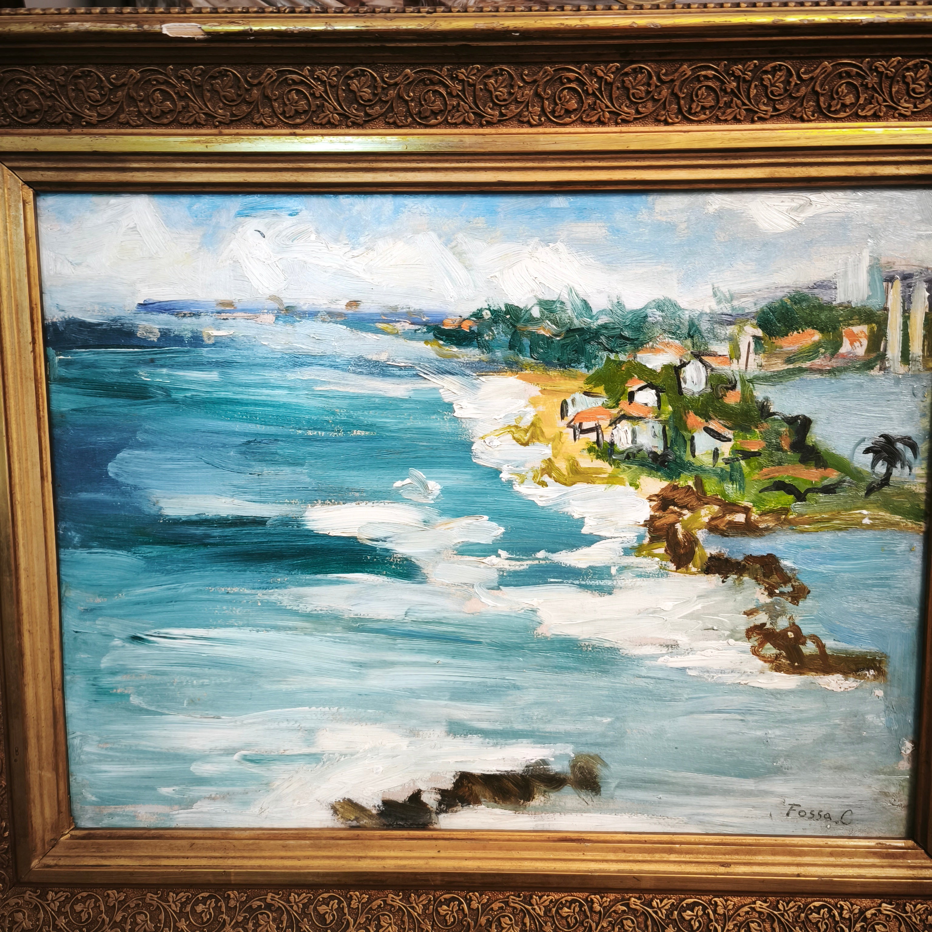 Óleo sobre madera del artista chileno Julio Fossa Calderón (1884-1946), representando de forma juguetona un paisaje costero con casitas, palmeras y algunos edificios, dentro de una composición asimétrica en la que el mar ocupa la mayor parte de la tela, dándole una escala y textura interesante al cuadro, que adquiere el movimiento de las olas. La obra está enmarcada en madera tallada en relieves y pintada de elegante dorado.