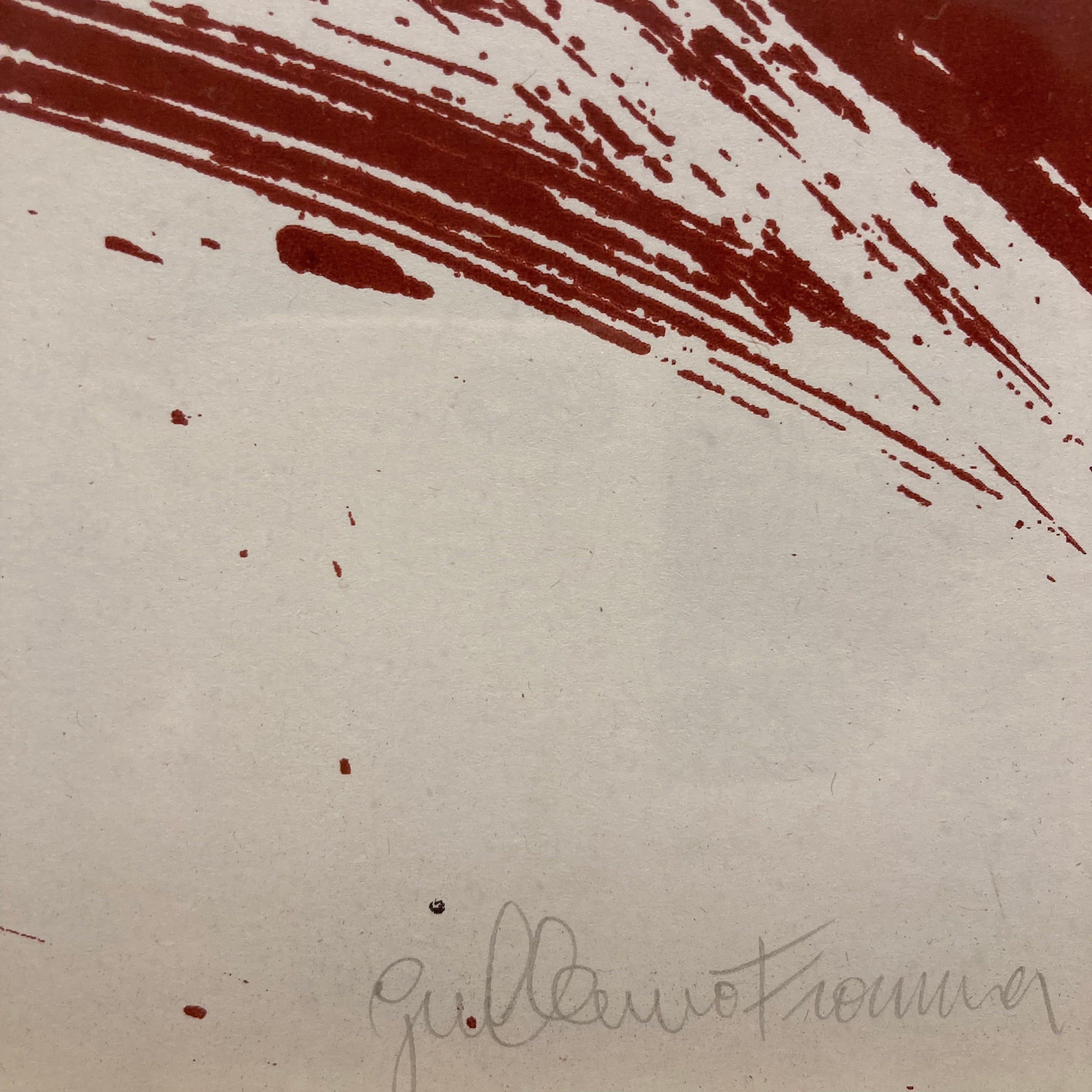 Serigrafía en dos colores del importante grabador chileno Guillermo Frommer formado en el prestigioso Tamarind Institute de Nuevo México. Realizado para la carpeta conmemorativa del simposio internacional de los derechos humanos, representa el artículo 3. Ejemplar 216 de 220.