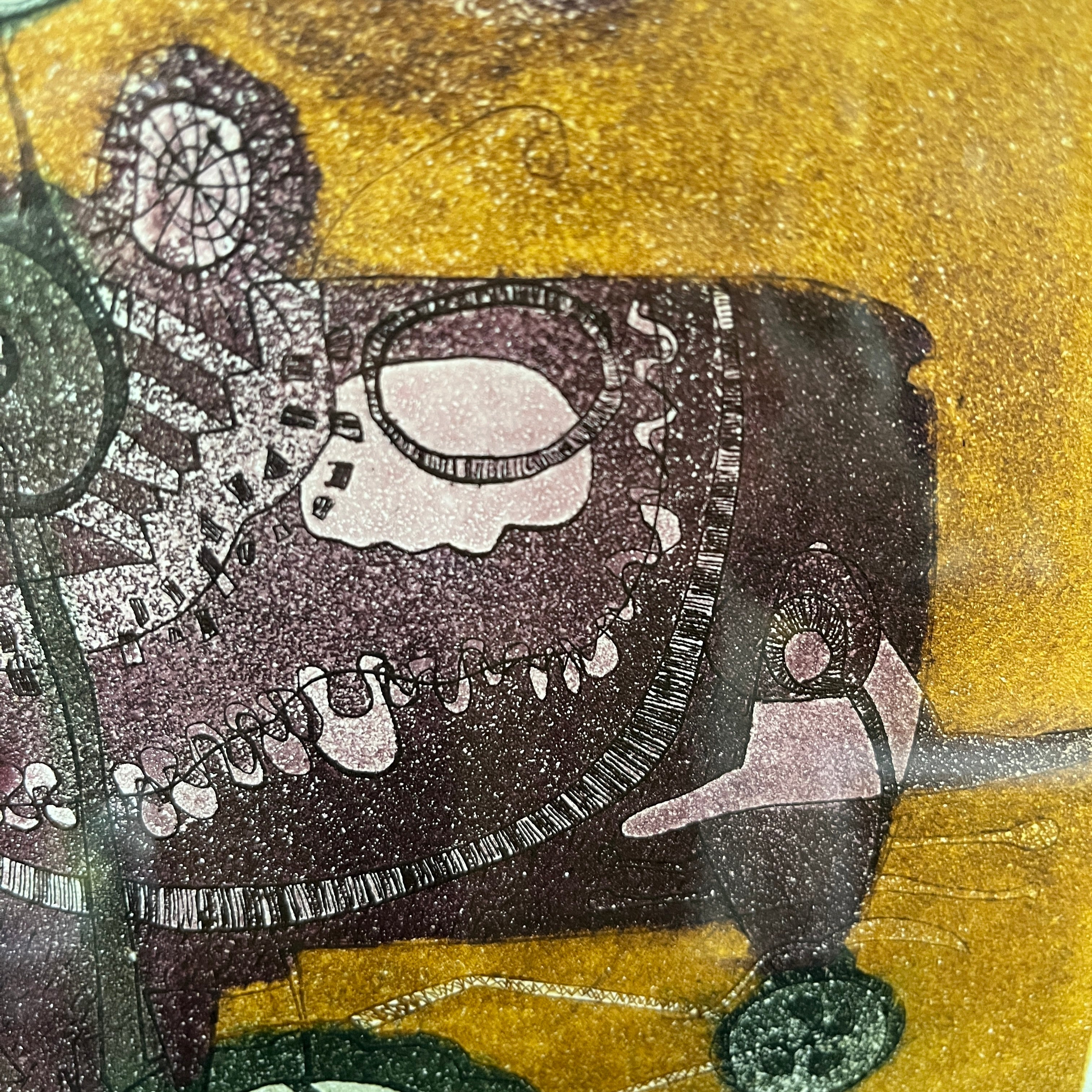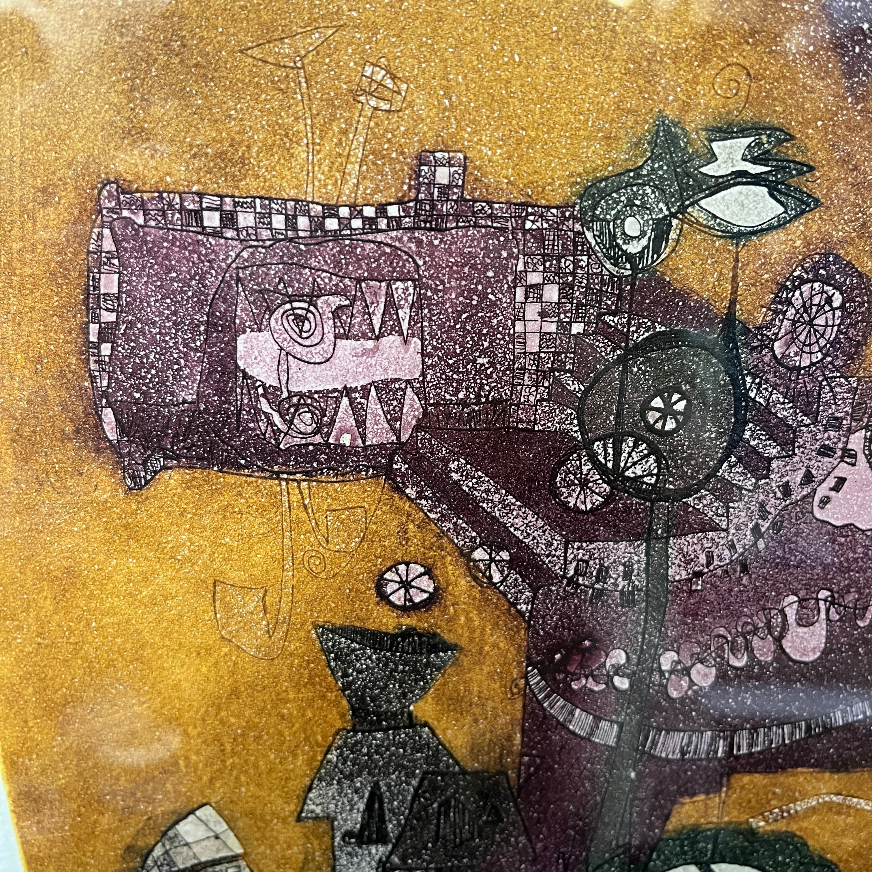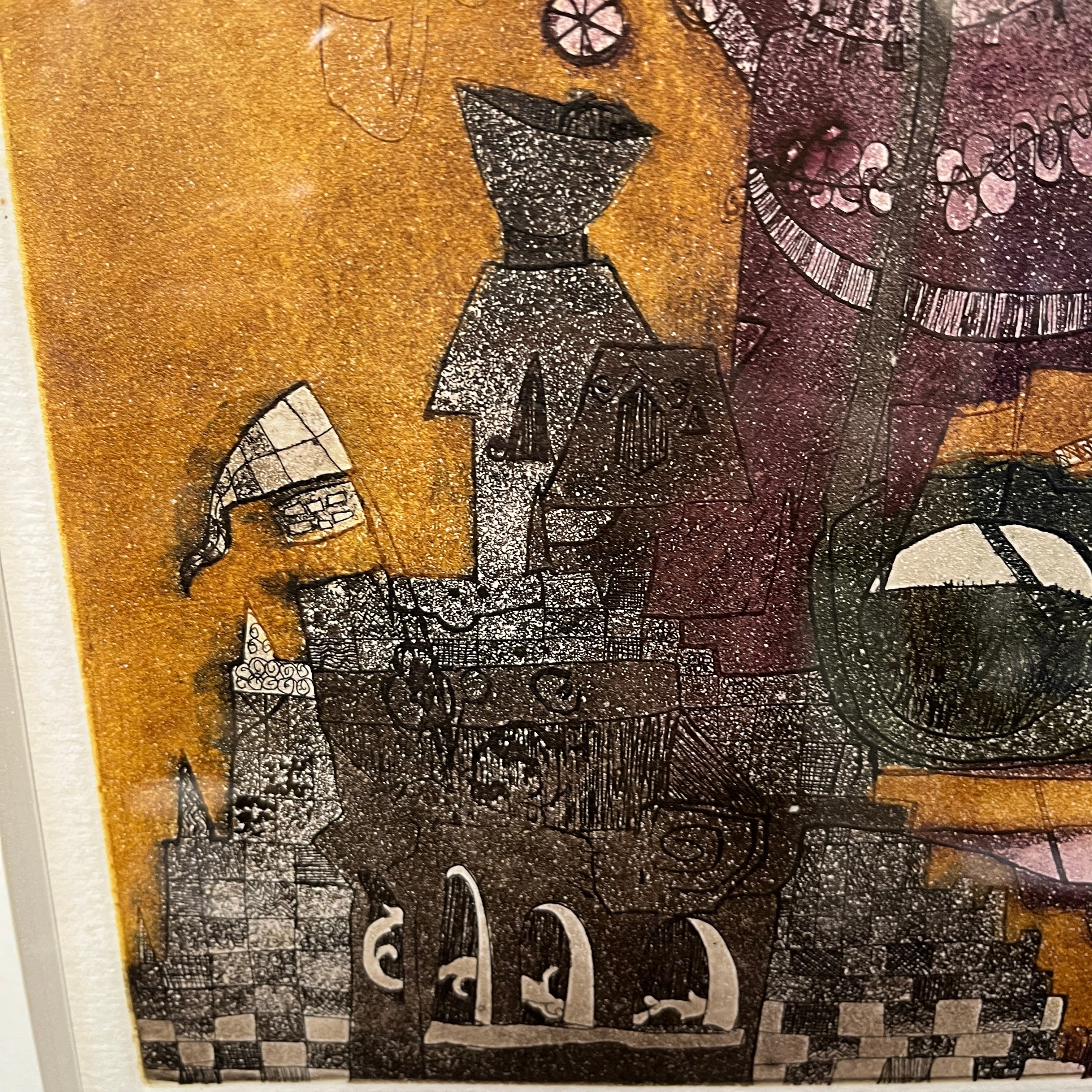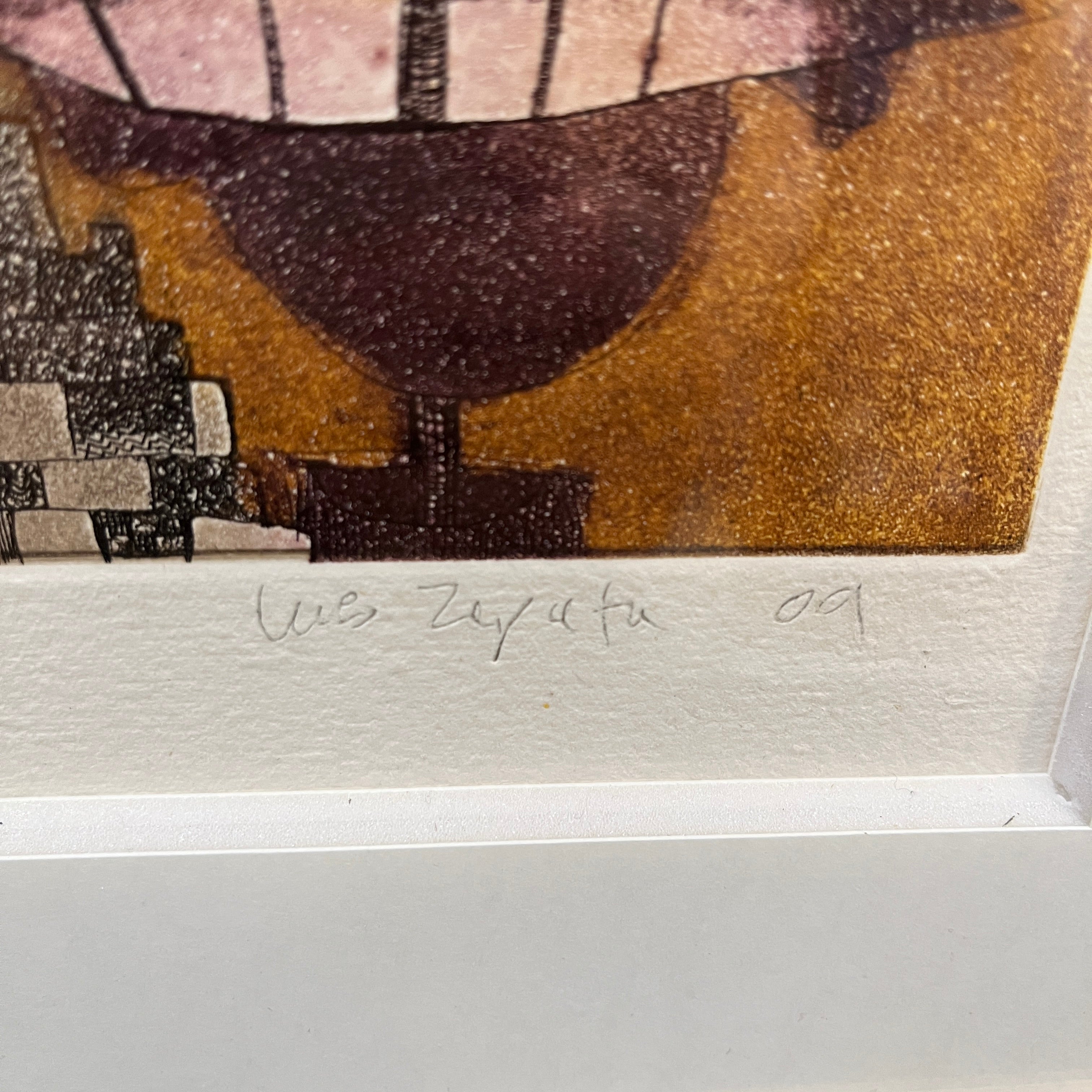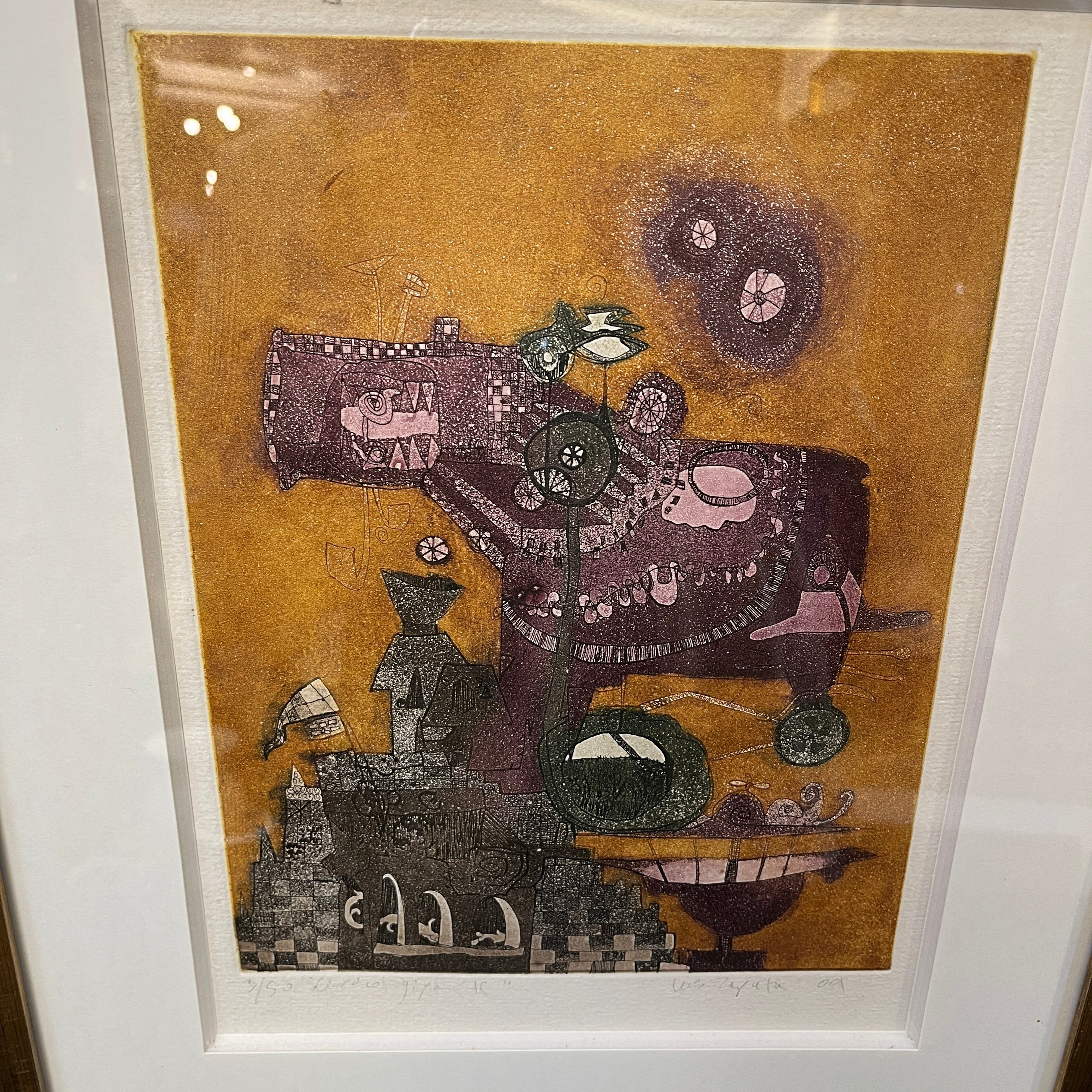 Grabado del pintor y grabador chileno, originario de Concepción, Luis Zapata. La obra, titulada Caracol Gigante, hace una construcción con cierto grado de abstracción, uniendo elementos no reconocibles a primera vista. El artista usa colores presentes en algunas de sus demás obras, como el morado y el amarillo, haciendo un buen contraste entre forma y fondo. Al mirar en detalle, la textura de puntillismo del grabado responde a la técnica utilizada por el artista de grabado en metal. La obra está enmarcada en madera de diseño sobrio y acabado dorado.
