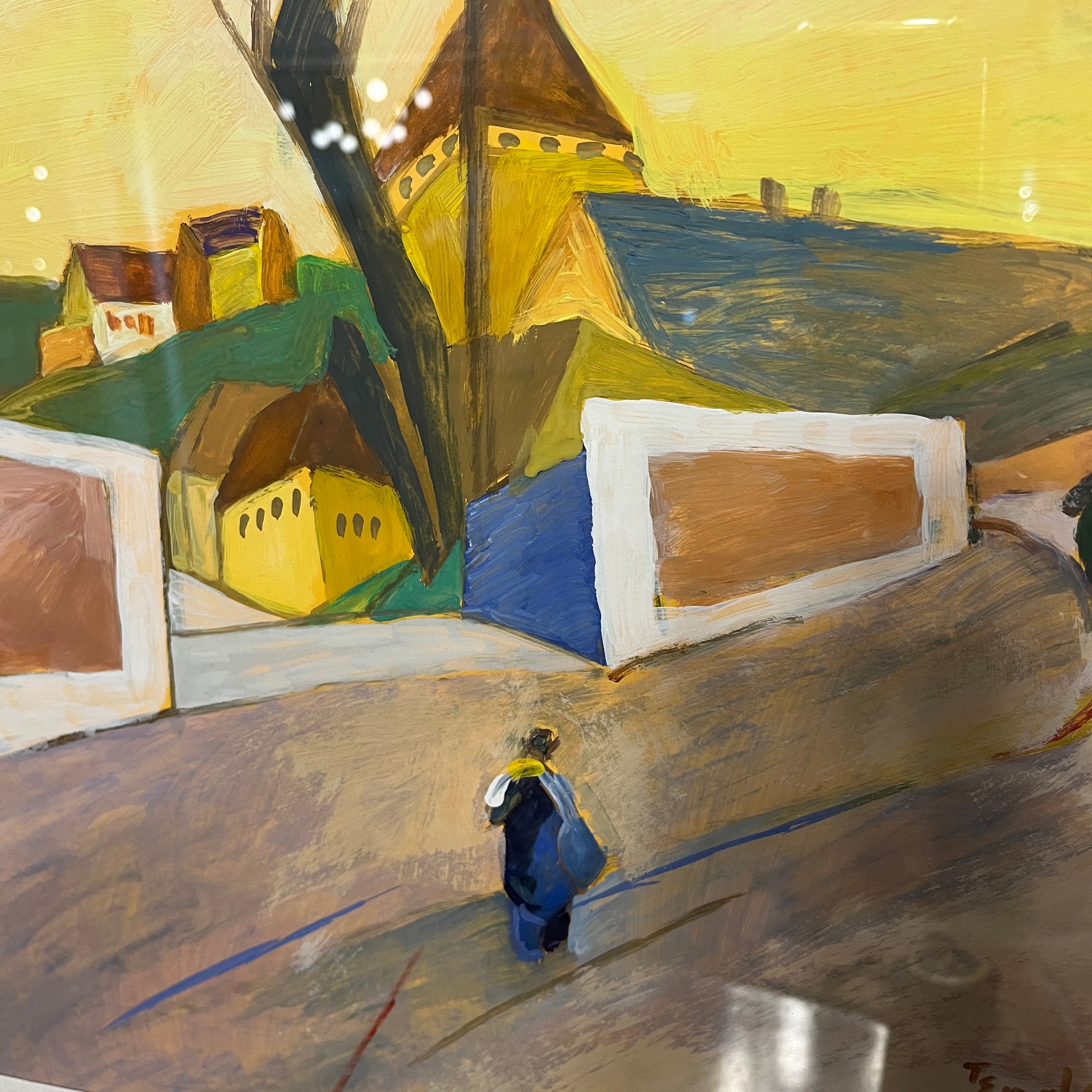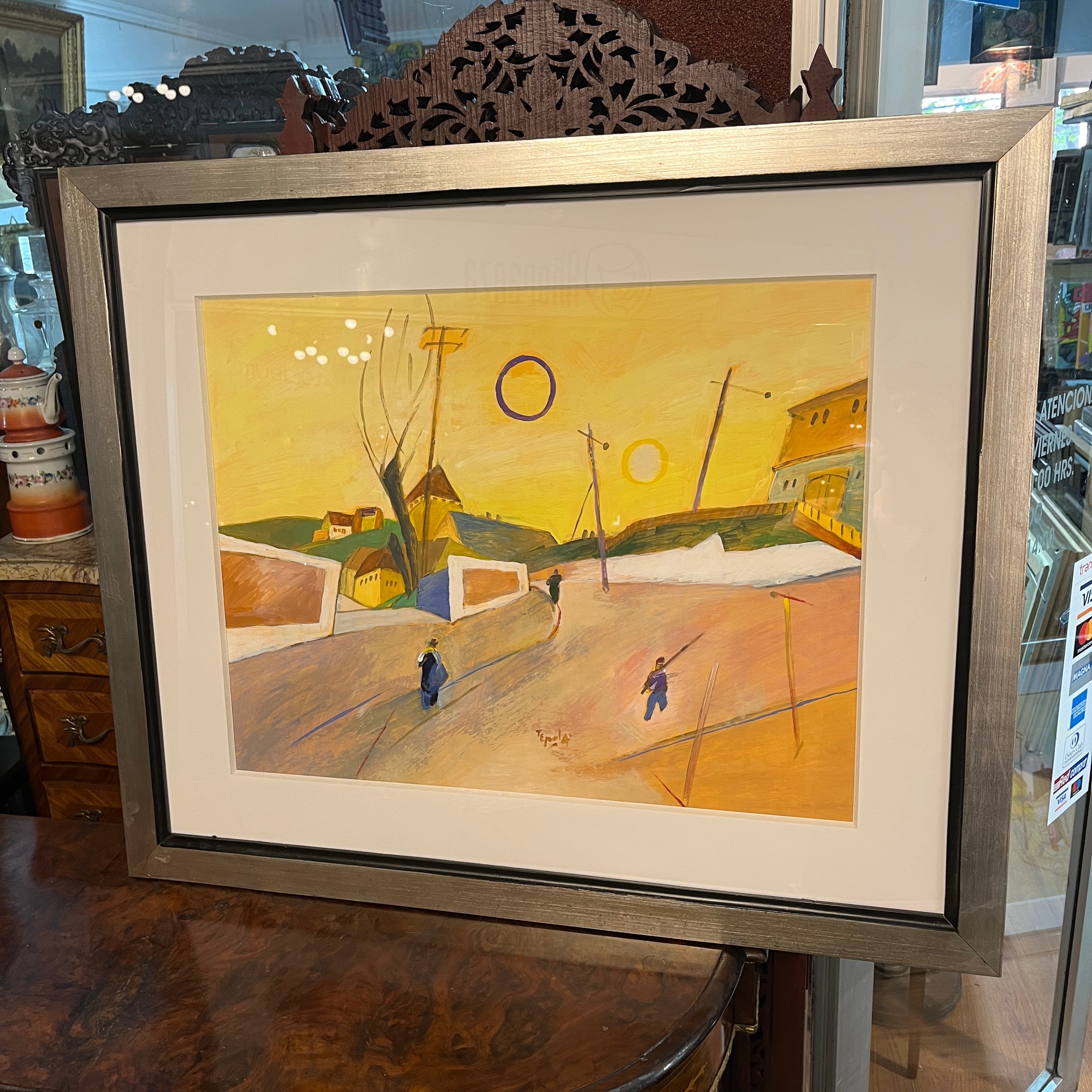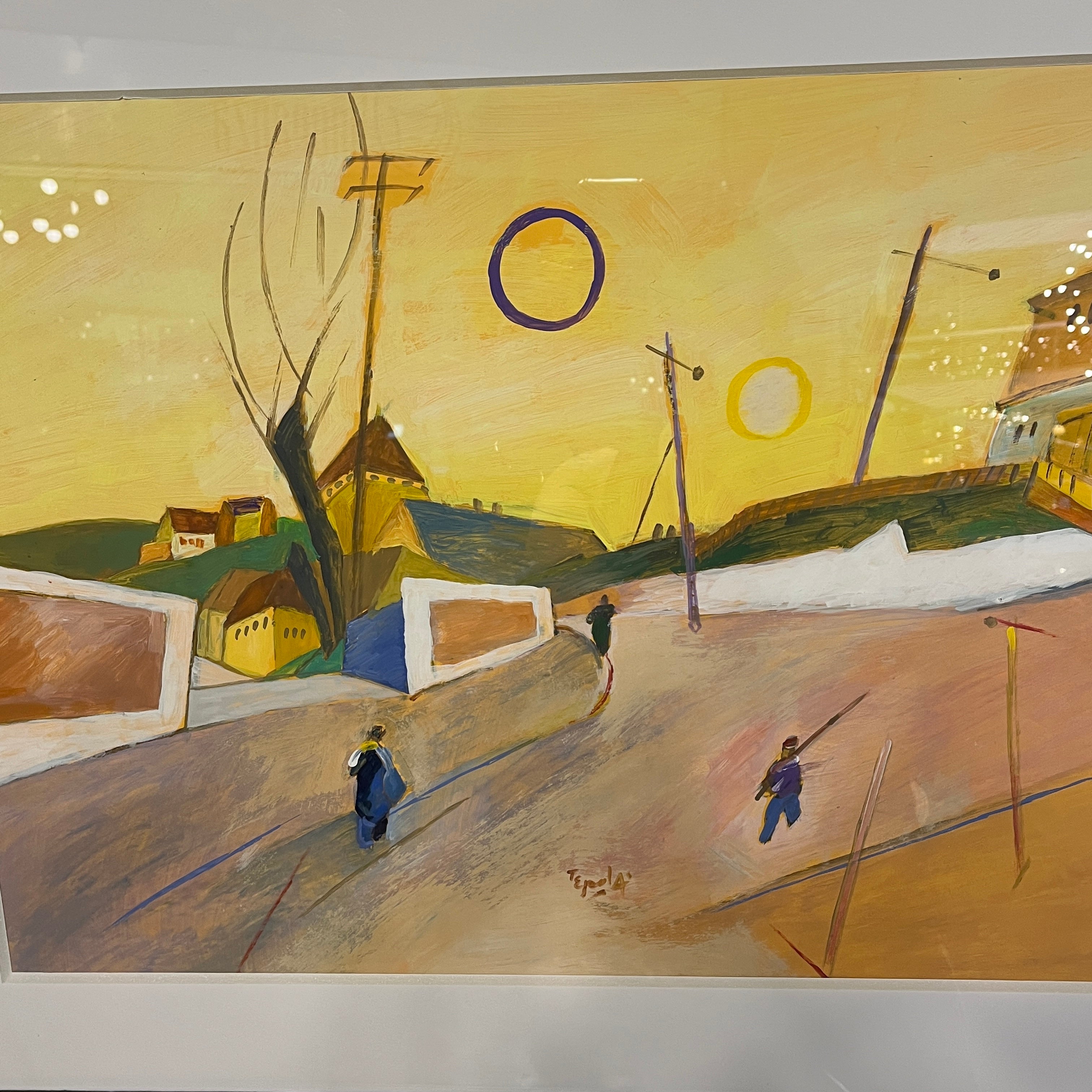 Óleo sobre papel del artista chileno Luis Tejada, representando un paisaje en el que dos personajes caminan por una calle de cemento, con sus luminarias y casas, bajo un gran cielo amarillo con dos soles. El paisaje tiene una deconstrucción de las perspectivas, elemento reconocible en la obra del artista, dándole un aspecto geométrico al paisaje. La obra está enmarcada en madera de diseño sobrio, terminada en pintura plateada.