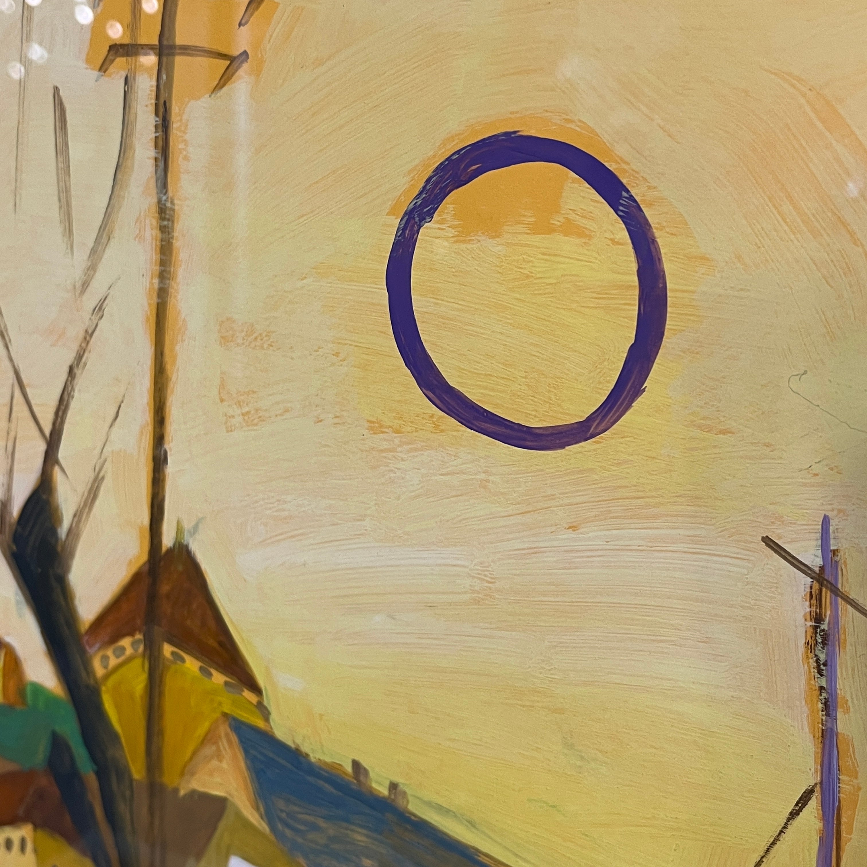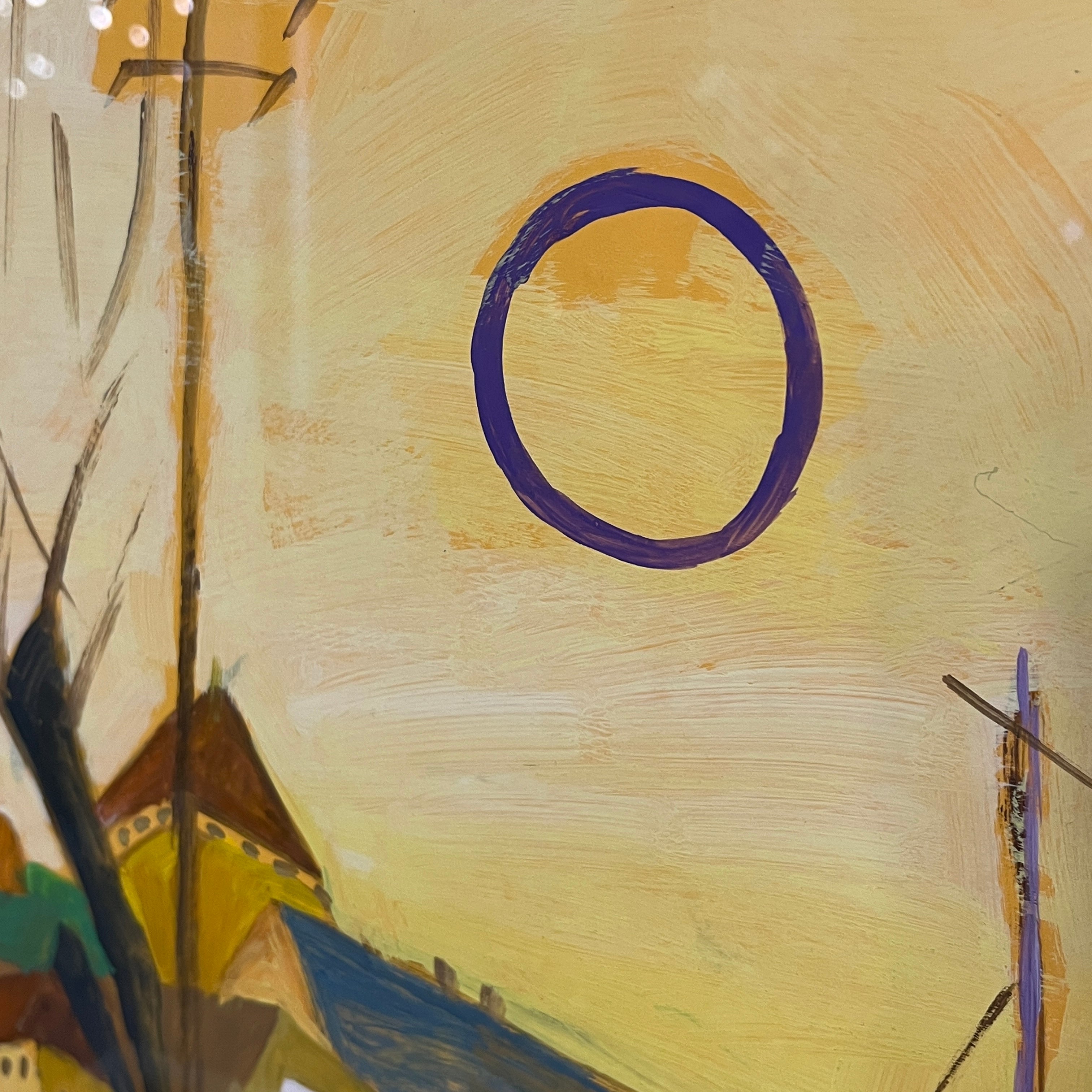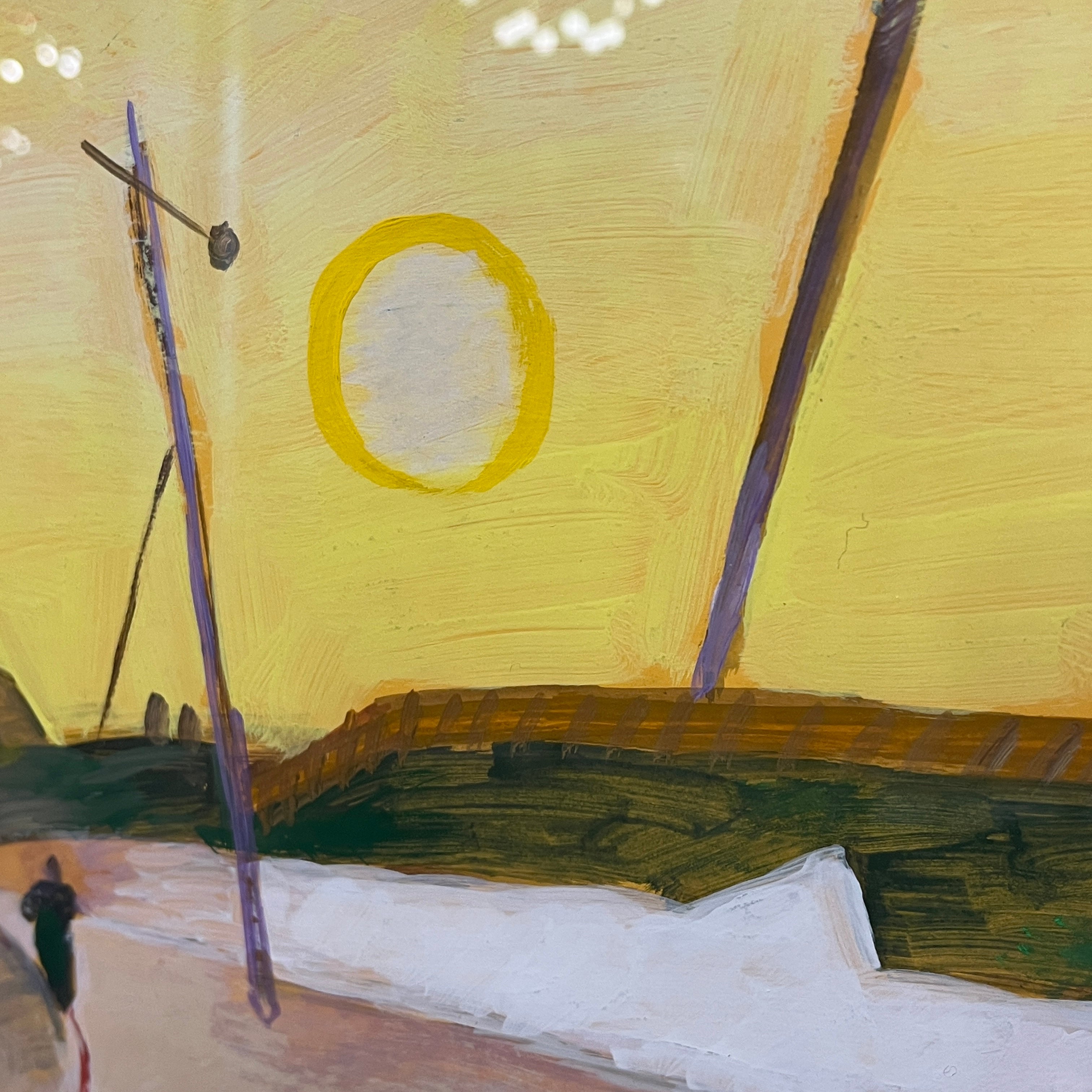 Óleo sobre papel del artista chileno Luis Tejada, representando un paisaje en el que dos personajes caminan por una calle de cemento, con sus luminarias y casas, bajo un gran cielo amarillo con dos soles. El paisaje tiene una deconstrucción de las perspectivas, elemento reconocible en la obra del artista, dándole un aspecto geométrico al paisaje. La obra está enmarcada en madera de diseño sobrio, terminada en pintura plateada.