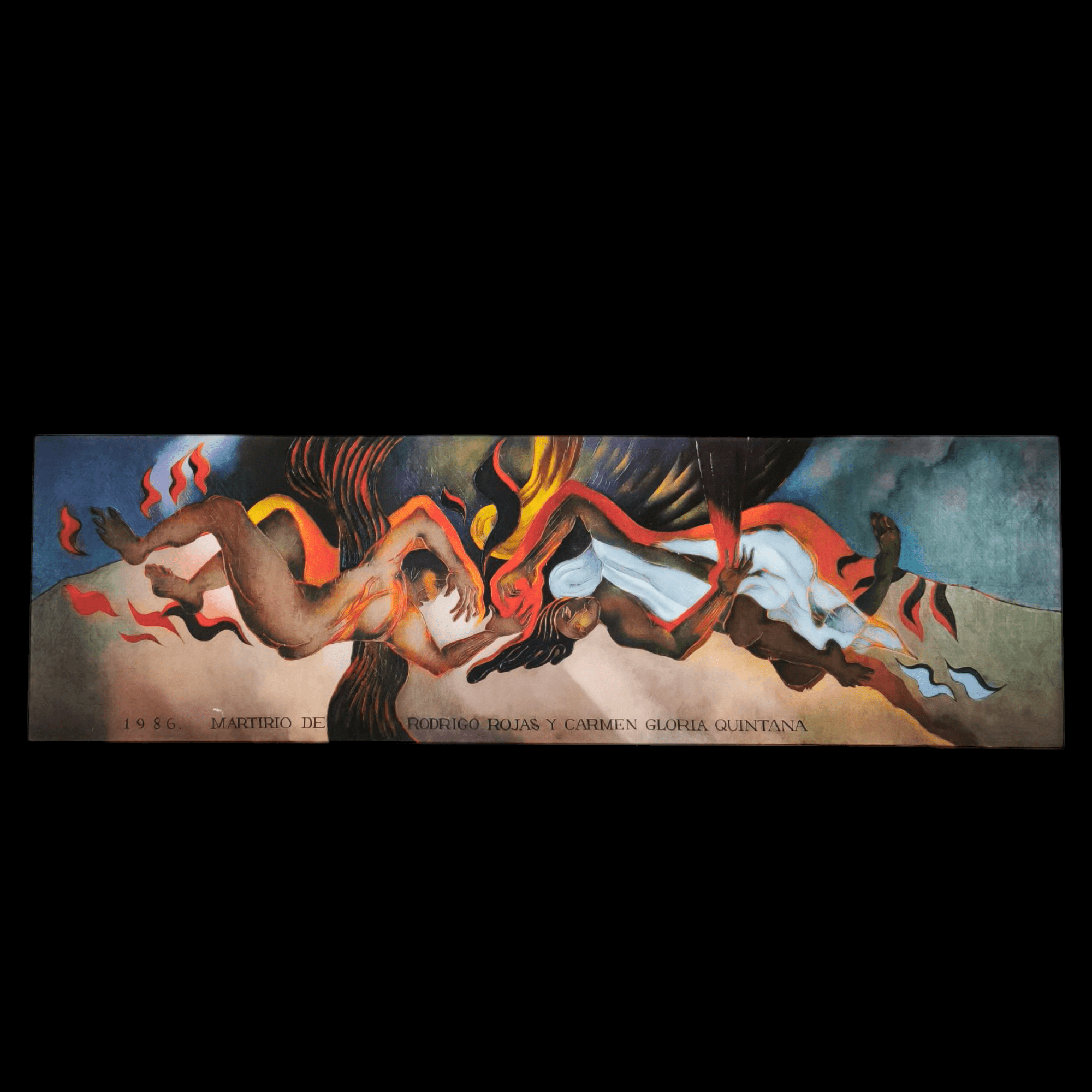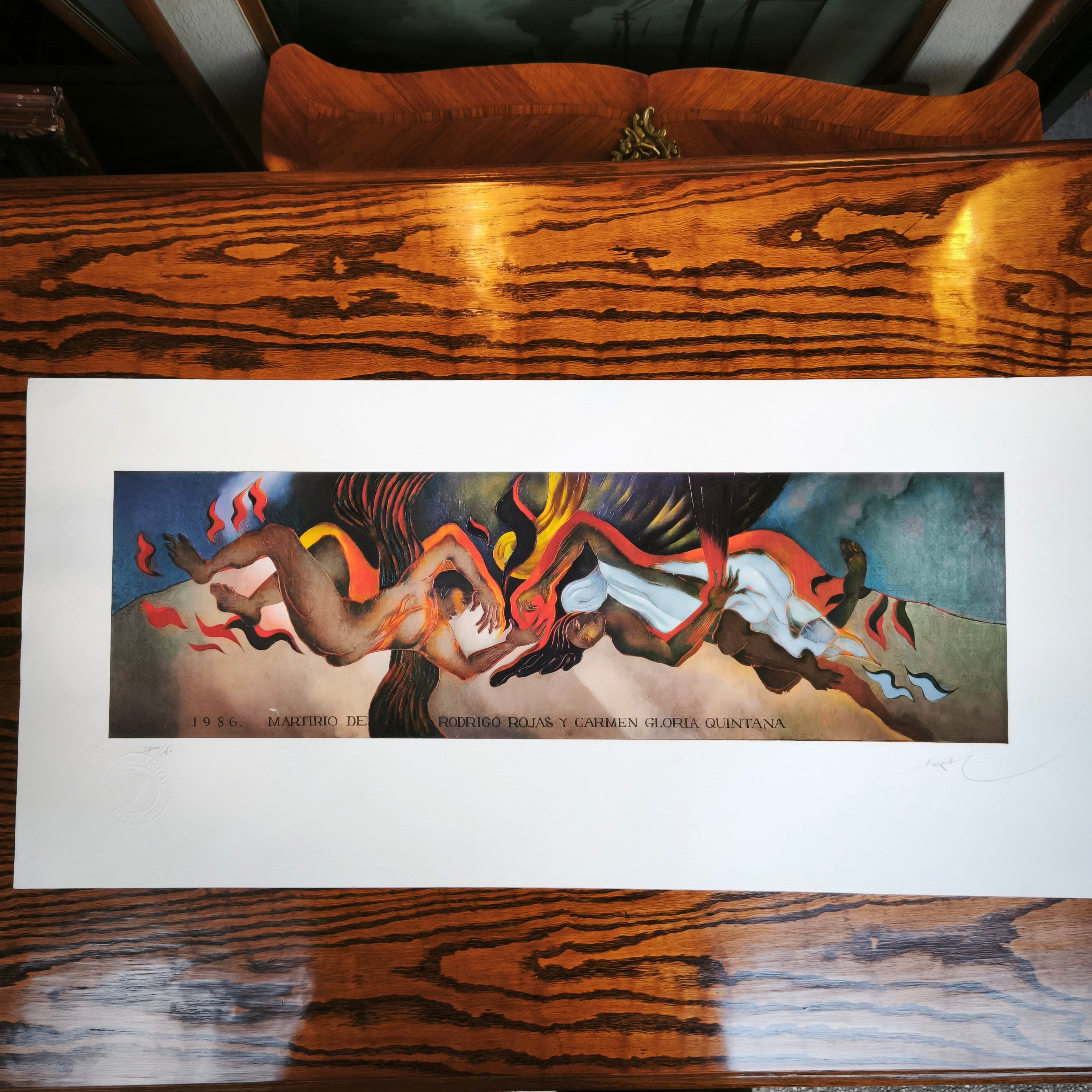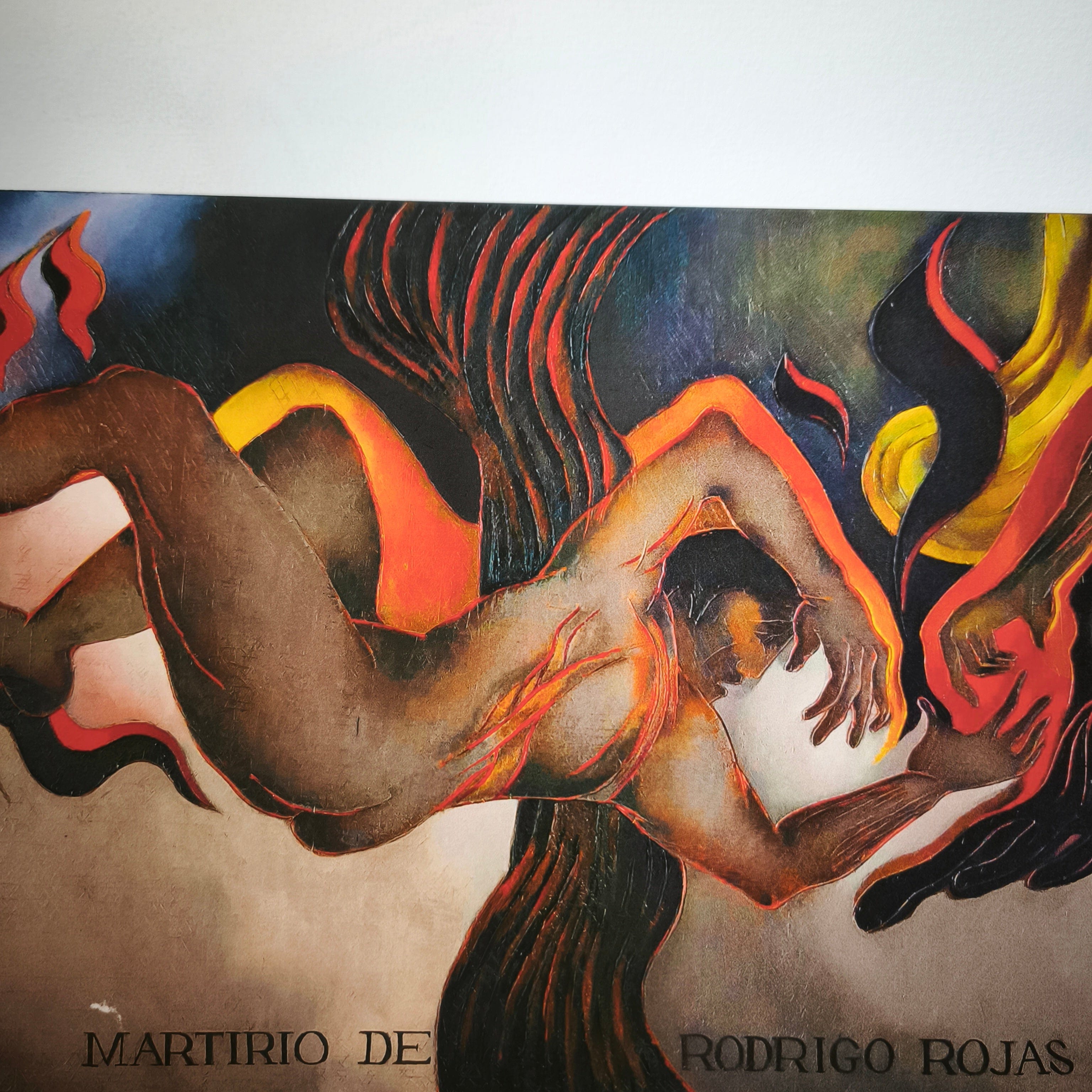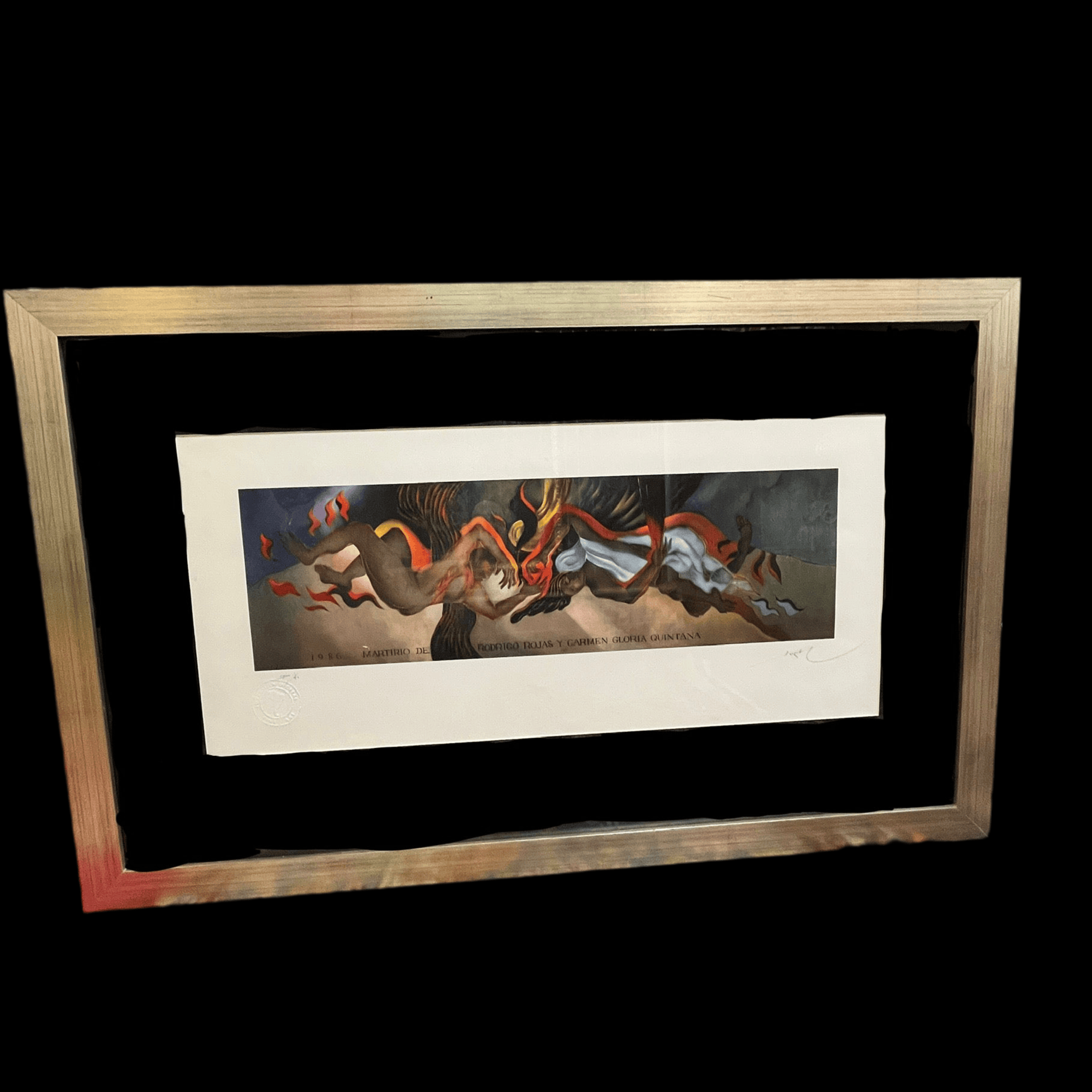 Impresión digital en técnica Giclée del reconocido artista chileno Mario Toral, haciendo una representación, en su típico estilo, un homenaje al fotógrafo Rodrigo Rojas y la psicóloga chilena Carmen Gloria Quintana', quienes fueron detenidos y quemados vivos por militares en 1986, durante la dictadura militar chilena. La obra tiene un marco contemporáneo de madera, de diseño sobrio y terminación plateada.