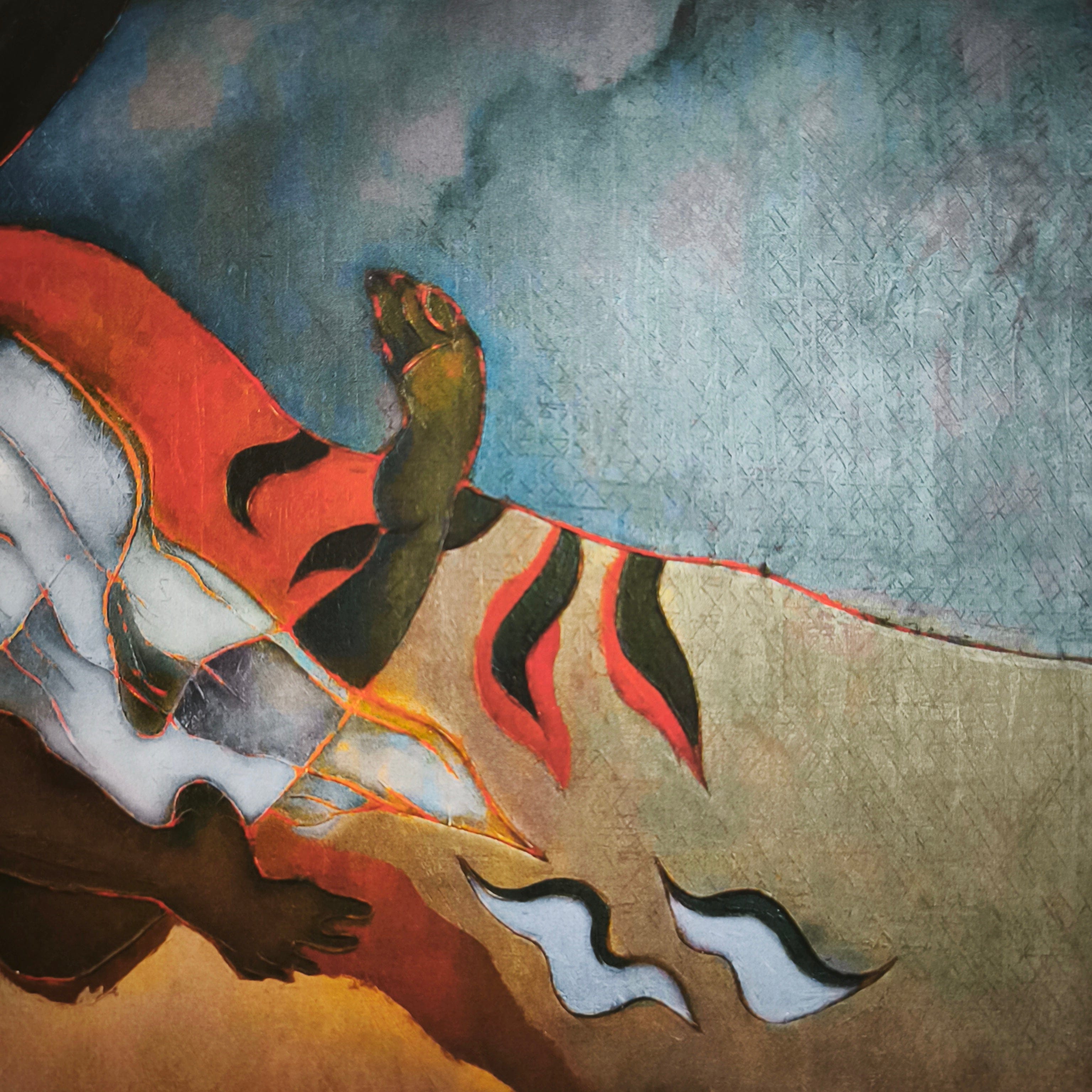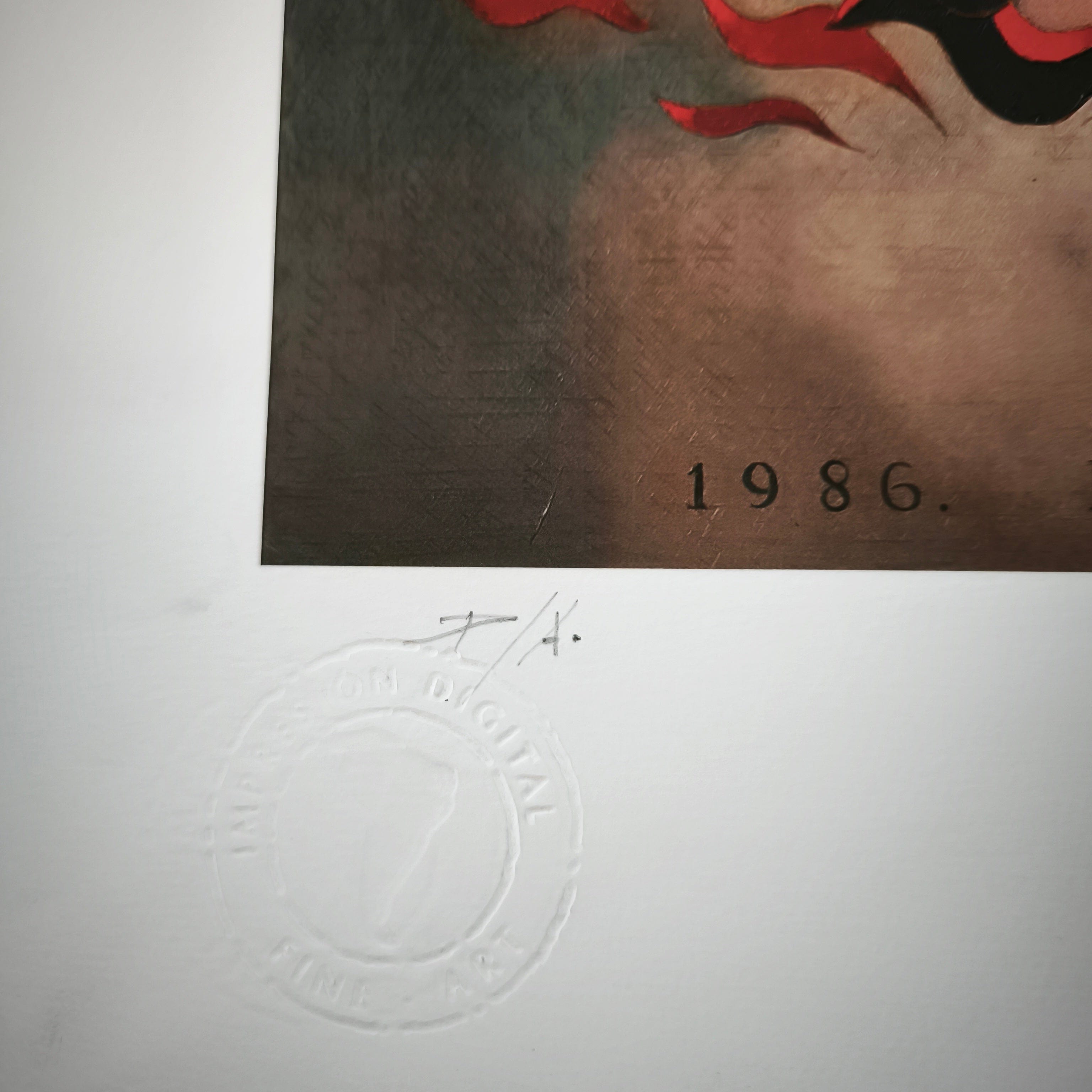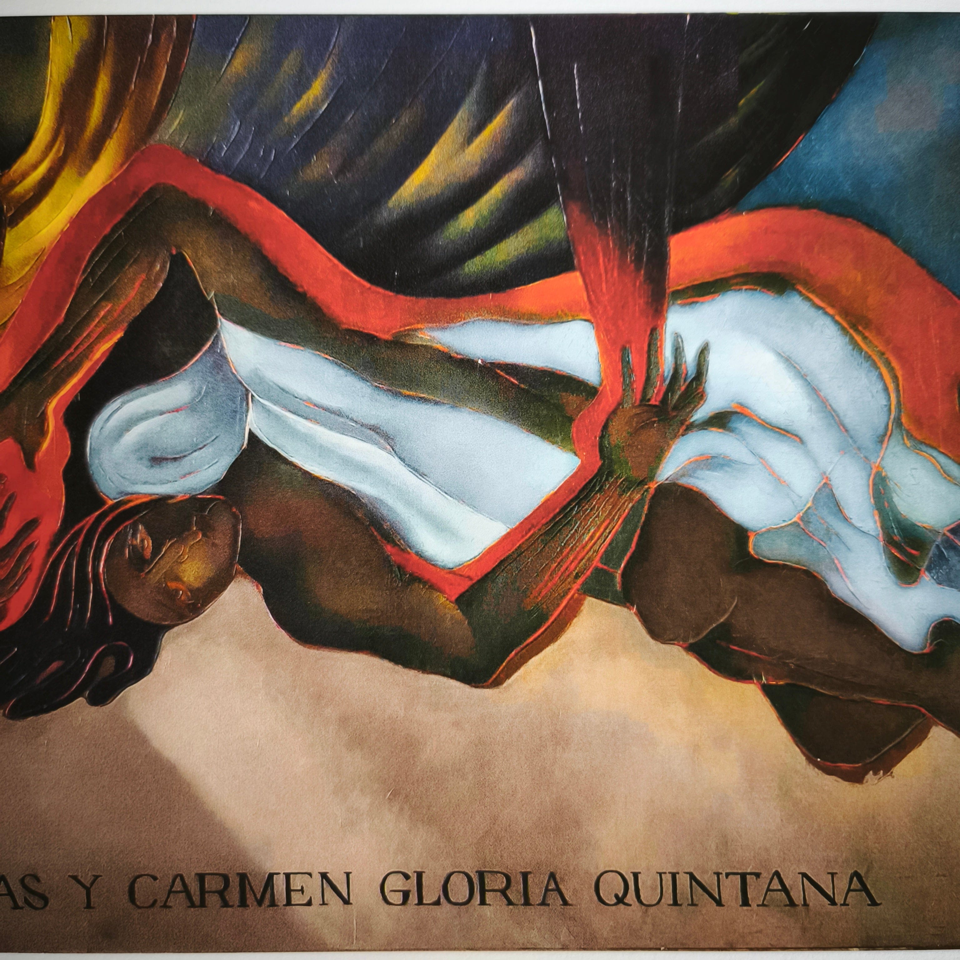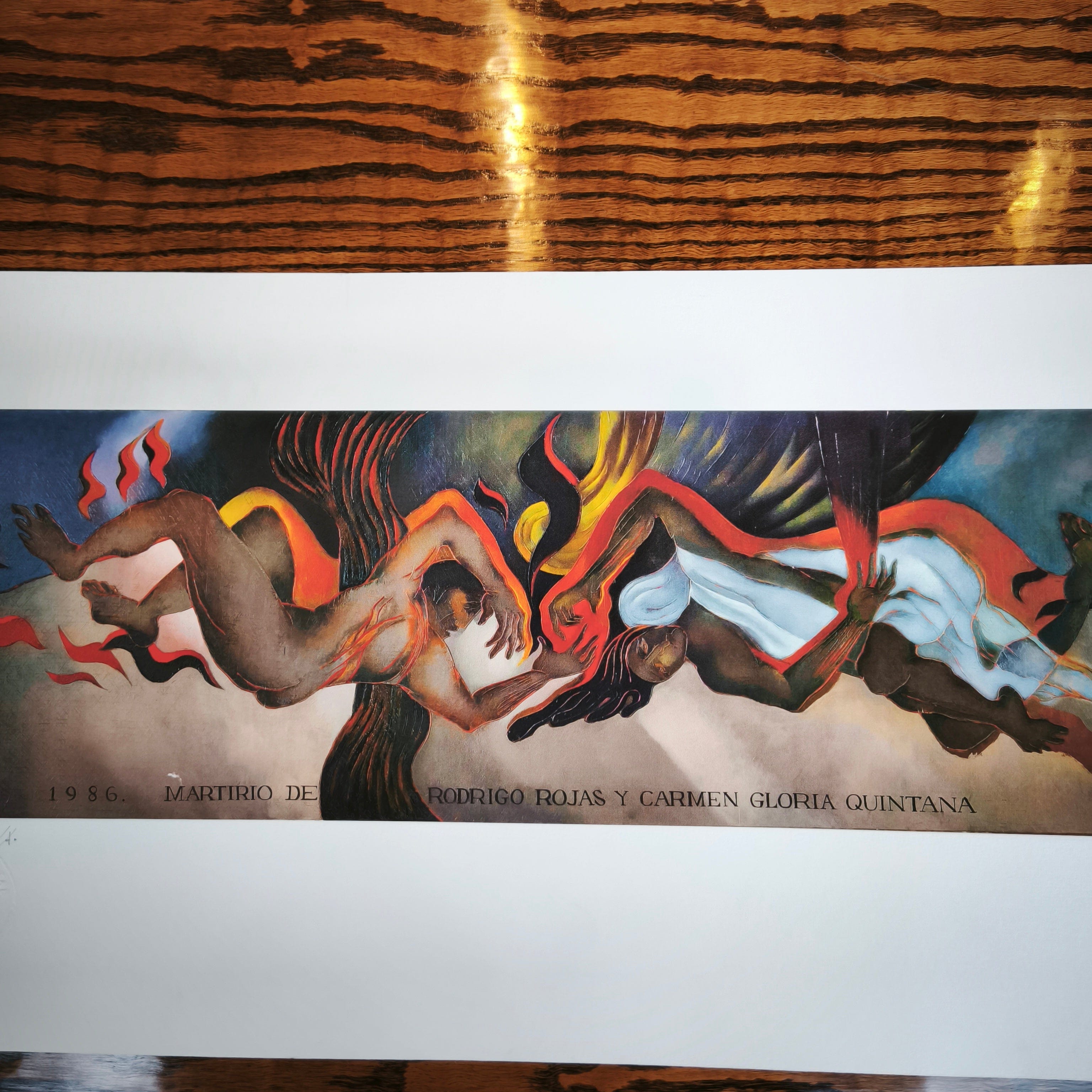 Impresión digital en técnica Giclée del reconocido artista chileno Mario Toral, haciendo una representación, en su típico estilo, un homenaje al fotógrafo Rodrigo Rojas y la psicóloga chilena Carmen Gloria Quintana', quienes fueron detenidos y quemados vivos por militares en 1986, durante la dictadura militar chilena. La obra tiene un marco contemporáneo de madera, de diseño sobrio y terminación plateada.
