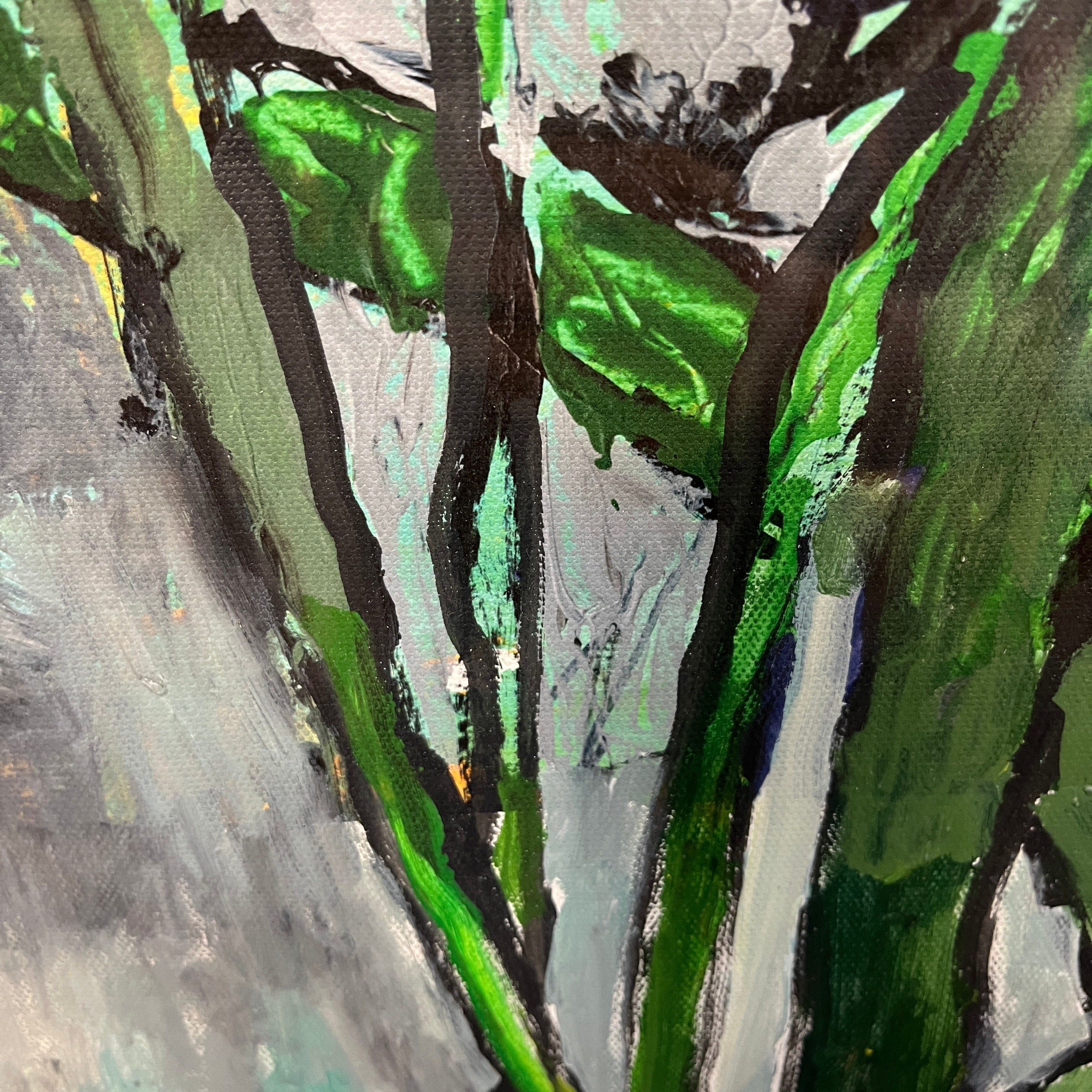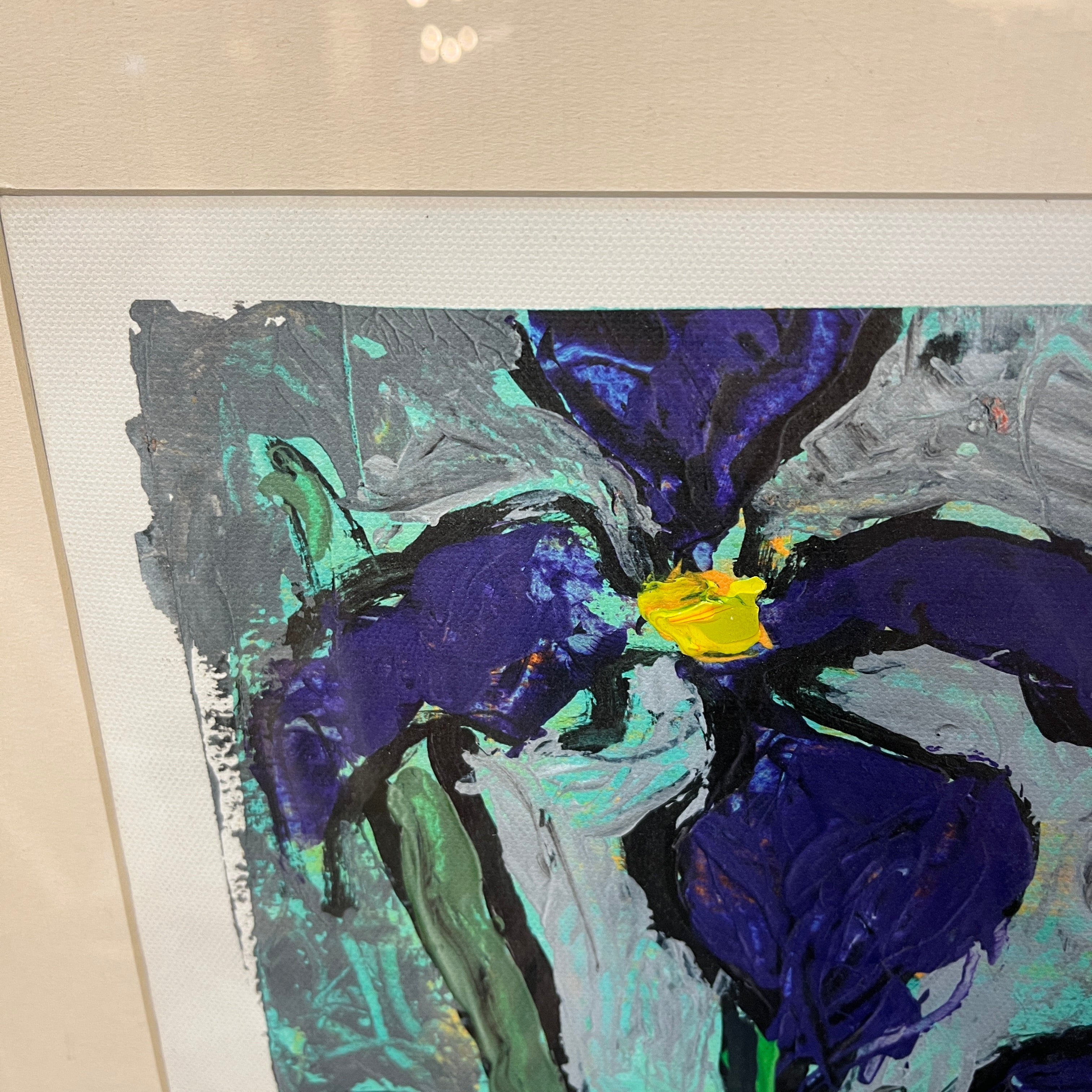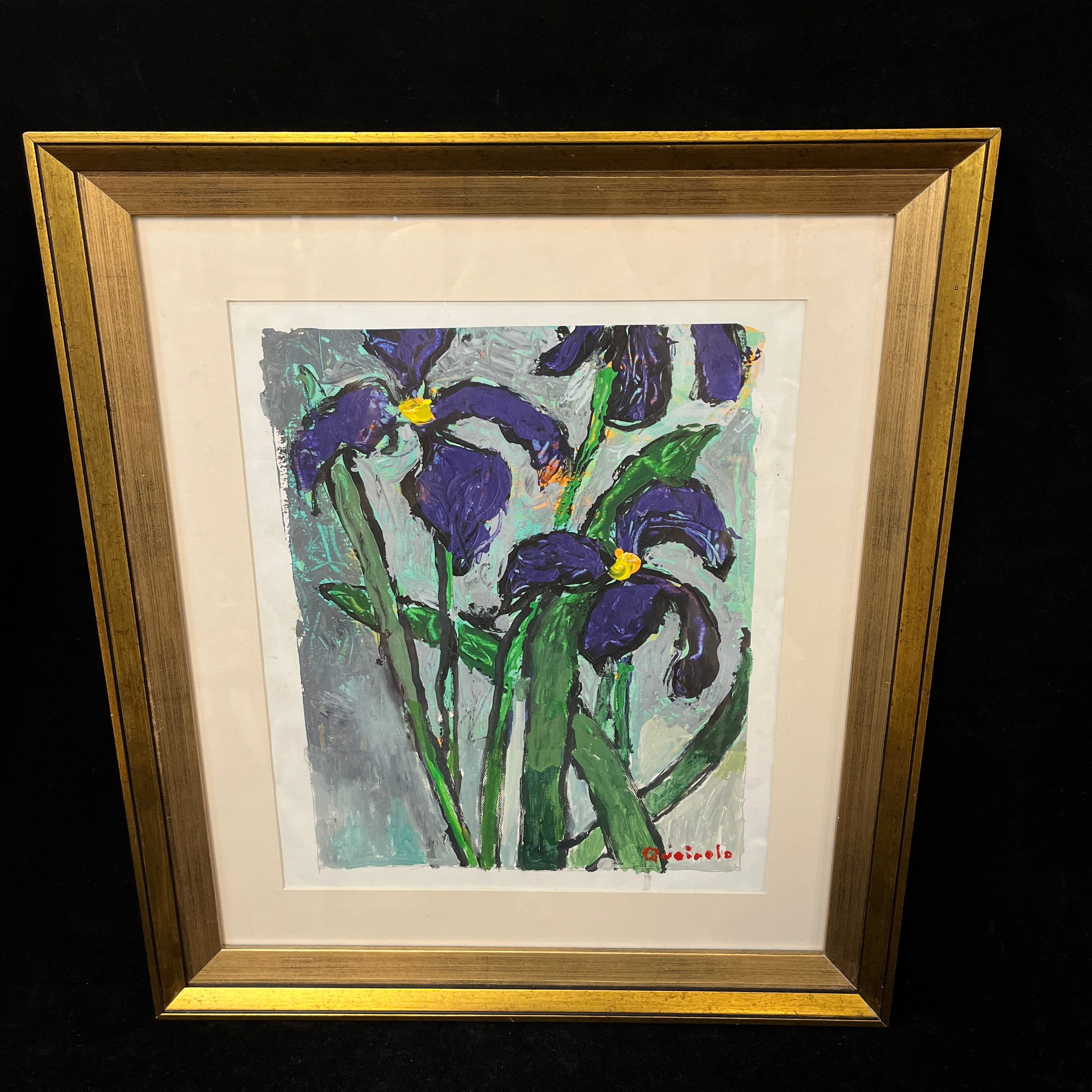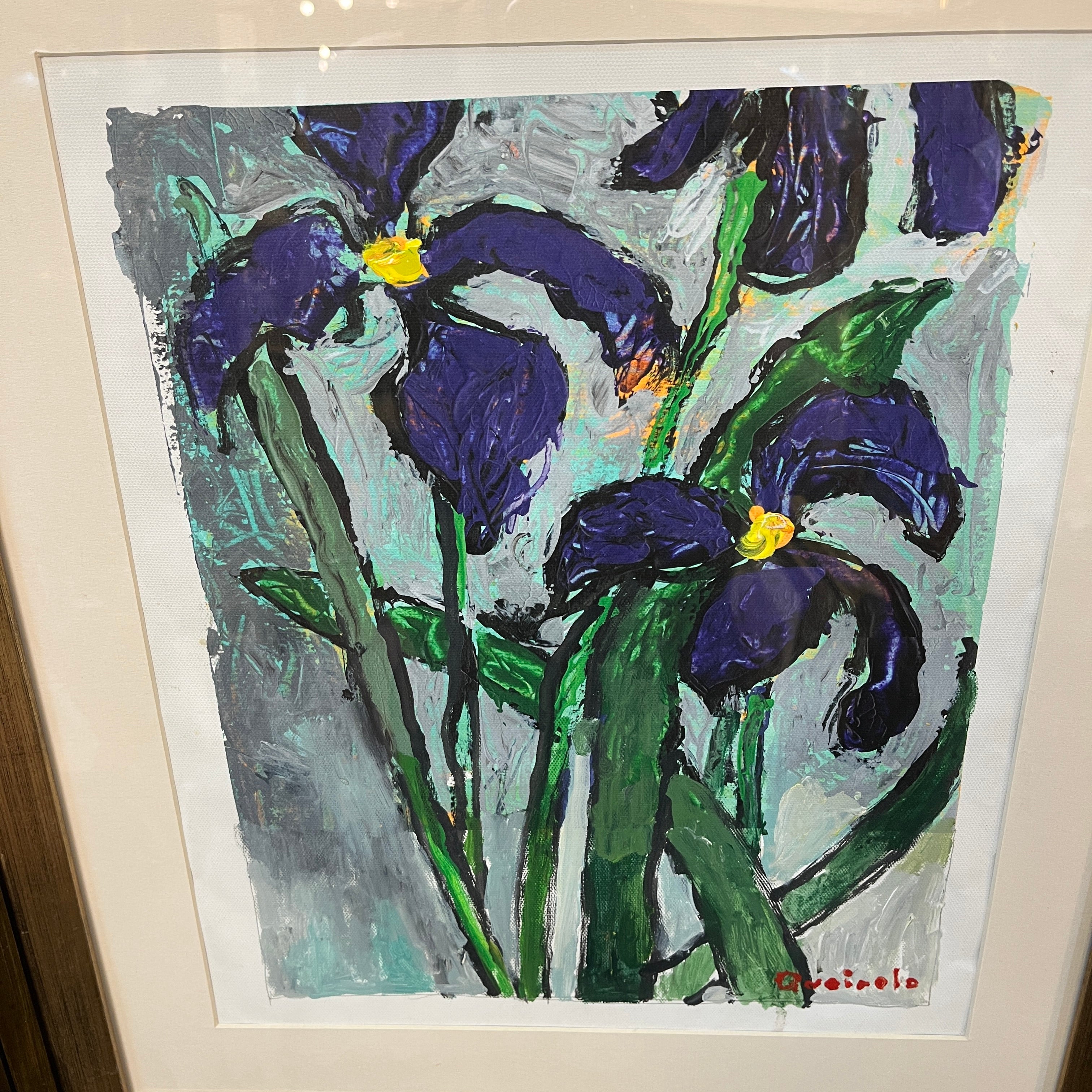 Acrílico sobre papel del artista chileno Vittorio Queirolo, representando unos lirios con su reconocible estilo lúdico y expresivo en el uso del material. Las flores, de colores saturados, están sobre un fondo de trazos grises, haciendo resaltar la combinación de verde, morado y amarillo. La obra tiene un marco contemporáneo, de diseño minimalista, pintado en dorado.