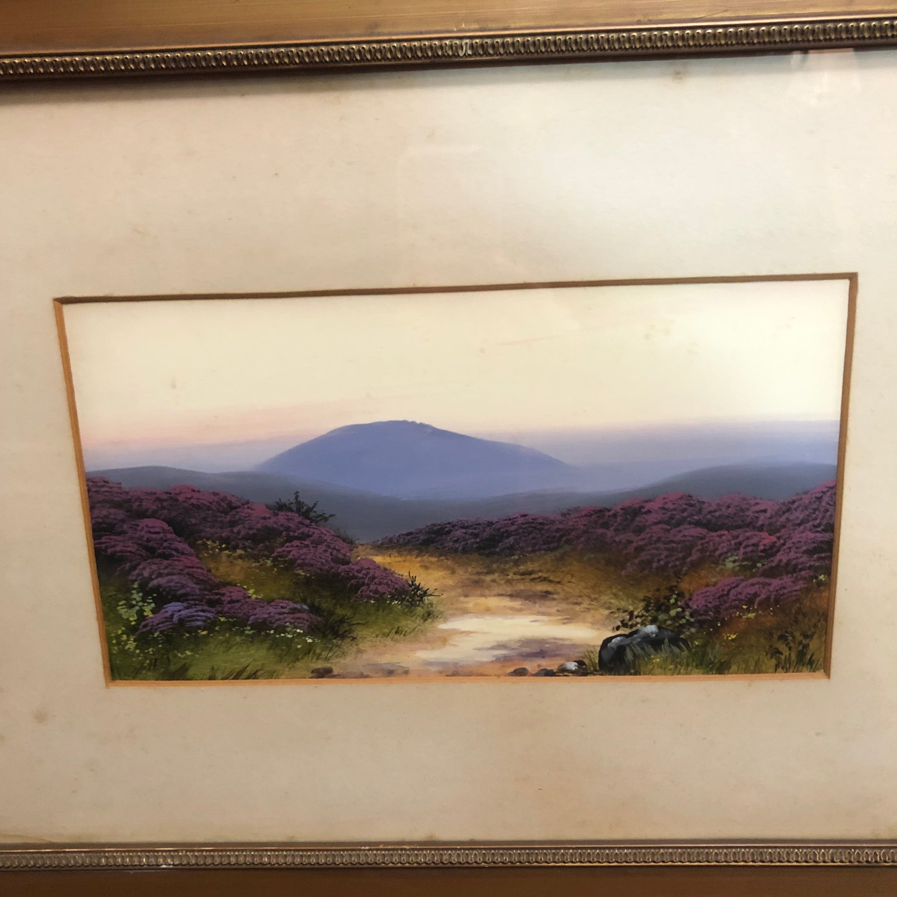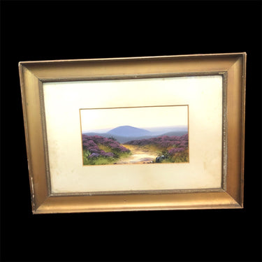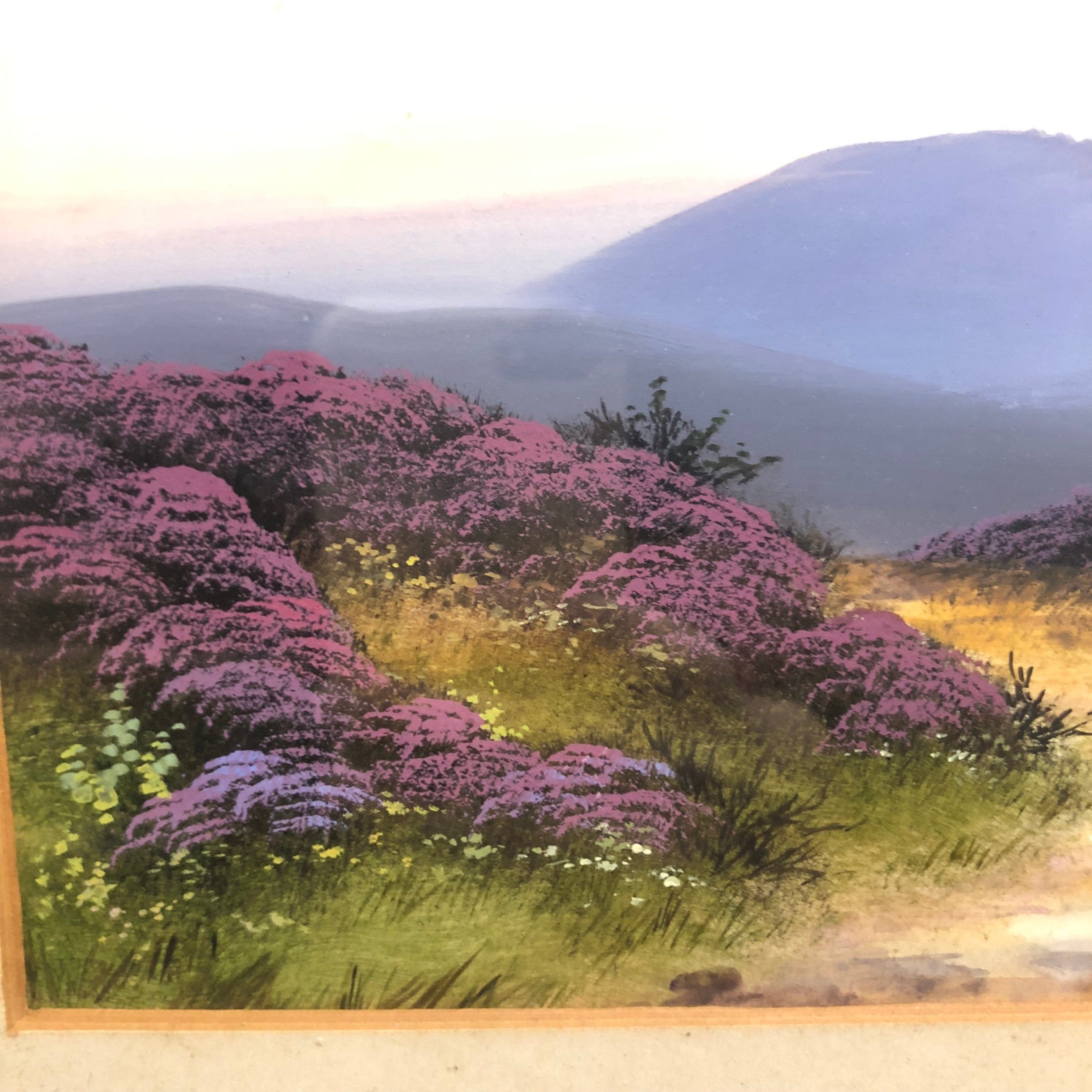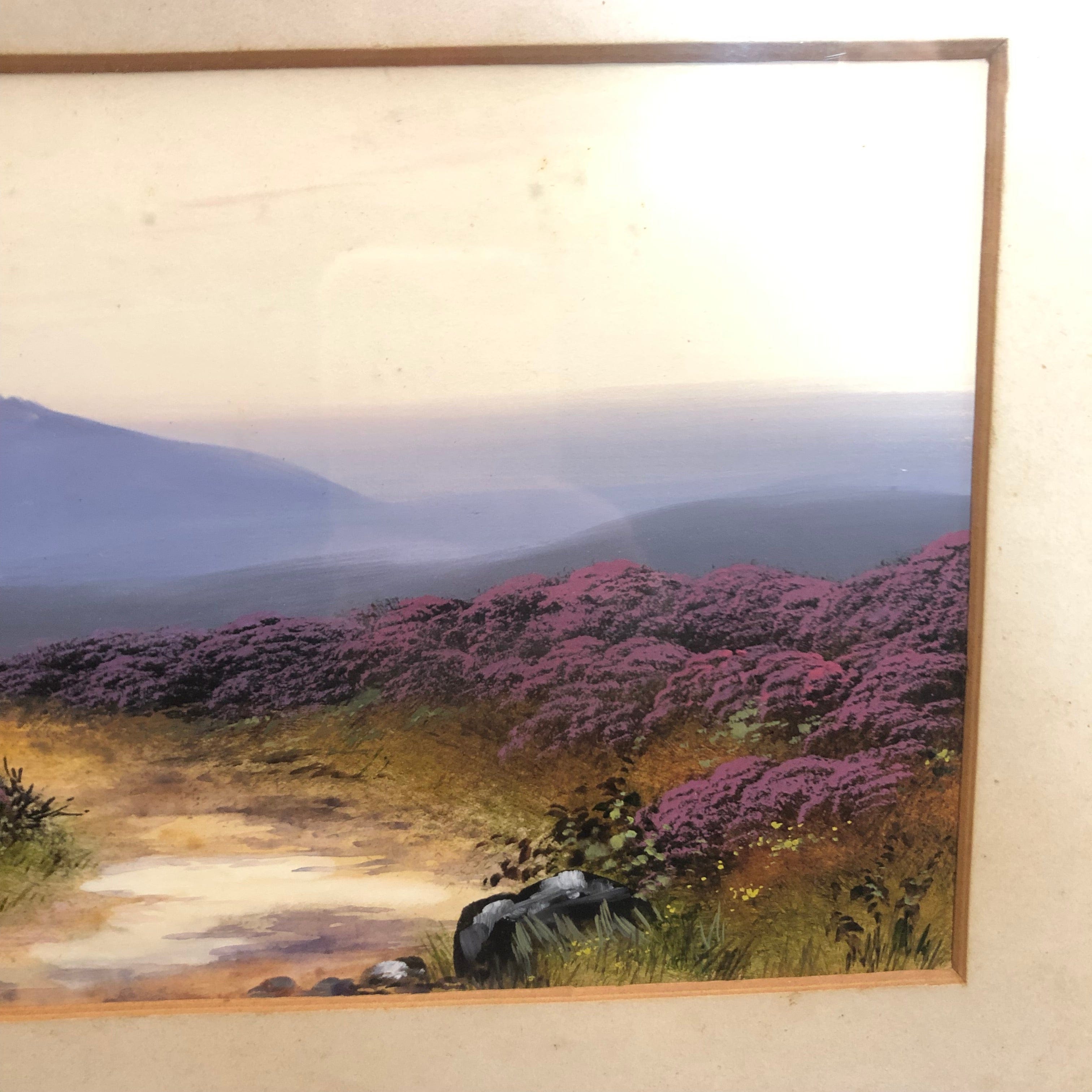Pintura de John Carlisle (1866-1916) pintor inglés de paisajes. Acuarela y óleo se utilizaron para retratar un paisaje de flores moradas con montañas de fondo.