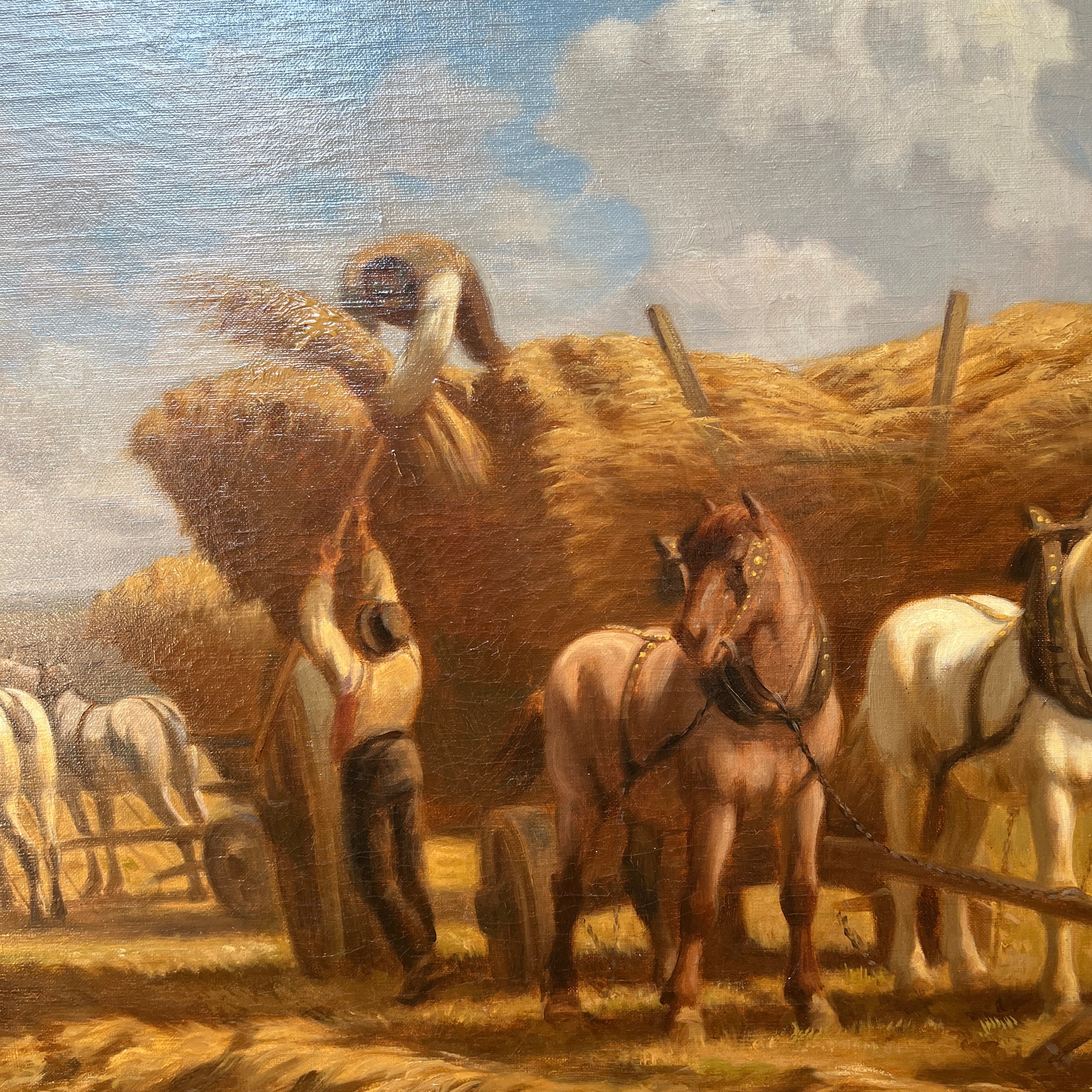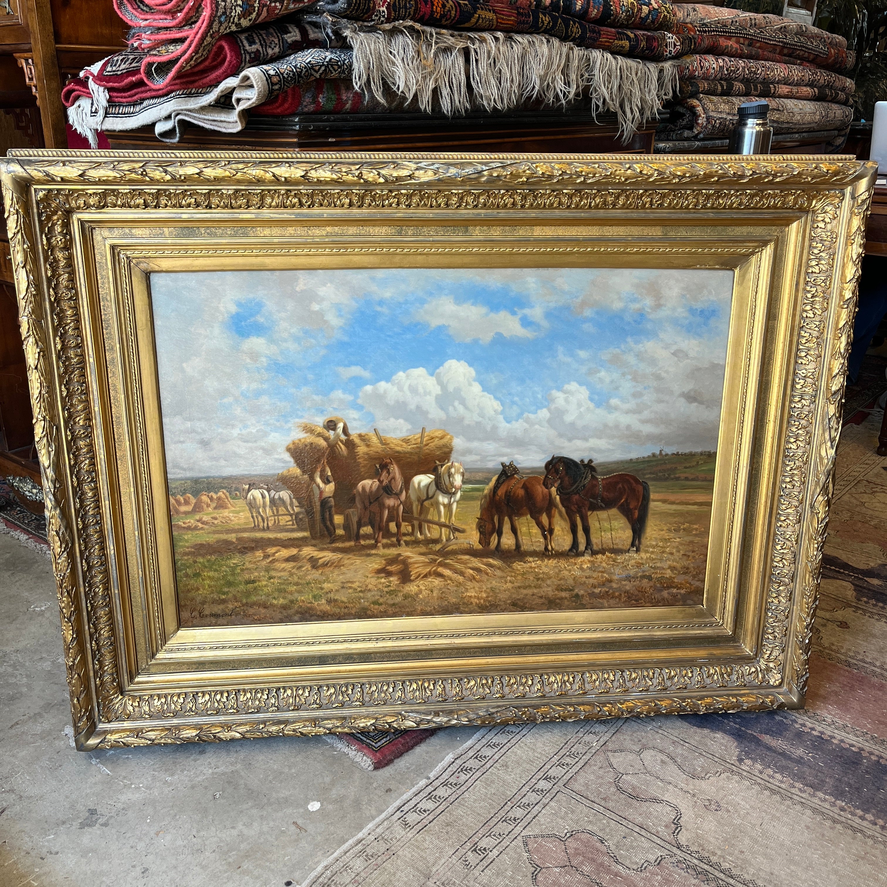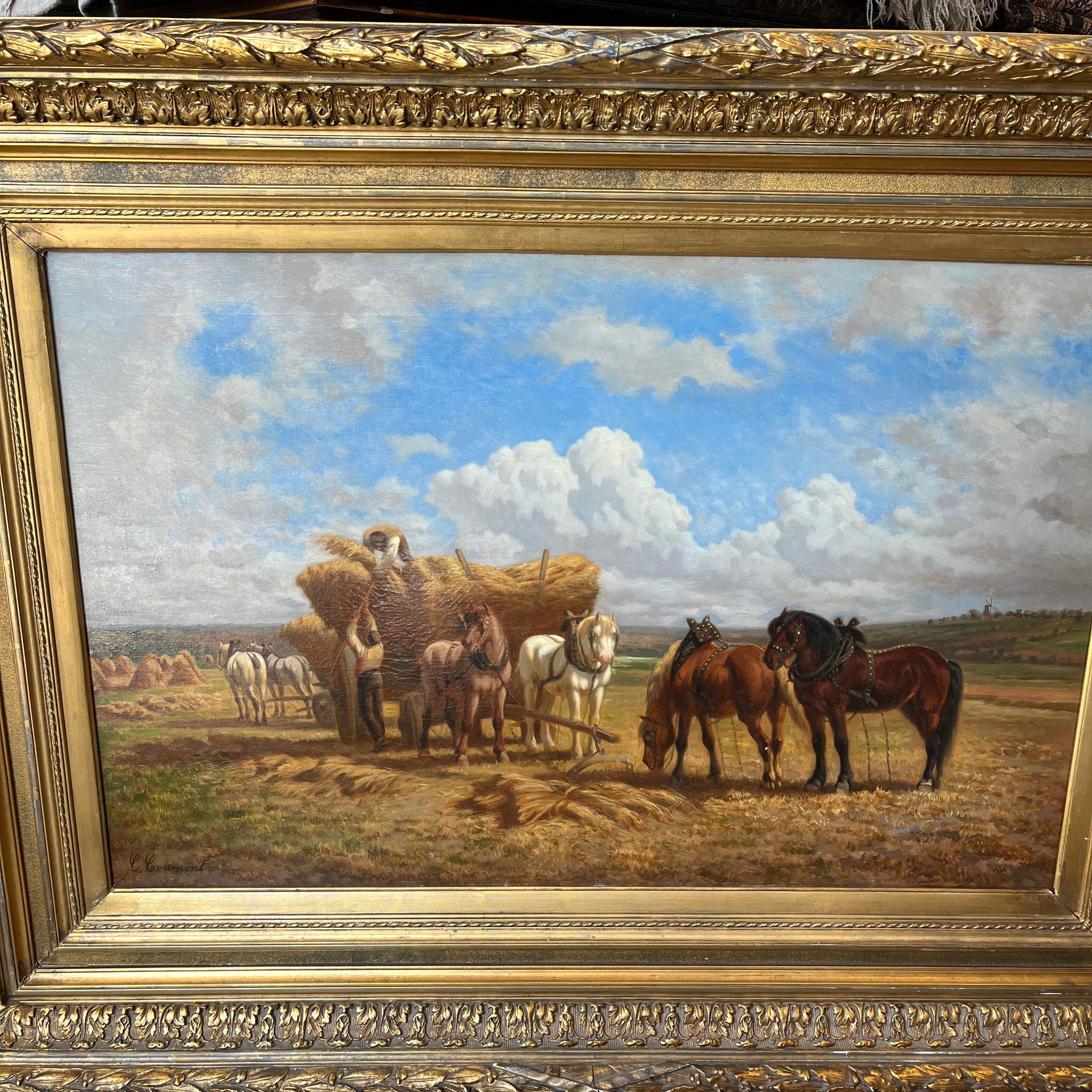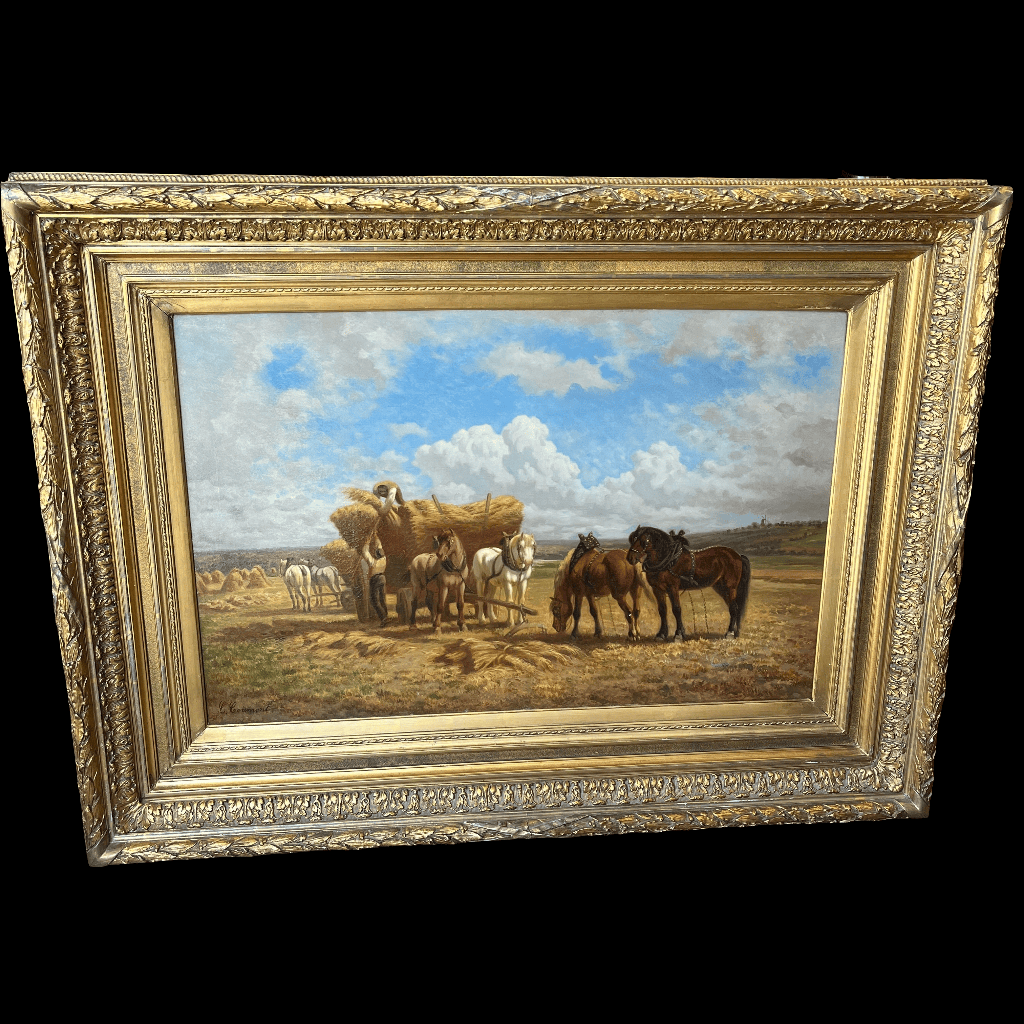 Óleo sobre tela de Charles Coumont (1822-1889), pintor de origen belga, que retrata una escena rural bañada por la luz de una tarde calurosa. En primer plano, dos hombres cargan paja sobre una carreta tirada por dos caballos, en pleno esfuerzo agrícola. Alrededor, se distinguen cuatro caballos, integrados armónicamente en un paisaje seco, salpicado de cerros al fondo. El cielo, cubierto de nubes meticulosamente detalladas, aporta profundidad y dinamismo a esta composición que capta con maestría la esencia del trabajo en el campo.