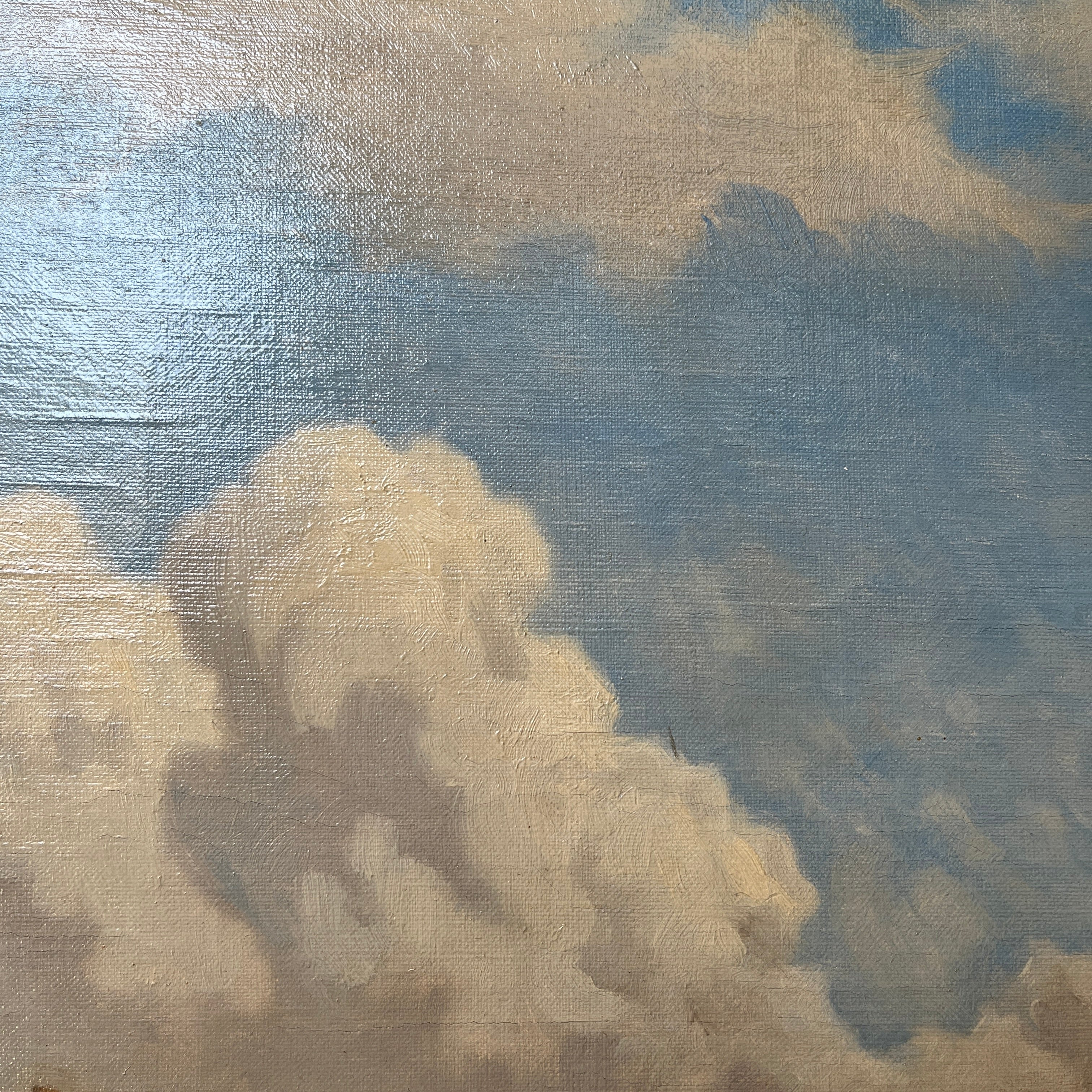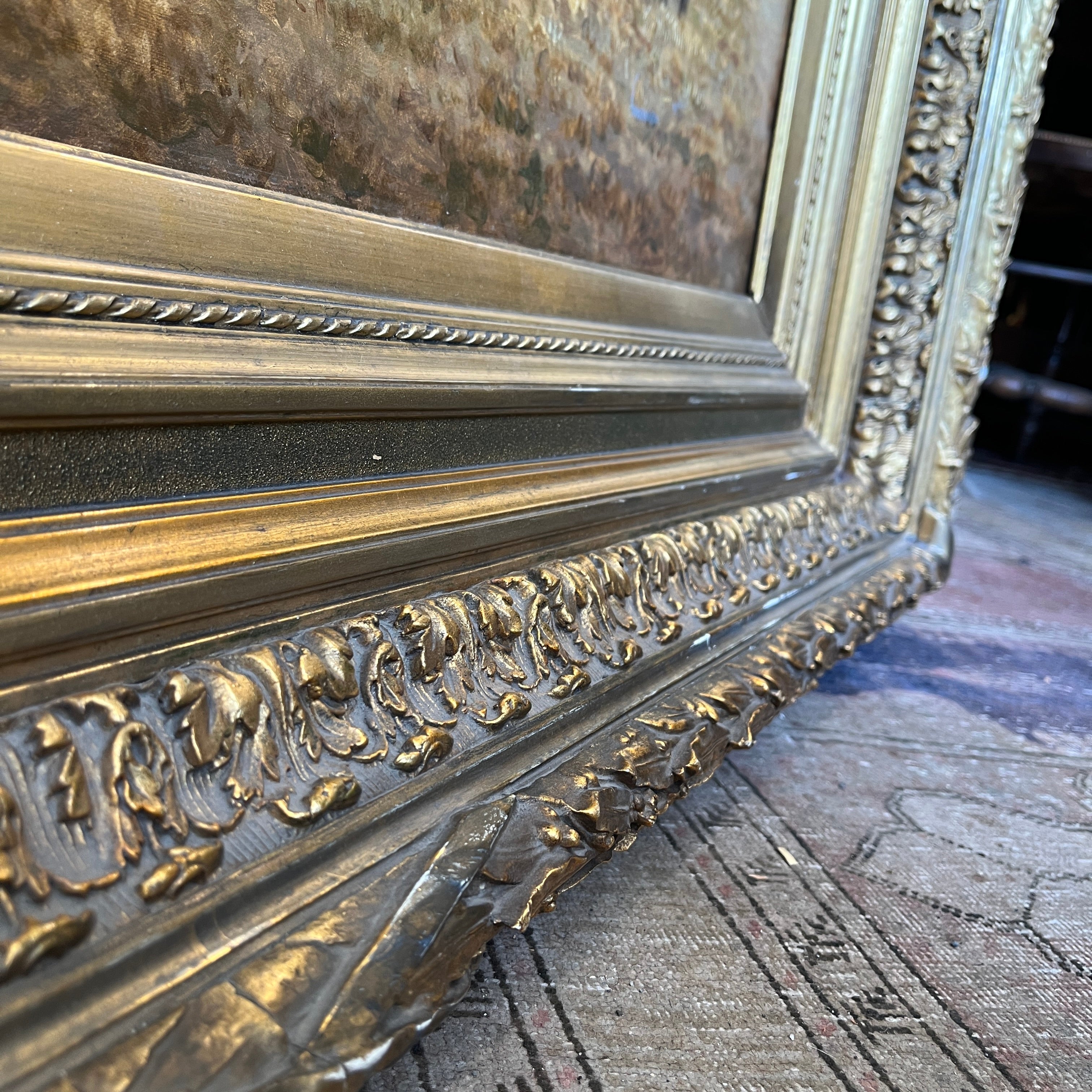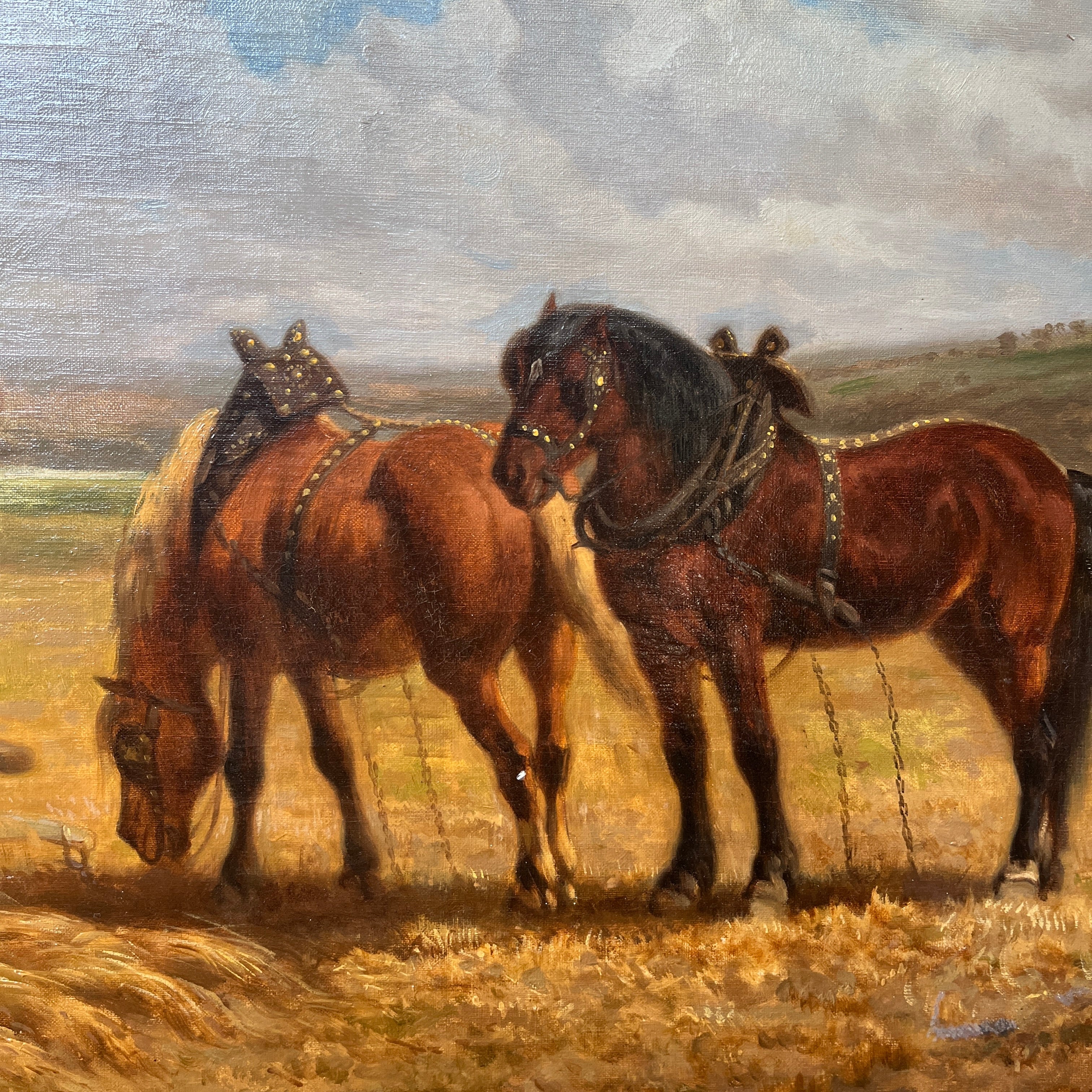 Óleo sobre tela de Charles Coumont (1822-1889), pintor de origen belga, que retrata una escena rural bañada por la luz de una tarde calurosa. En primer plano, dos hombres cargan paja sobre una carreta tirada por dos caballos, en pleno esfuerzo agrícola. Alrededor, se distinguen cuatro caballos, integrados armónicamente en un paisaje seco, salpicado de cerros al fondo. El cielo, cubierto de nubes meticulosamente detalladas, aporta profundidad y dinamismo a esta composición que capta con maestría la esencia del trabajo en el campo.