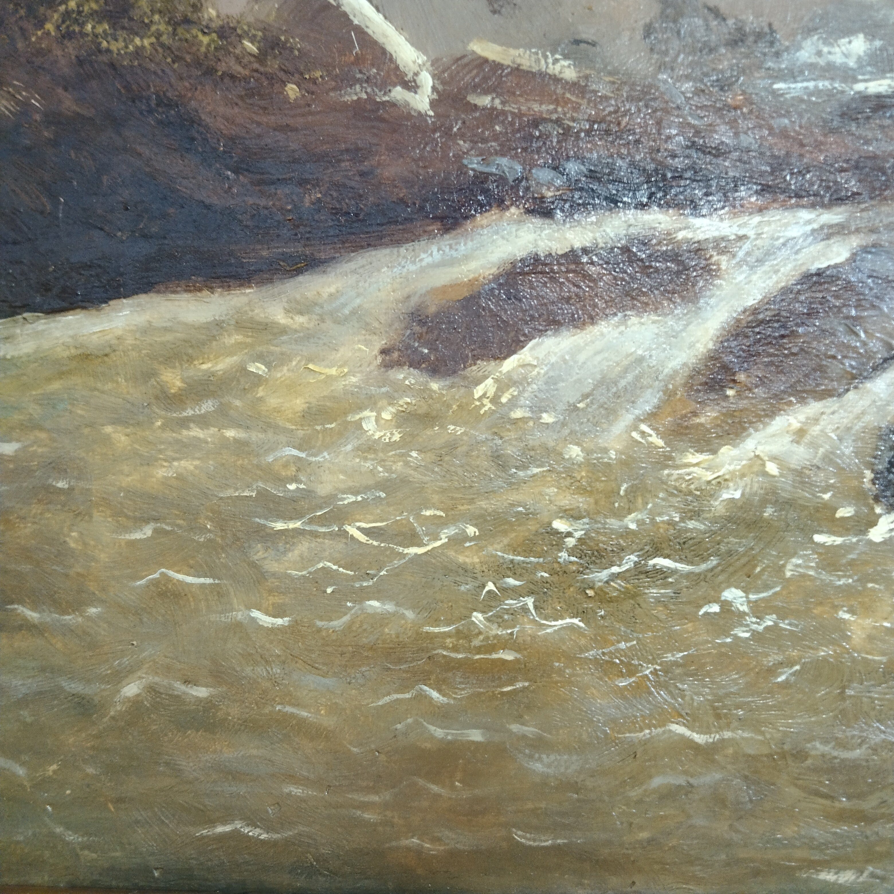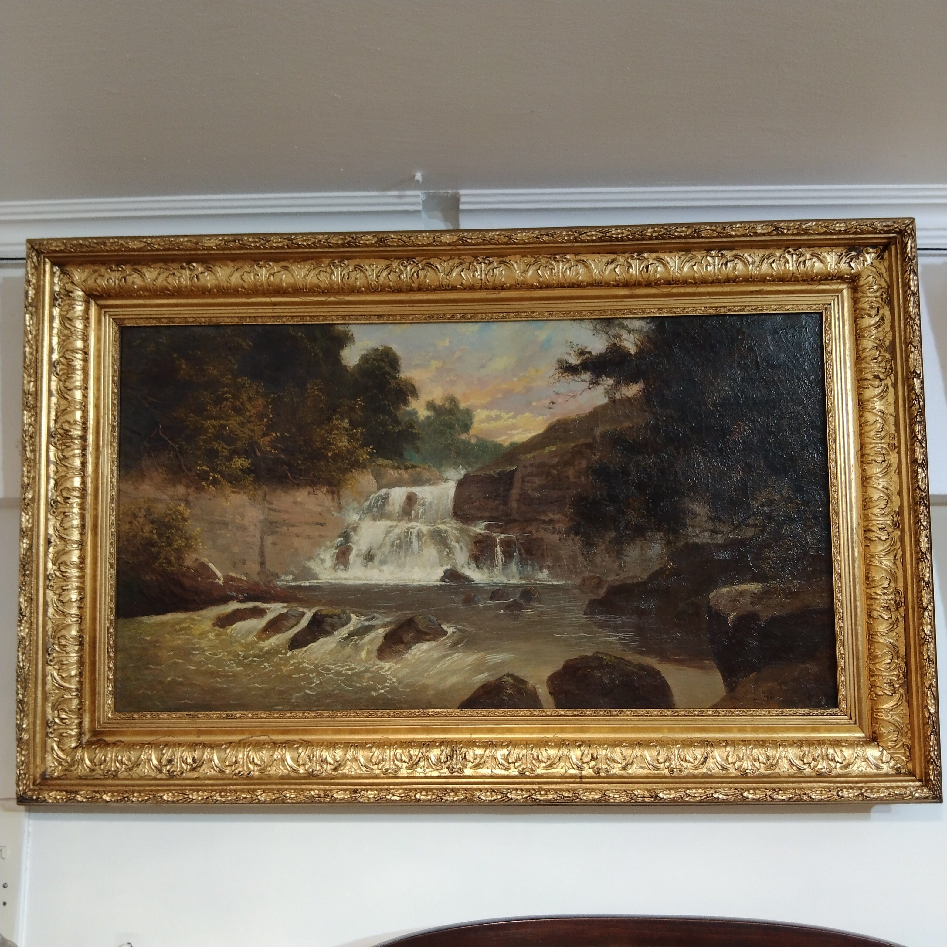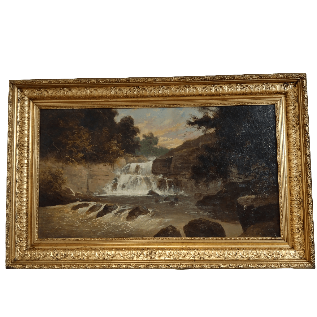 Óleo sobre tela, de origen inglés, firmado B. Joel 89', representando un paisaje con un río y una cascada, detalladamente pintados, mostrando las distintas texturas del agua corriendo y su choque en las piedritas, propio de la escuela inglesa de pintores llamados "De Rio". La obra esá enmarcada en madera tallada con bellos relieves decorados y pintada en dorado.