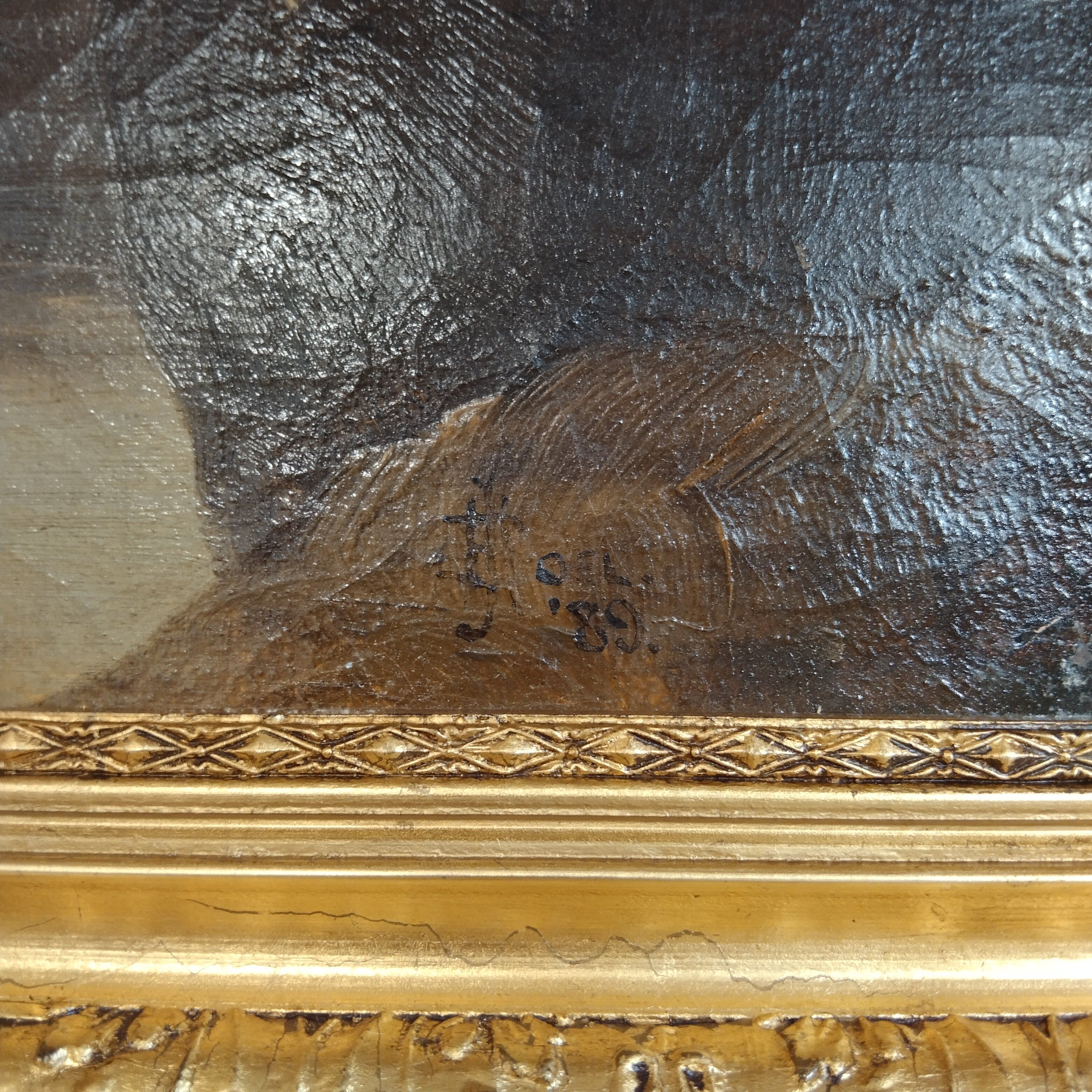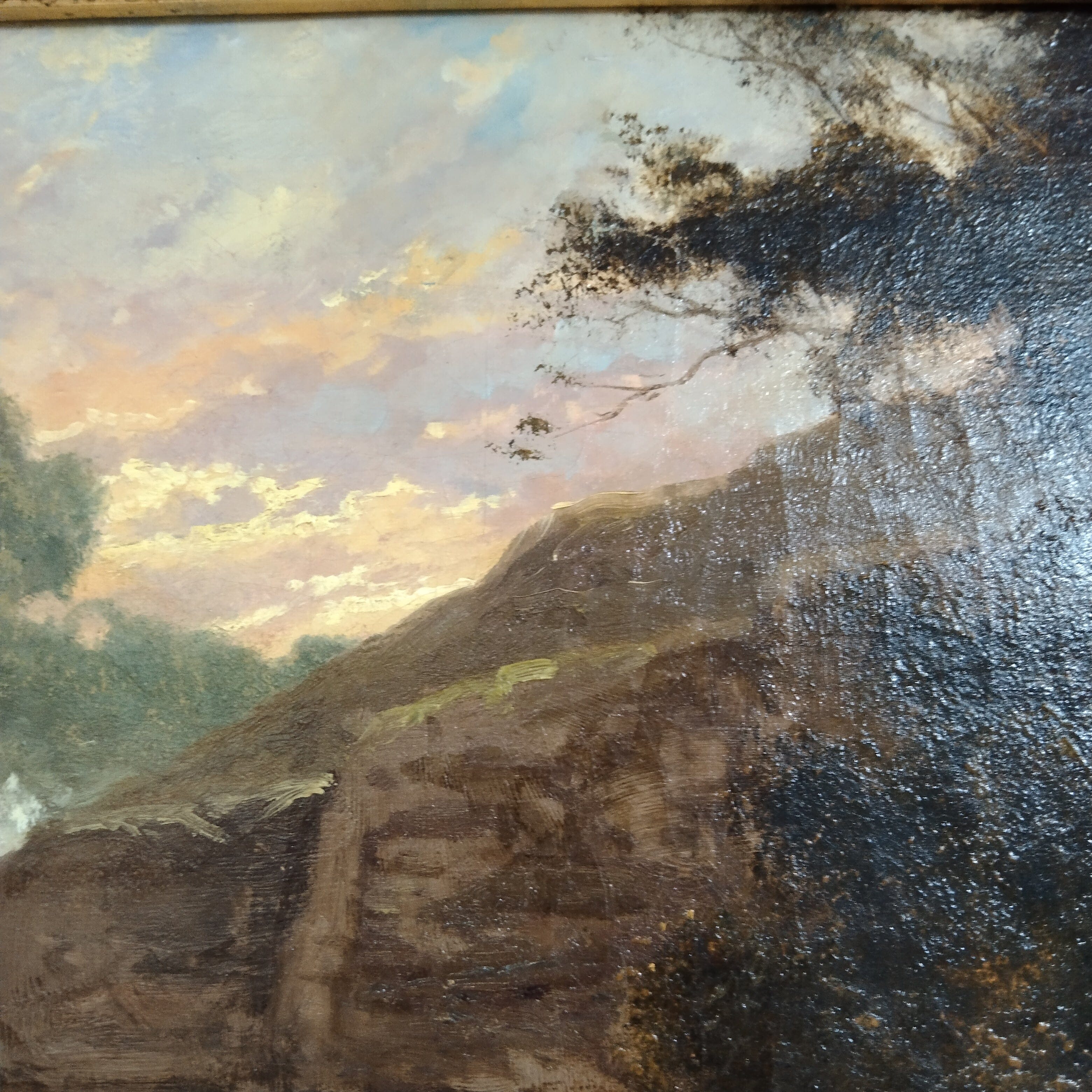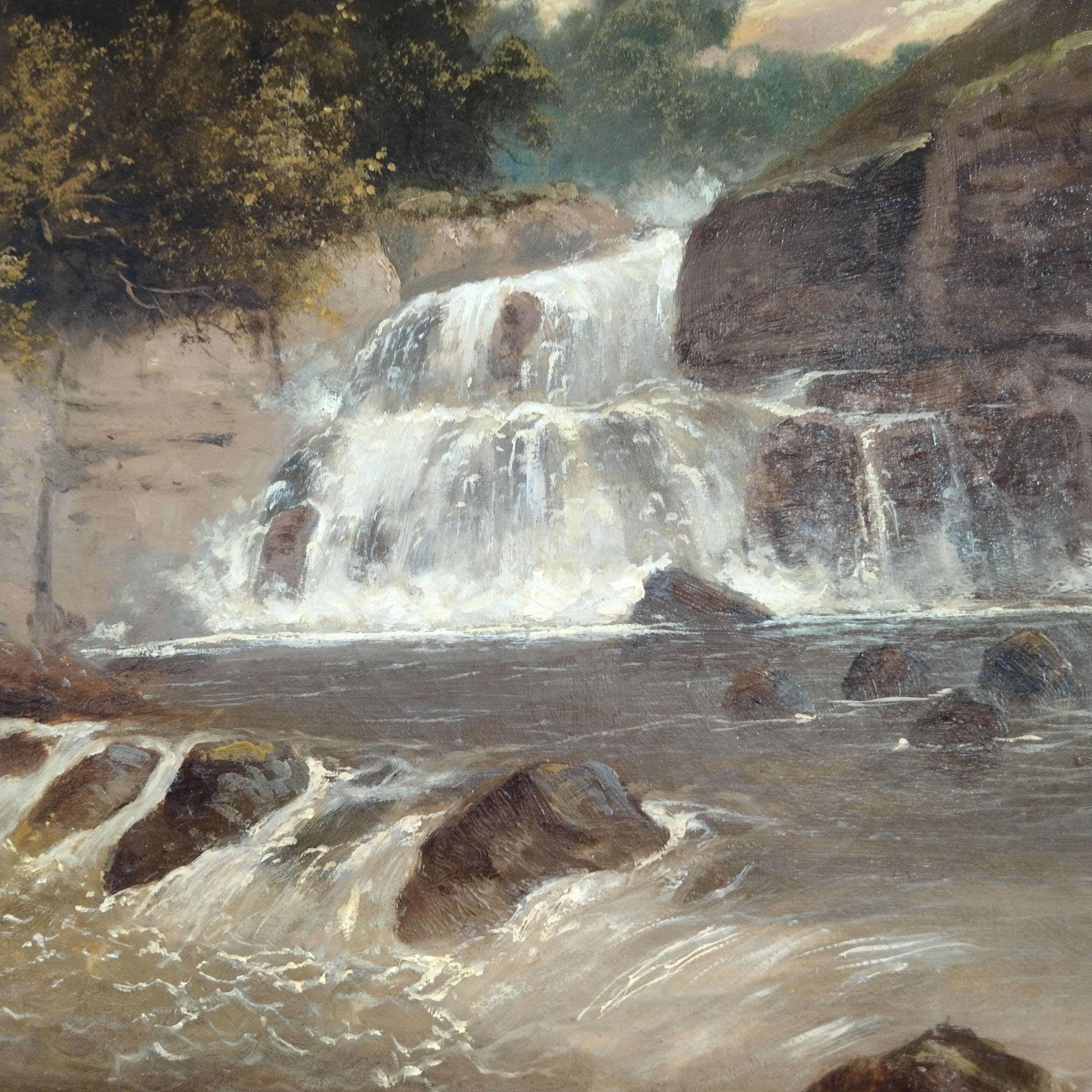 Óleo sobre tela, de origen inglés, firmado B. Joel 89', representando un paisaje con un río y una cascada, detalladamente pintados, mostrando las distintas texturas del agua corriendo y su choque en las piedritas, propio de la escuela inglesa de pintores llamados "De Rio". La obra esá enmarcada en madera tallada con bellos relieves decorados y pintada en dorado.