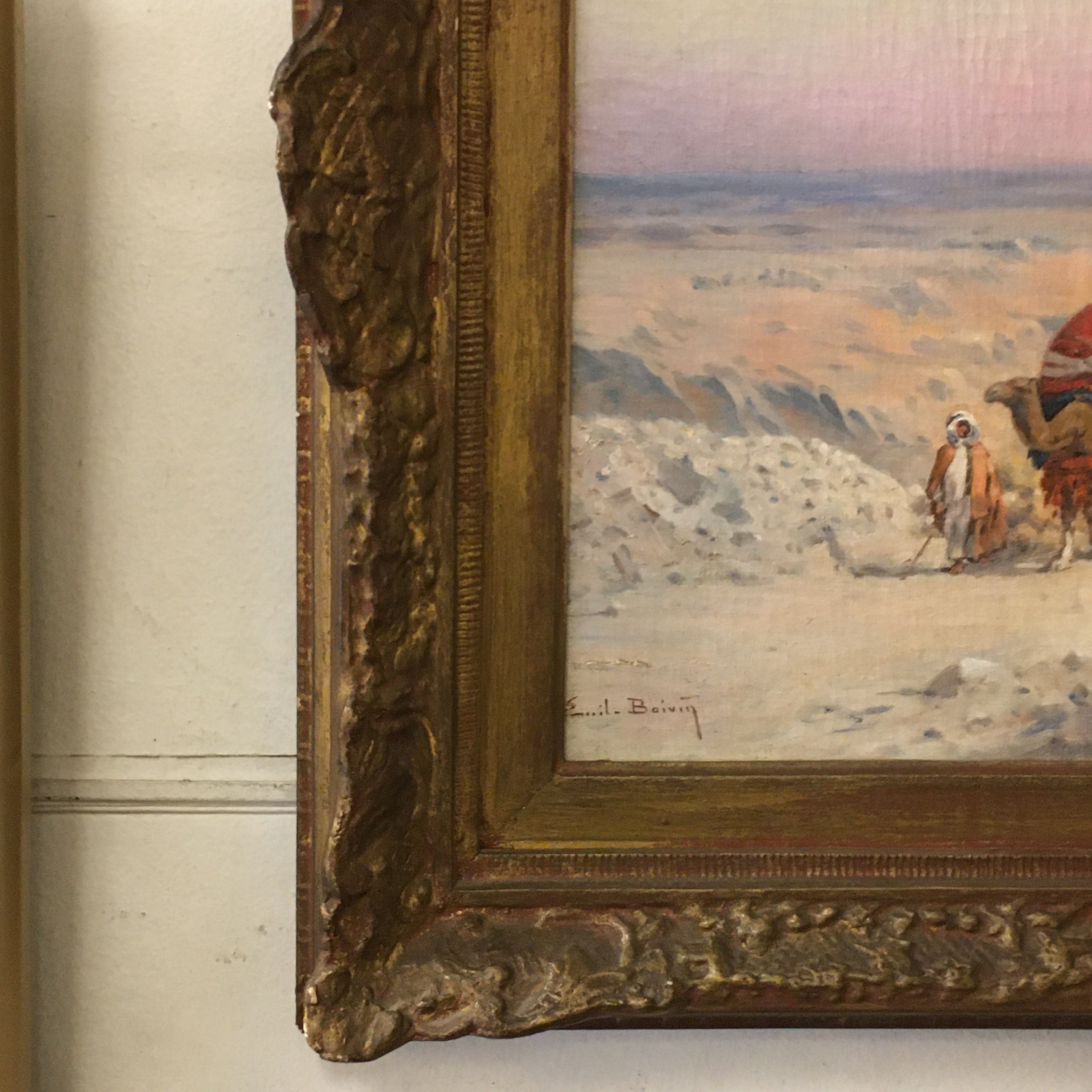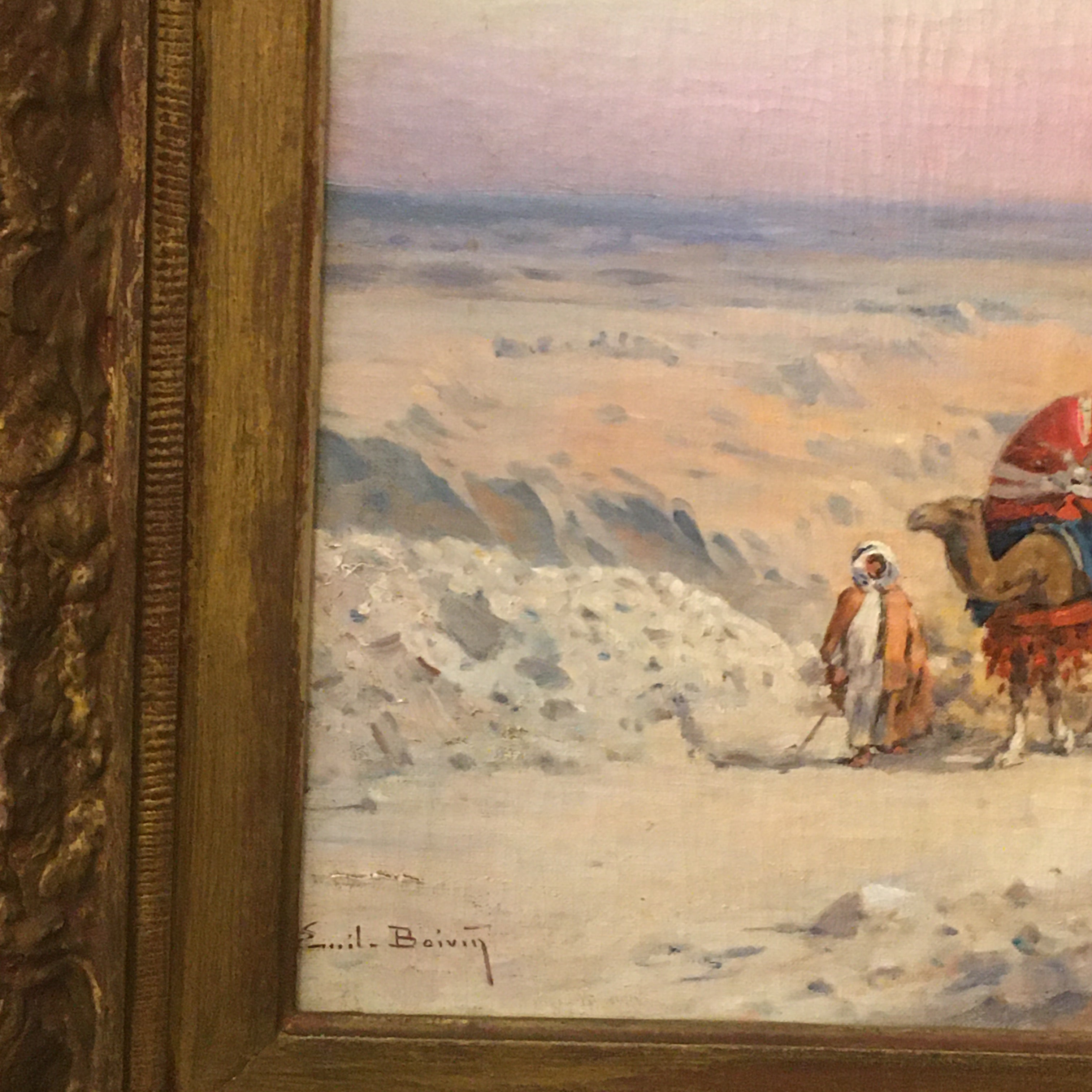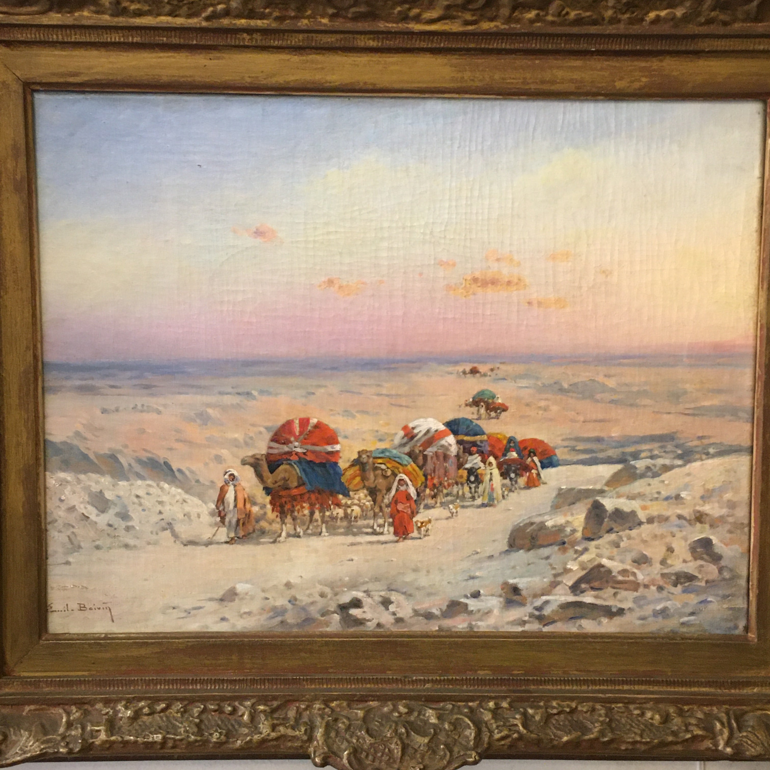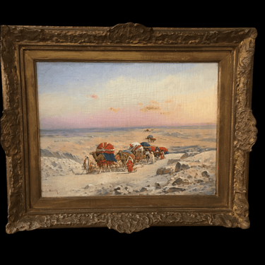 Óleo sobre tela, de origen europeo, del artista Emile Boivin (1846-1920), artista francés conocido por sus pinturas de escena y paisajes de medio oriente. La obra representa una escena de un desierto, por el que viaja una caravana nómada, cargando todas sus pertenencias sobre sus camellos. La obra captura bellamente los colores del cielo, en tono azul y rosa, sugiriendo un atardecer. Destacan también los llamativos colores de las telas que visten a la tribu y sus cargas, sobre la arena blanca del desierto. La obra tiene un marco de madera tallada de decorados en relieves, terminado en un color dorado que acusa su antigüedad.