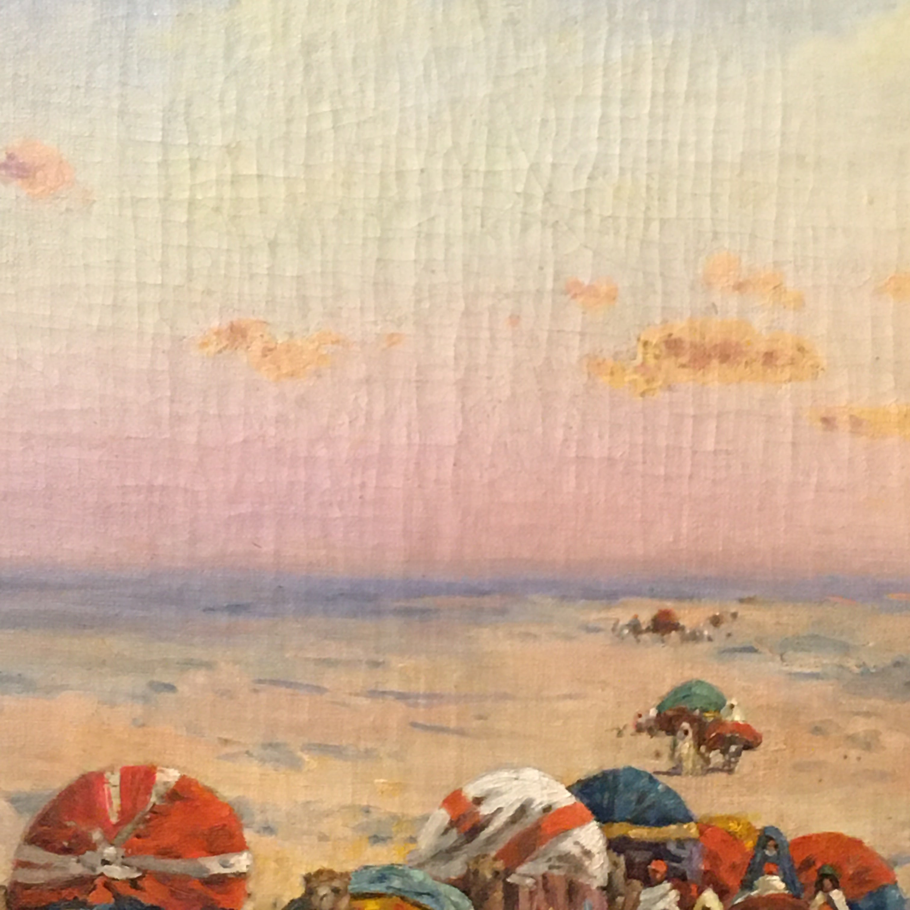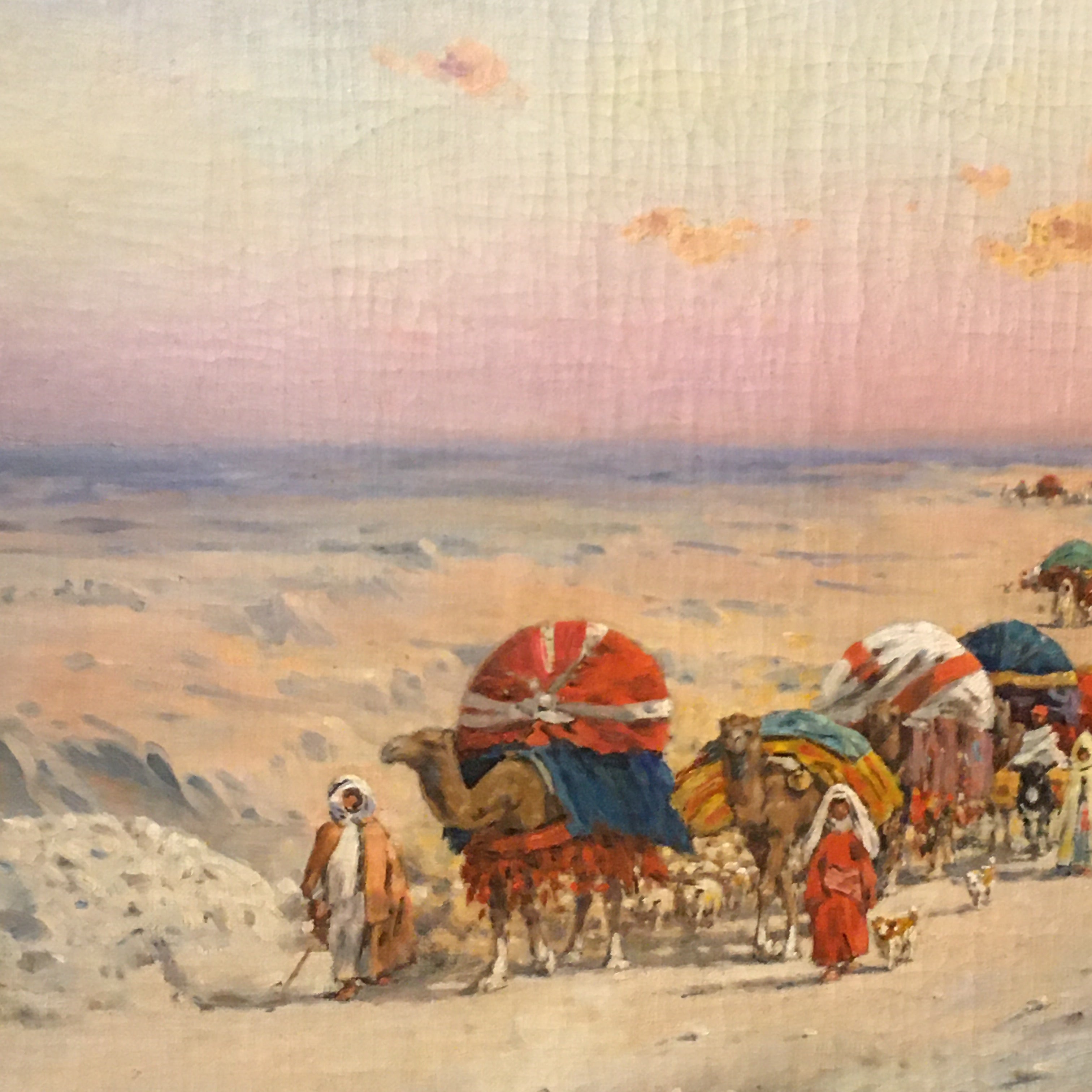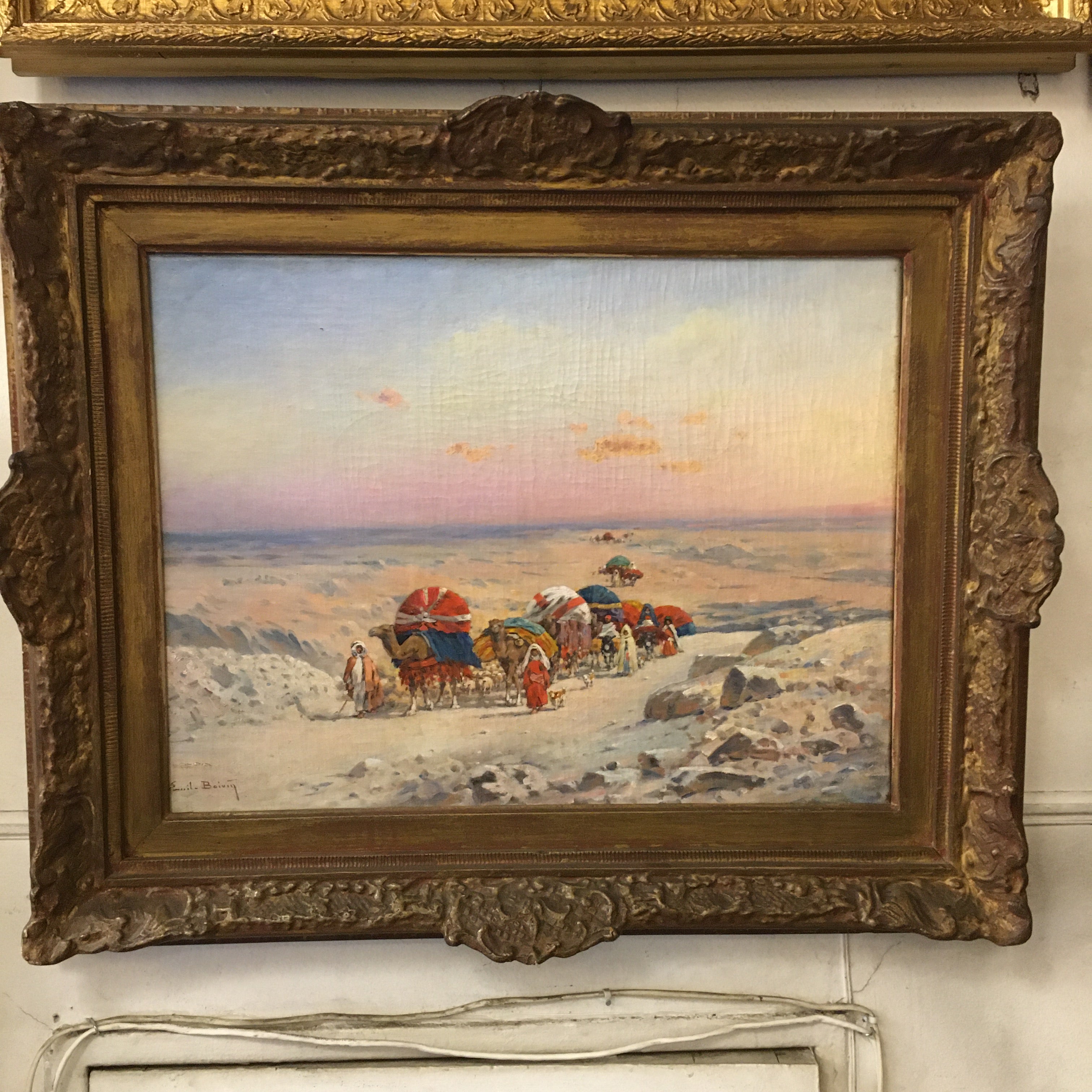 Óleo sobre tela, de origen europeo, del artista Emile Boivin (1846-1920), artista francés conocido por sus pinturas de escena y paisajes de medio oriente. La obra representa una escena de un desierto, por el que viaja una caravana nómada, cargando todas sus pertenencias sobre sus camellos. La obra captura bellamente los colores del cielo, en tono azul y rosa, sugiriendo un atardecer. Destacan también los llamativos colores de las telas que visten a la tribu y sus cargas, sobre la arena blanca del desierto. La obra tiene un marco de madera tallada de decorados en relieves, terminado en un color dorado que acusa su antigüedad.