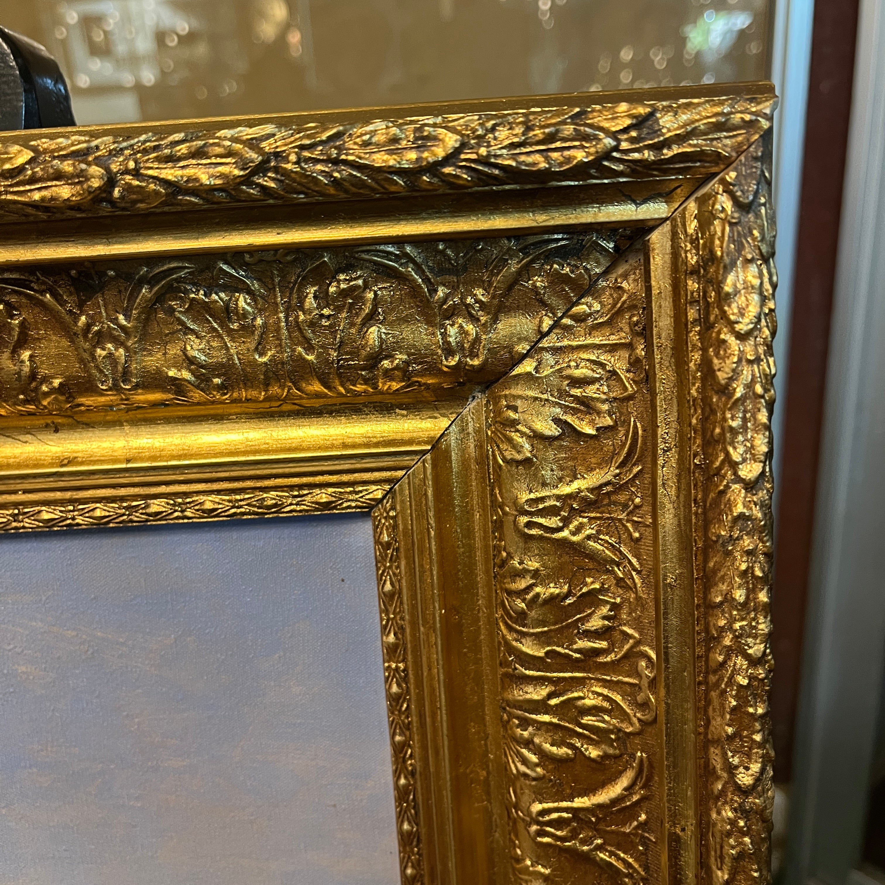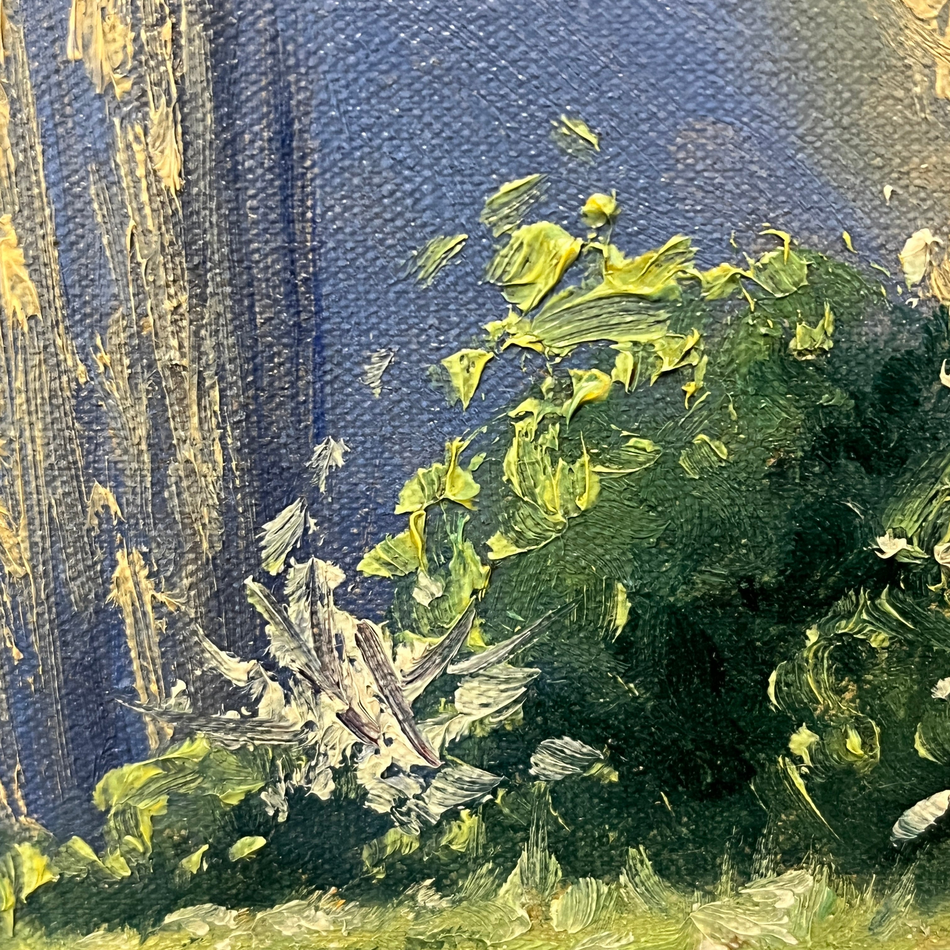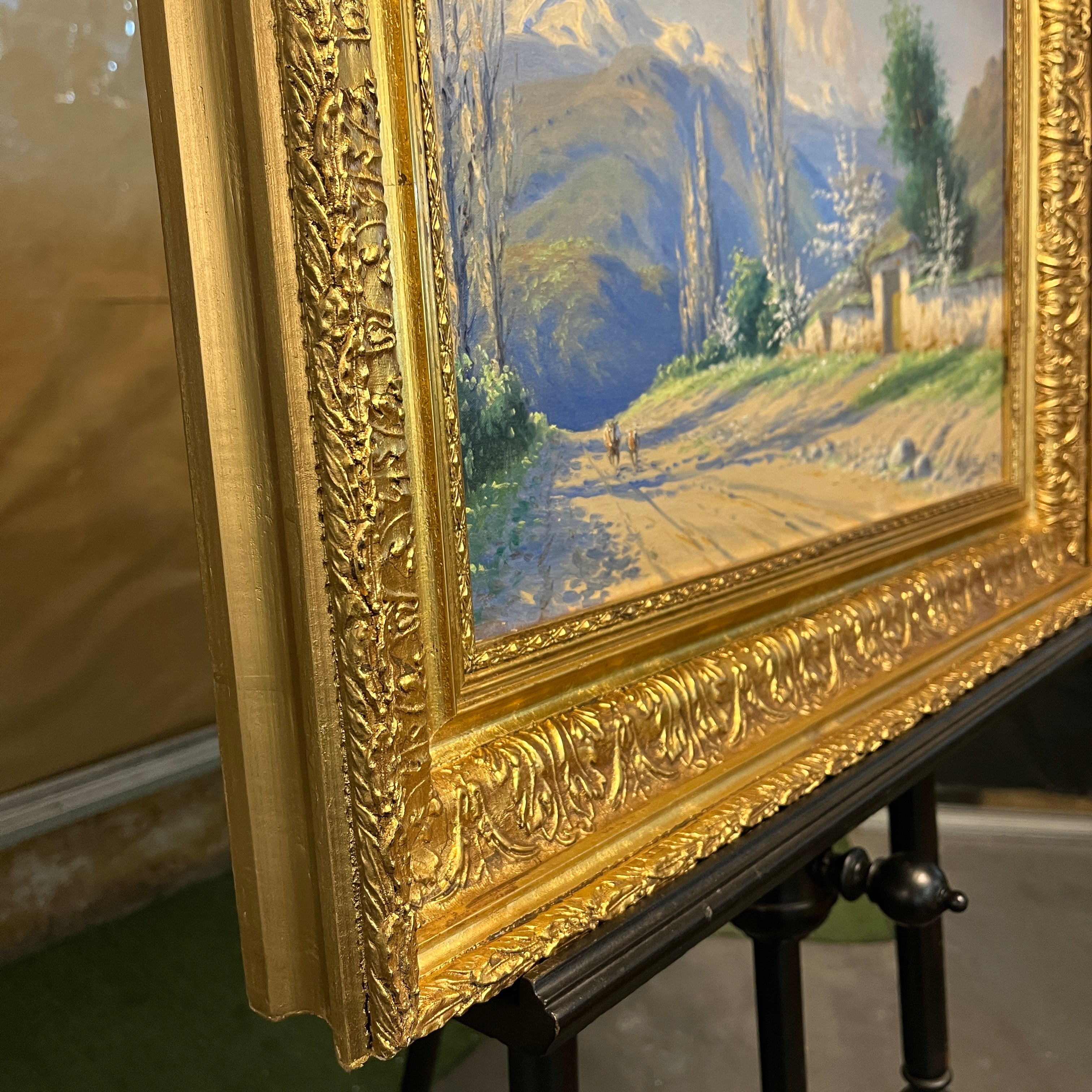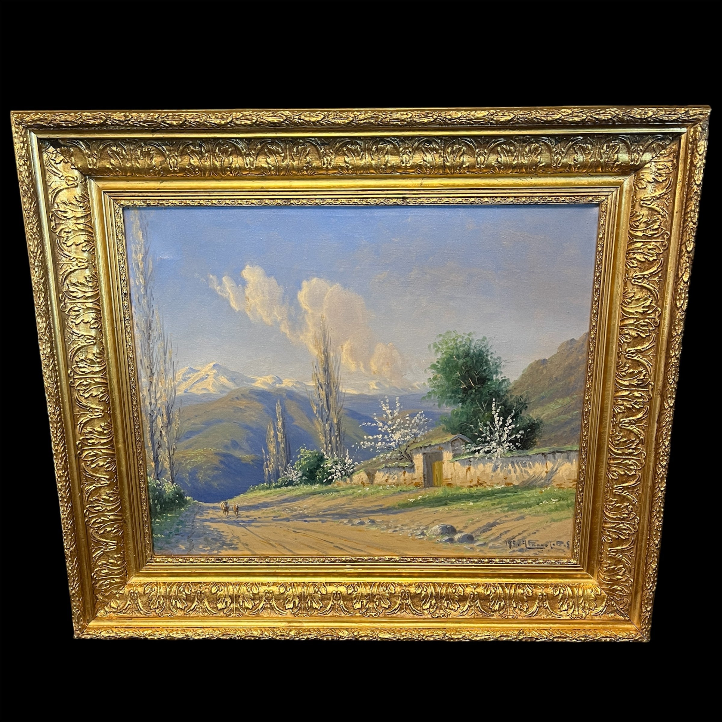 Óleo sobre tela del reconocido artista chileno Alfredo Lobos Alfaro, representando un paisaje del valle central, en el que dos perros atraviesan un camino rural, rodeado de bella vegetación y la entrada a una parcela, todo acompañado por la cordillera en el horizonte. La obra tiene un marco de madera dorada, tallada en bellos relieves.