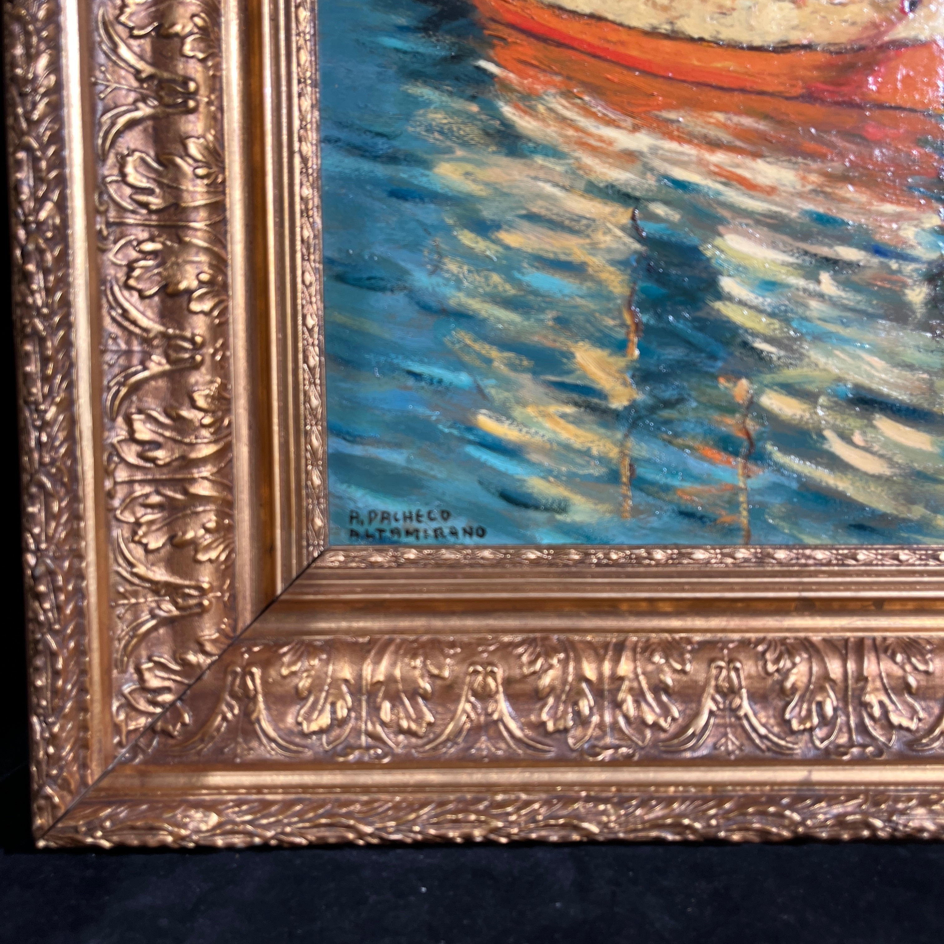 Hermoso óleo del talentoso pintor chileno Pacheco Altamirano (1905-1978) nos presenta tres veleros y dos botes aparcados en el mar, algunos con tripulantes y otros vacíos. En el horizonte se aprecia una ciudad. La obra destaca por sus colores y el característico trazo marcado de Altamirano.