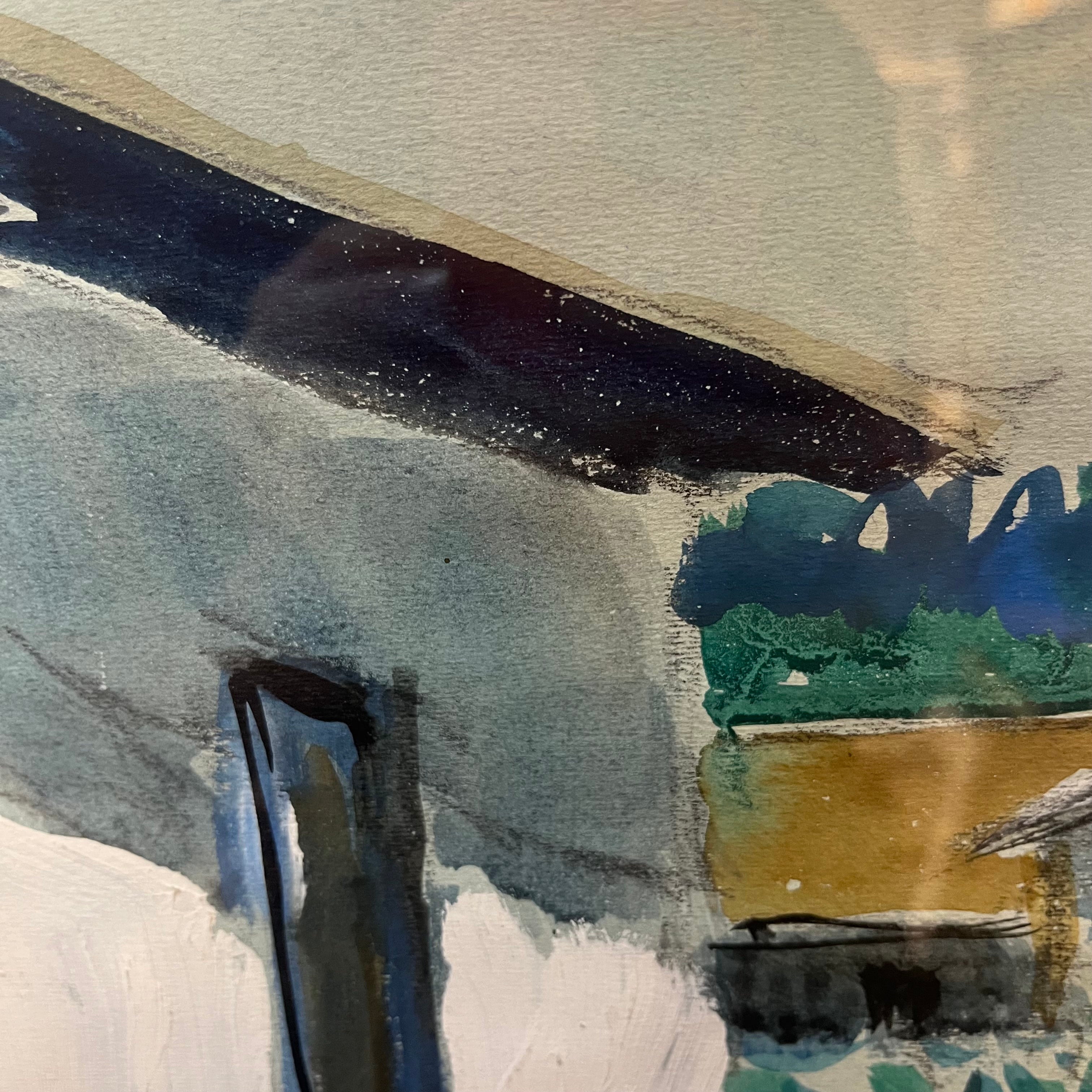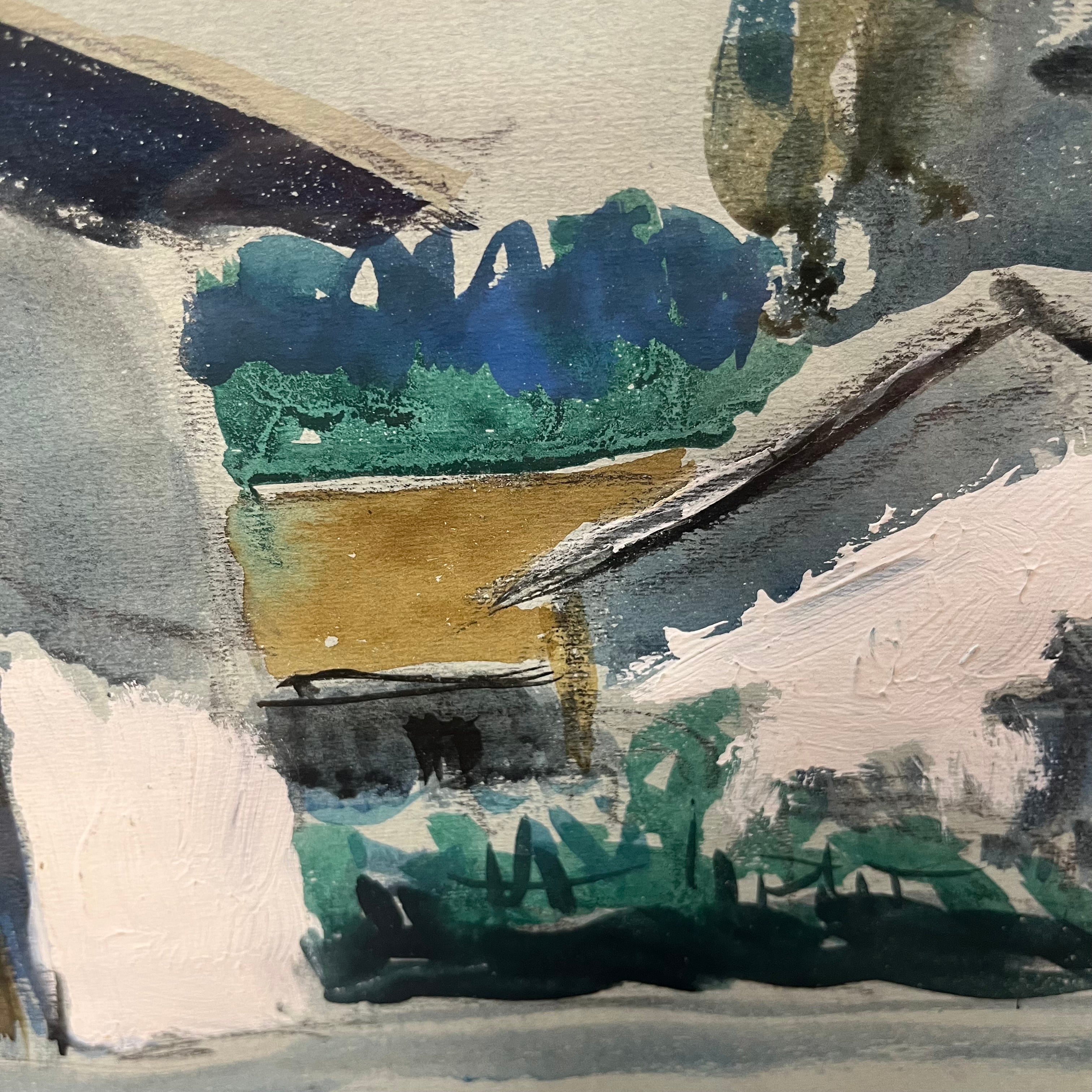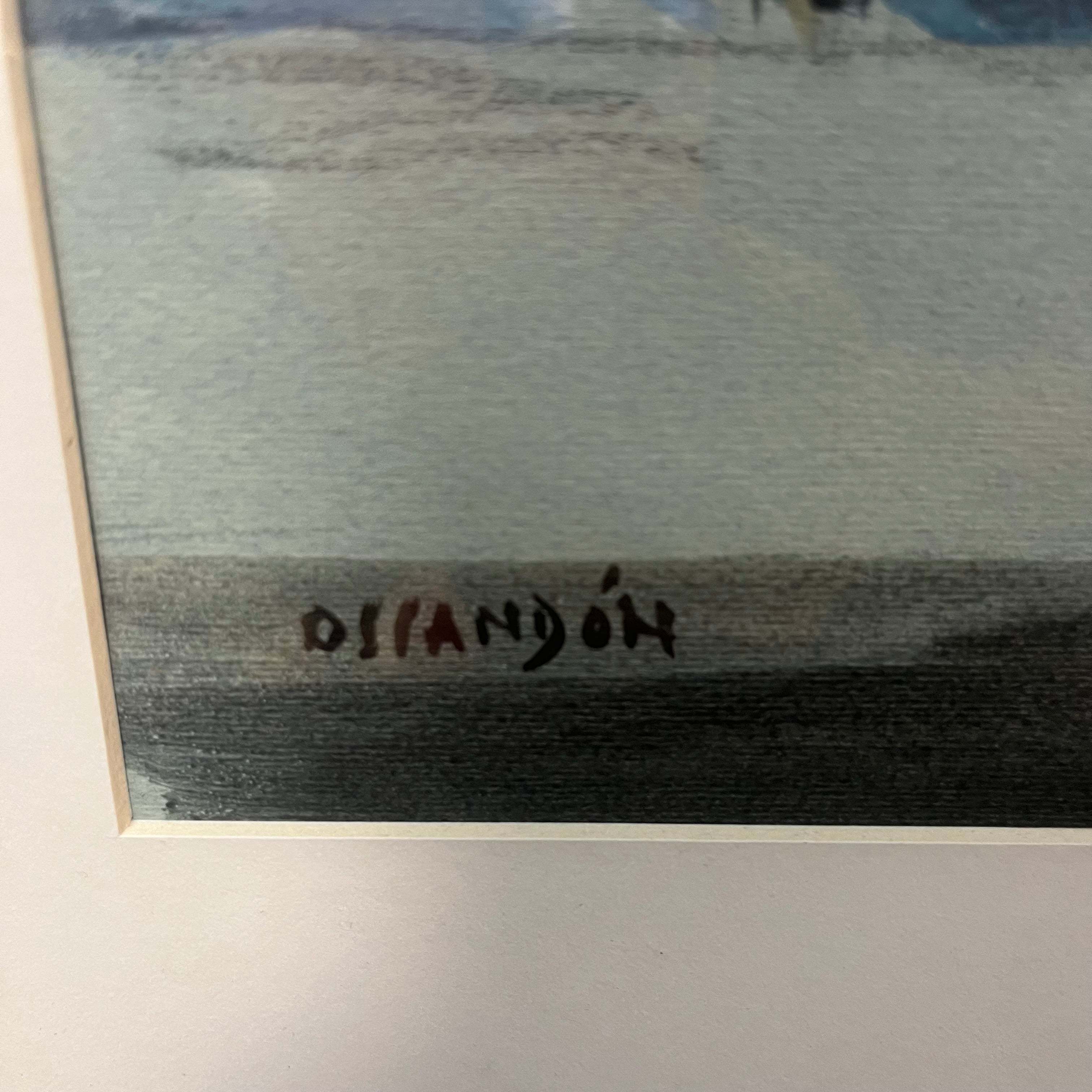 Técnica mixta del pintor chileno Eduardo Ossandón, representando una fachada rural, con una casa blanca, un gran árbol que la acompaña y el horizonte de fondo. El artista utiliza tanto acuarela, medio por el que es más reconocido, como también óleo para resaltar el blanco de la casa, haciendo no solo un bello trabajo de luz y sombra, sino que también de texturas dentro de una paleta sobria. La obra tiene un marco de madera contemporánea en color dorado, complementando las tonalidades del cuadro.