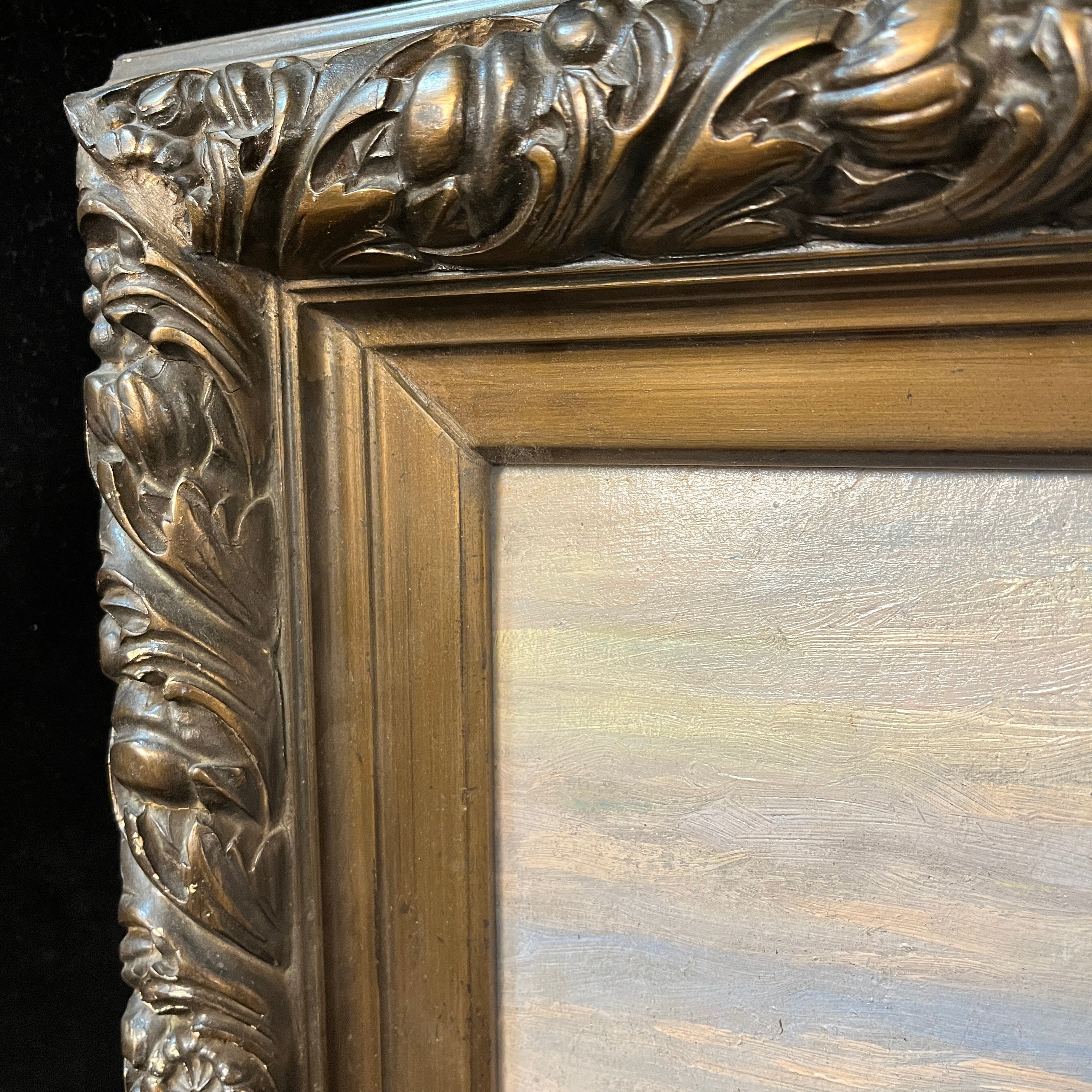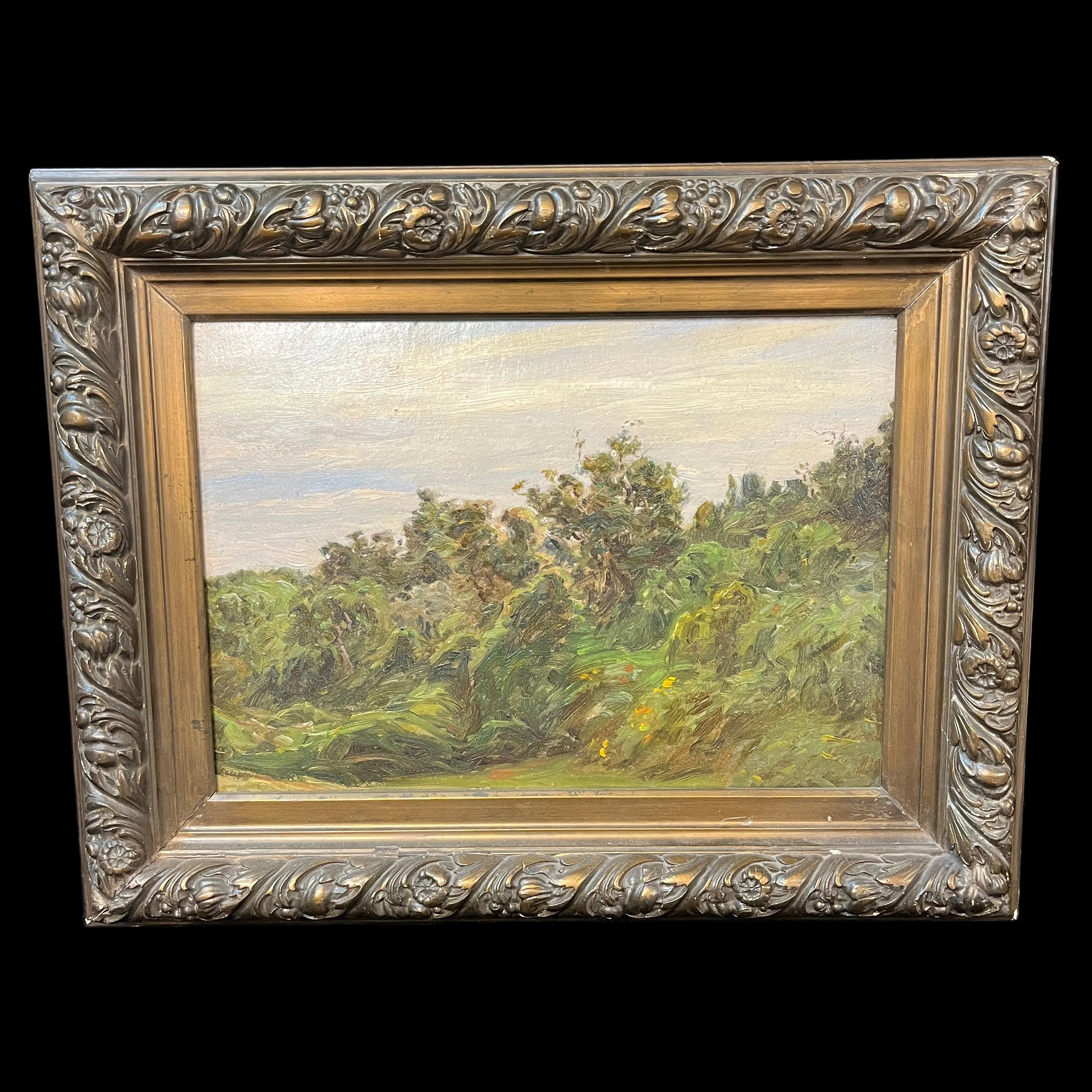 Óleo sobre tablilla de trupán atribuído al reconocido pintor chileno Onofre Jarpa (1849-1940), representando un paisaje de densos arbustos, con textura y movimiento. La Obra tiene un marco de madera tallada en relieves y terminada en dorado opaco, con una cenefa interior en dorado luminoso.