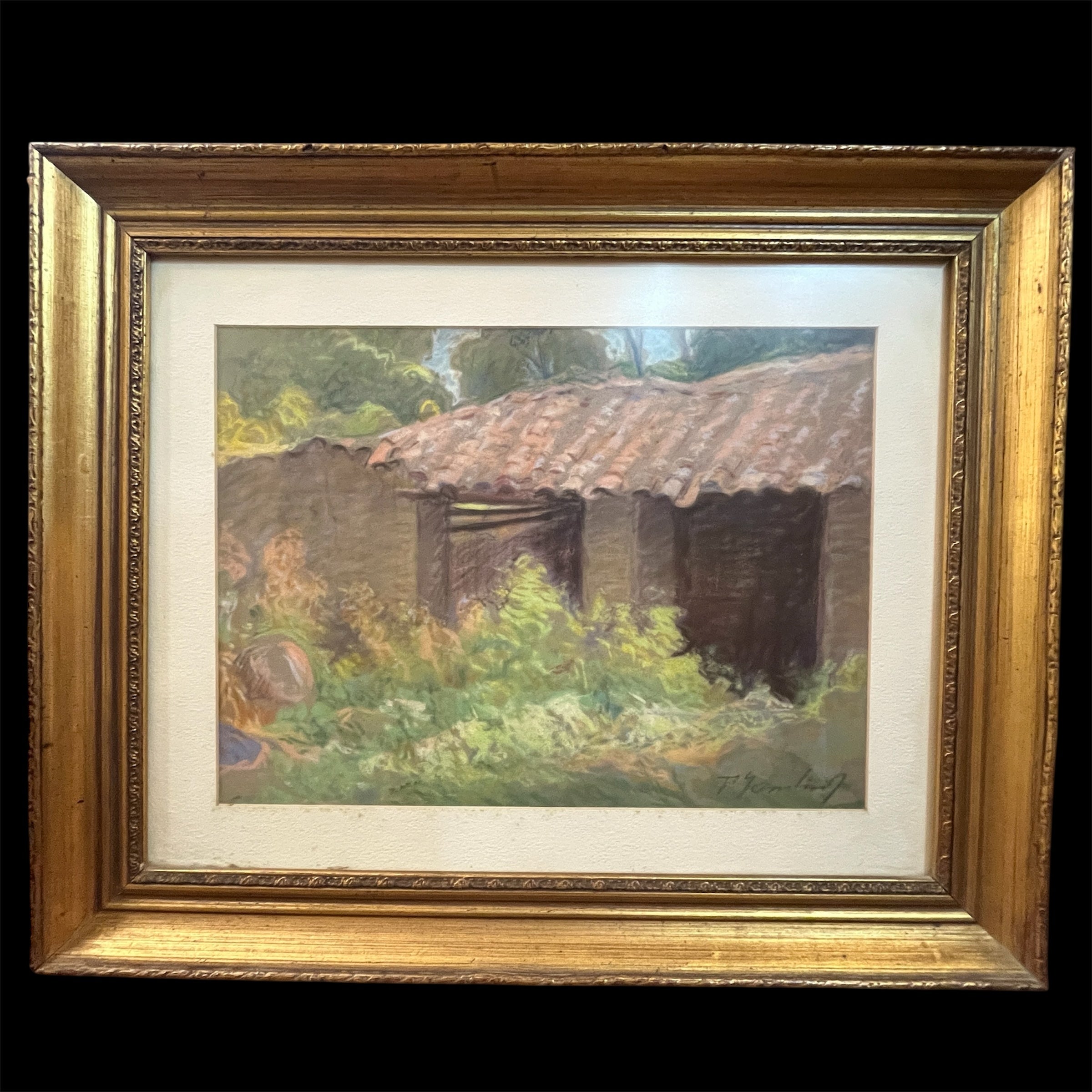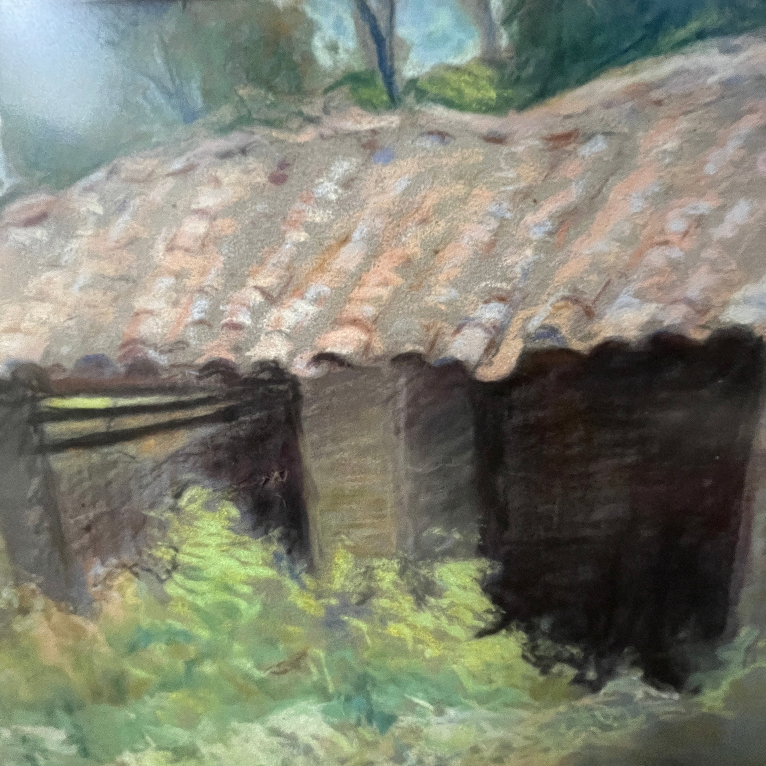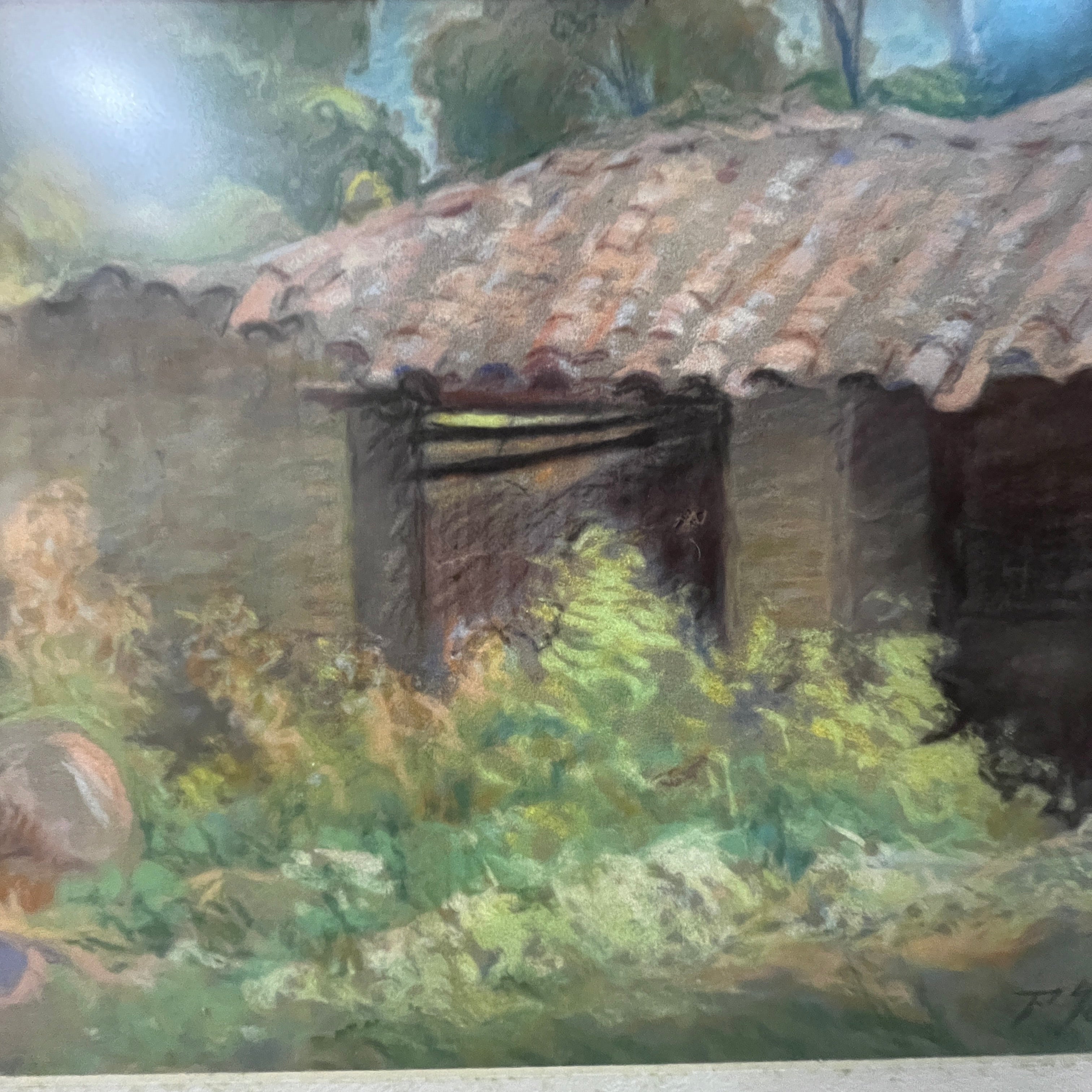 Preciosa obra en pastel del artista uruguayo-chileno Pascual Gambino que se sale de sus temáticas clásicas, retratos, desnudos y flores. Aquí vemos la fachada de lo que posiblemente es una caballeriza o bodega de un campo. Se observa un tejado desnivelado y descuidado, con vegetación y flores silvestres de gran altura que entregan a la escena una belleza especial al abandono.