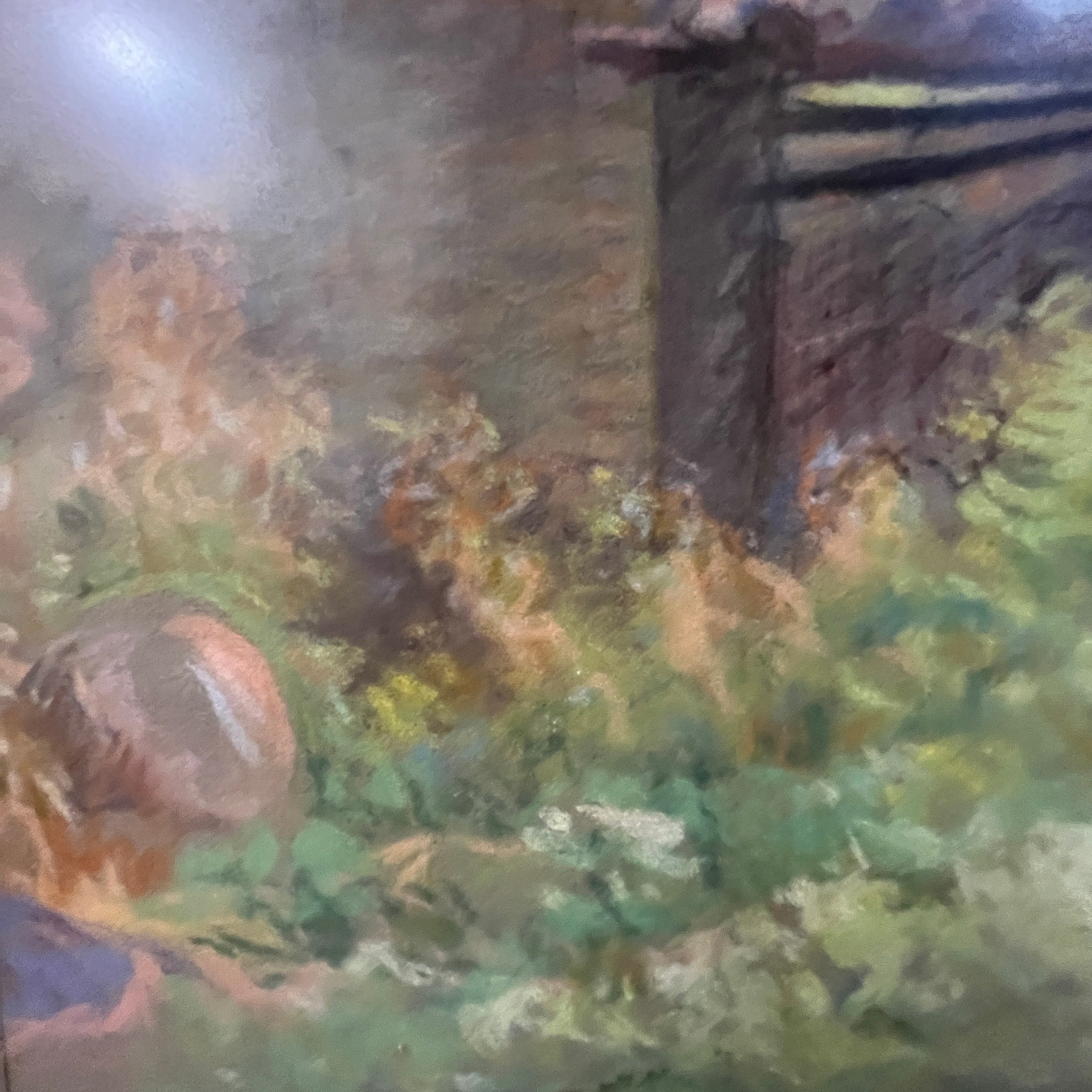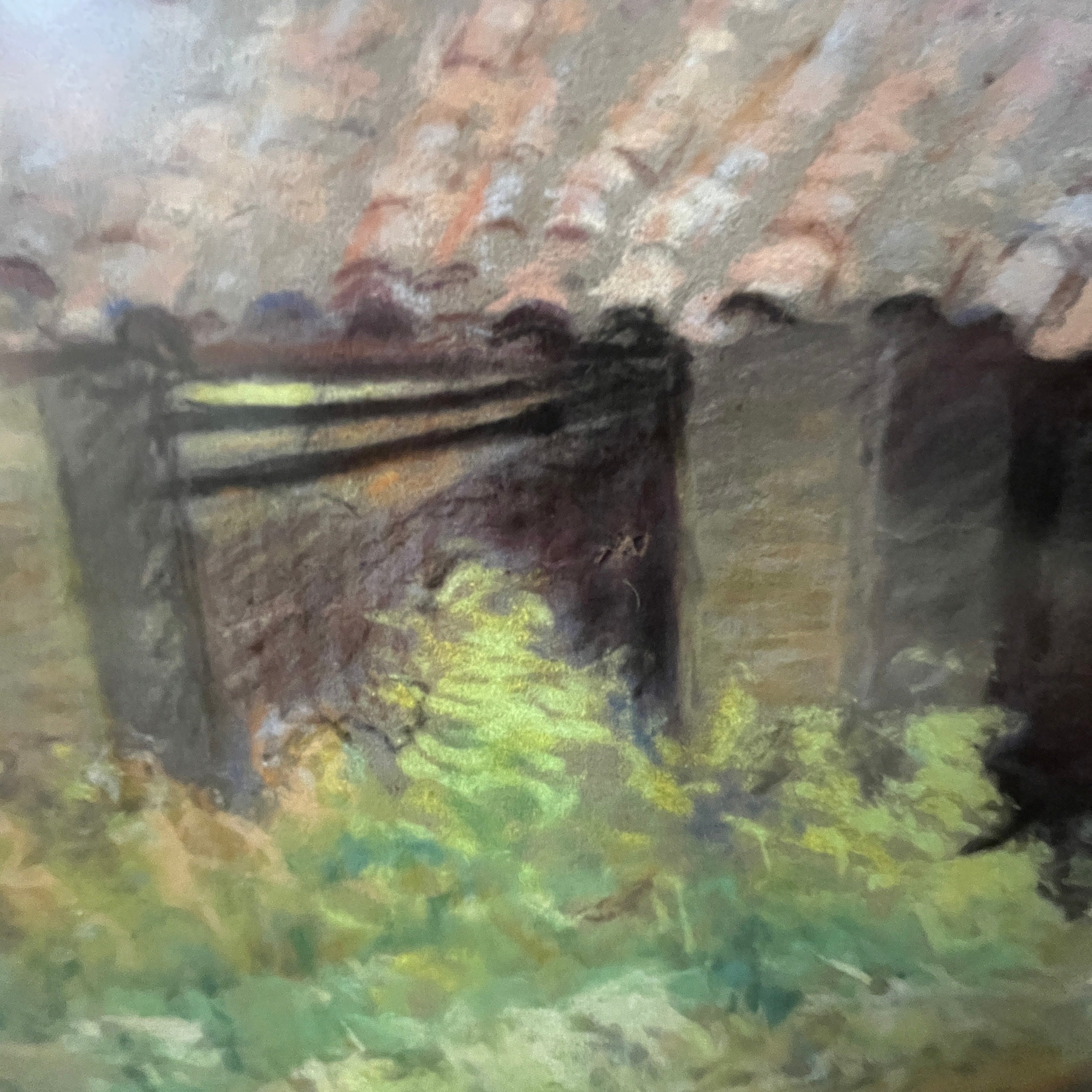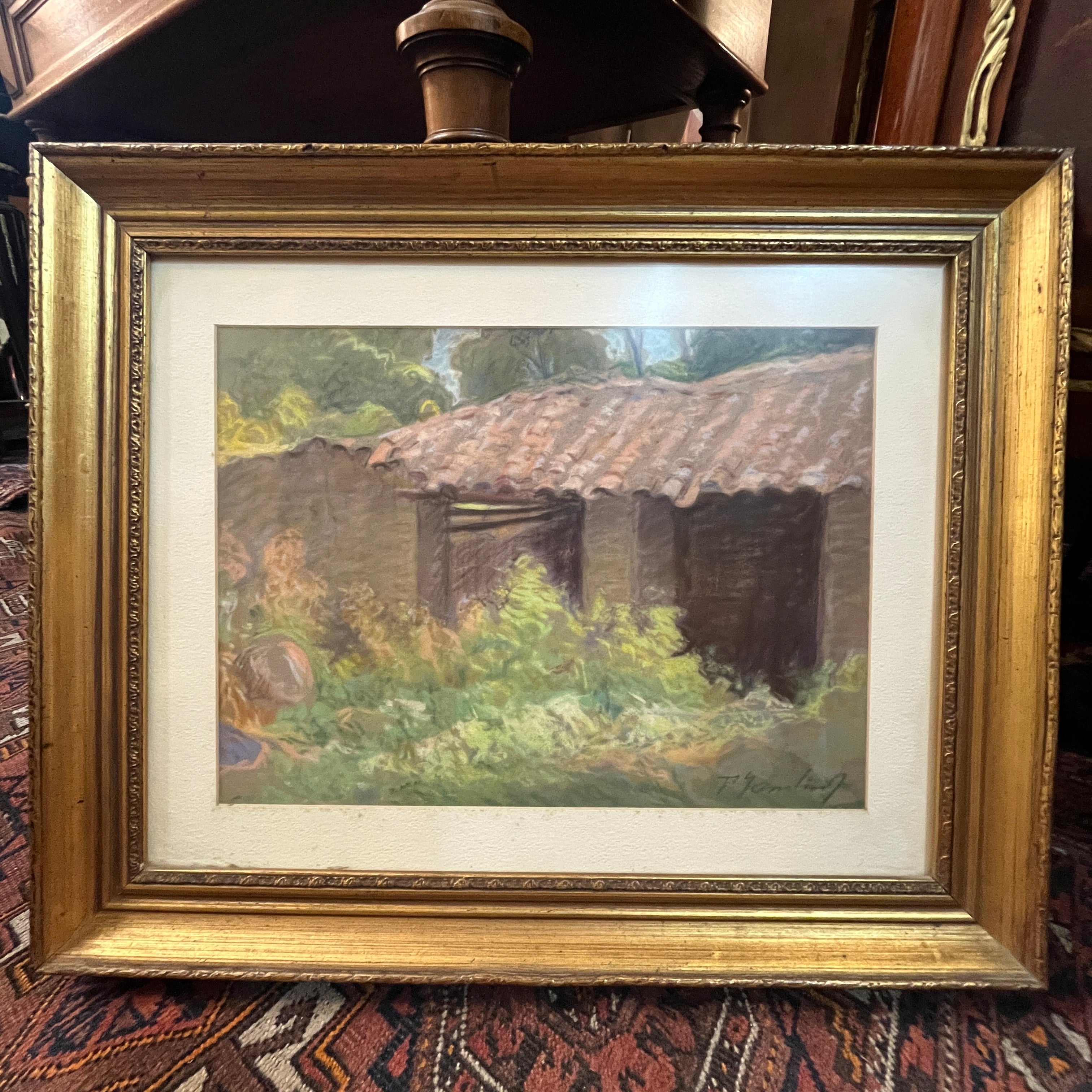 Preciosa obra en pastel del artista uruguayo-chileno Pascual Gambino que se sale de sus temáticas clásicas, retratos, desnudos y flores. Aquí vemos la fachada de lo que posiblemente es una caballeriza o bodega de un campo. Se observa un tejado desnivelado y descuidado, con vegetación y flores silvestres de gran altura que entregan a la escena una belleza especial al abandono.